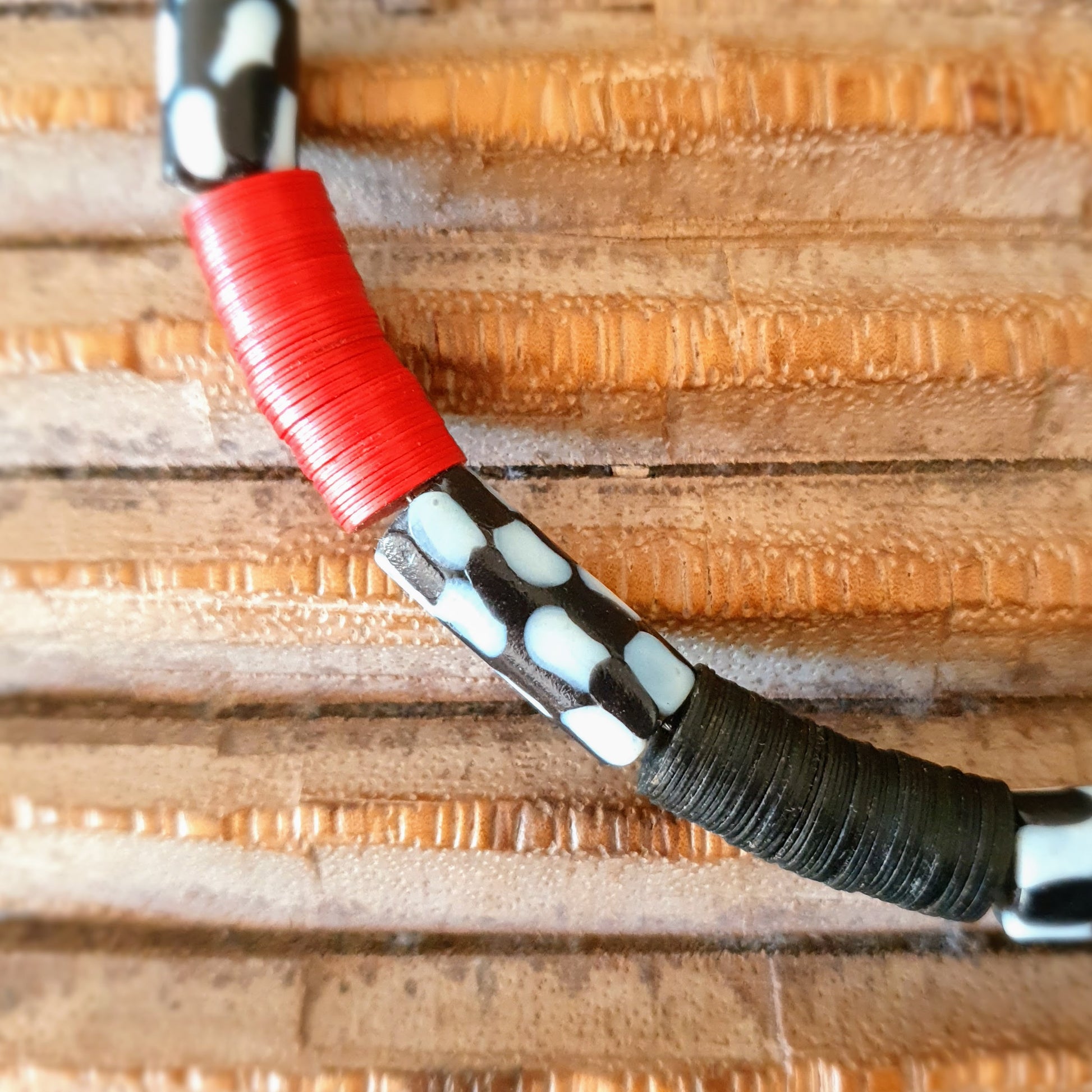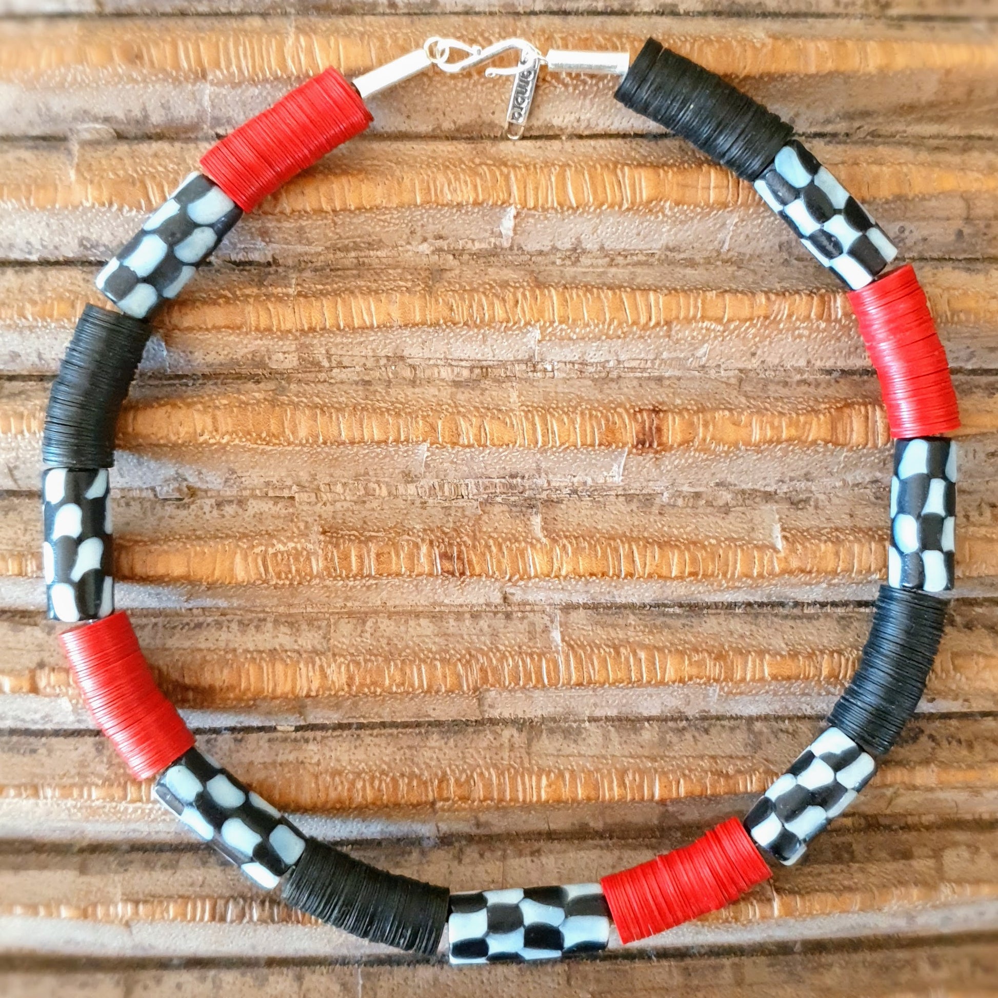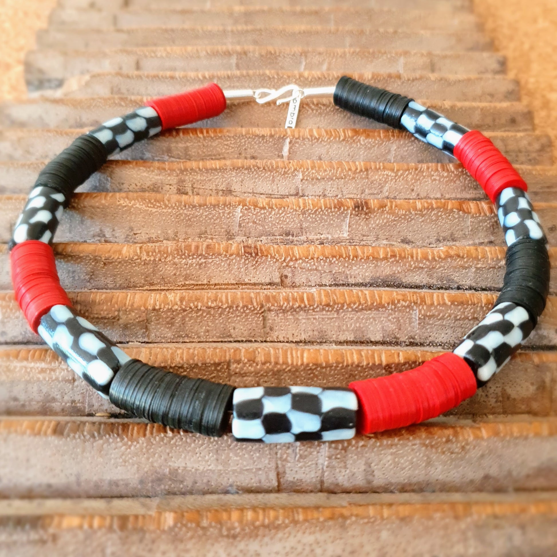 Modern handcrafted necklace with checkered black and white glass beads from the island of Java and red and black Bakelite discs from Africa with a silver clasp by ambra Schmuck.