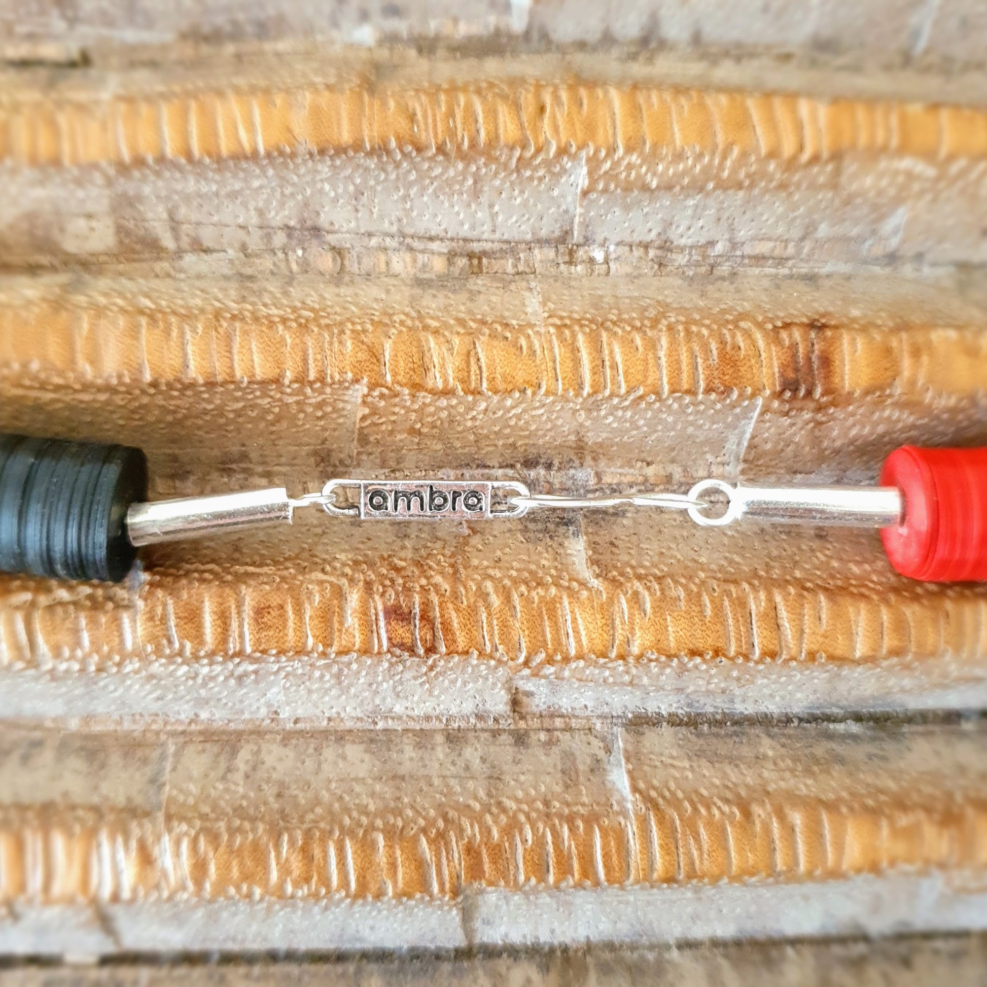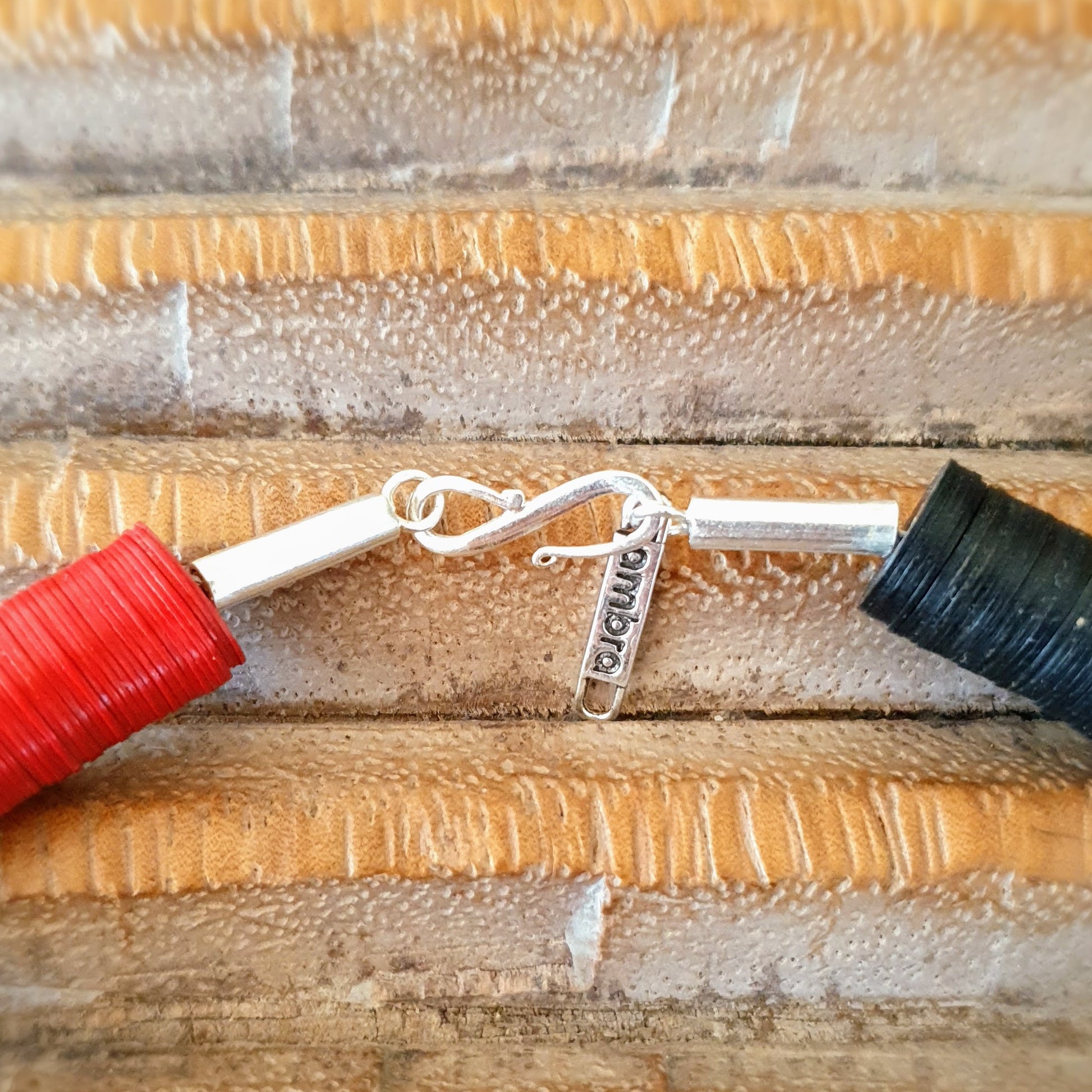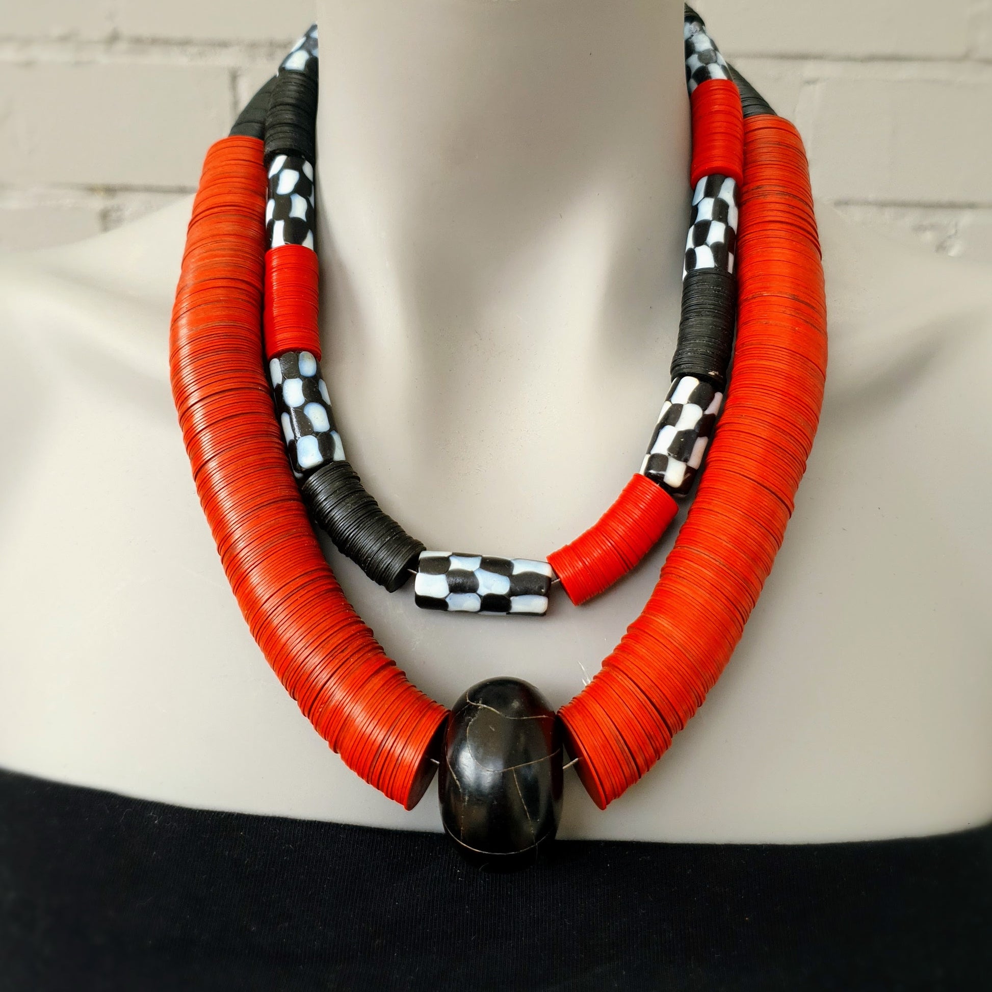 Modern handcrafted necklace with checkered black and white glass beads from the island of Java and red and black Bakelite discs from Africa with a silver clasp by ambra Schmuck.