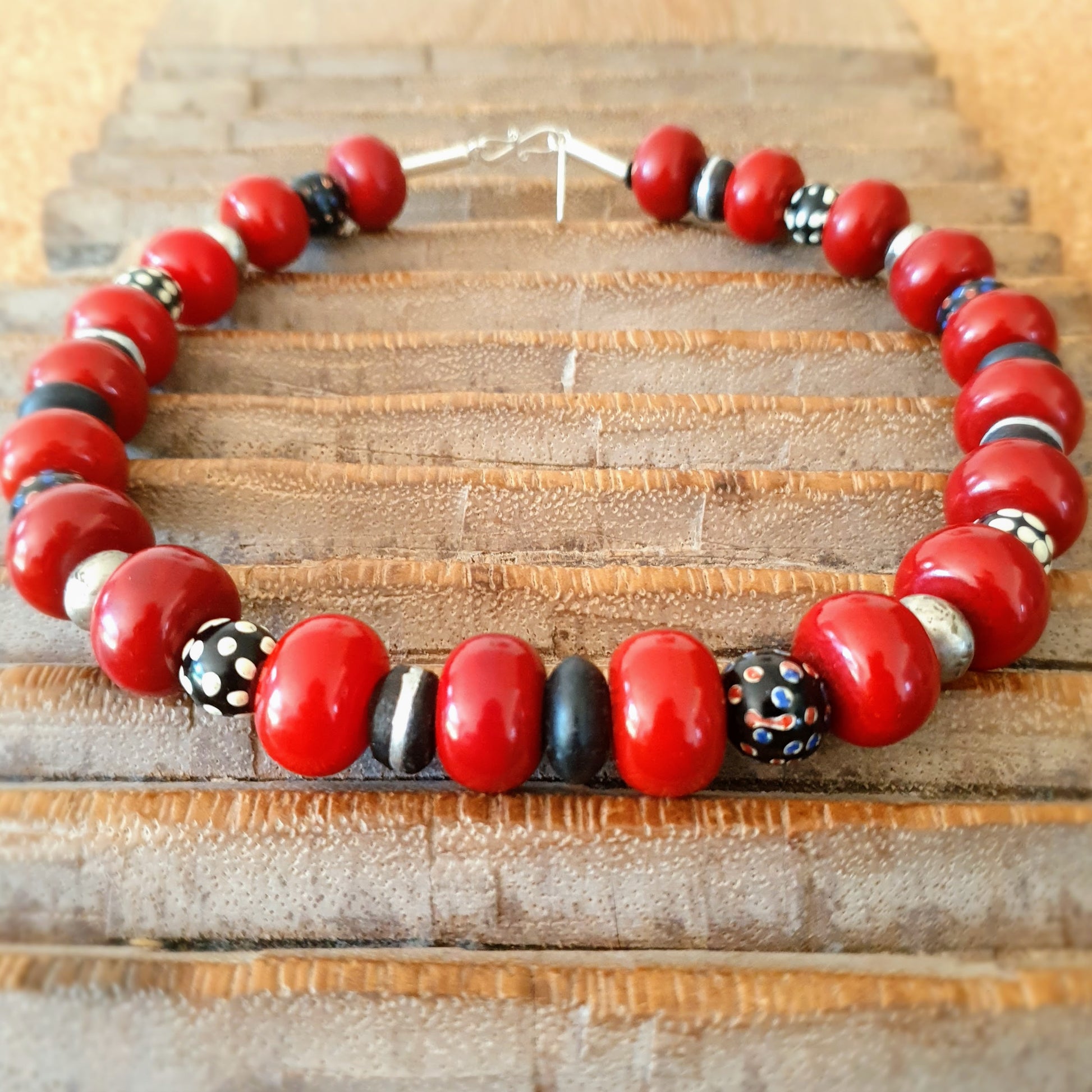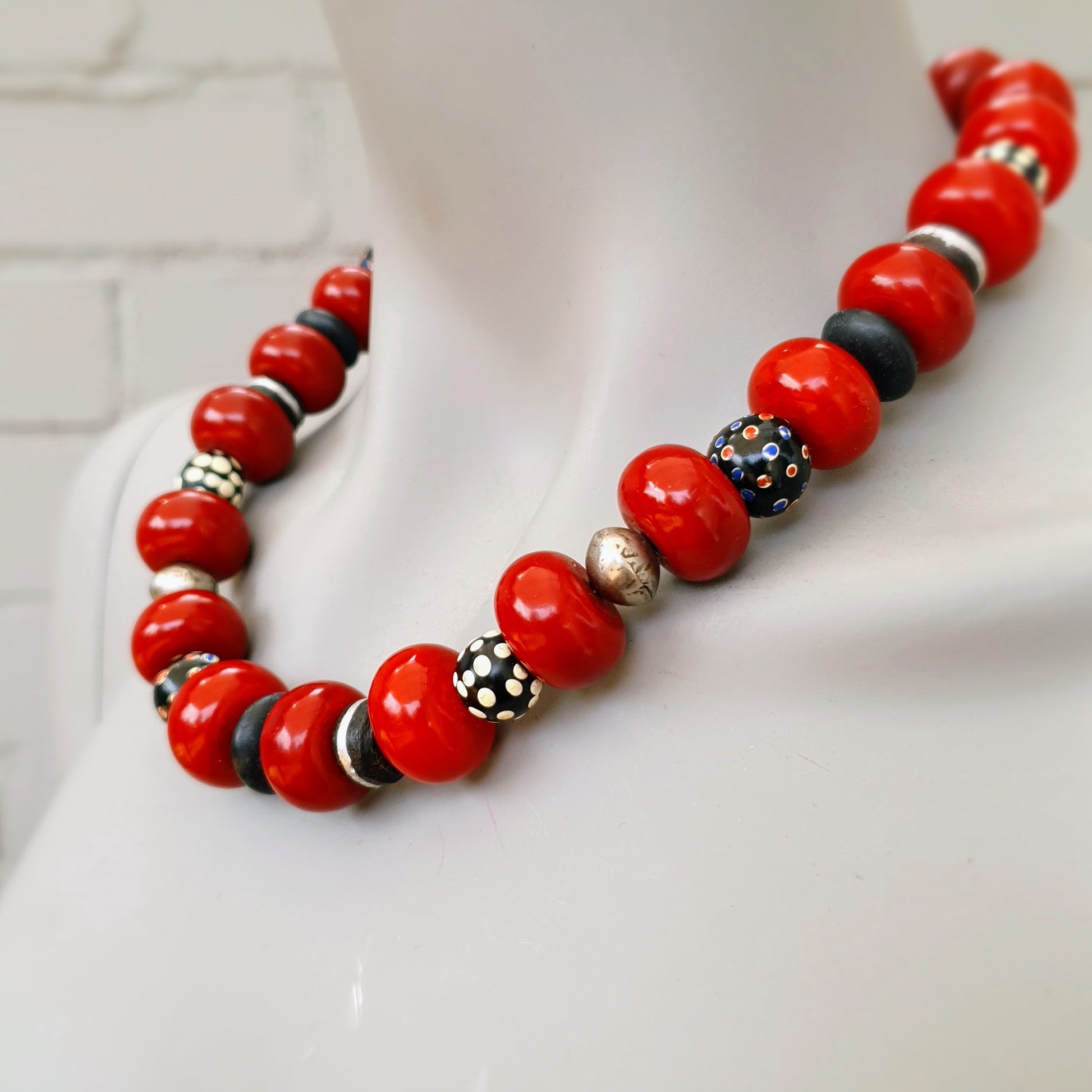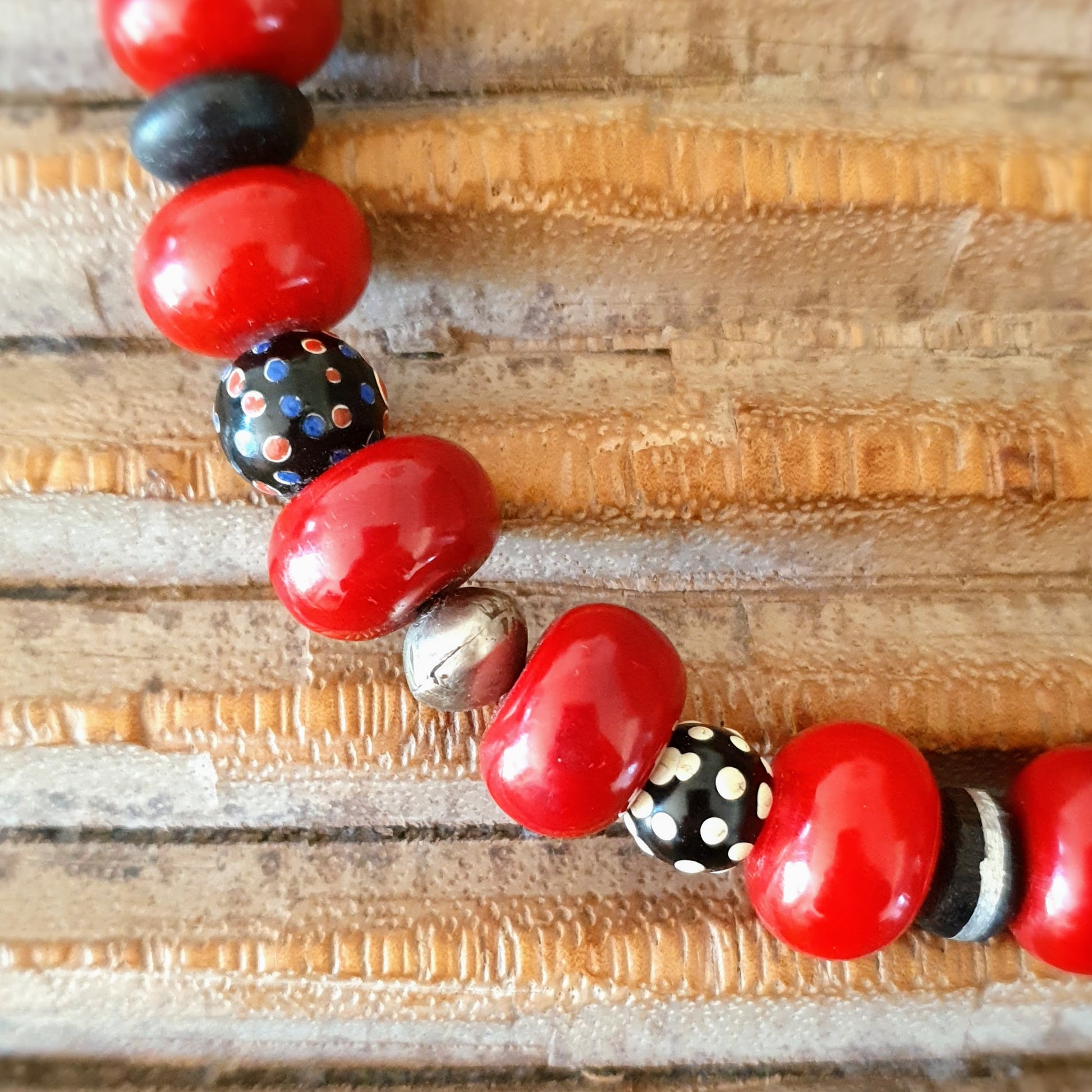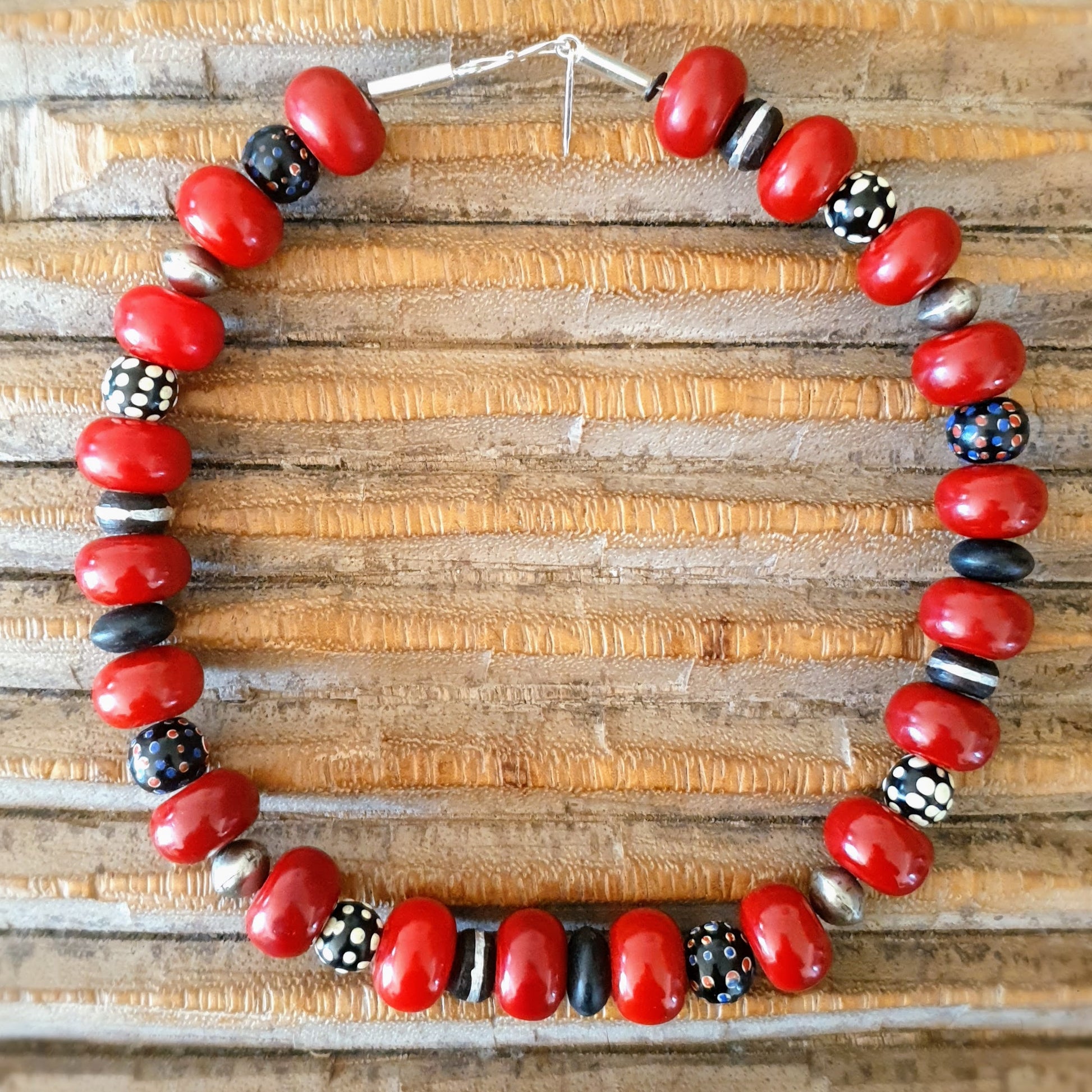 Handcrafted necklace with red resin beads from Indonesia, dotted glass beads from the island of Java, metal Tuareg beads, black resin beads and Tuareg ebony beads with silver clasp by ambra Schmuck.