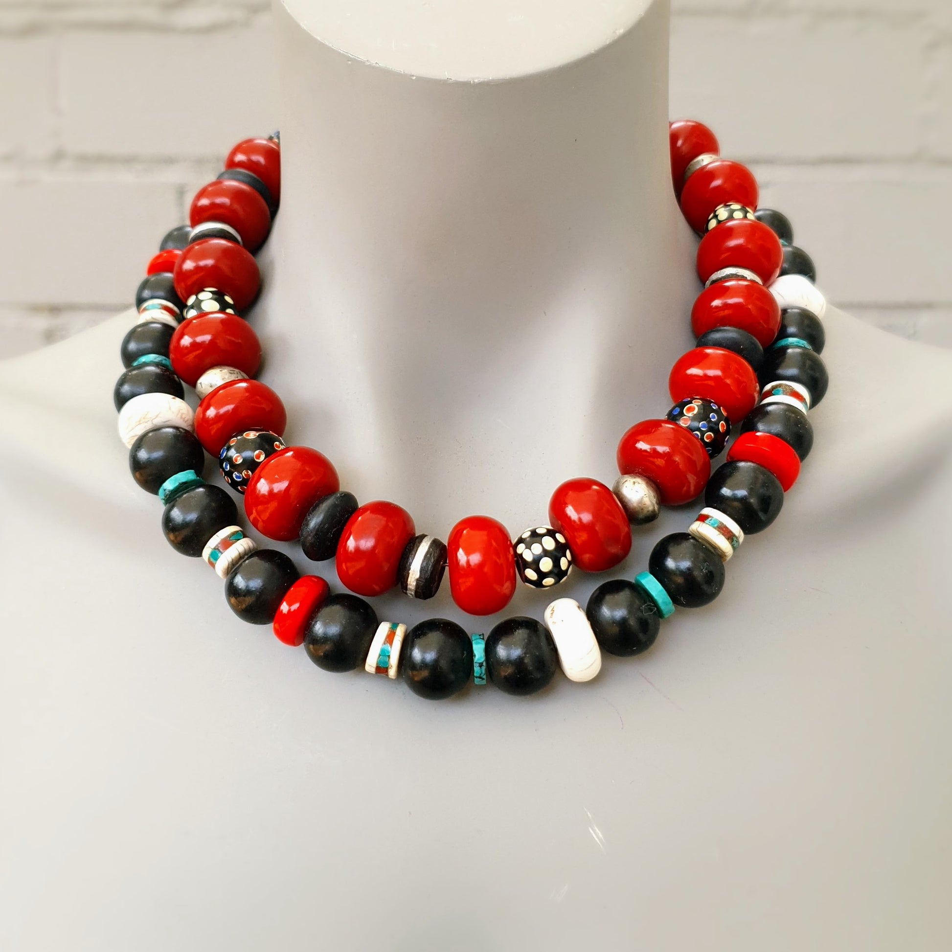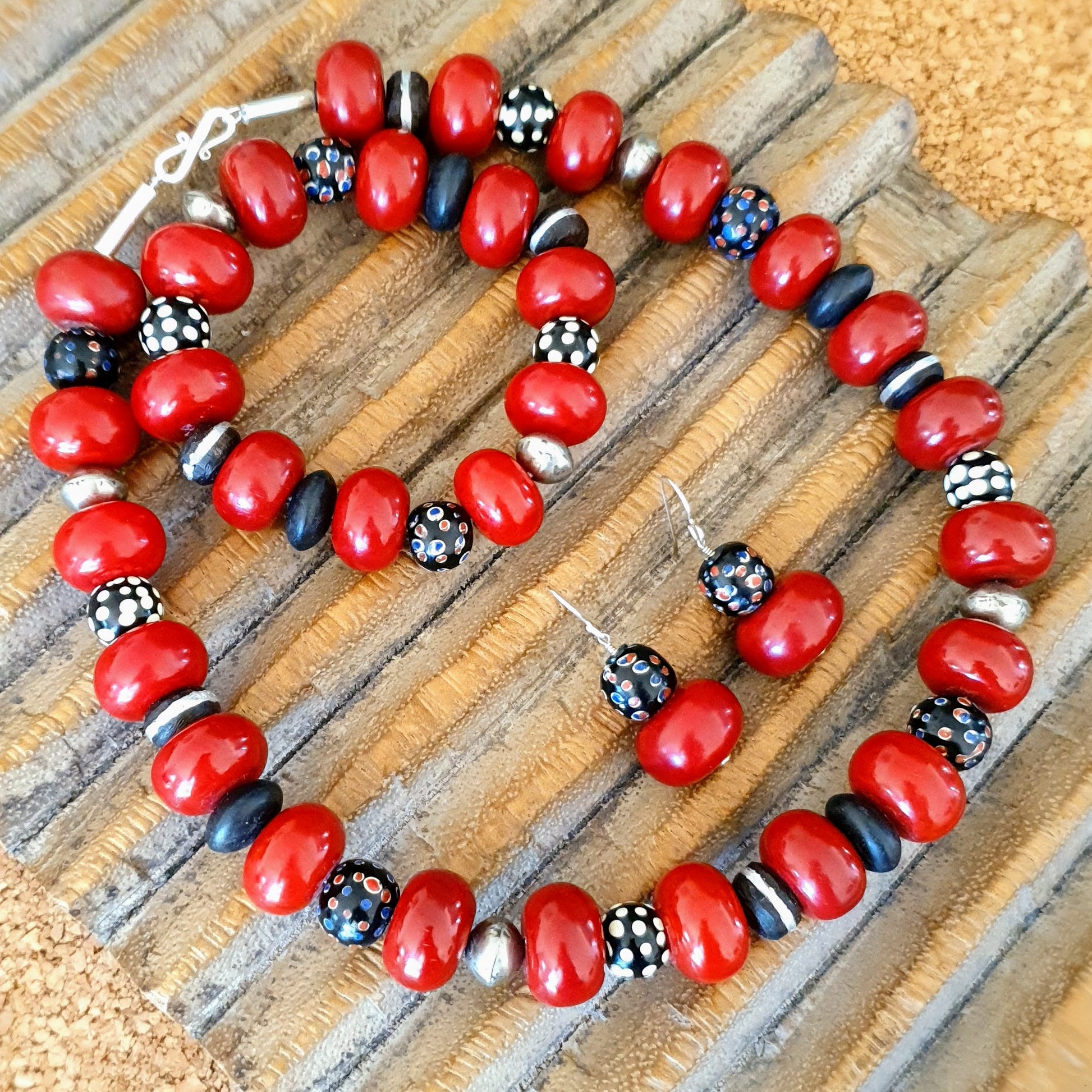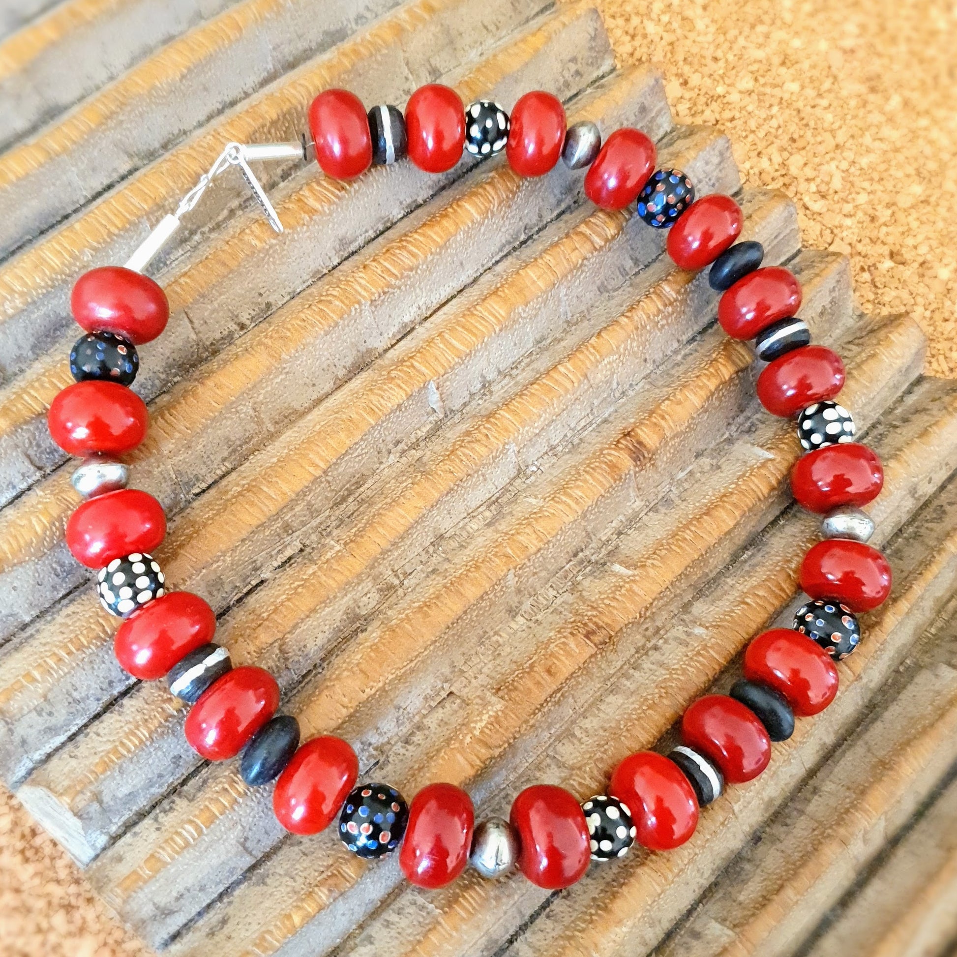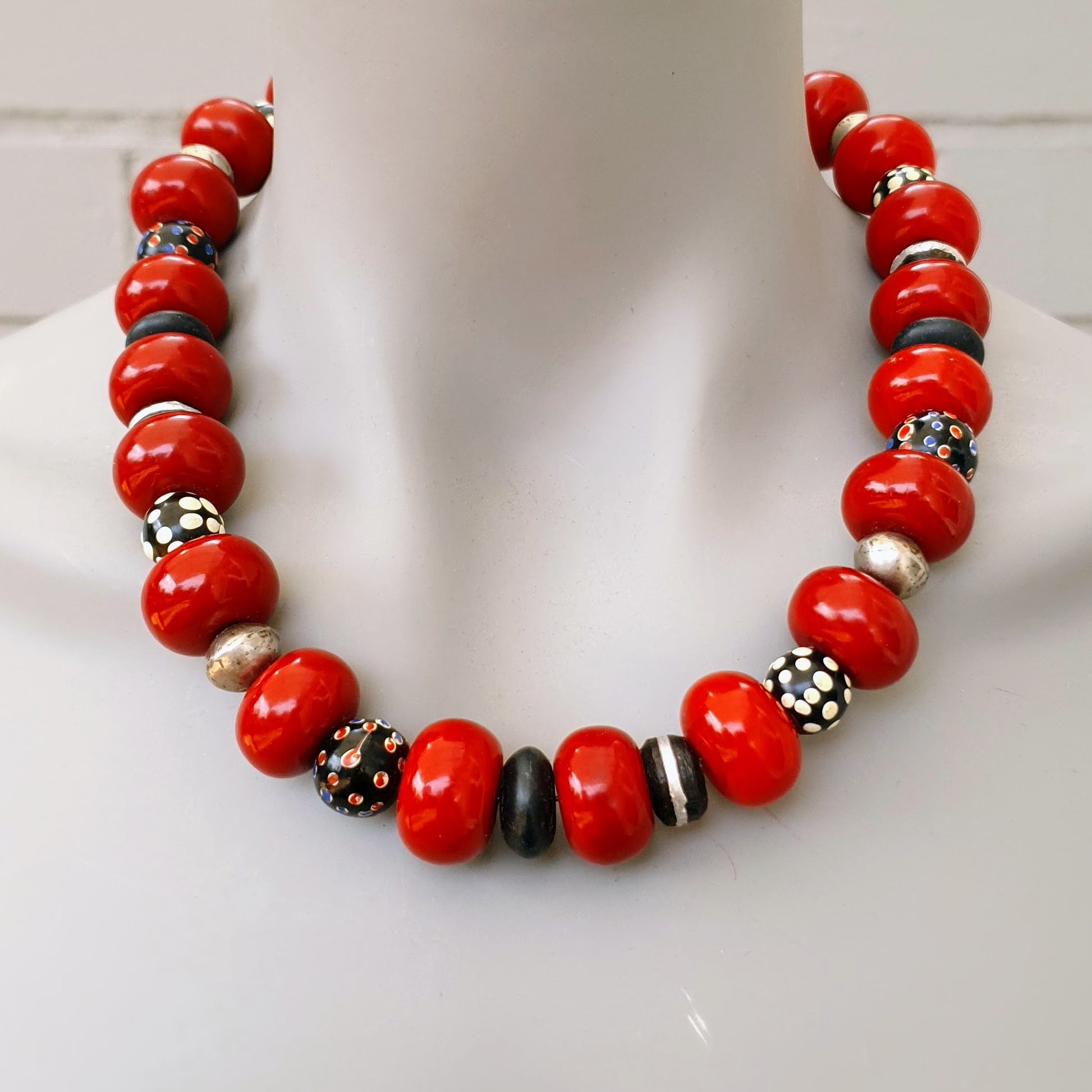Handcrafted necklace with red resin beads from Indonesia, dotted glass beads from the island of Java, metal Tuareg beads, black resin beads and Tuareg ebony beads with silver clasp by ambra Schmuck.