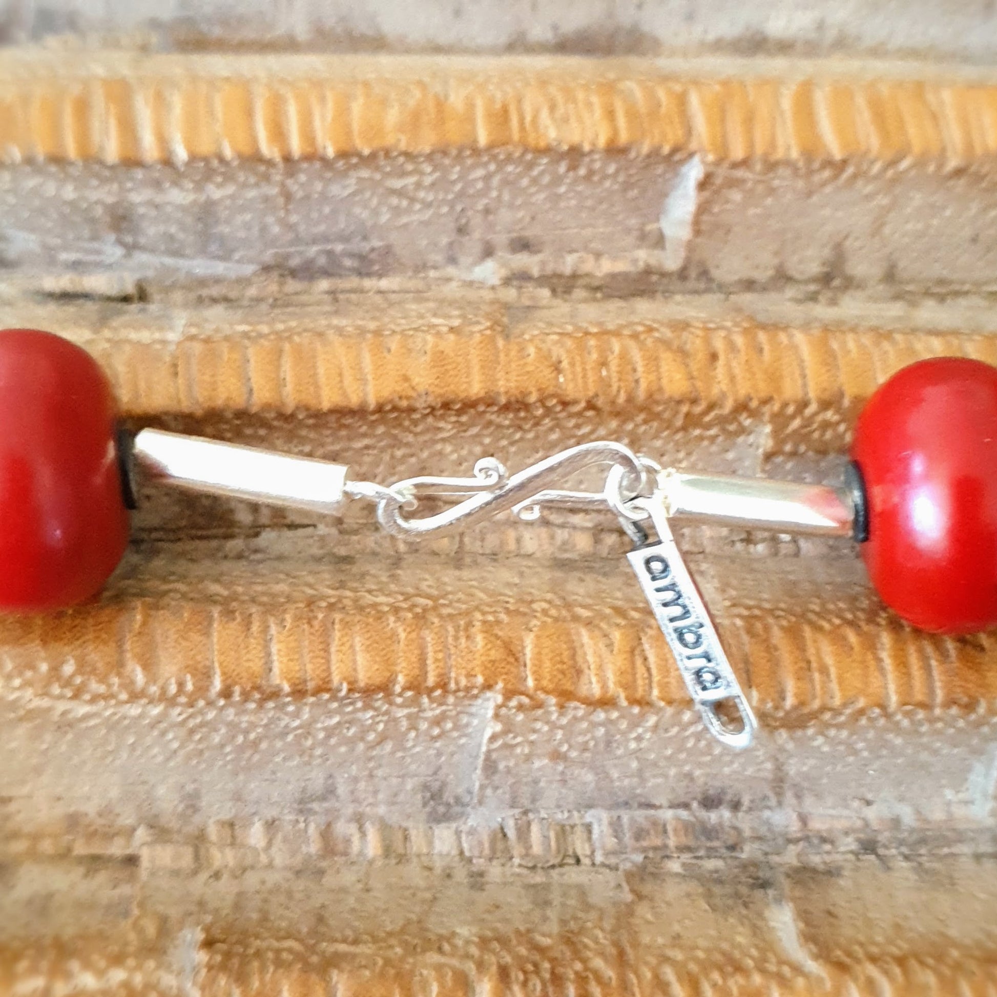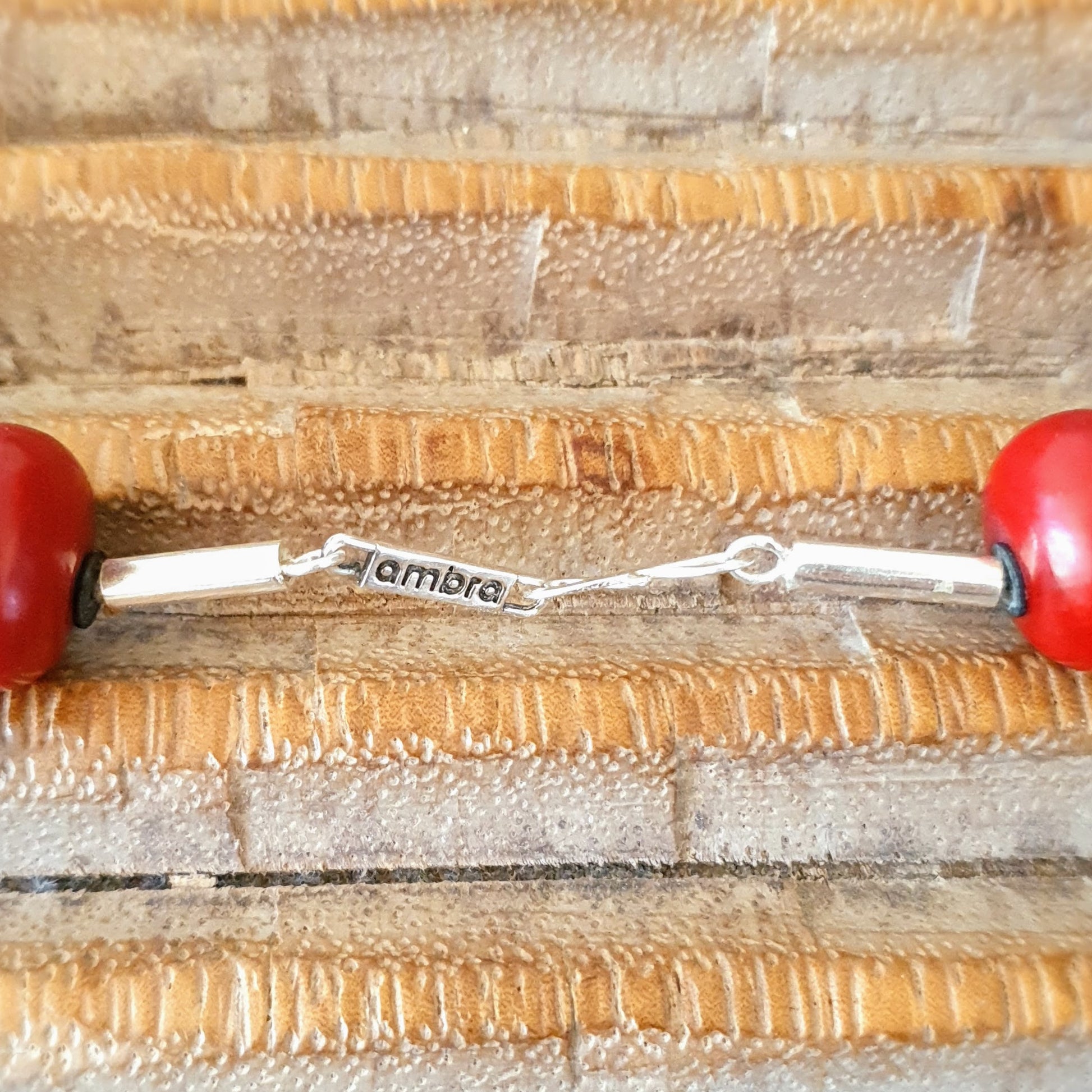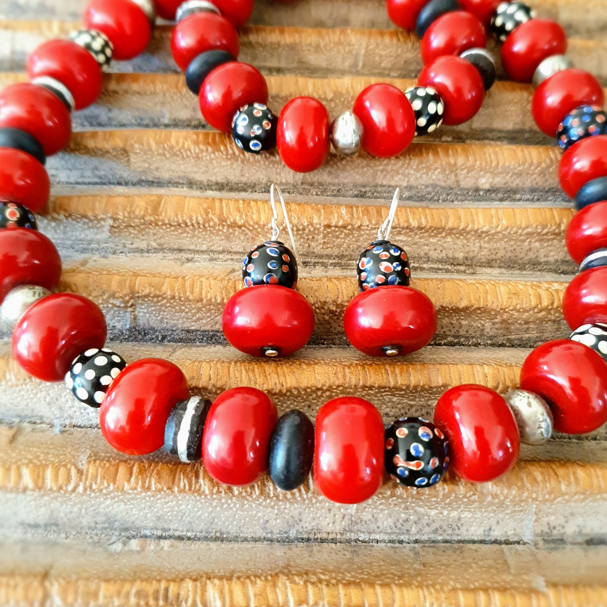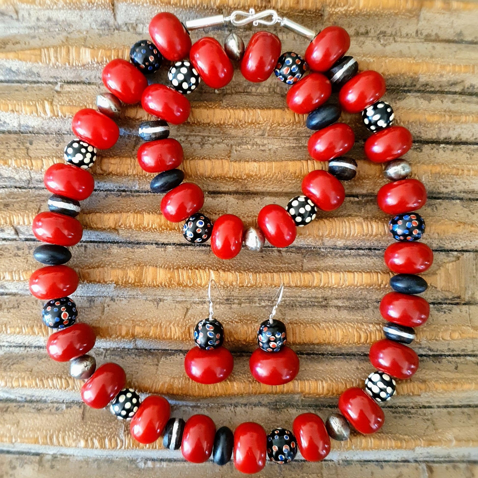 Handcrafted necklace with red resin beads from Indonesia, dotted glass beads from the island of Java, metal Tuareg beads, black resin beads and Tuareg ebony beads with silver clasp by ambra Schmuck.