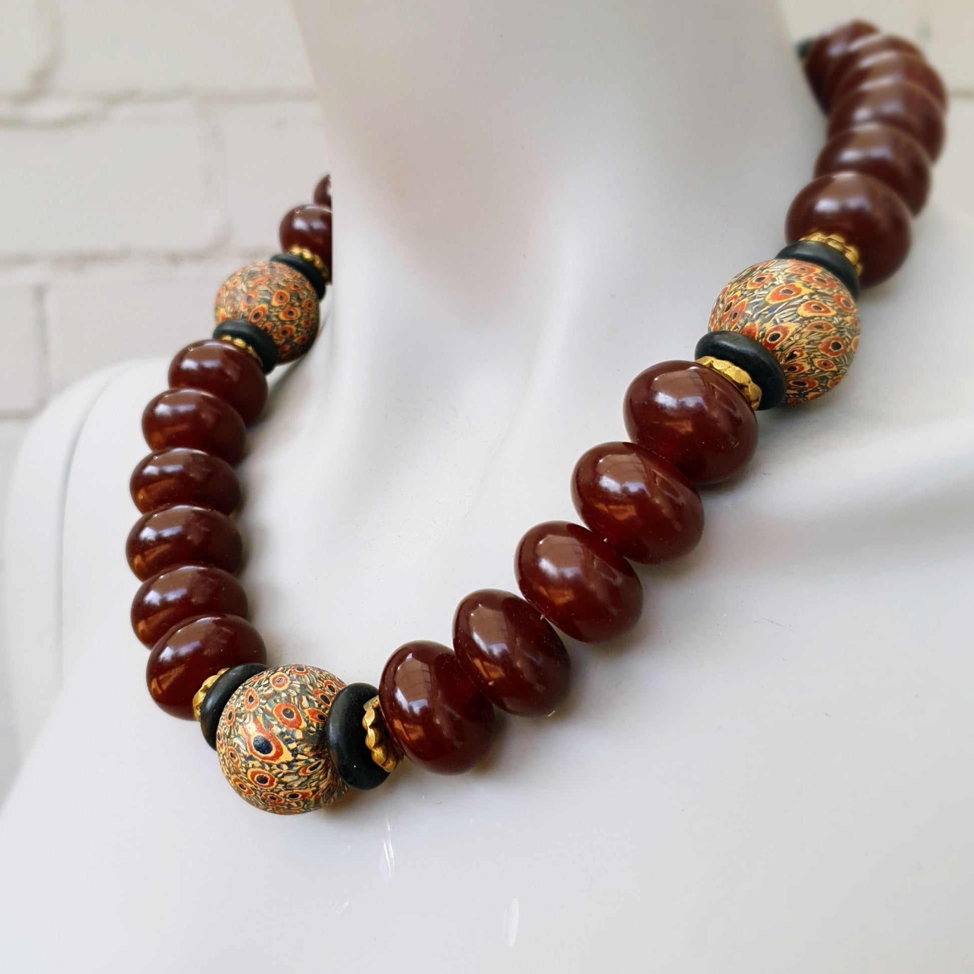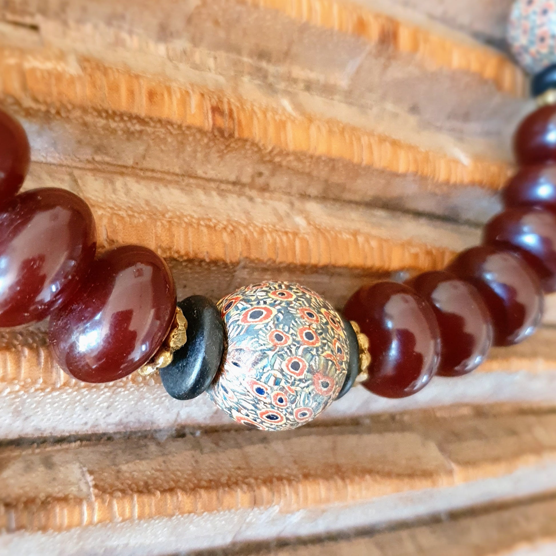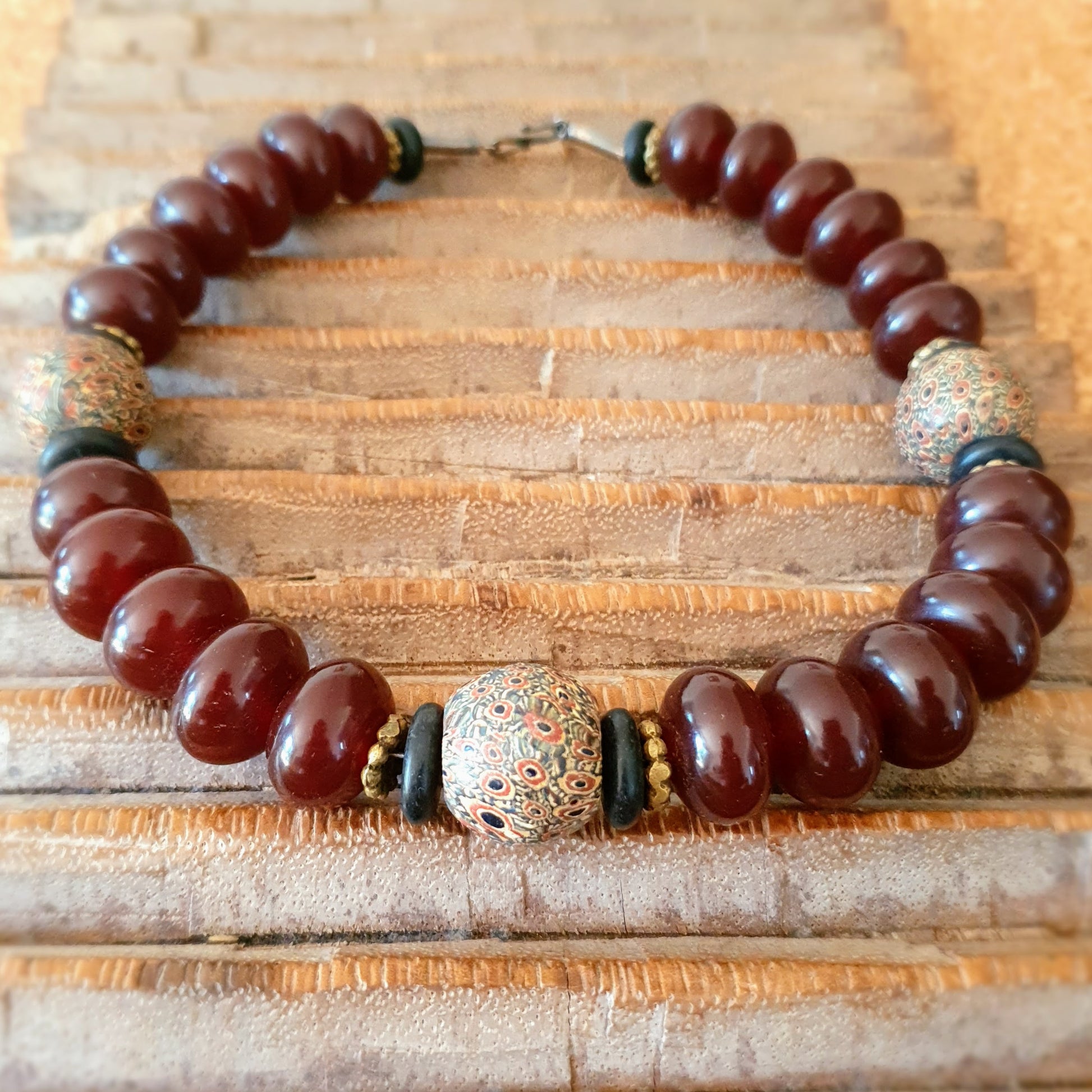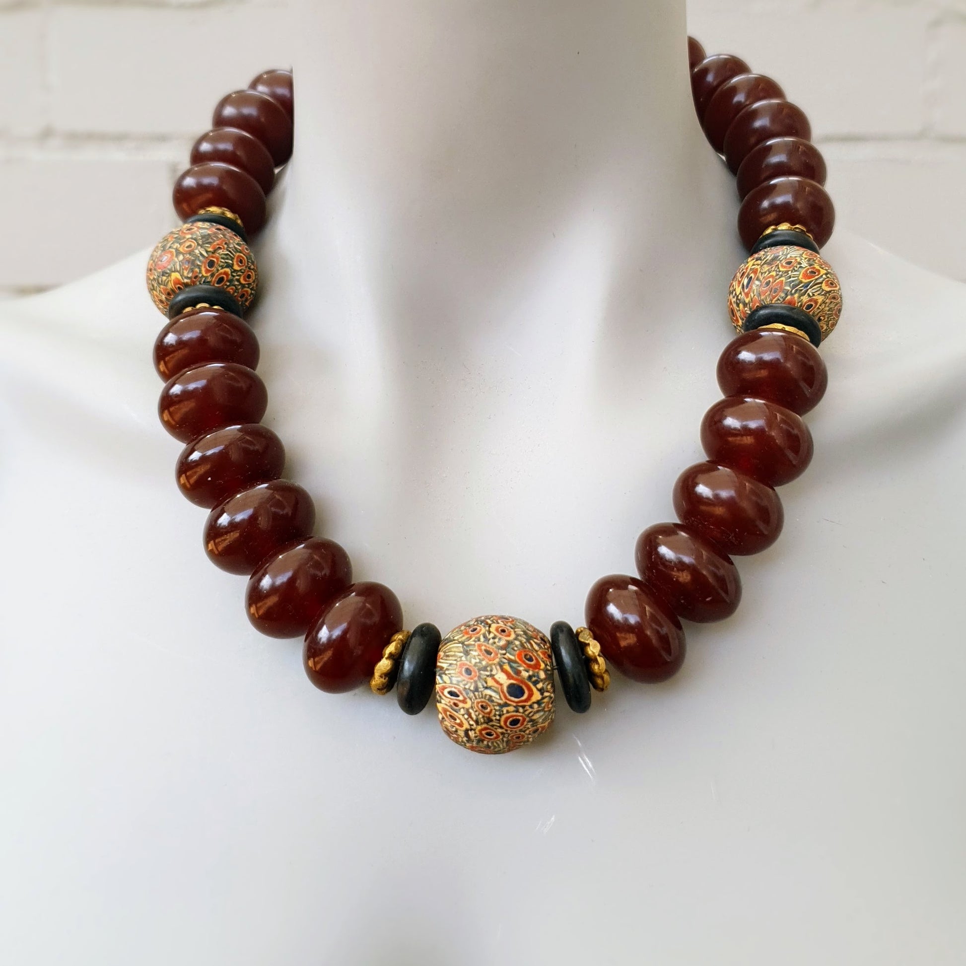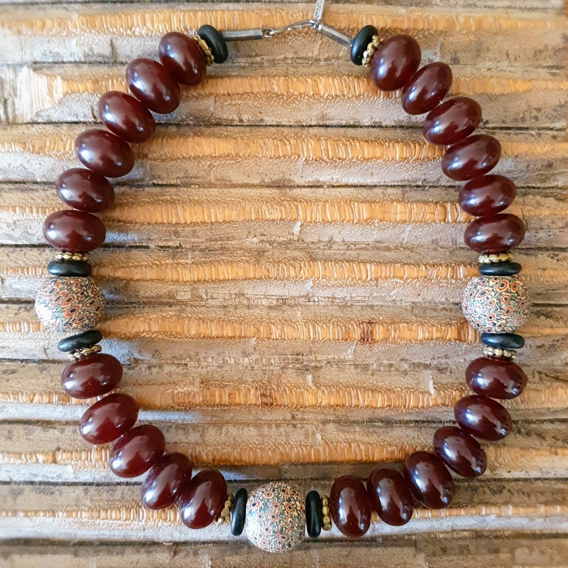 Large handcrafted necklace with very elaborately handcrafted mosaic glass beads from the Majapahit culture from the island of Java, dark brown resin beads from Indonesia and African bronze with oxidized silver clasp by ambra Schmuck.
