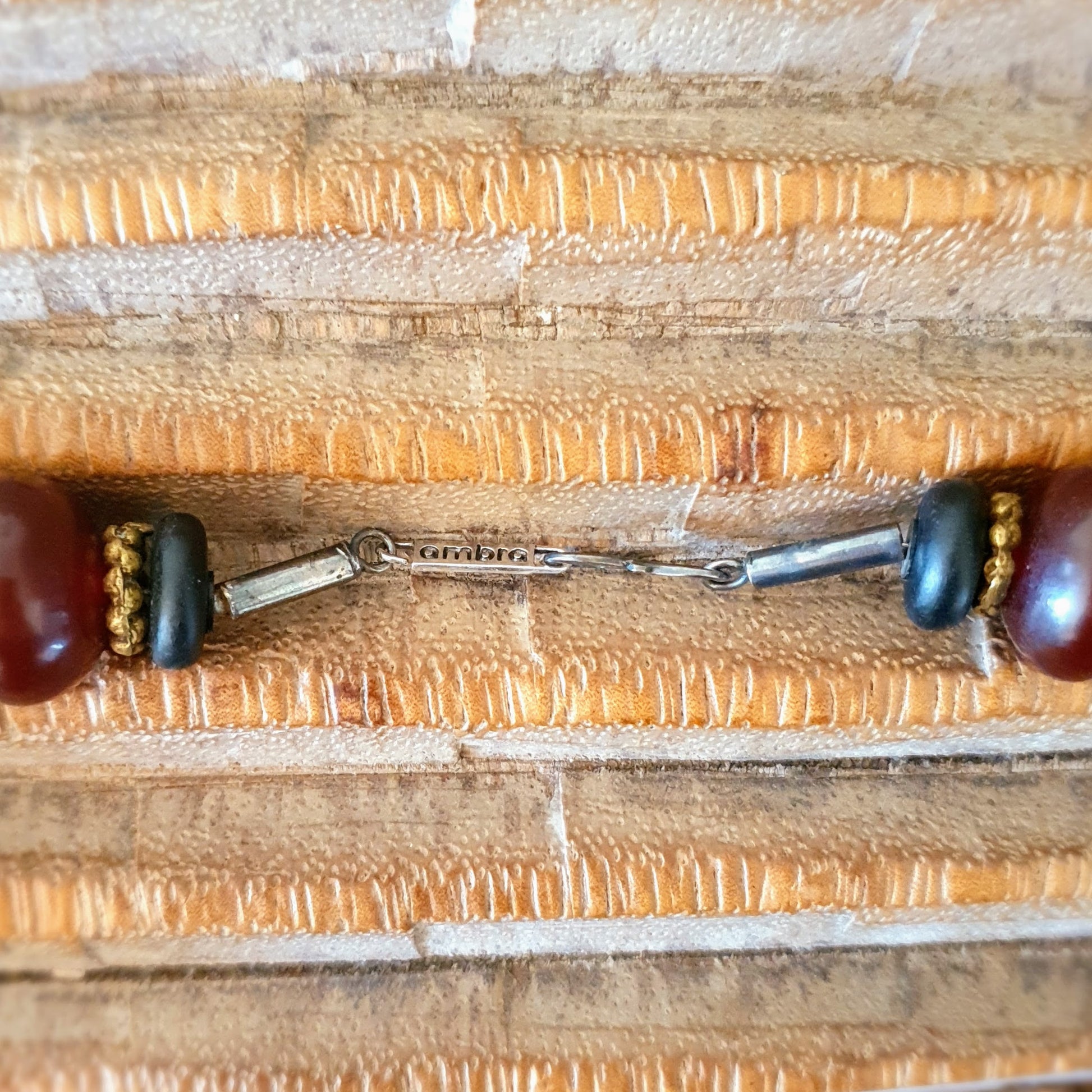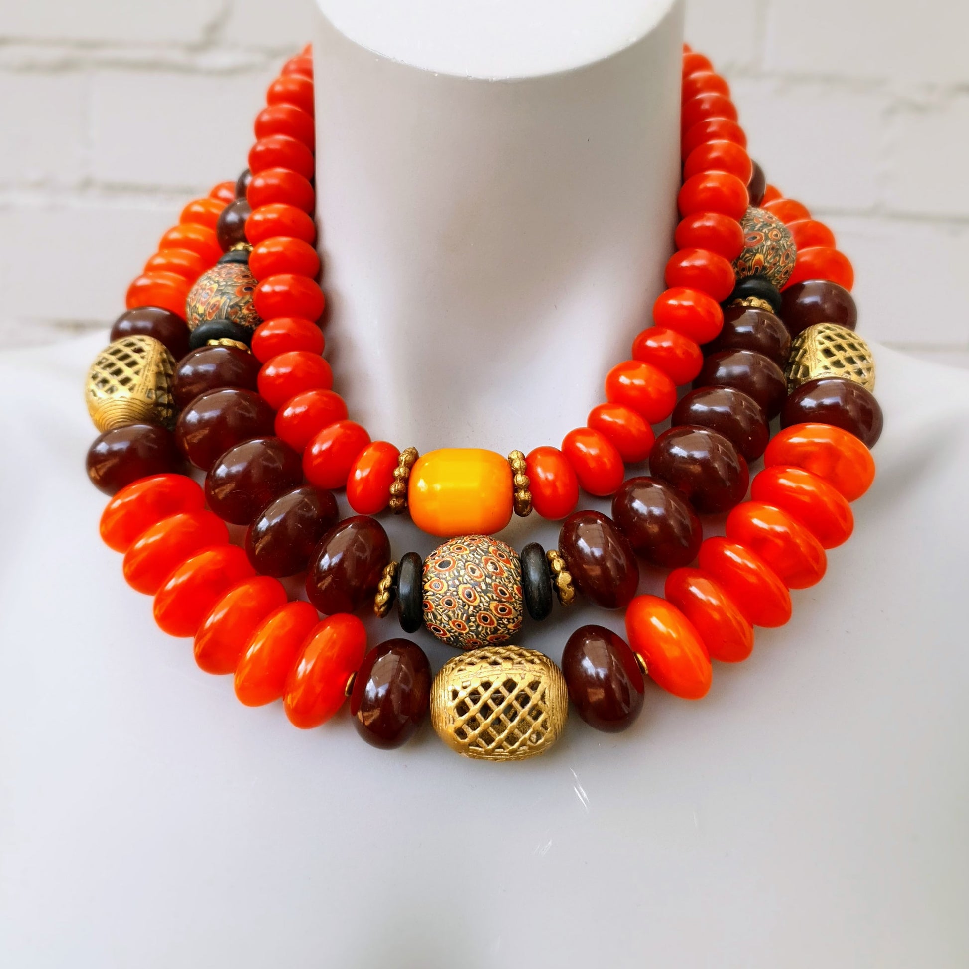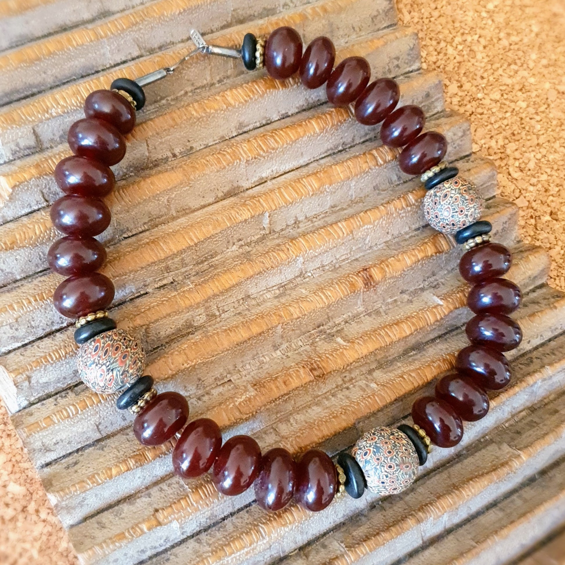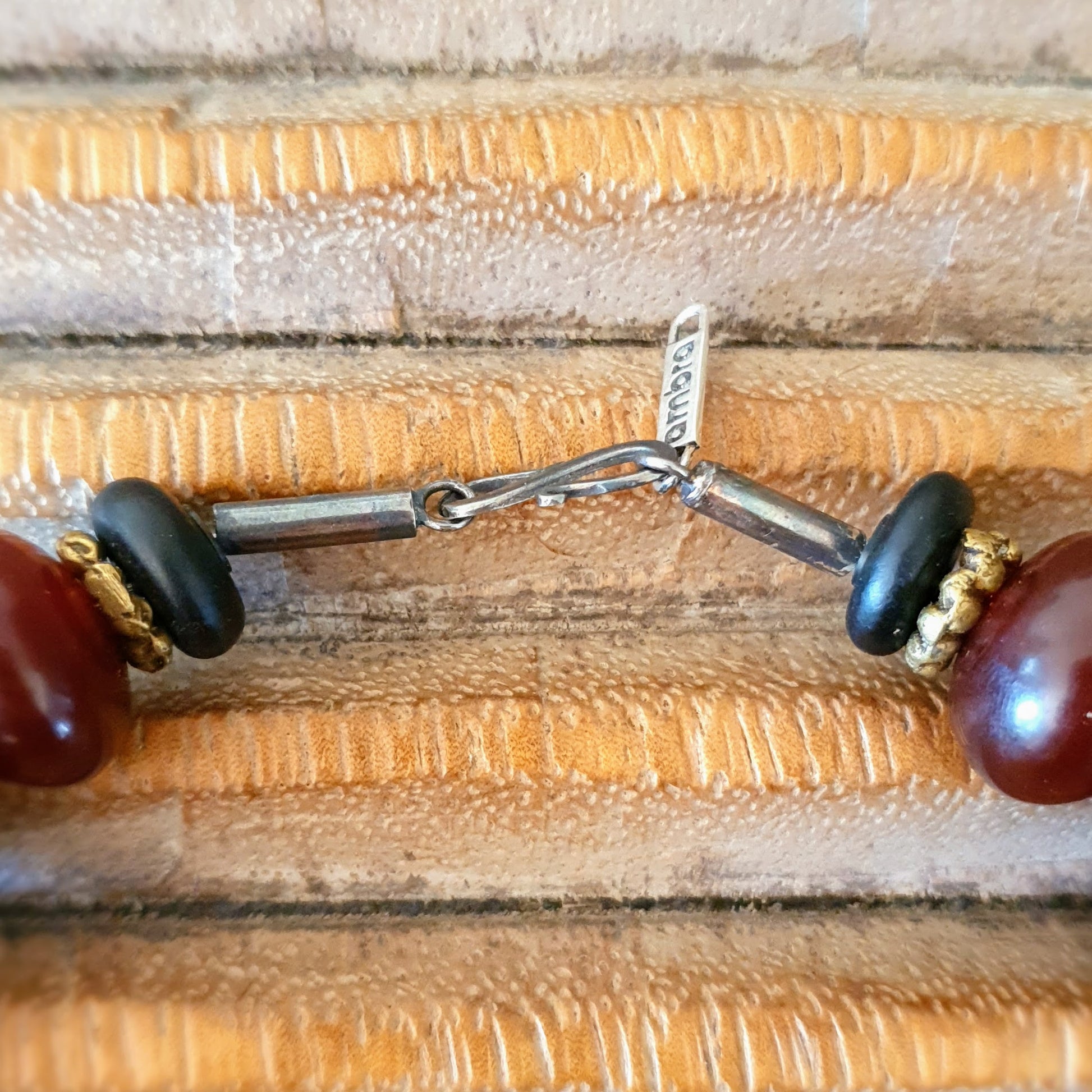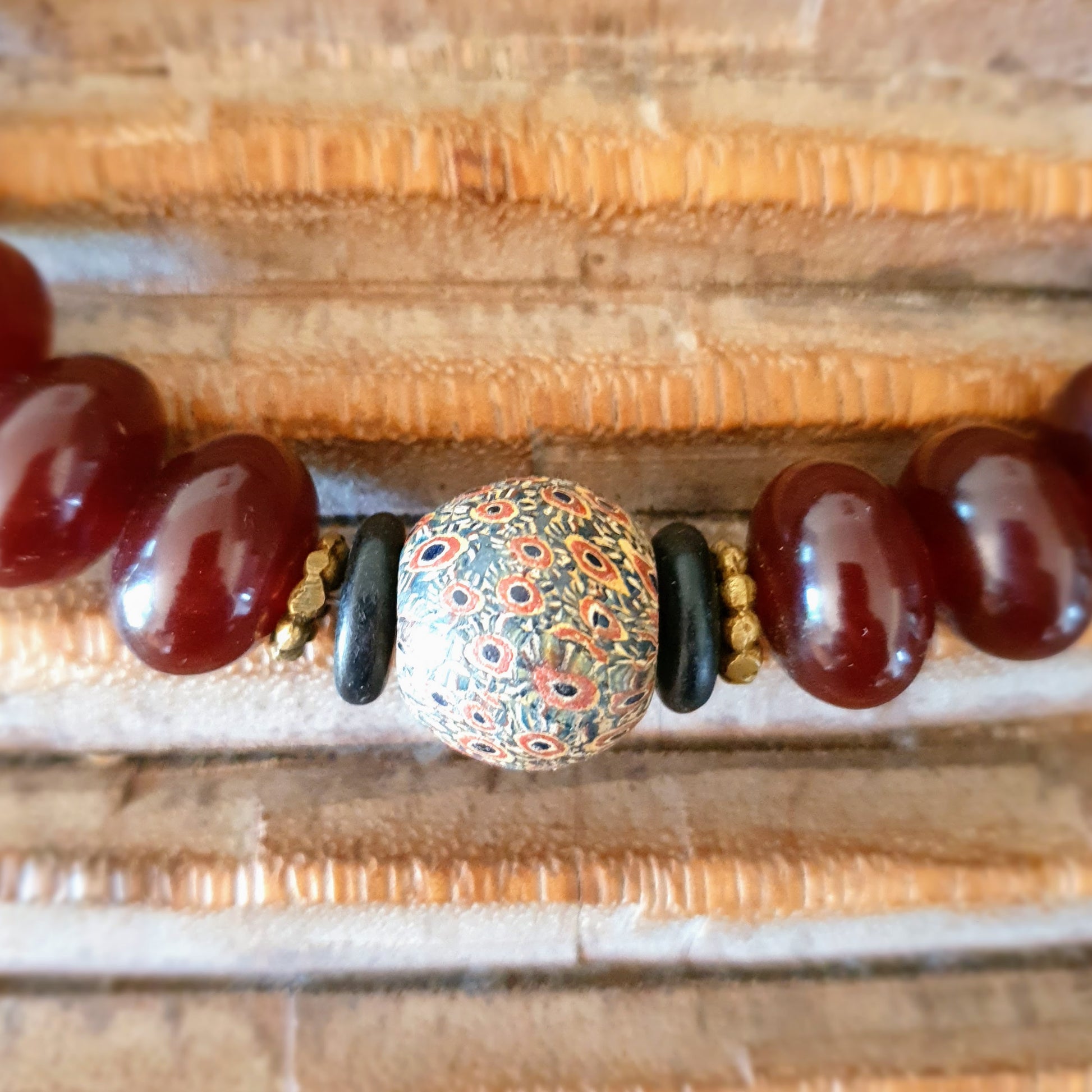 Large handcrafted necklace with very elaborately handcrafted mosaic glass beads from the Majapahit culture from the island of Java, dark brown resin beads from Indonesia and African bronze with oxidized silver clasp by ambra Schmuck.
