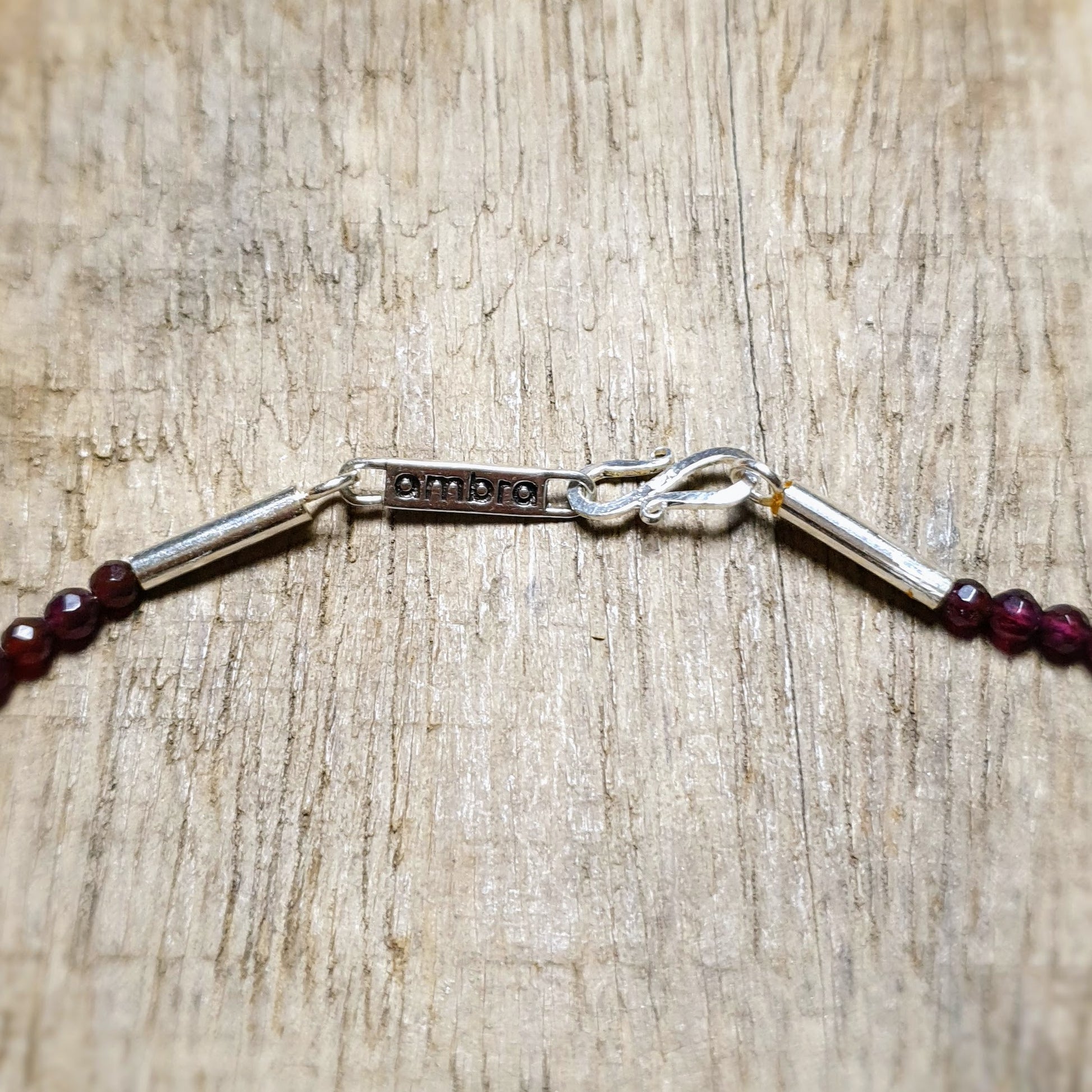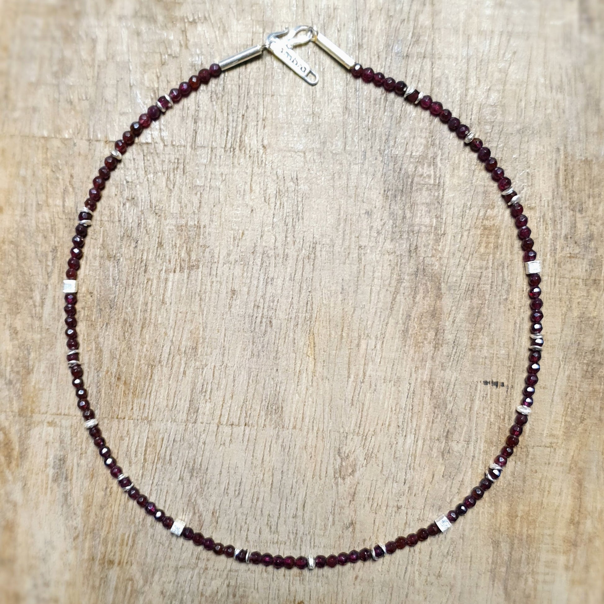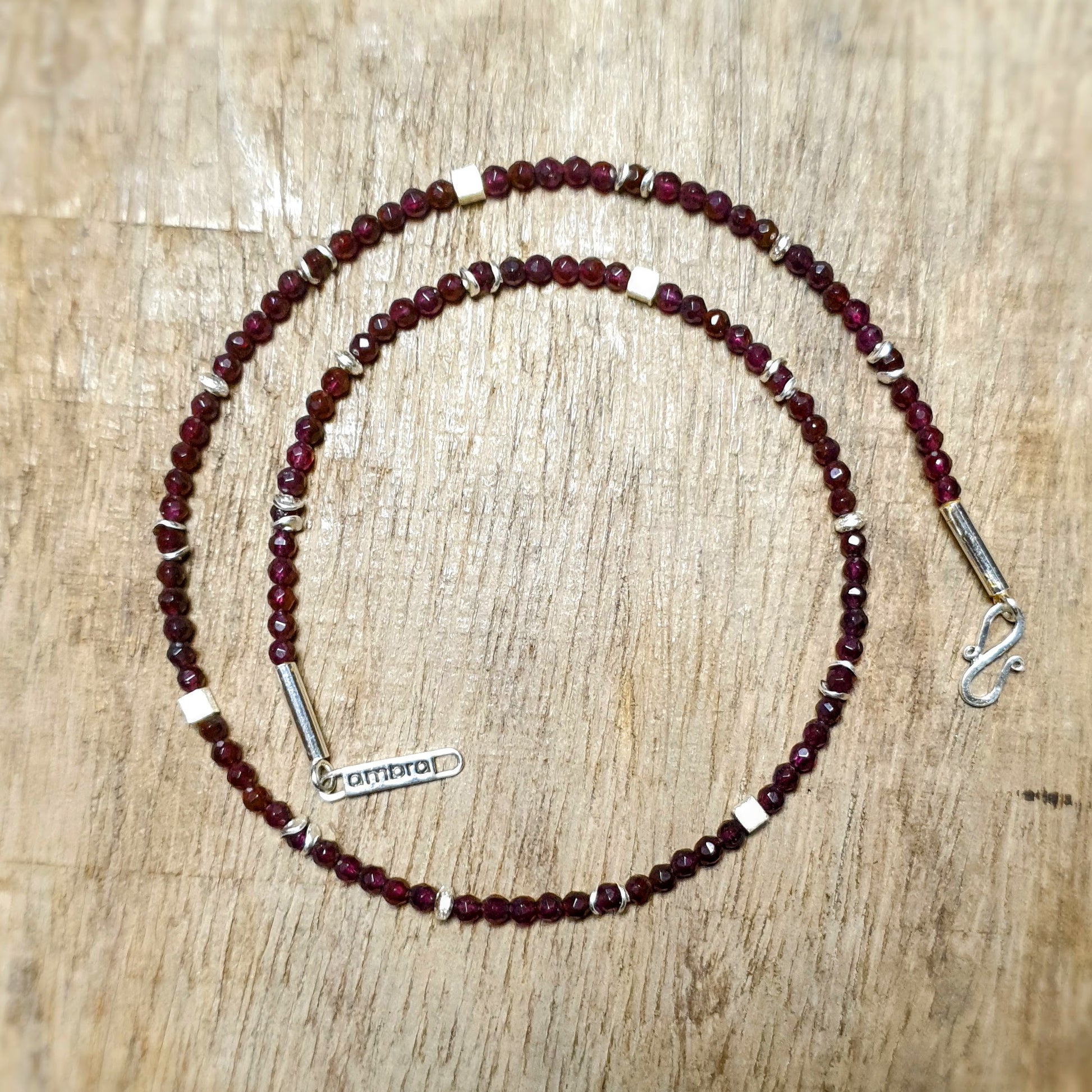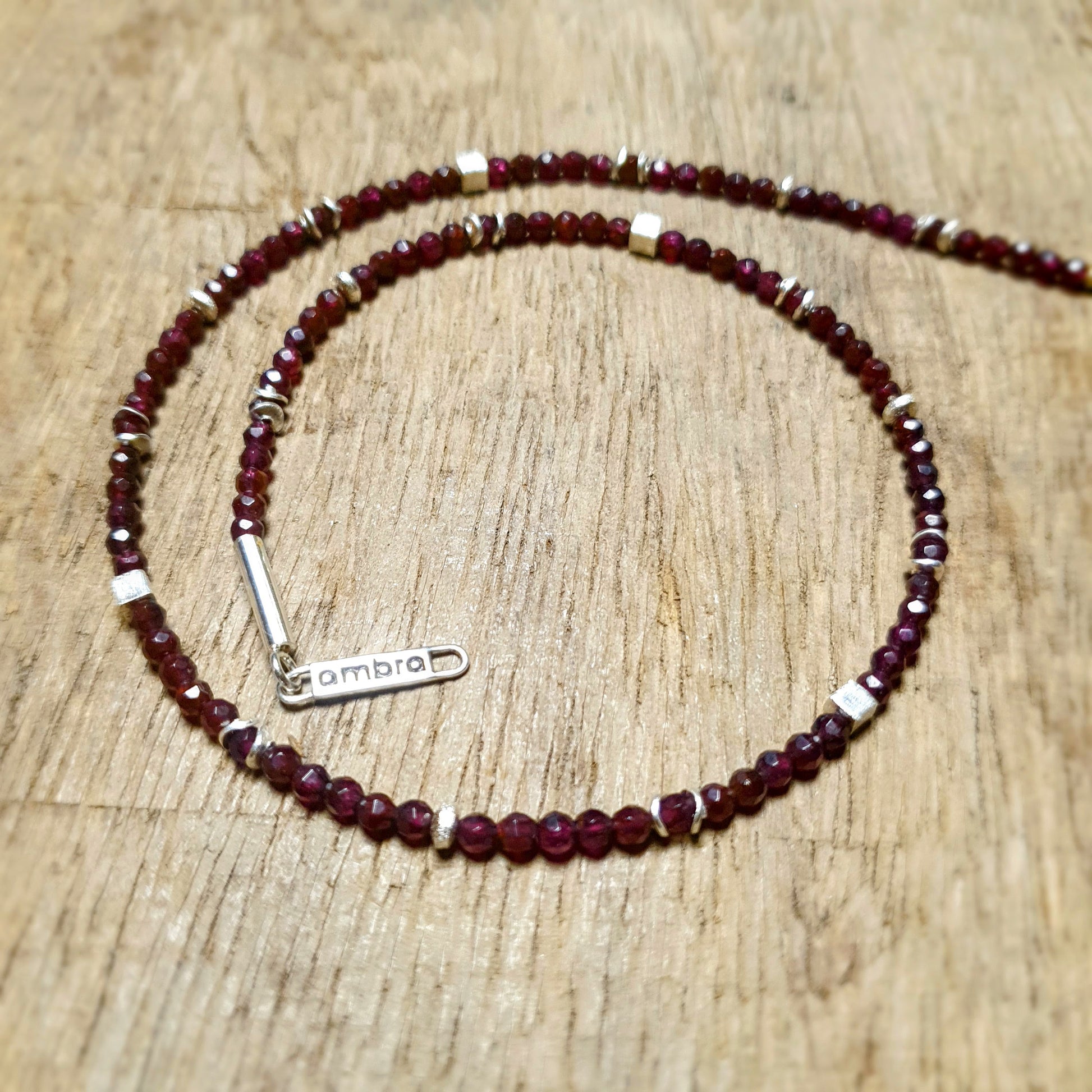 Fine handmade necklace with reddish-brown faceted garnet stones and matte silver beads in different shapes with silver clasp by ambra Schmuck.