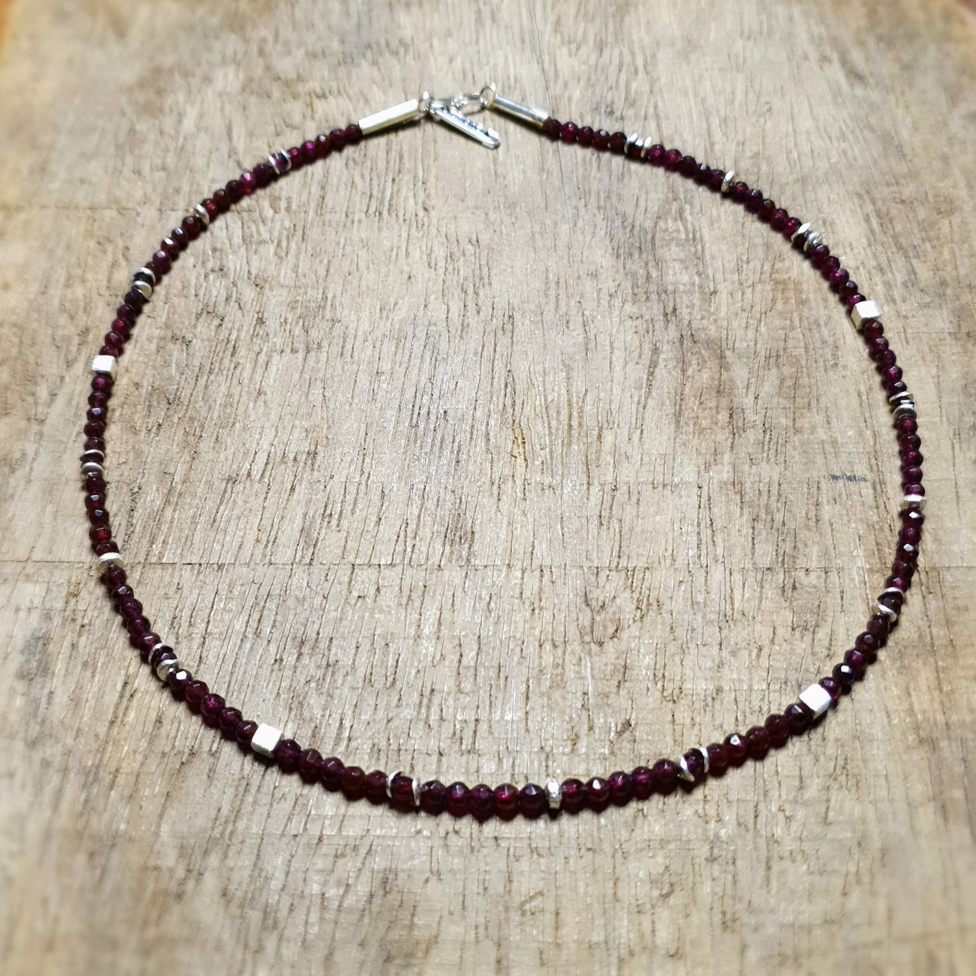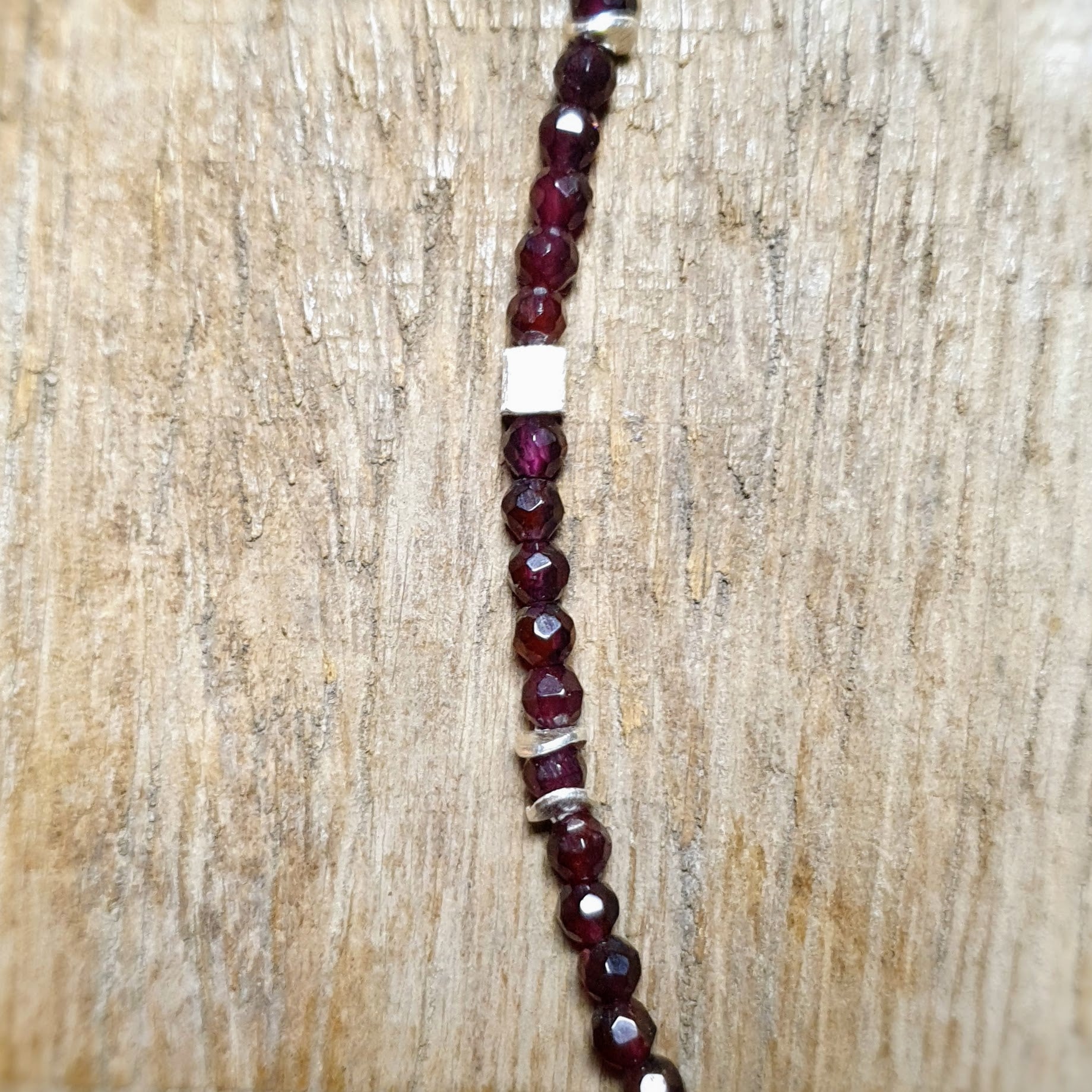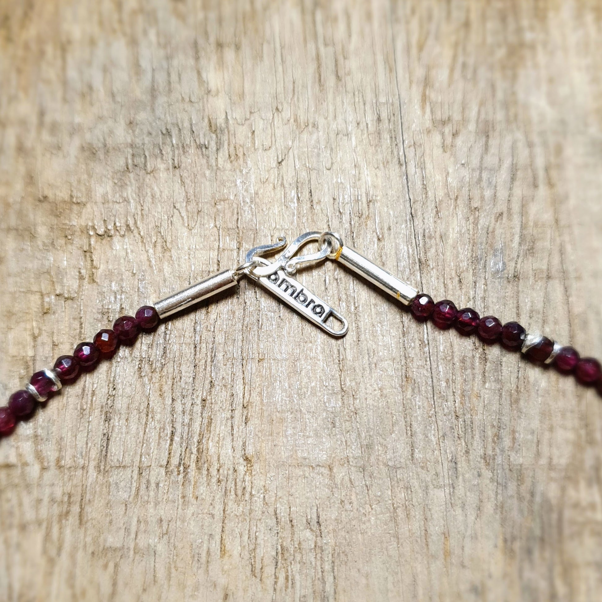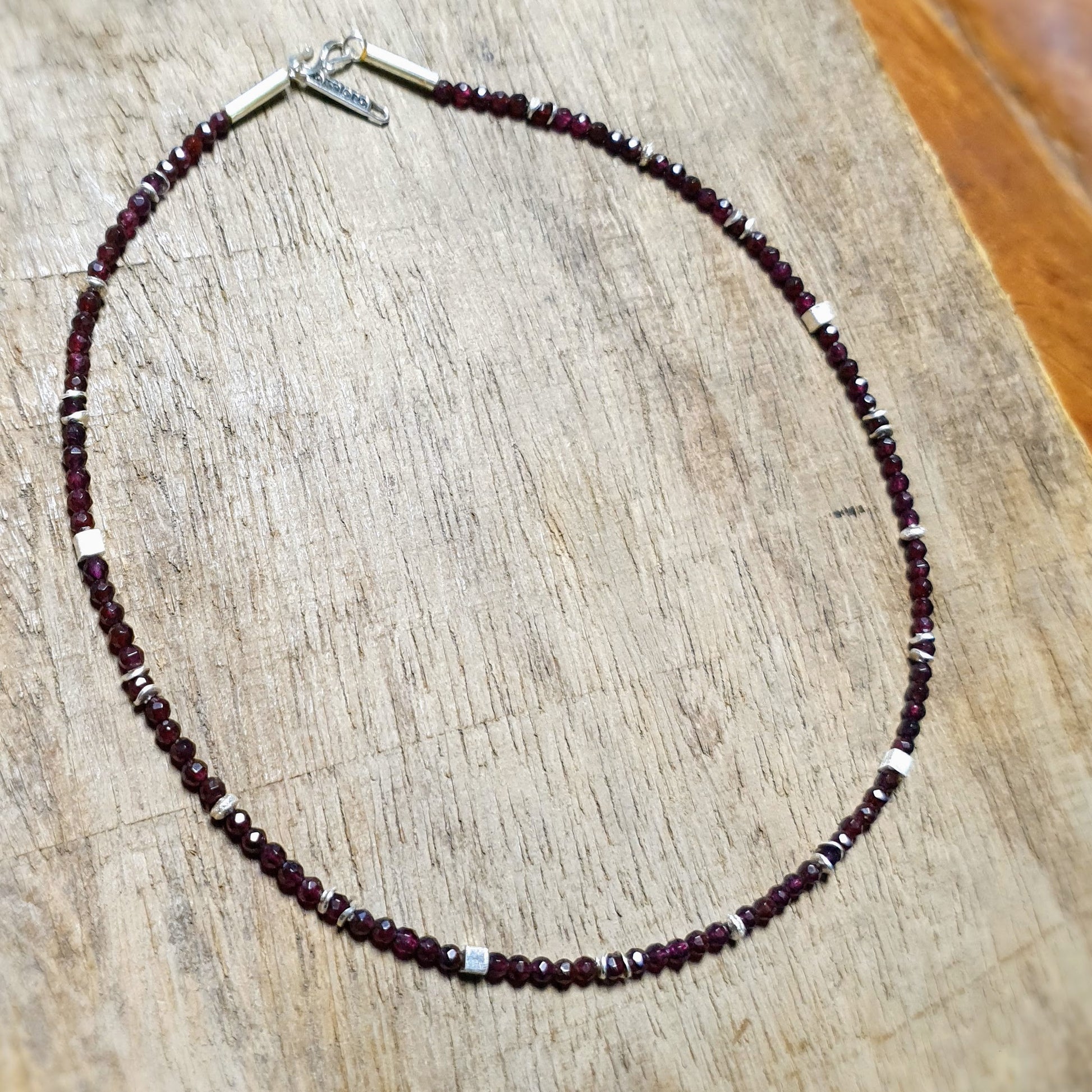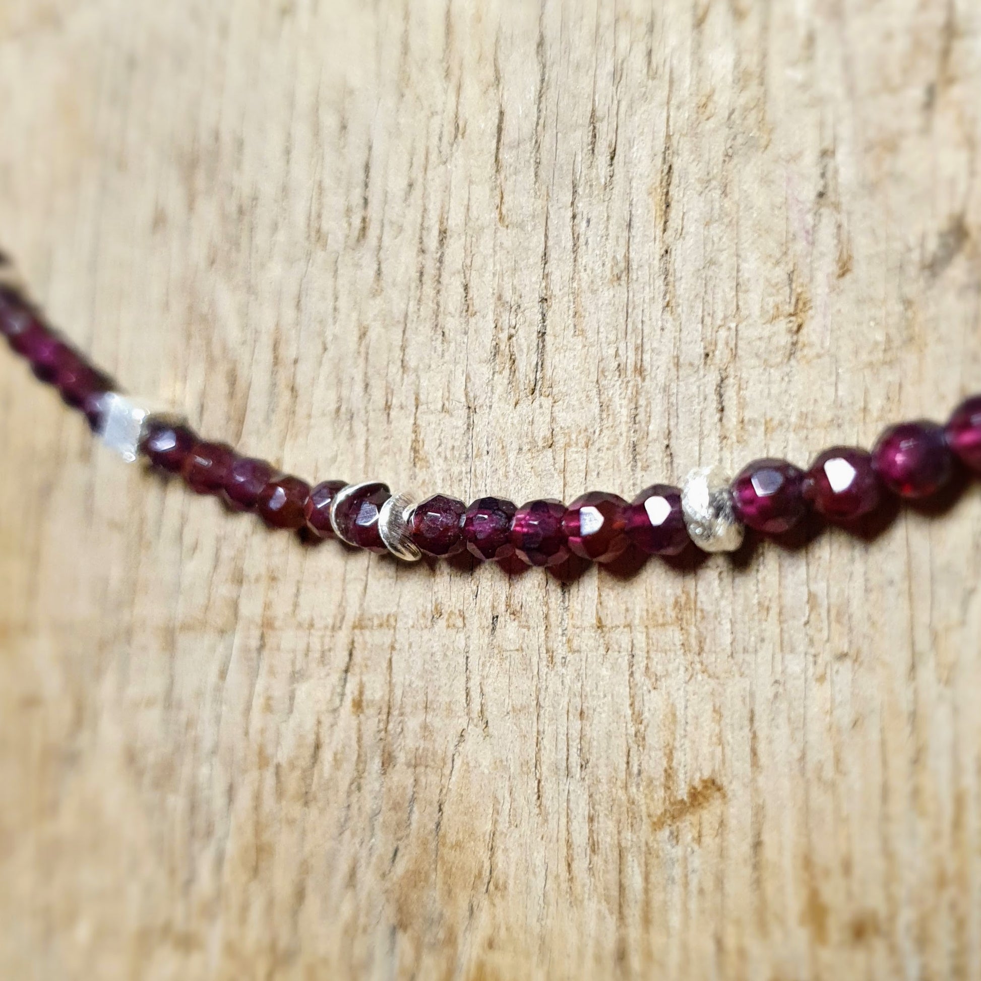 Fine handmade necklace with reddish-brown faceted garnet stones and matte silver beads in different shapes with silver clasp by ambra Schmuck.
