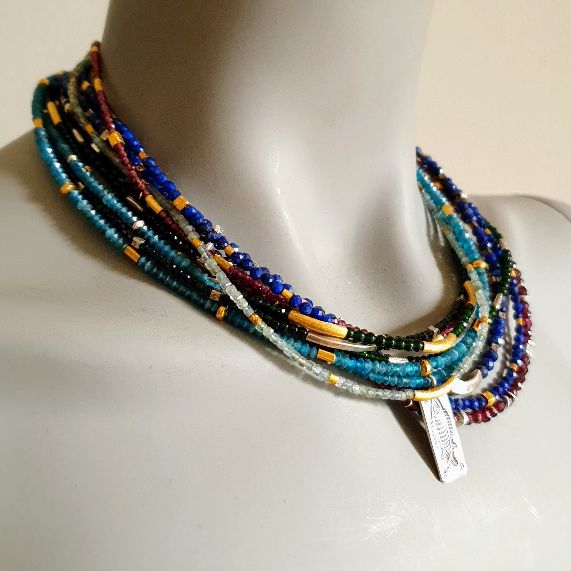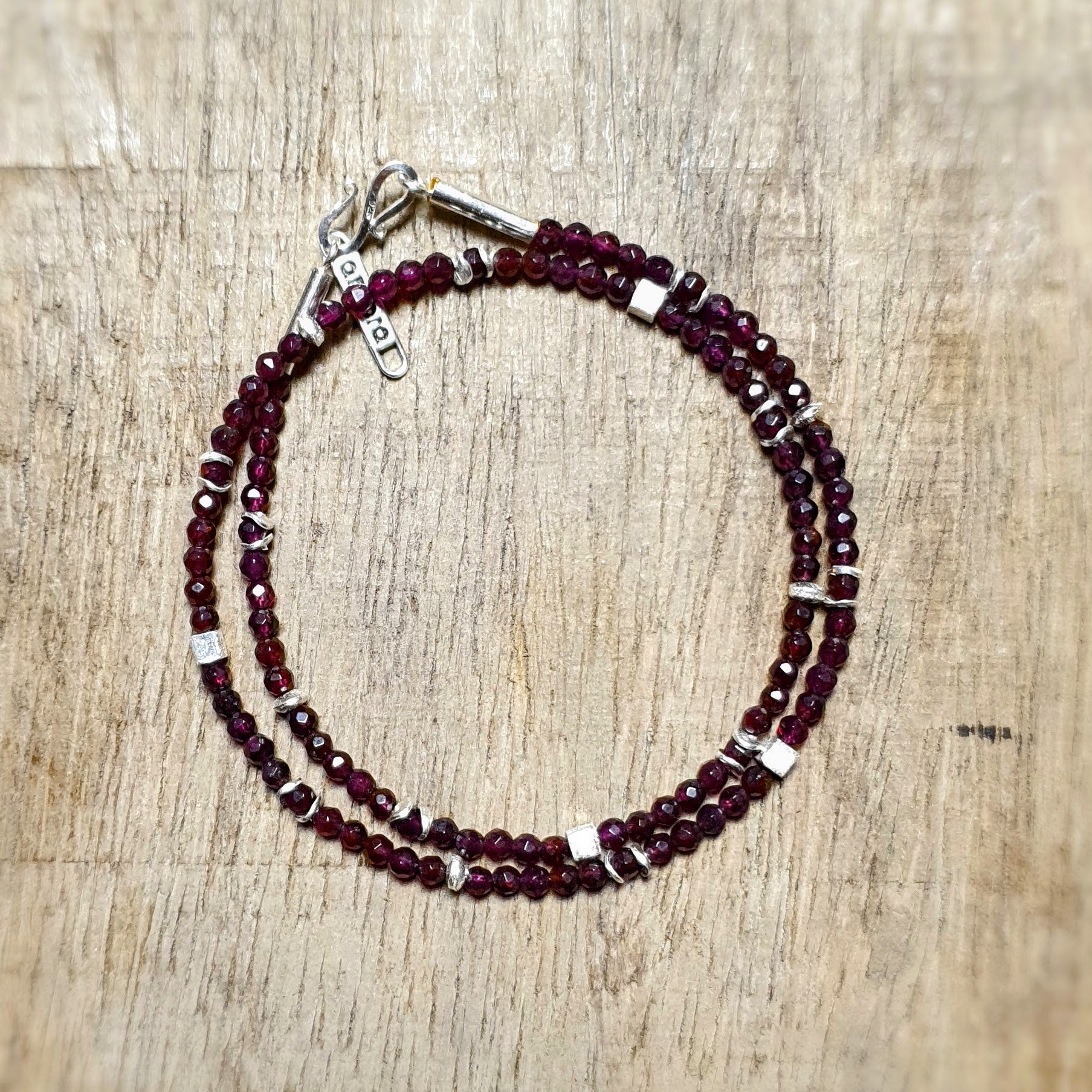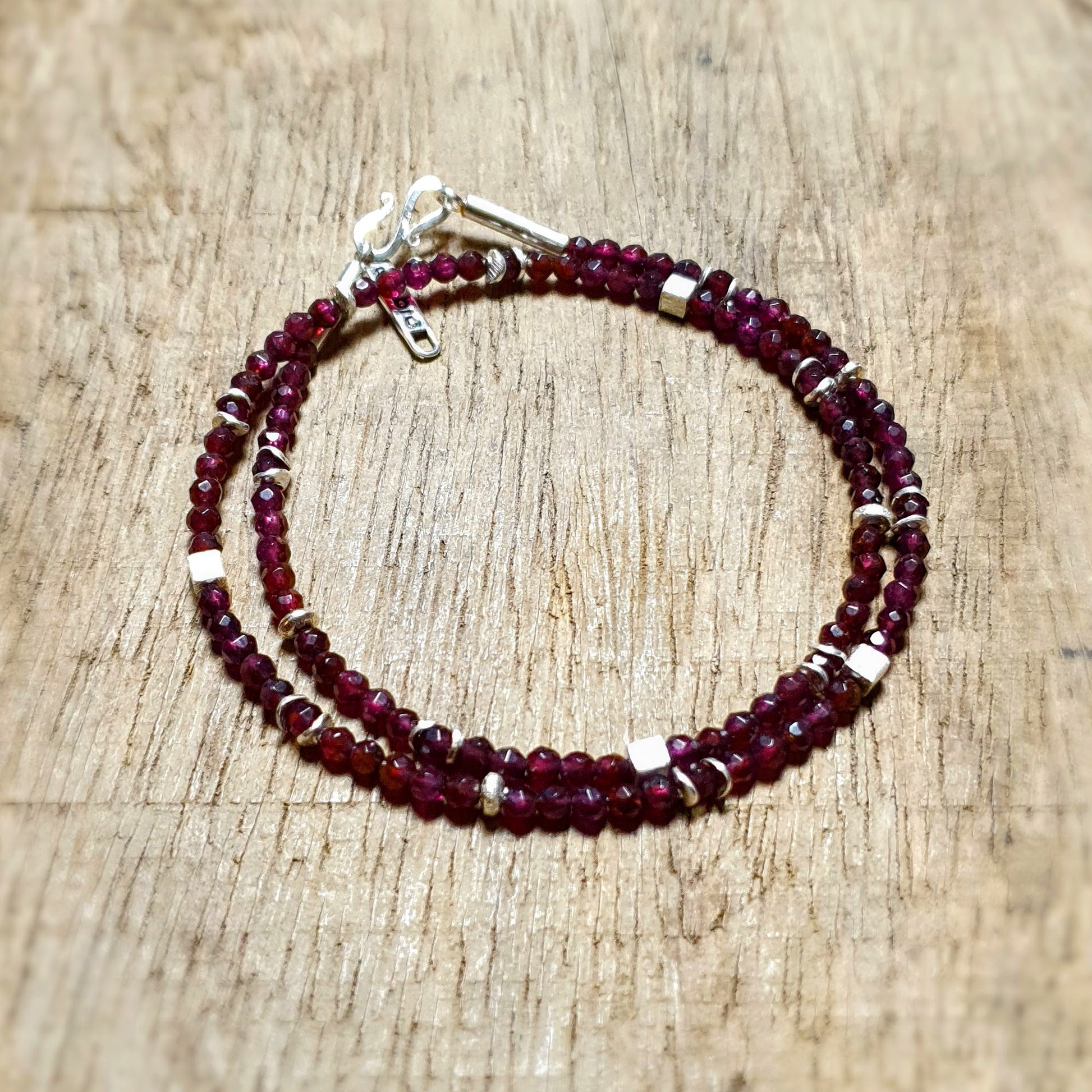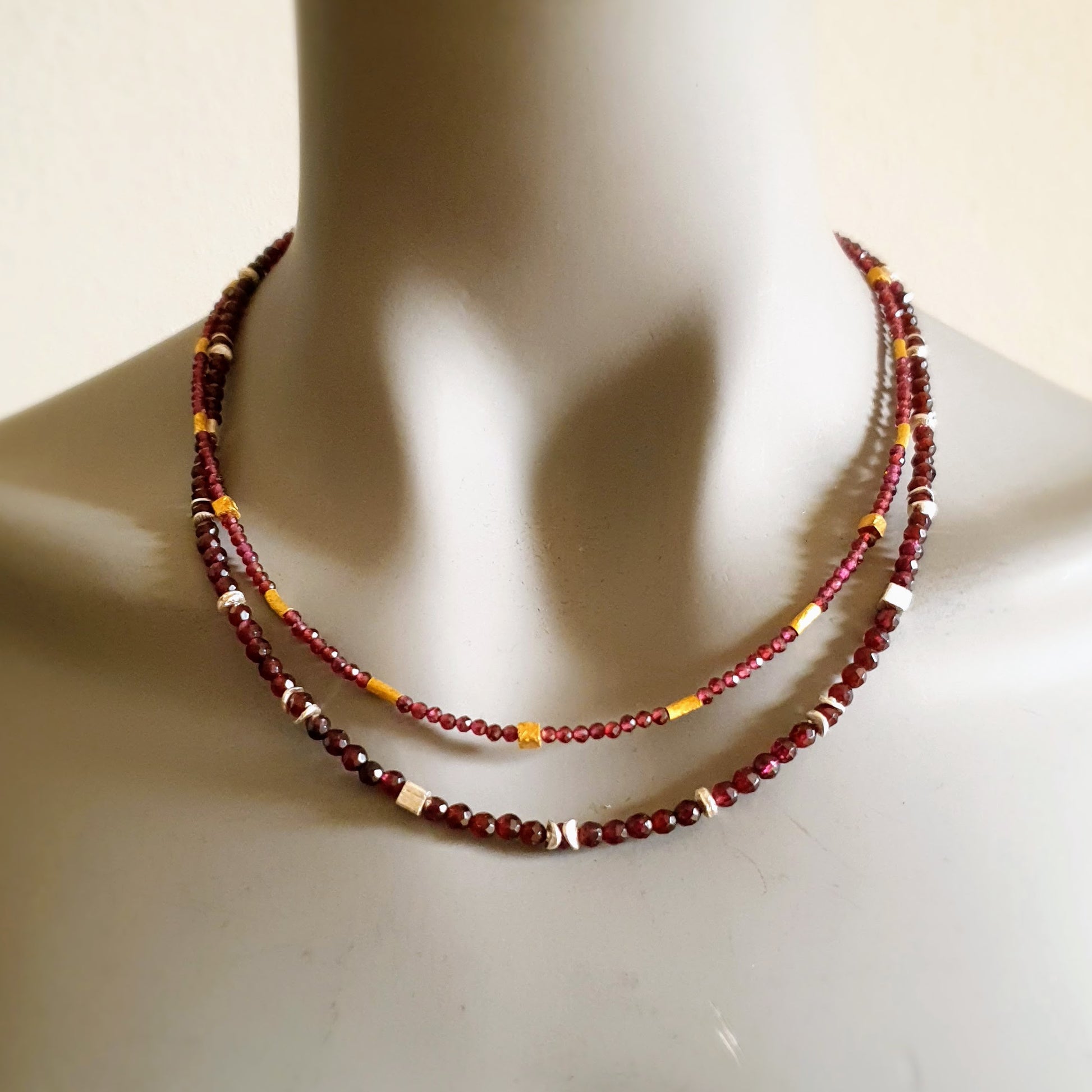 Fine handmade necklace with reddish-brown faceted garnet stones and matte silver beads in different shapes with silver clasp by ambra Schmuck.