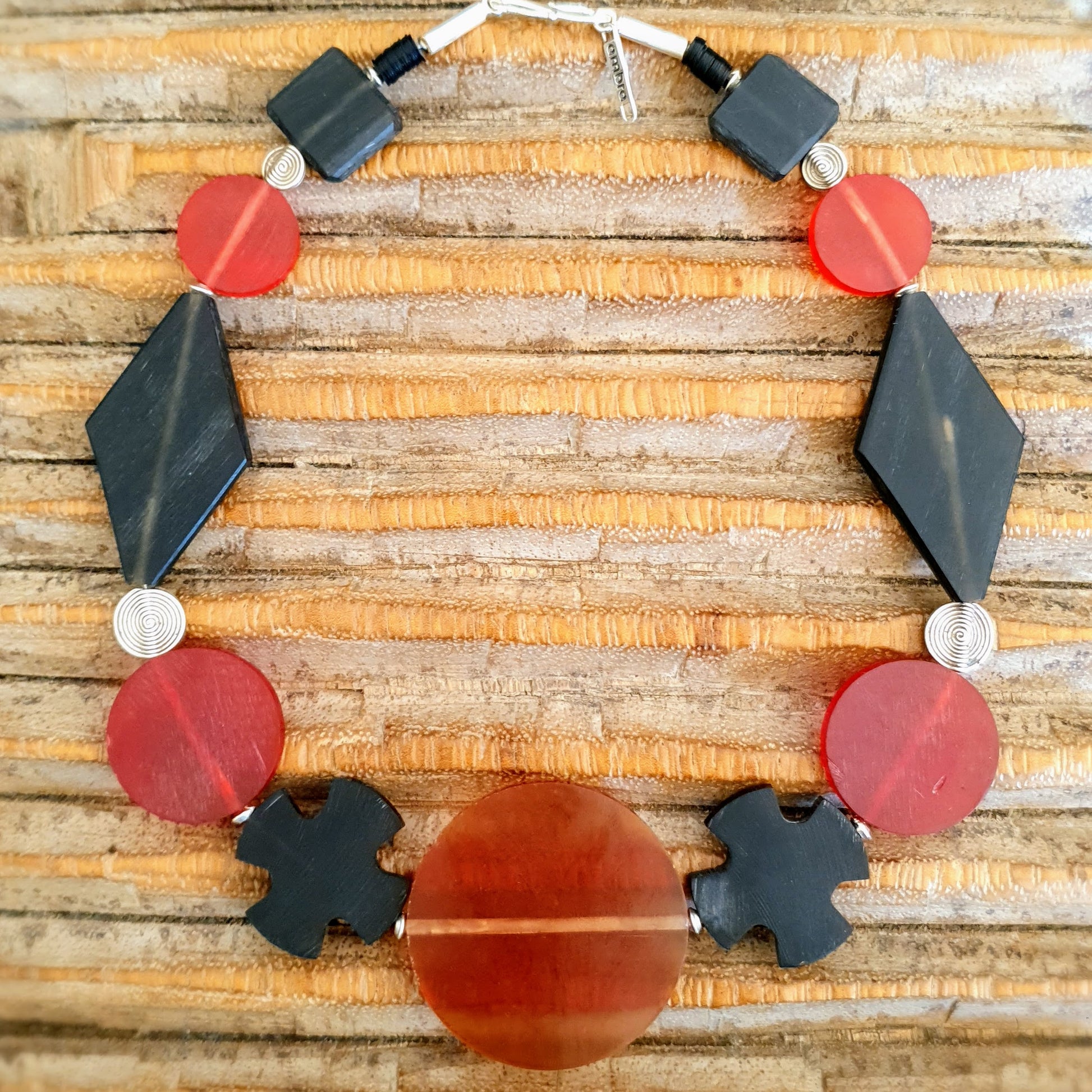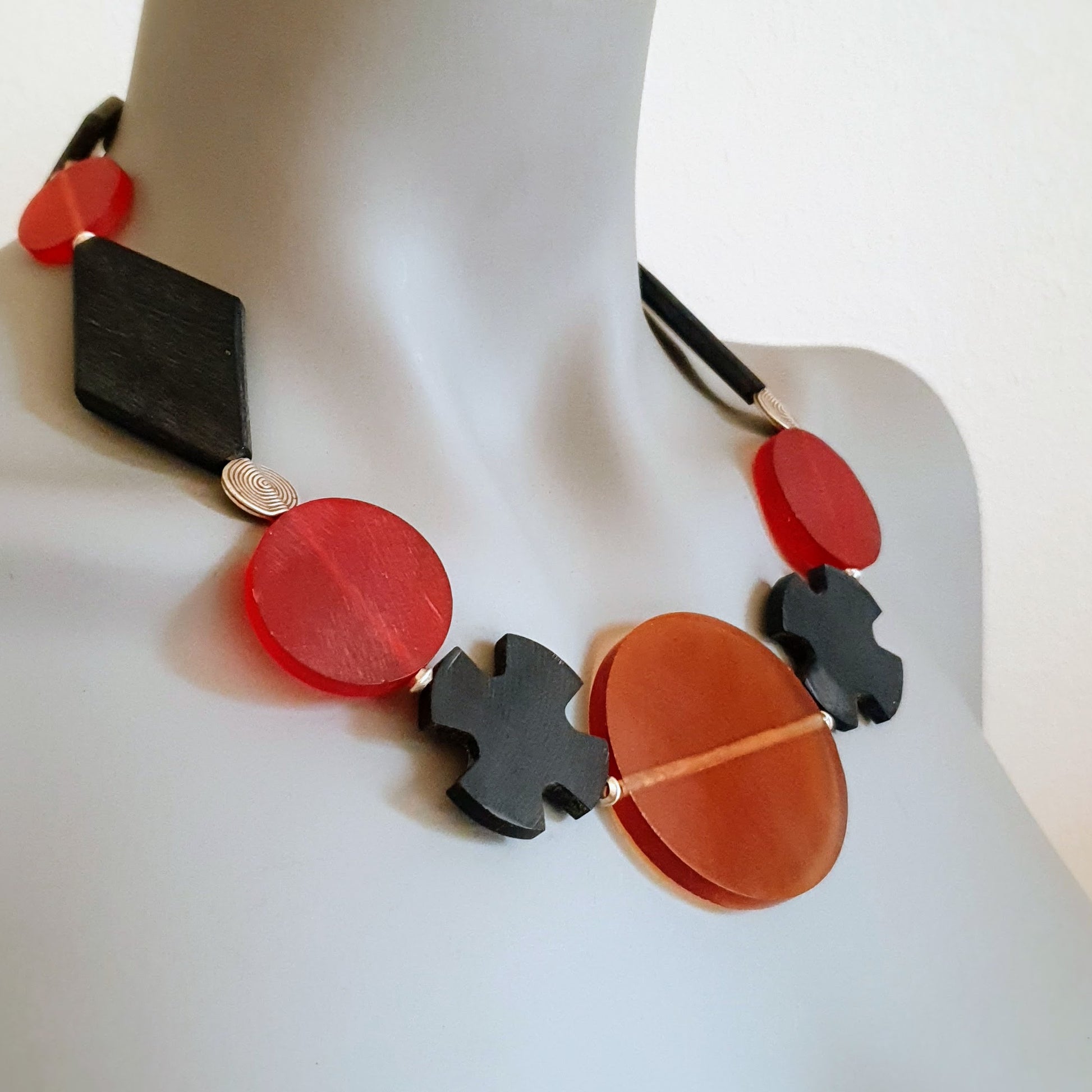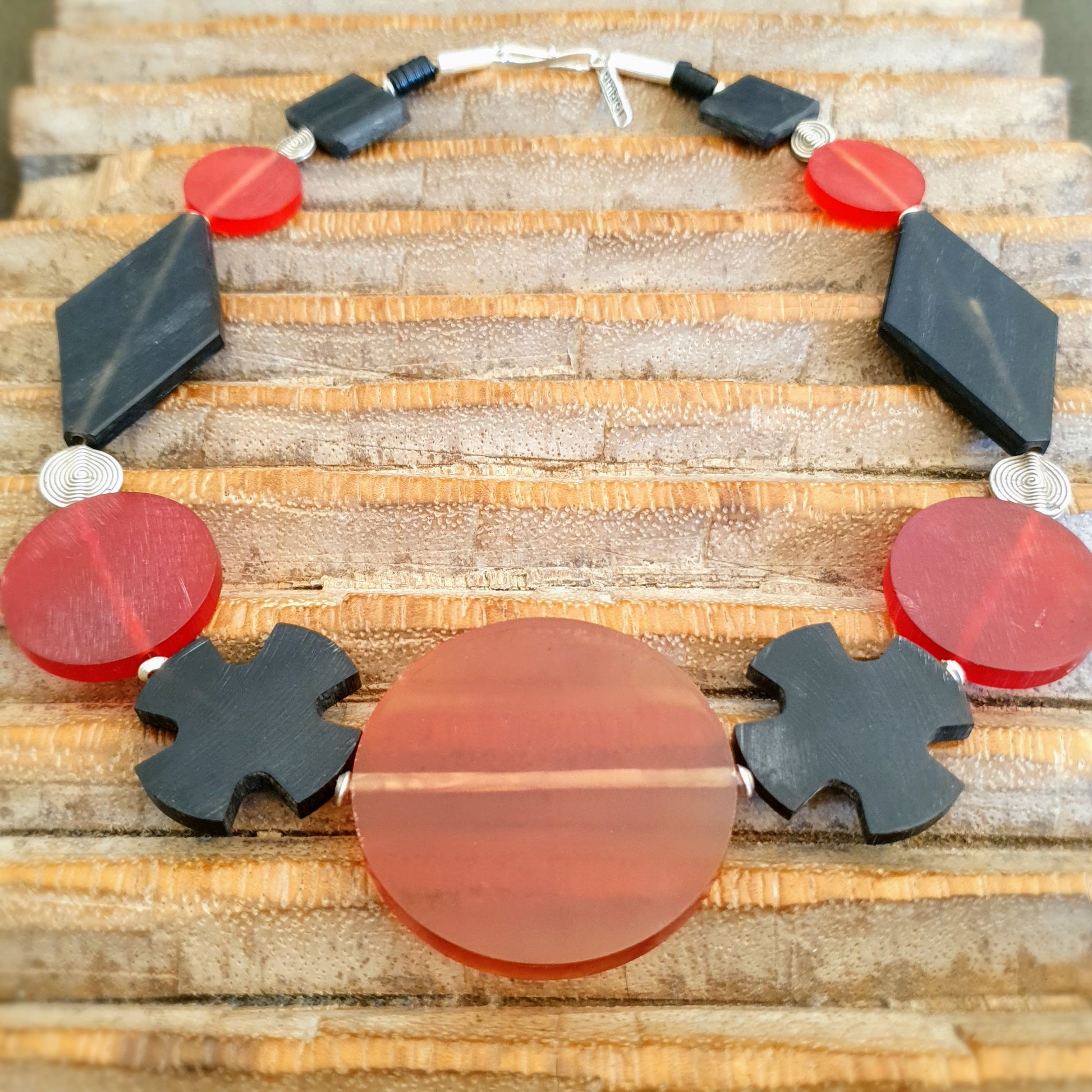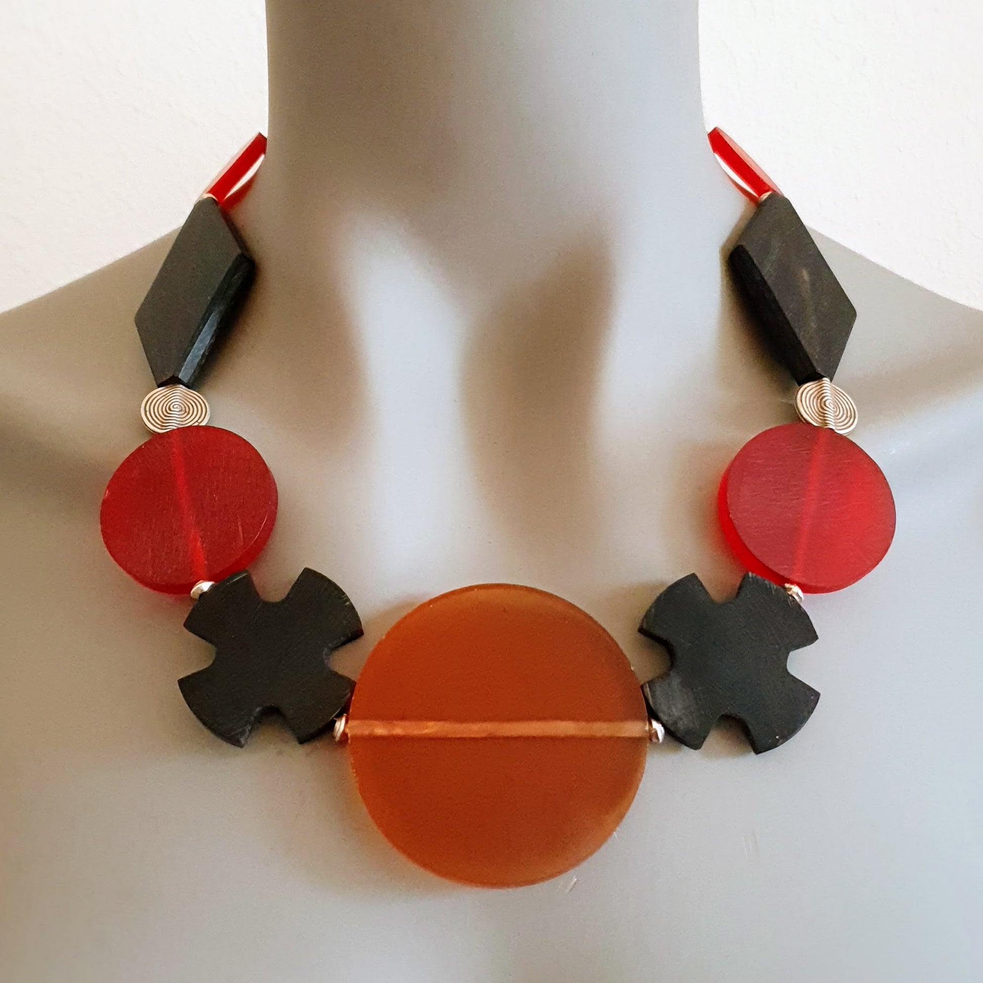 Großes handgearbeitetes Collier mit roten, rotbraunen und schwarzen flachen Harzelementen aus Indonesien und burmesischen Silberperlen mit Spiralmuster mit Silberverschluss von ambra Schmuck.