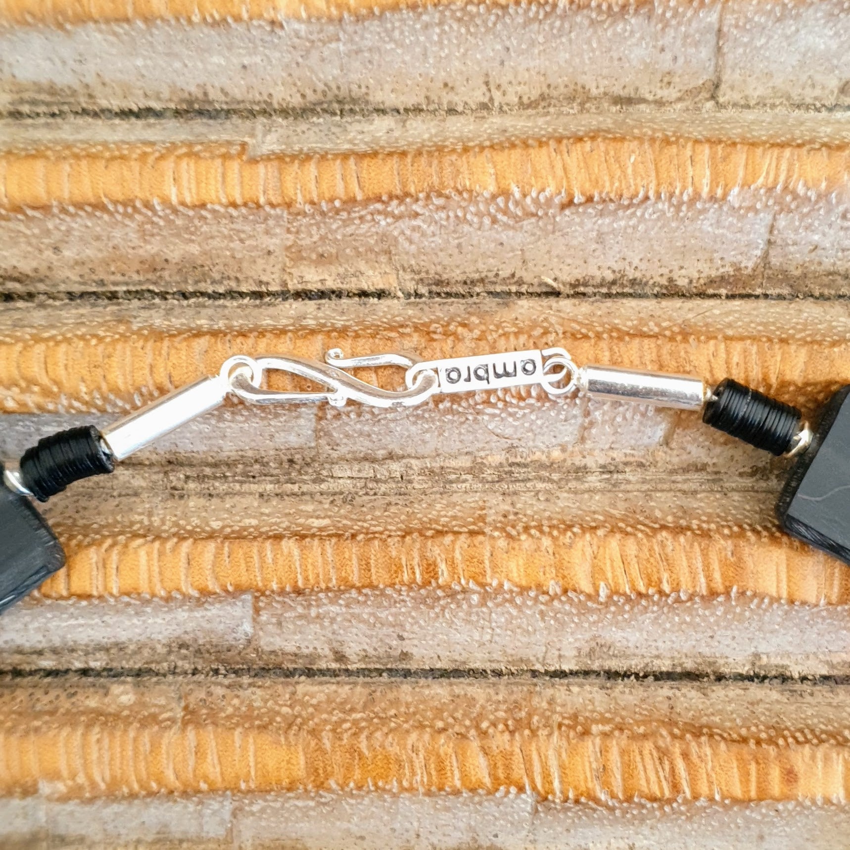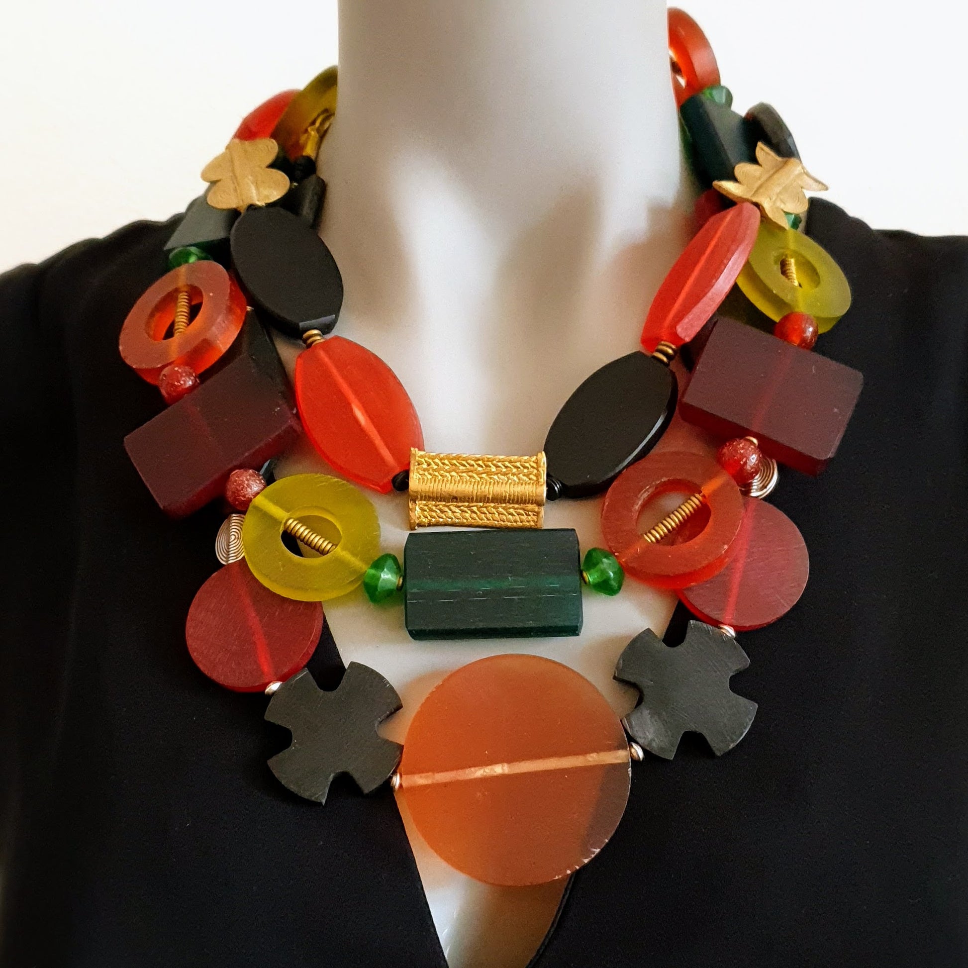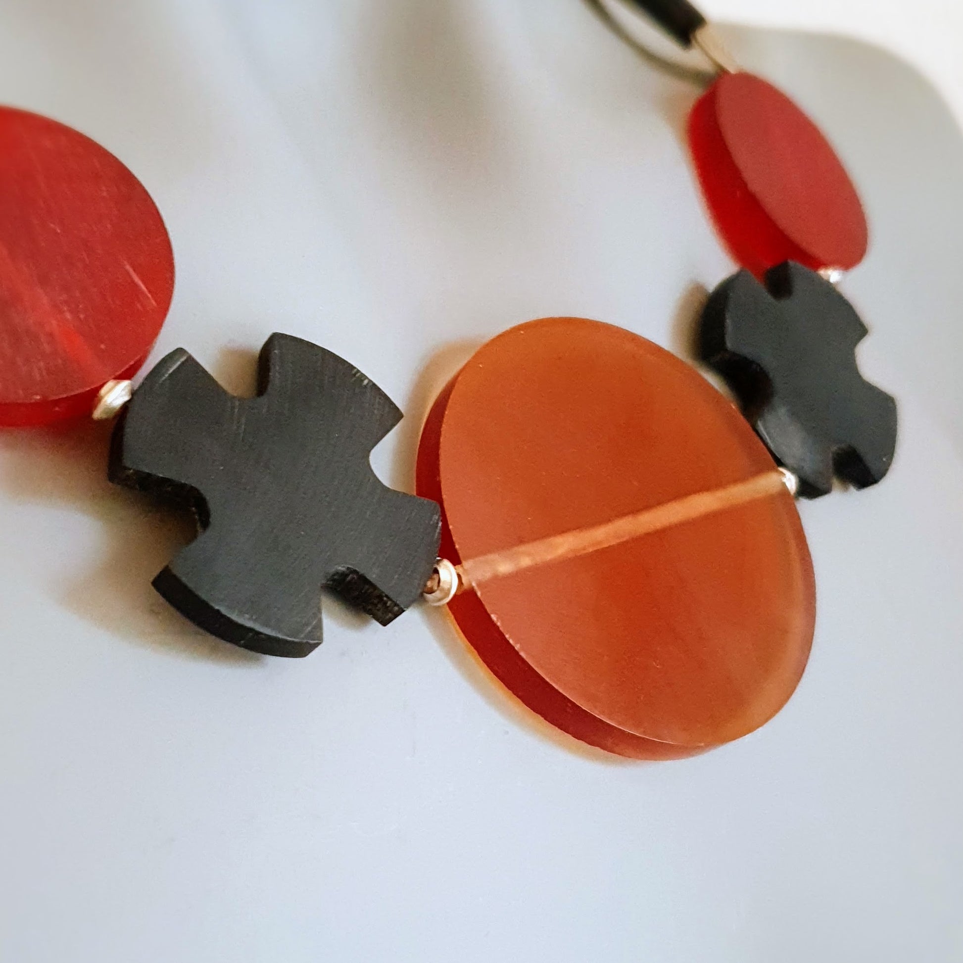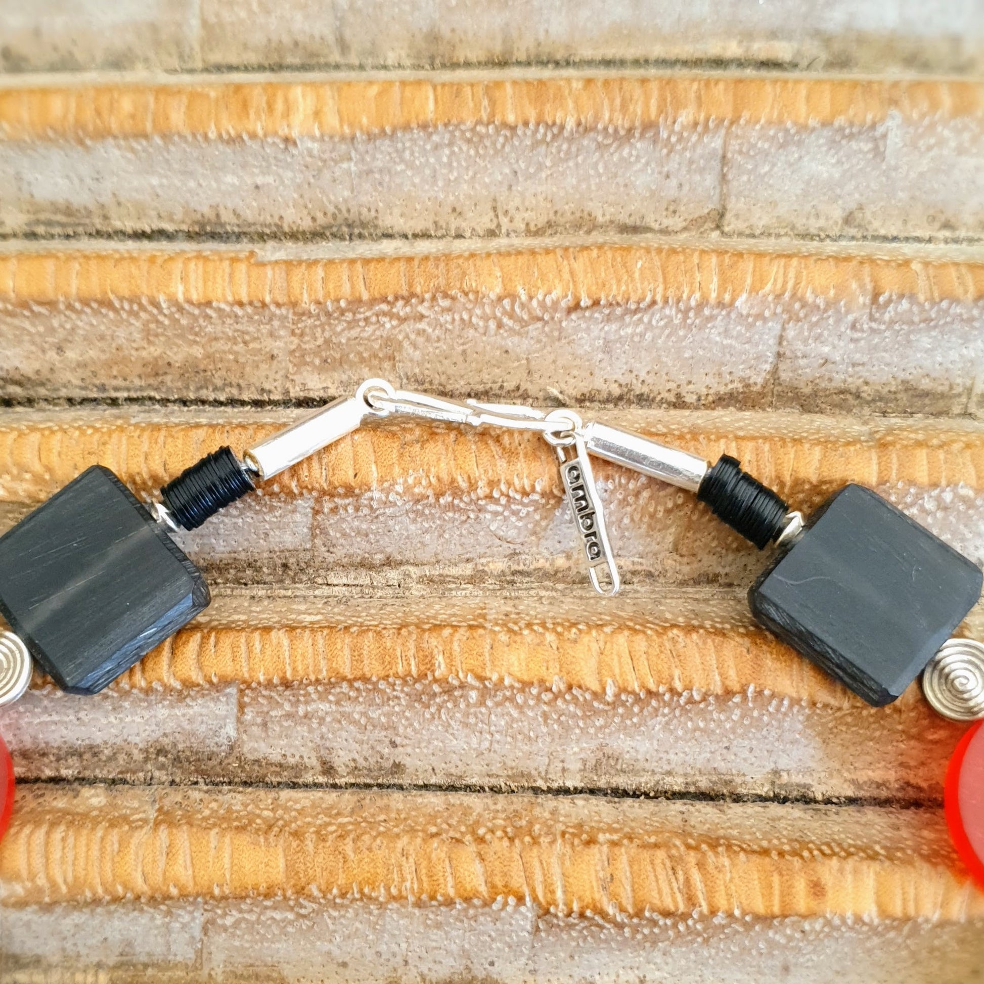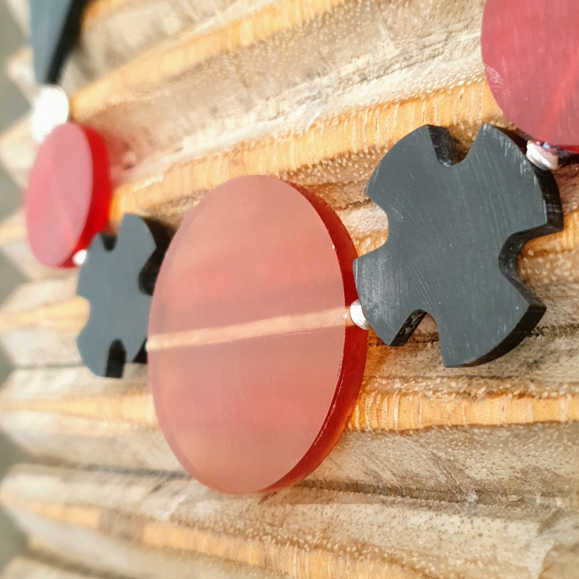 Großes handgearbeitetes Collier mit roten, rotbraunen und schwarzen flachen Harzelementen aus Indonesien und burmesischen Silberperlen mit Spiralmuster mit Silberverschluss von ambra Schmuck.