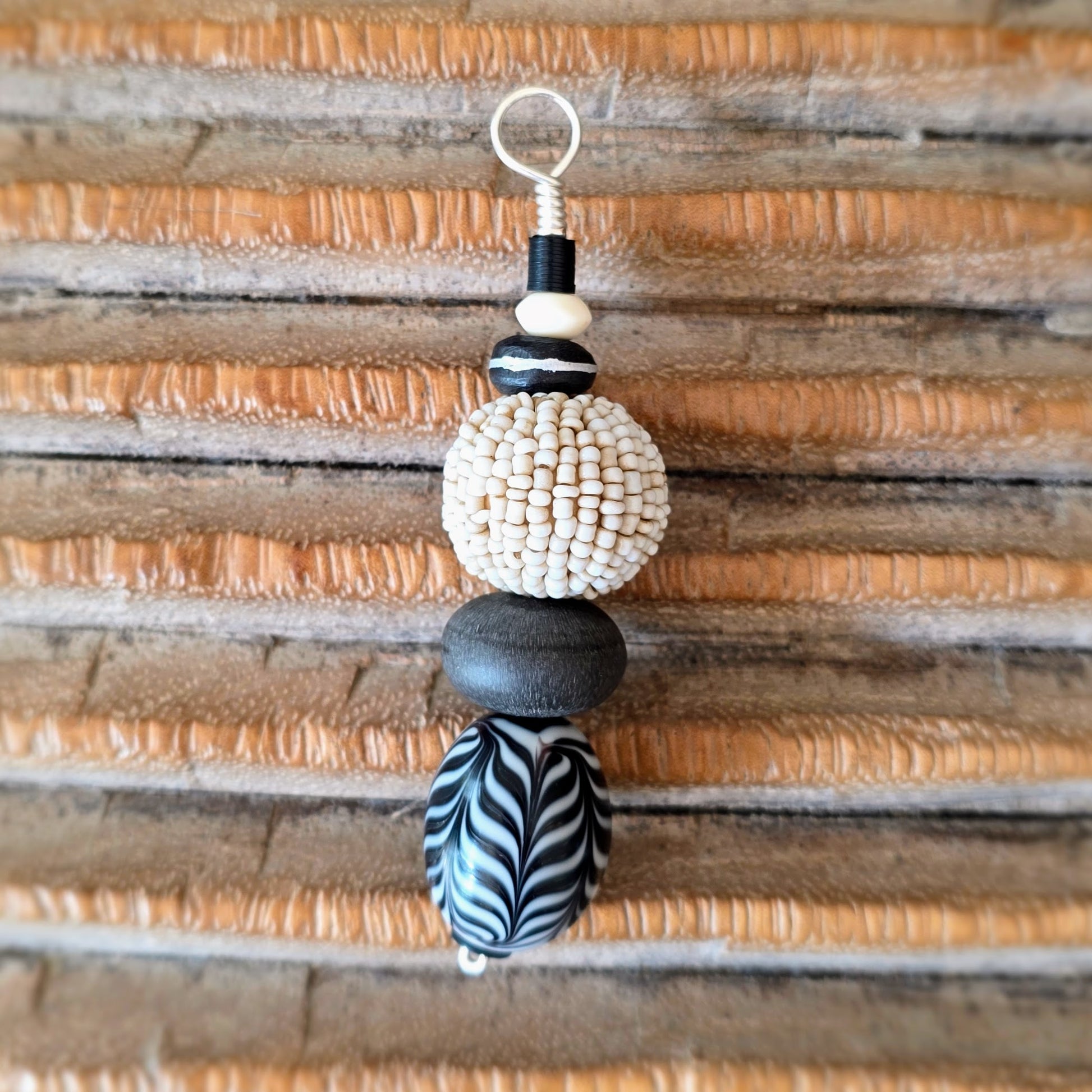 Handmade pendant with black and white feathered glass bead from the island of Java, black Indonesian resin bead, white glass bead ball and Tuareg ebony bead on silver wire by ambra Schmuck.