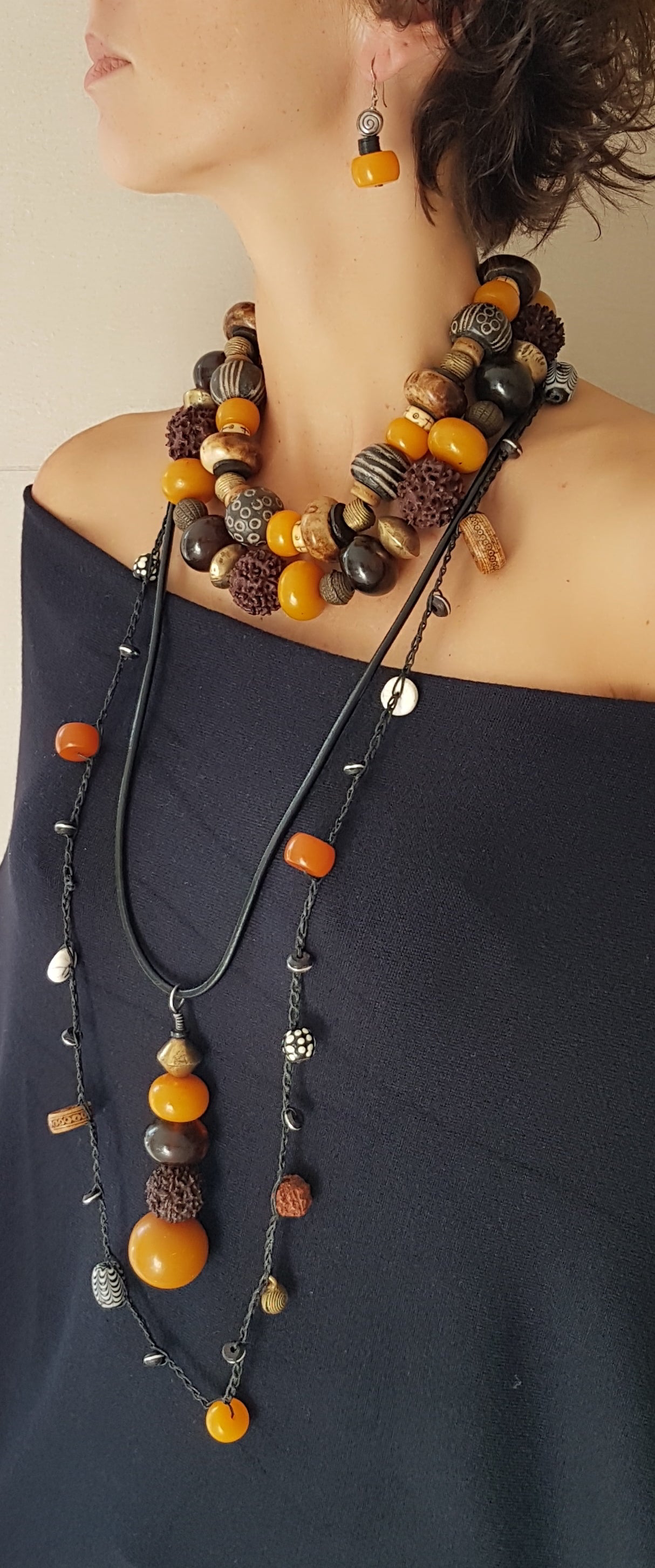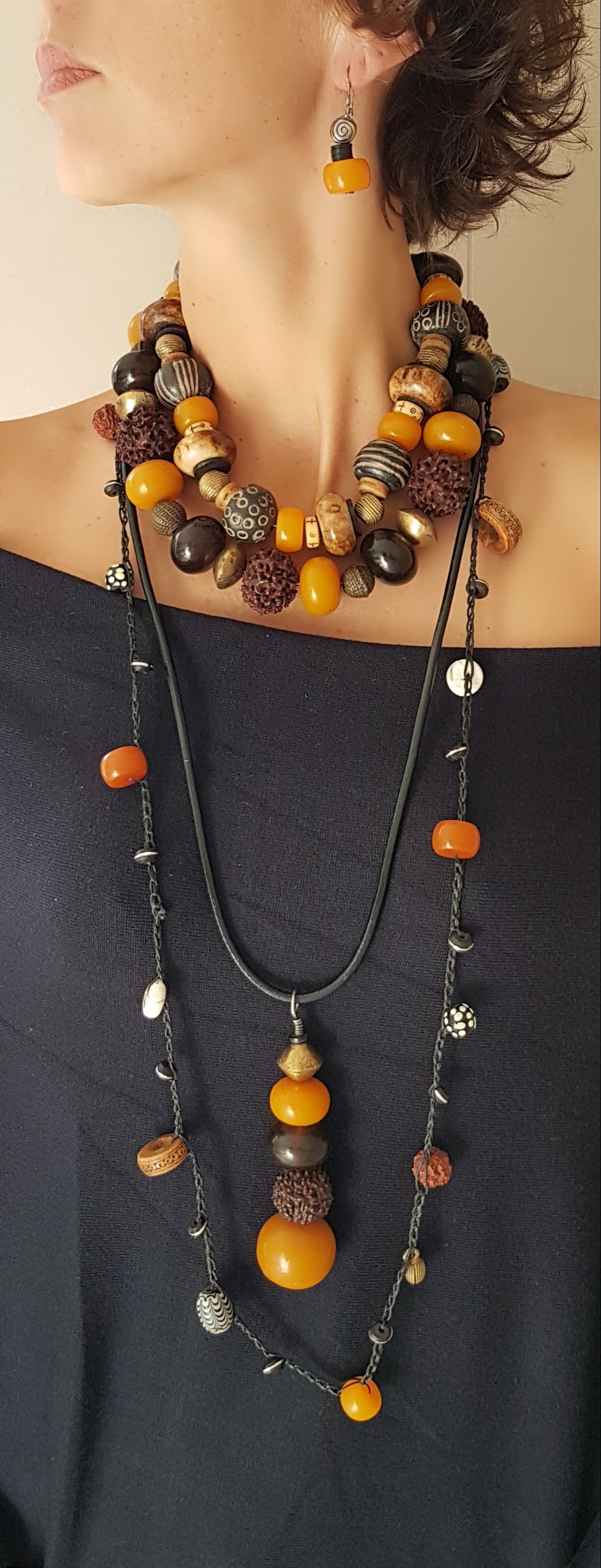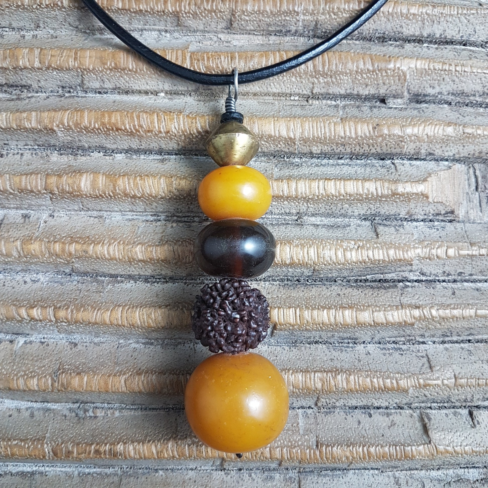 Handcrafted pendant with yellow and black resin beads from Indonesia, African bronze bead and Rudraksha seeds from a Nepalese prayer mala on silver wire by ambra Schmuck.