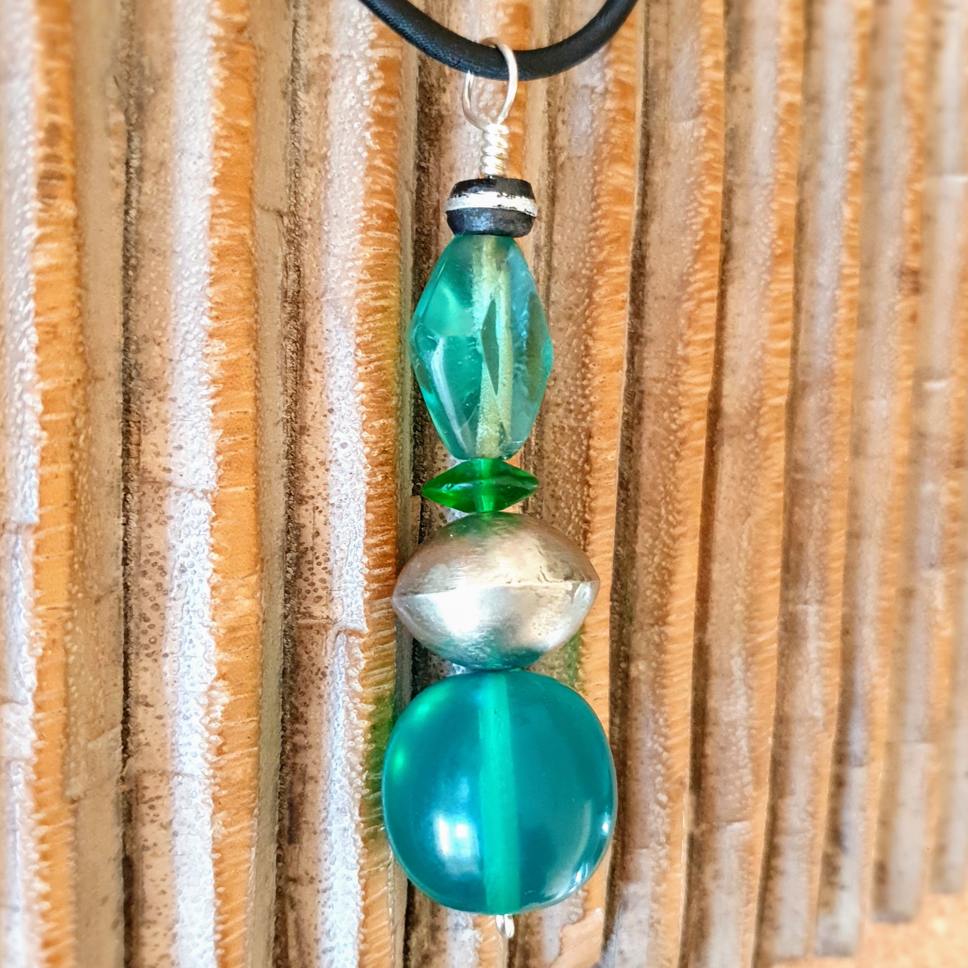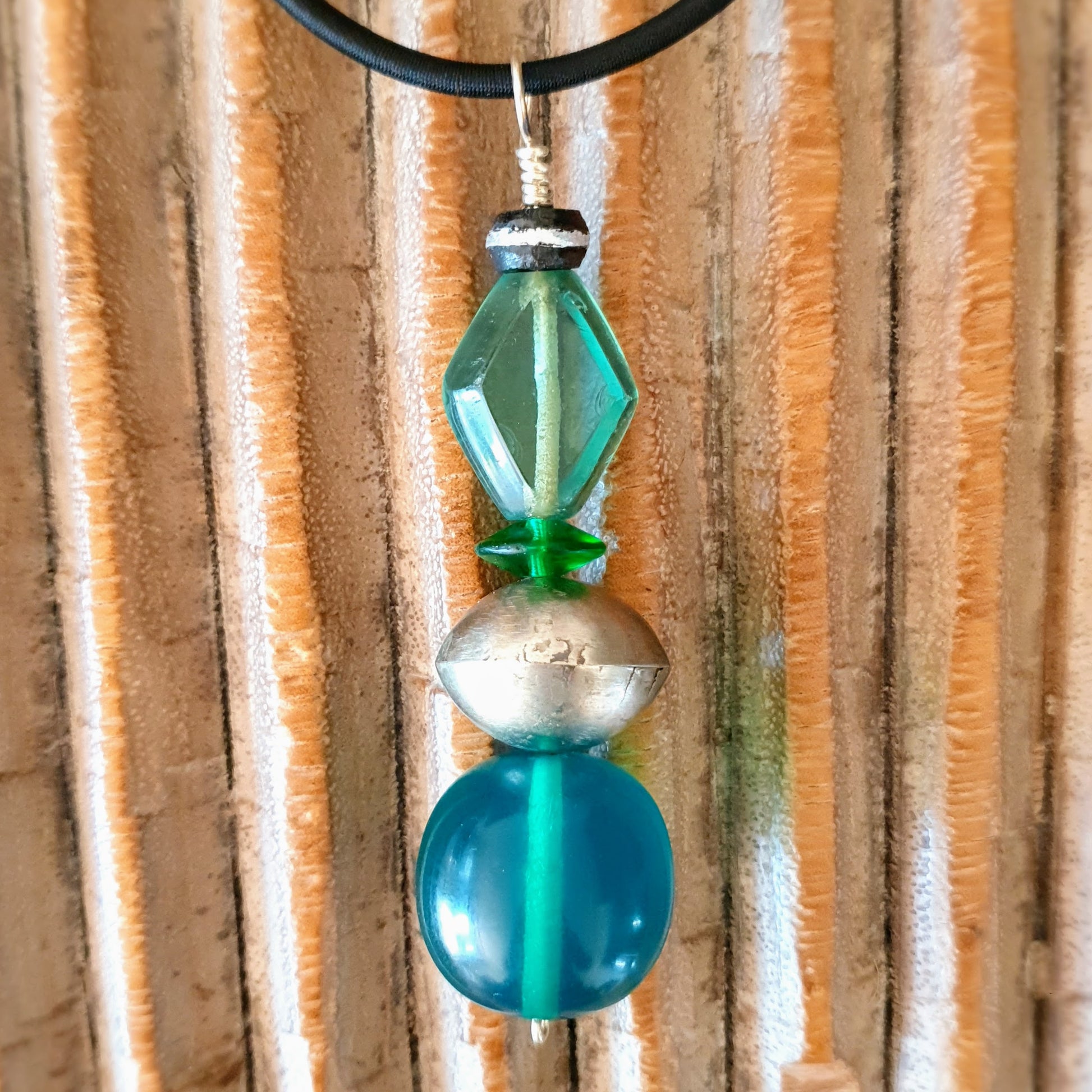 Handmade necklace pendant with green glass, green resin, hollow metal bead and ebony bead with Tuareg metal inlays on silver wire by ambra Schmuck.