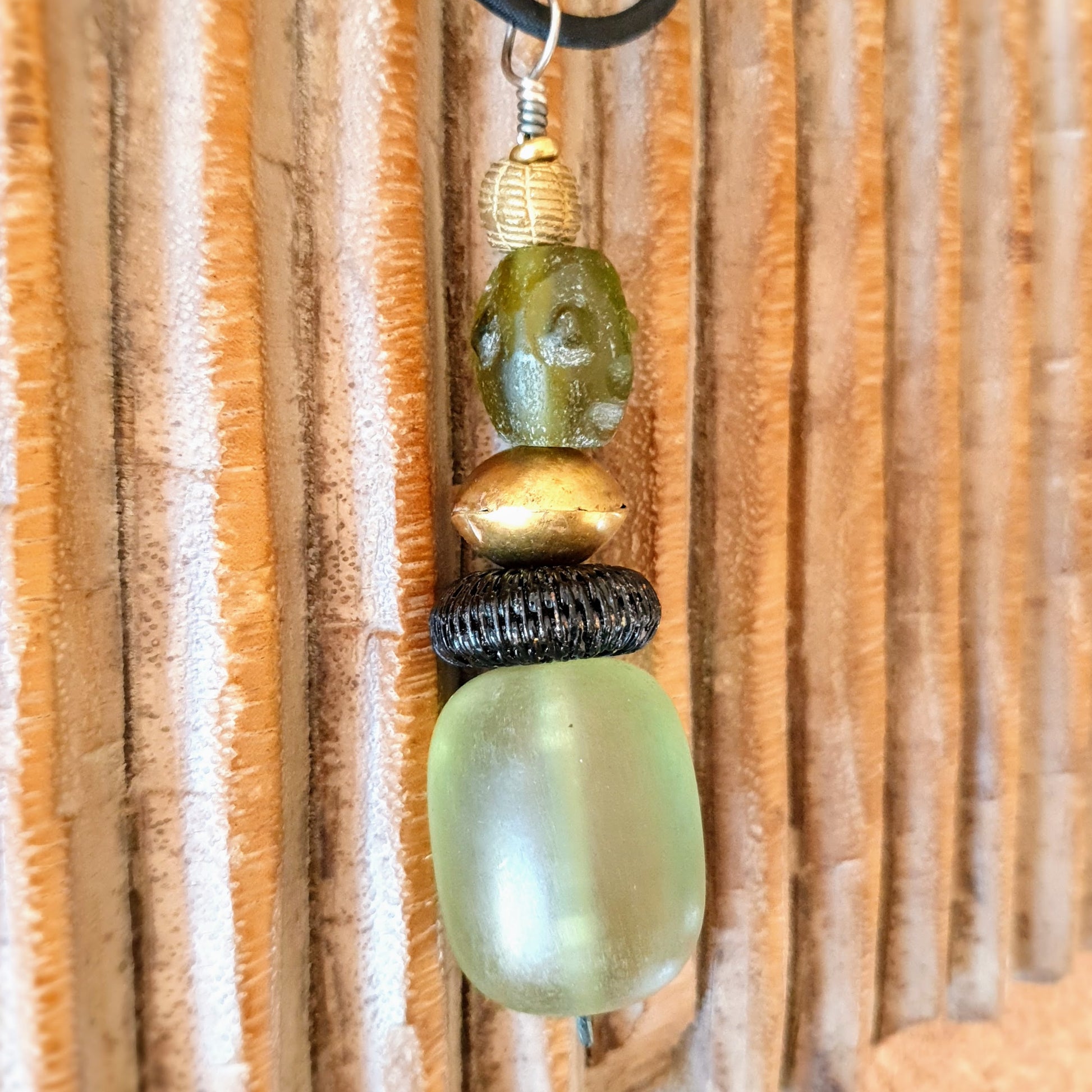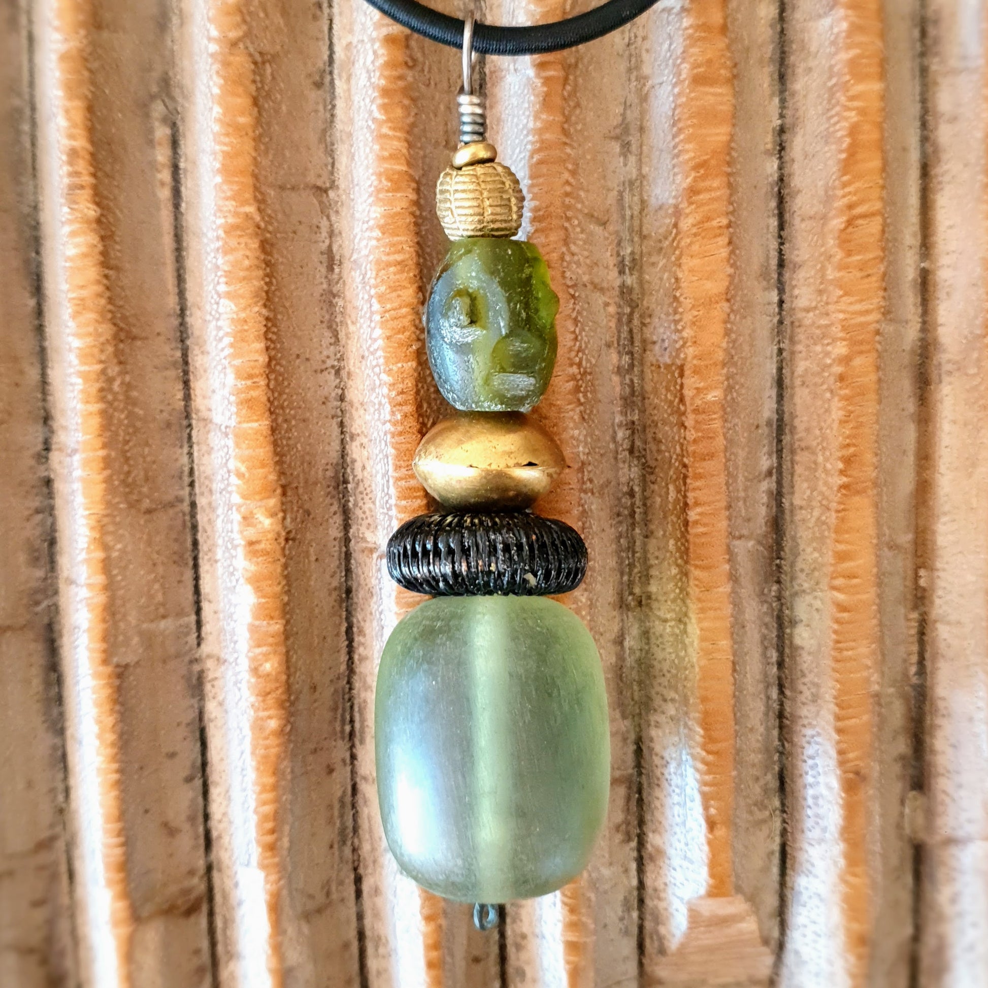Handmade necklace pendant with olive green glass and resin, cursed rattan basket and Tuareg bronze bead on silver wire by ambra Schmuck.