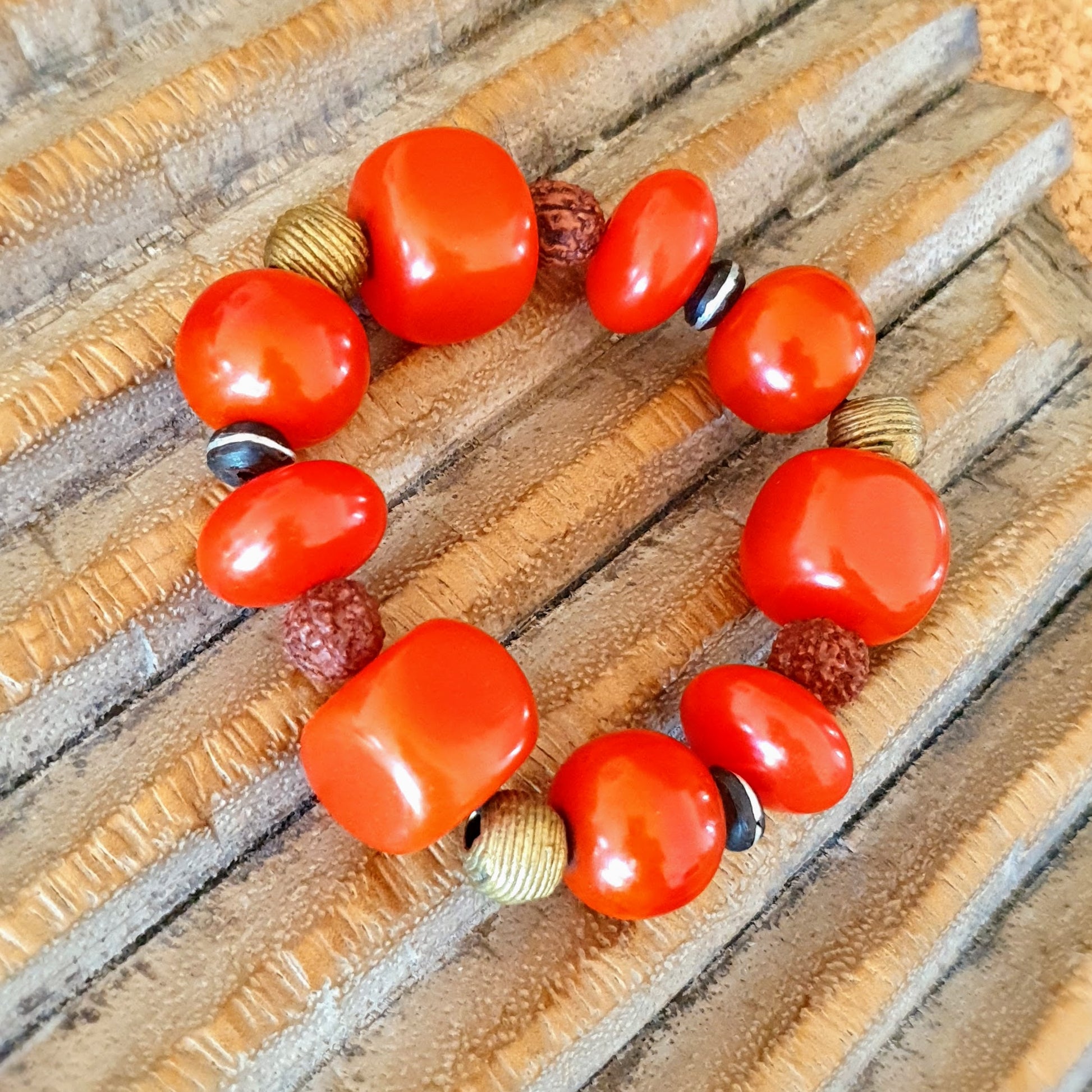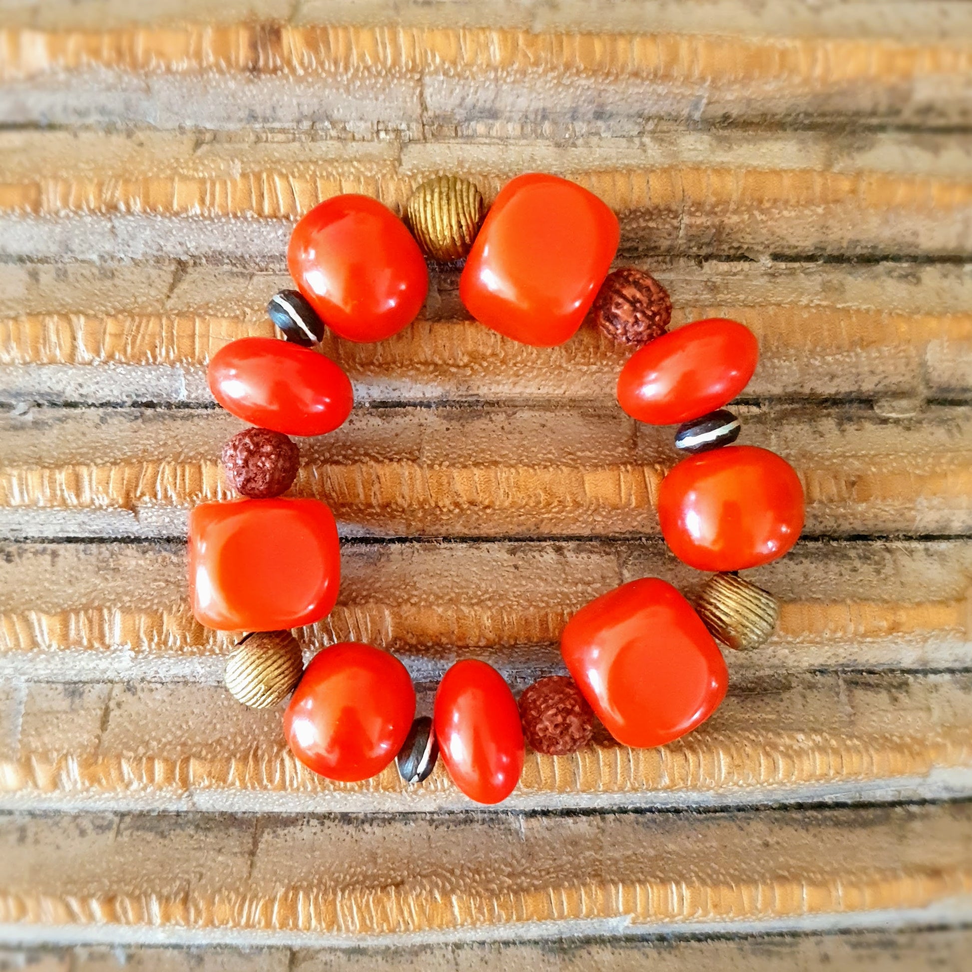 Handgefertigtes Armband mit orangefarbenen Harzperlen aus Indonesien, braunen Rudraksha-Samen aus nepalesischen Gebets-Malas, Bronzeperlen aus Afrika und Ebenholzperlen der Tuareg auf Gummiband von ambra Schmuck.