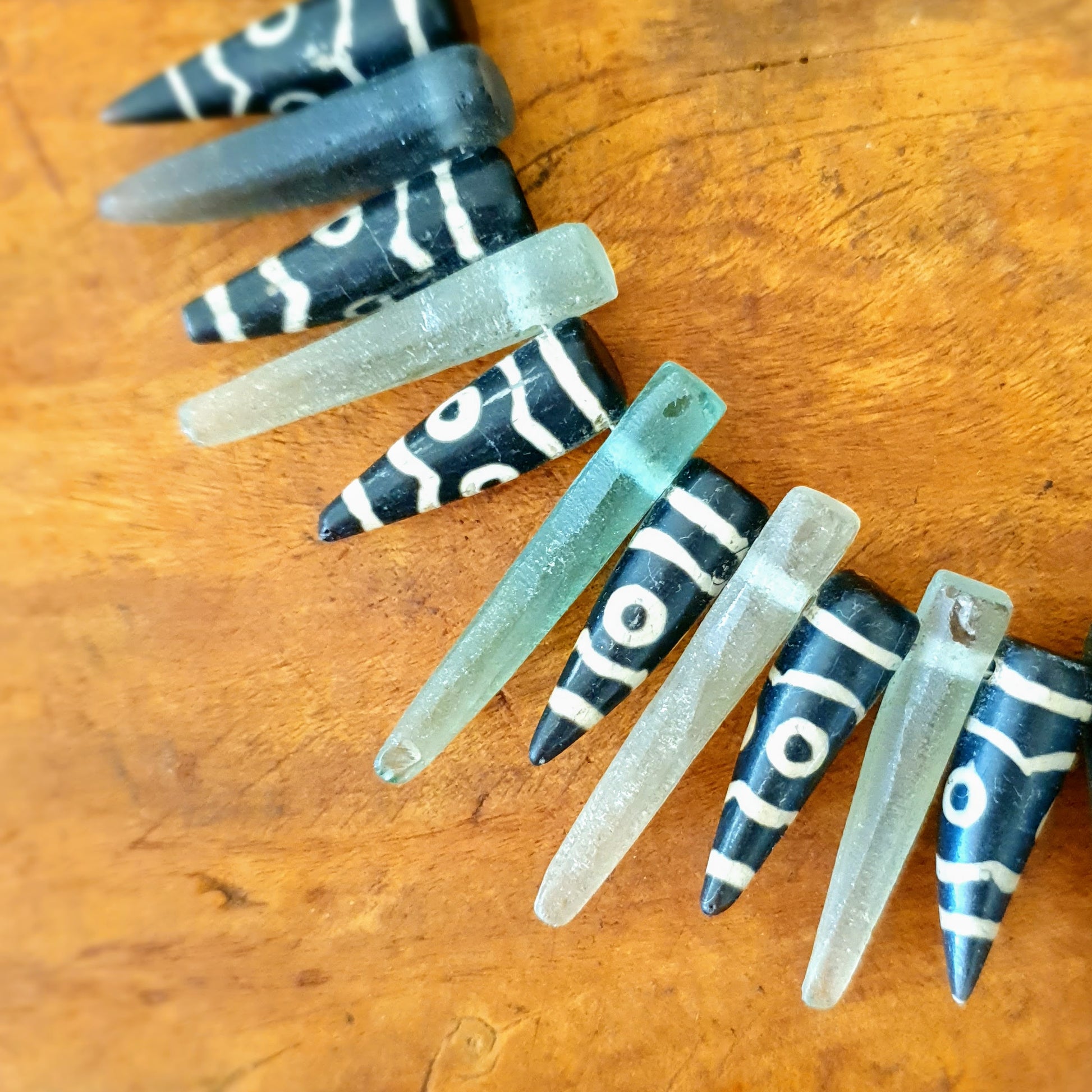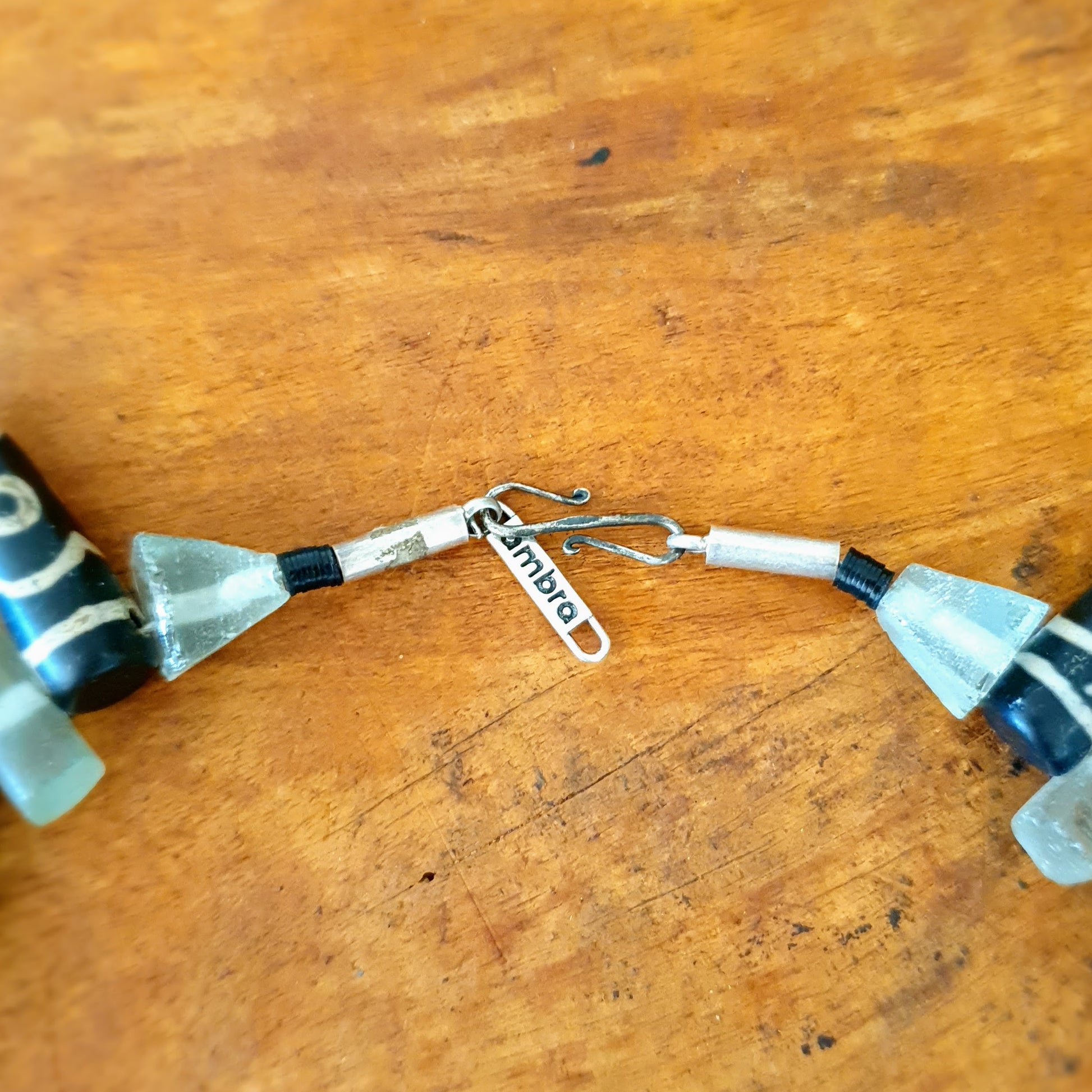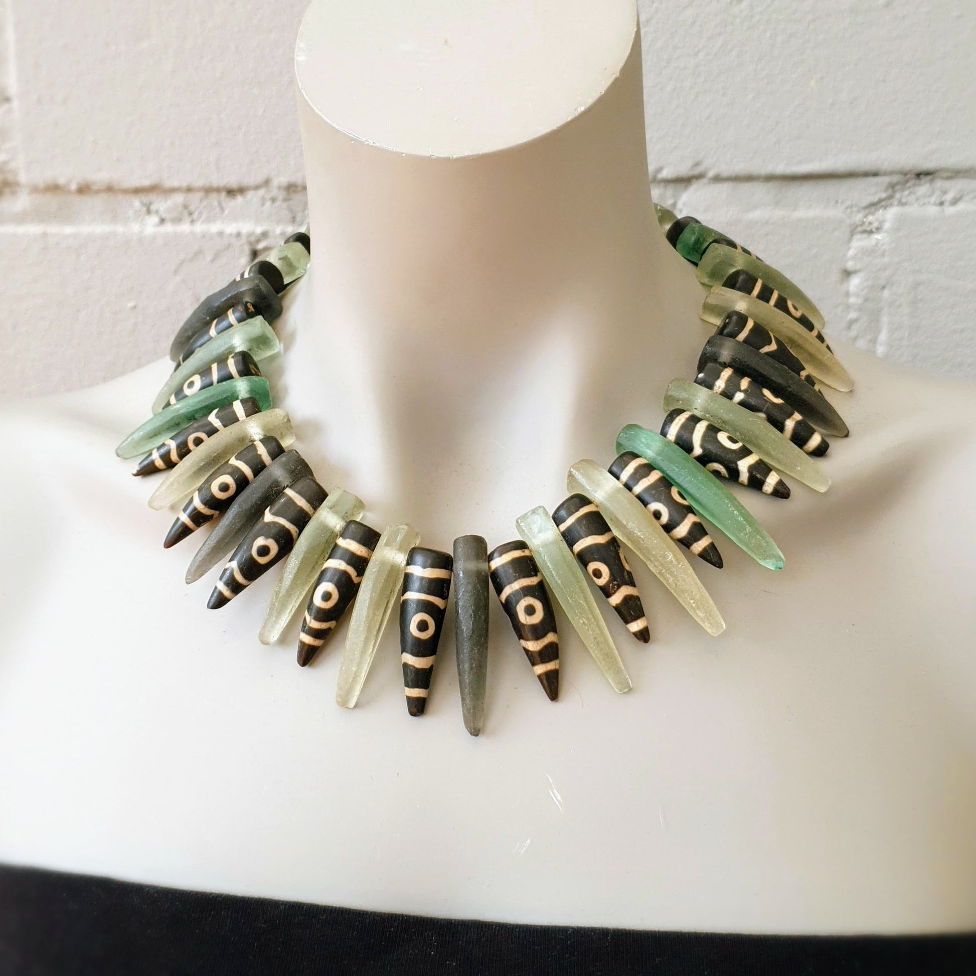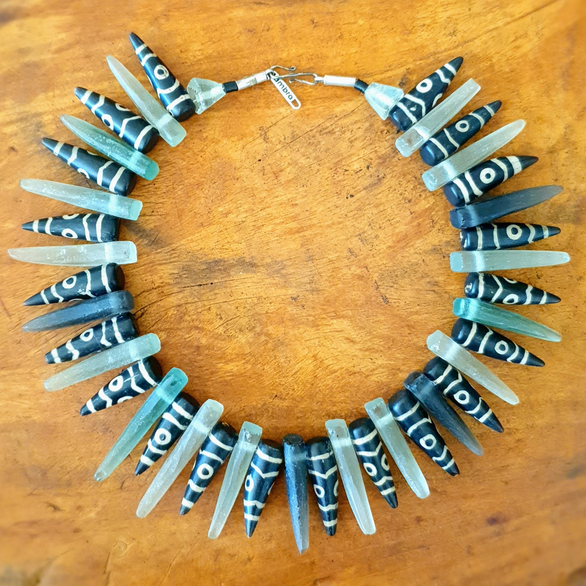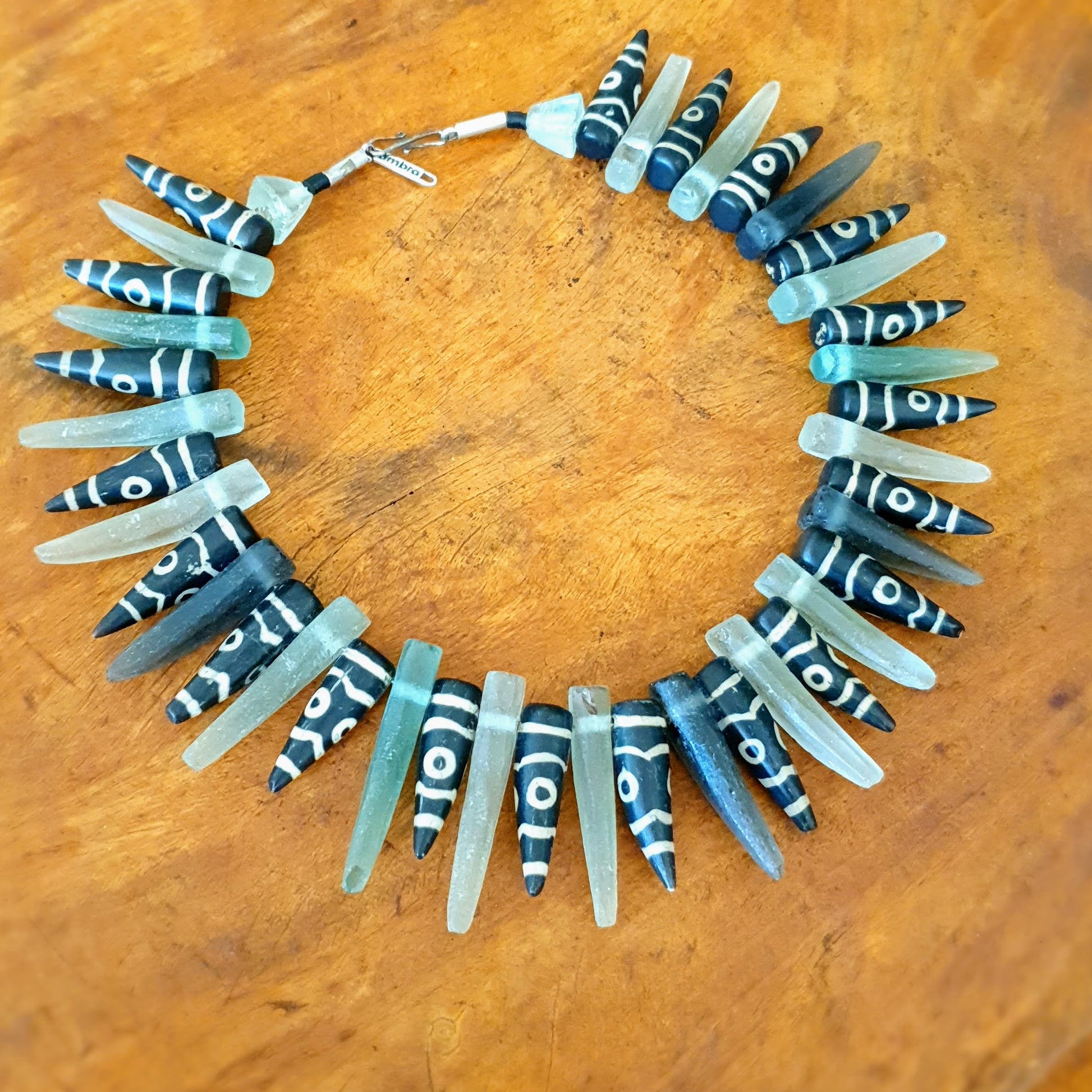 Ausdrucksstarke handgearbeitete Unikat- Halskette mit grünen matten Recyclingglaselementen von der Insel Java und Achatsteinzacken mit geätzten Mustern mit Silberverschluss von ambra Schmuck.