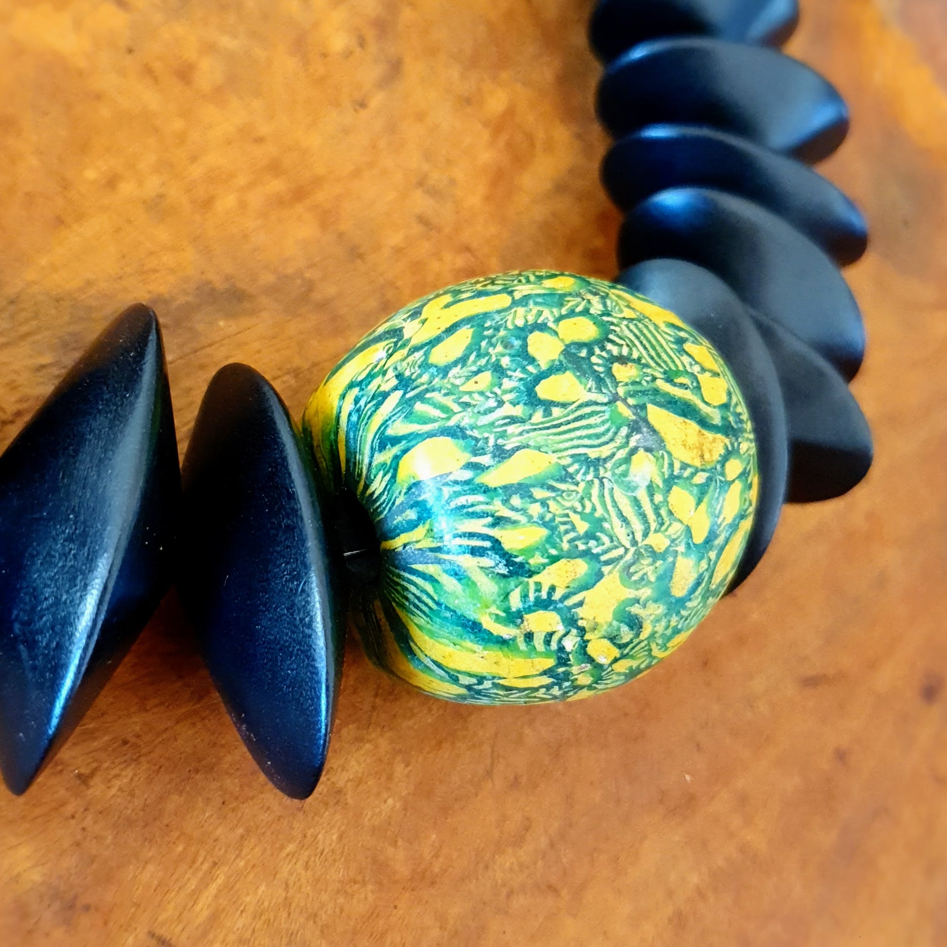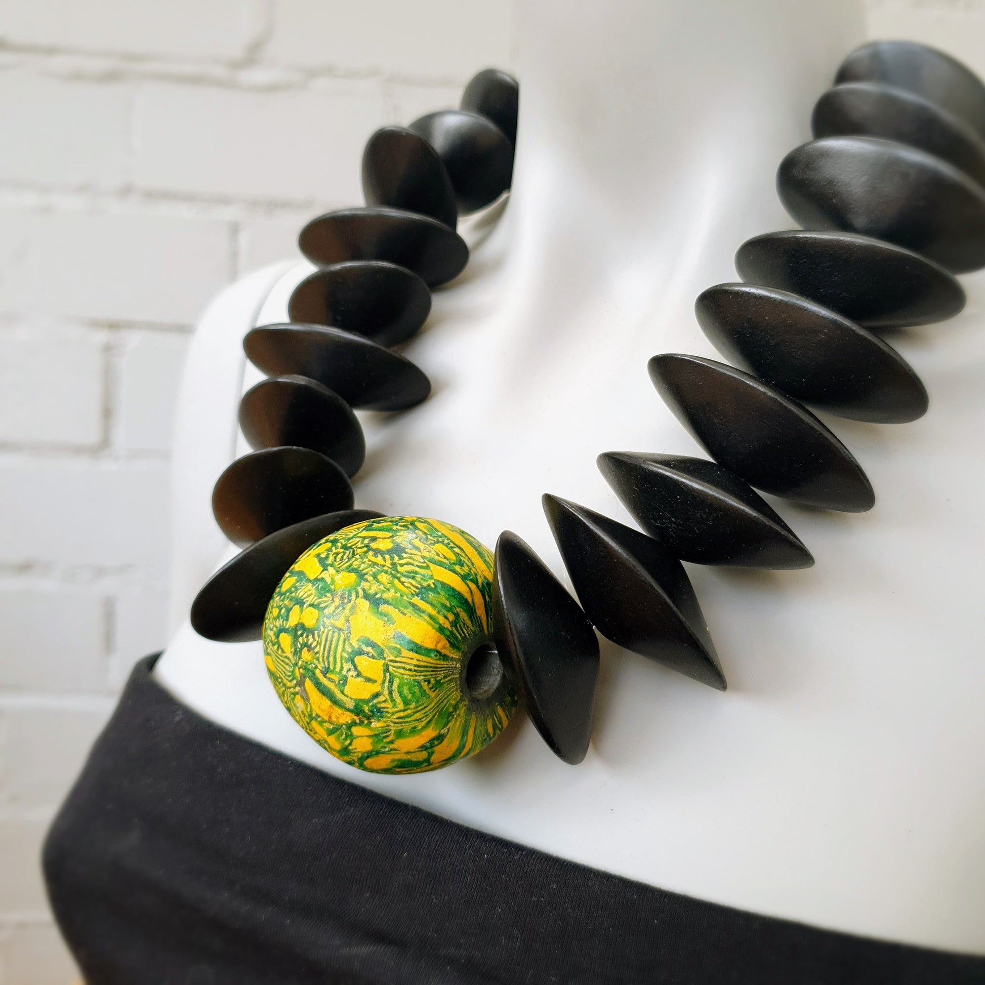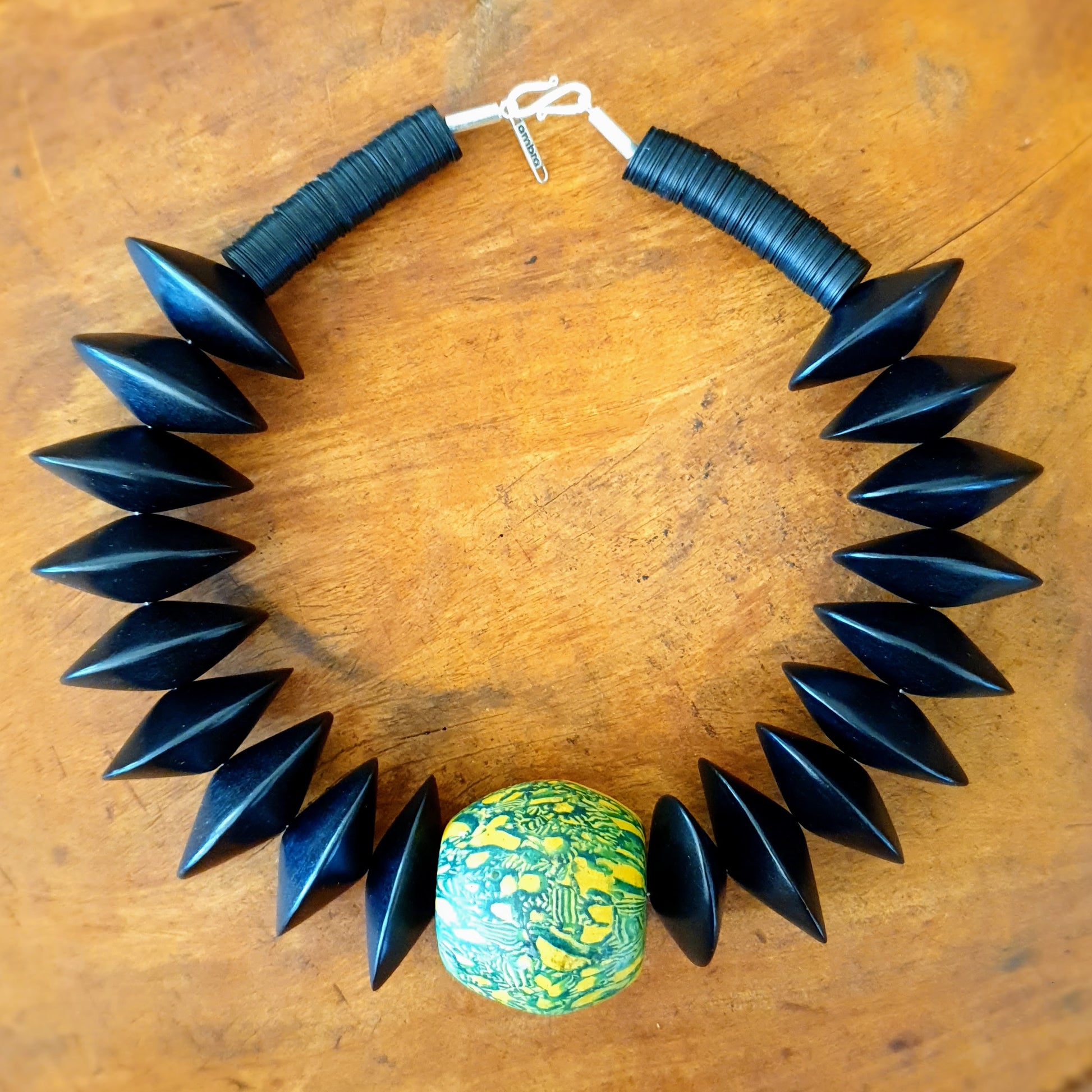 Opulente handgearbeitete Unikat- Halskette mit einer großen, sehr aufwendig handgefertigten grüngelben Mosaik-Glasperle der Majapahit-Kultur von der Insel Java, großen markanten schwarzen Ebenholzelementen aus Afrika und afrikanischen Bakelitscheiben mit Silberverschluss von ambra Schmuck.