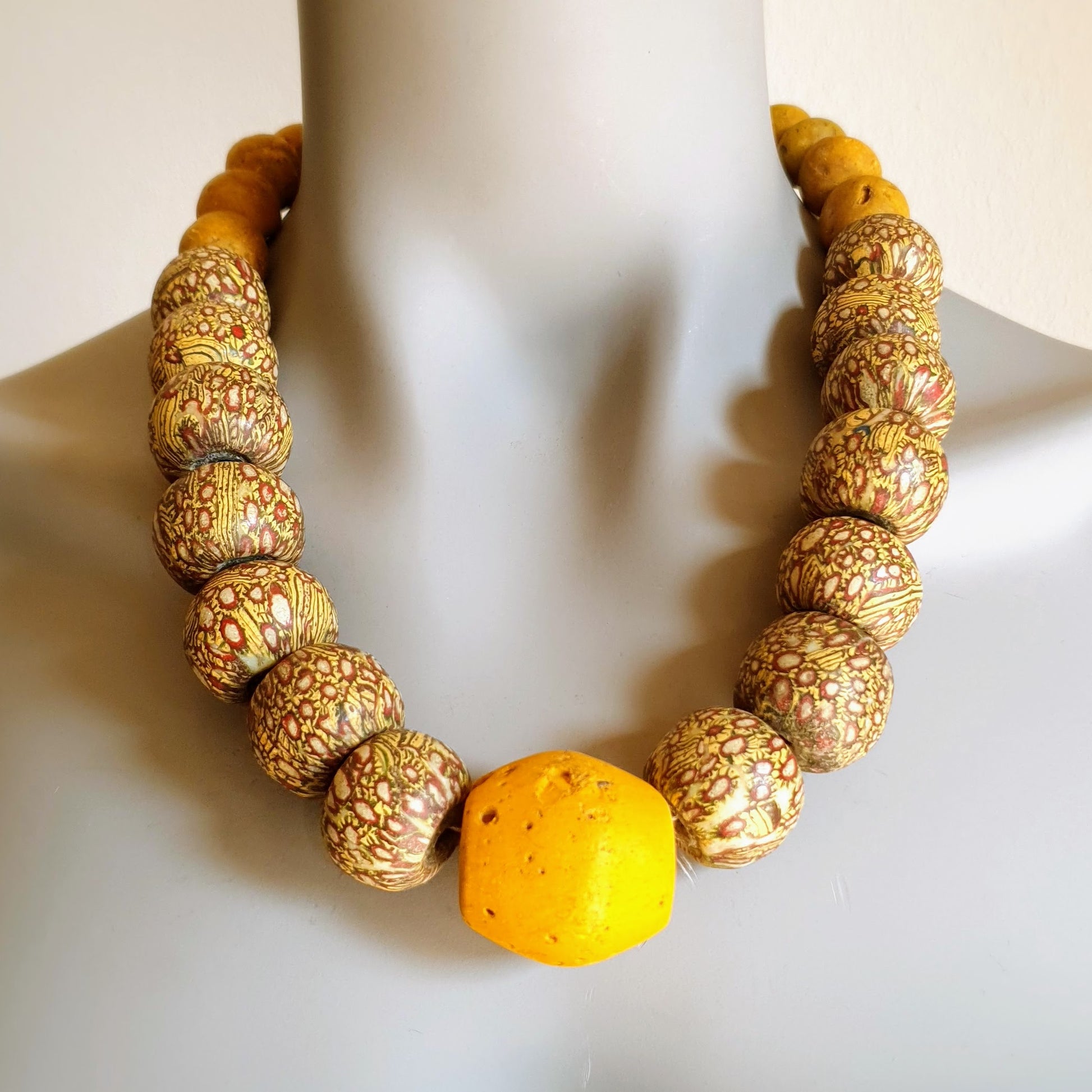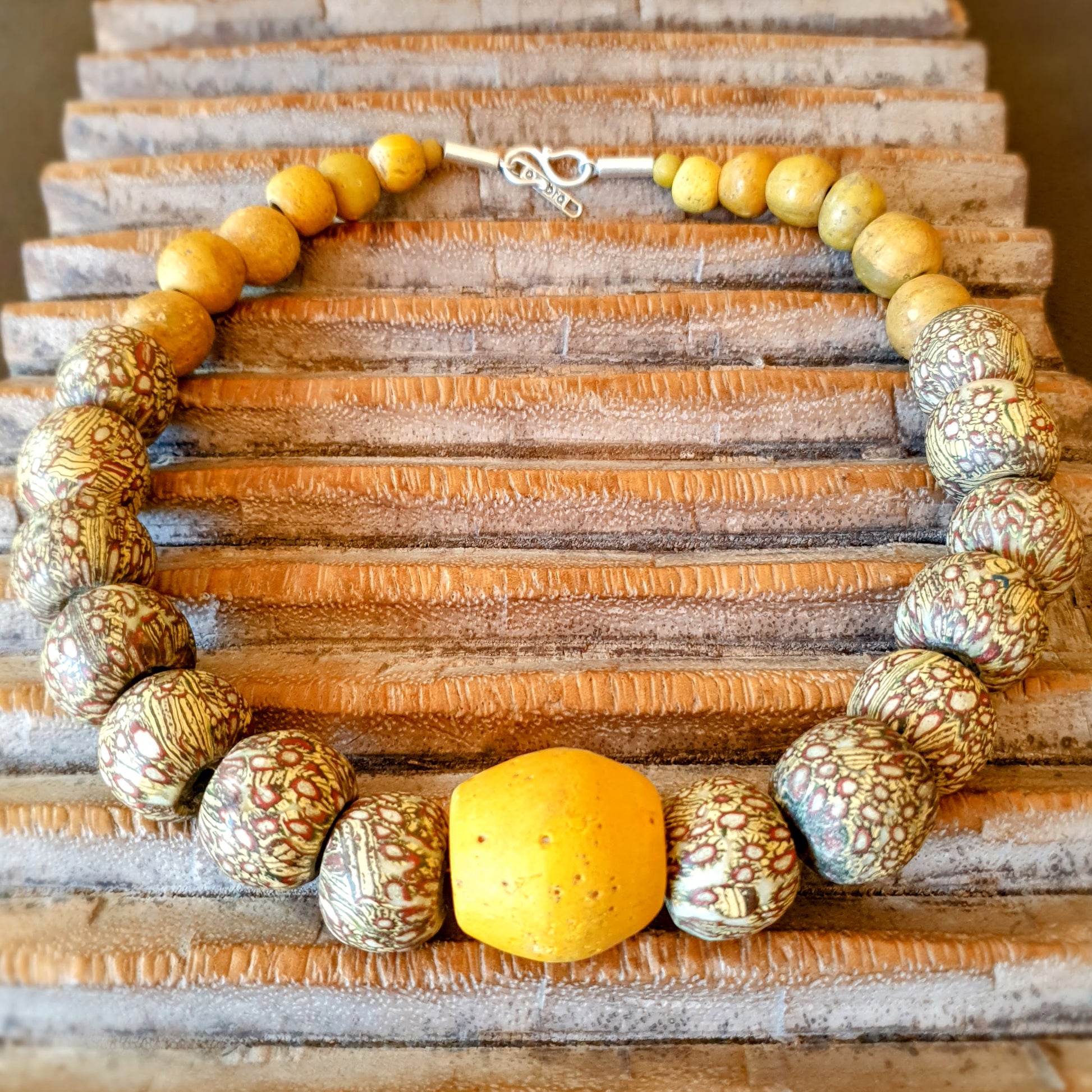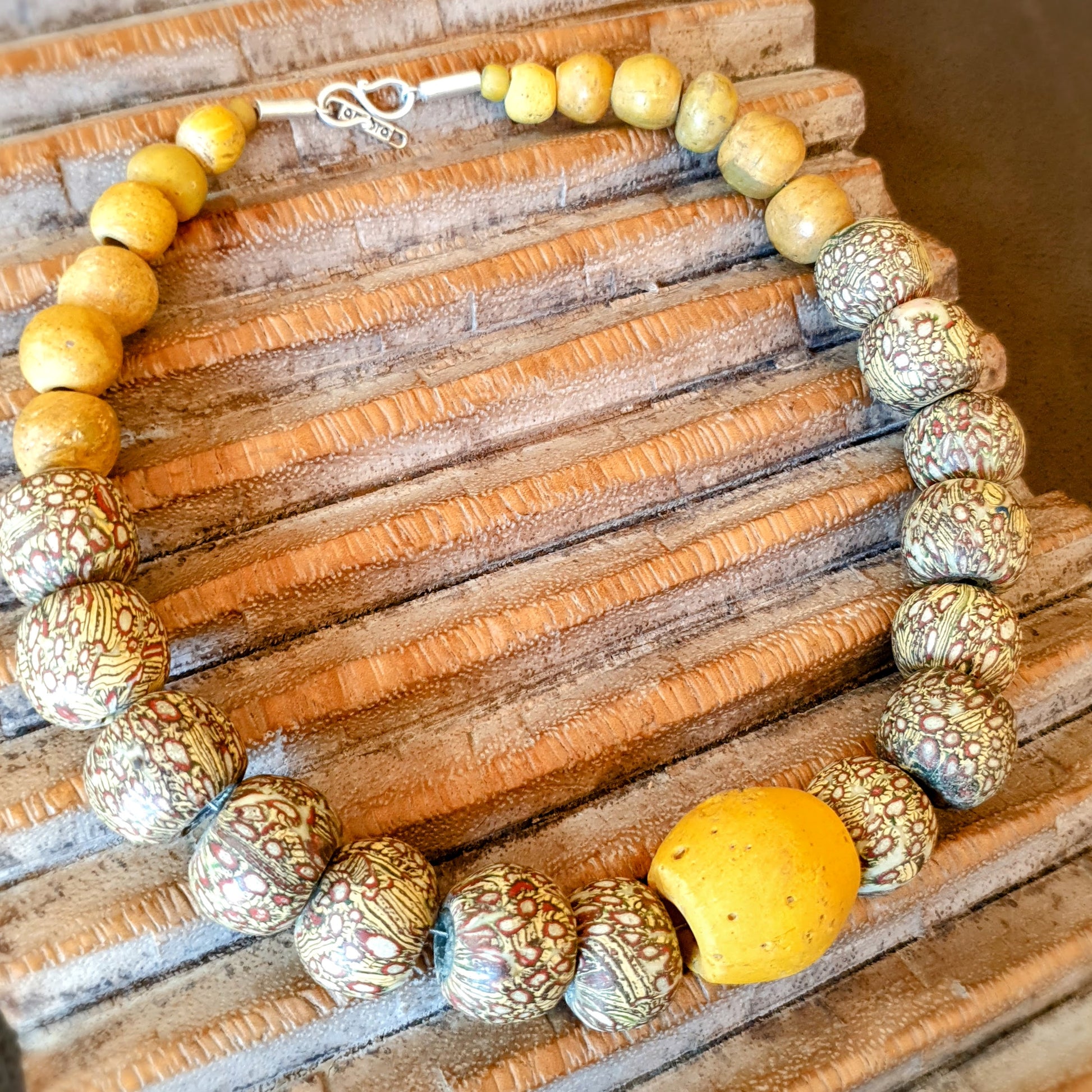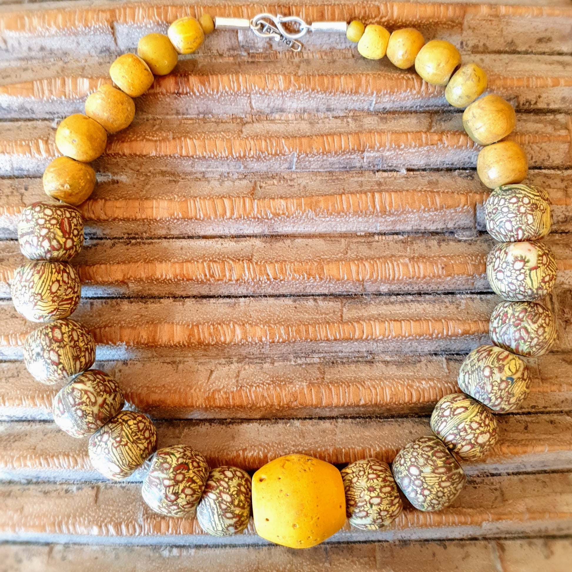 Große handgearbeitete Unikat- Halskette mit gelbbraunen Mosaik-Jatim-Glasperlen der Majapahit-Kultur und gelben Glasperlen von der Insel Java mit Silberverschluss von ambra Schmuck.