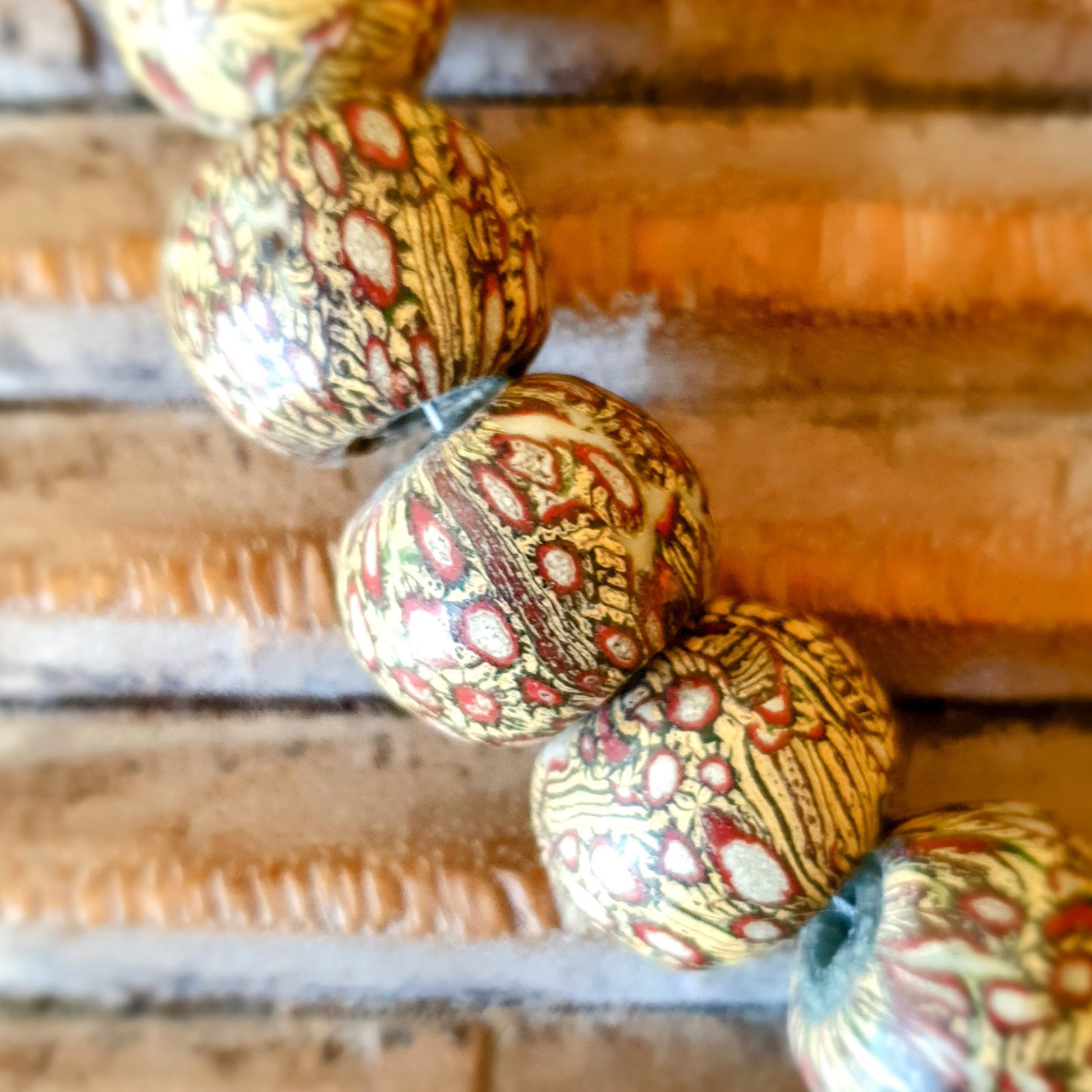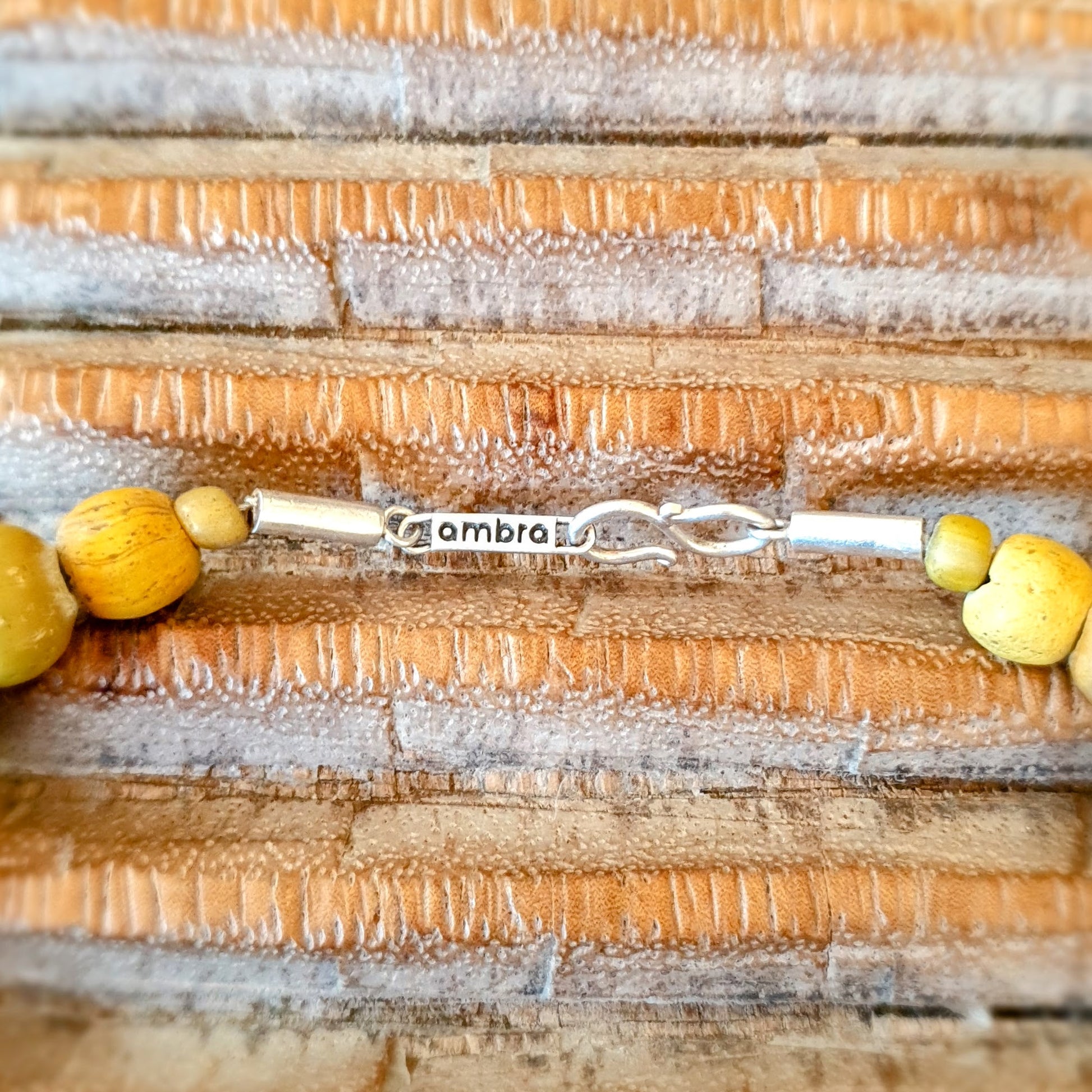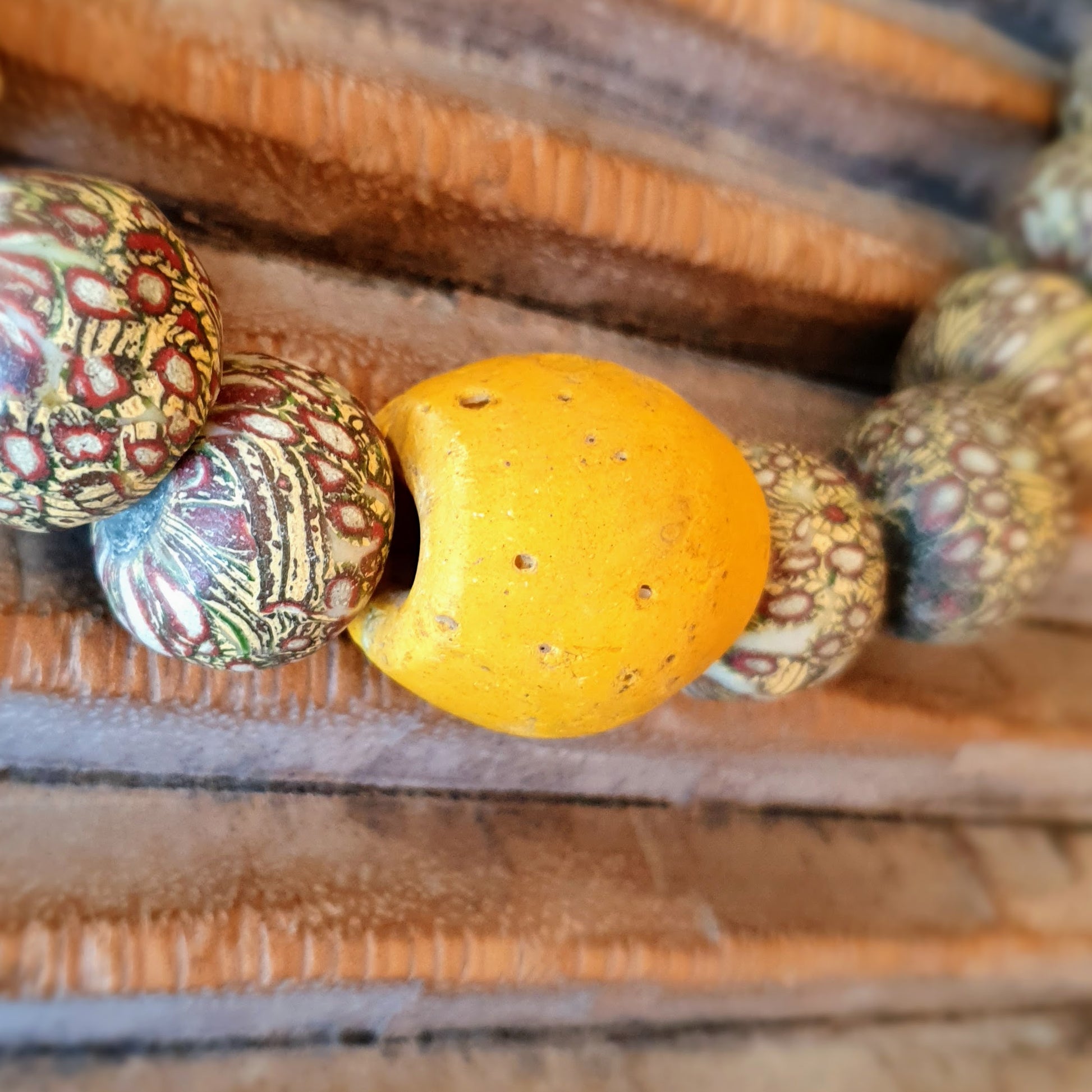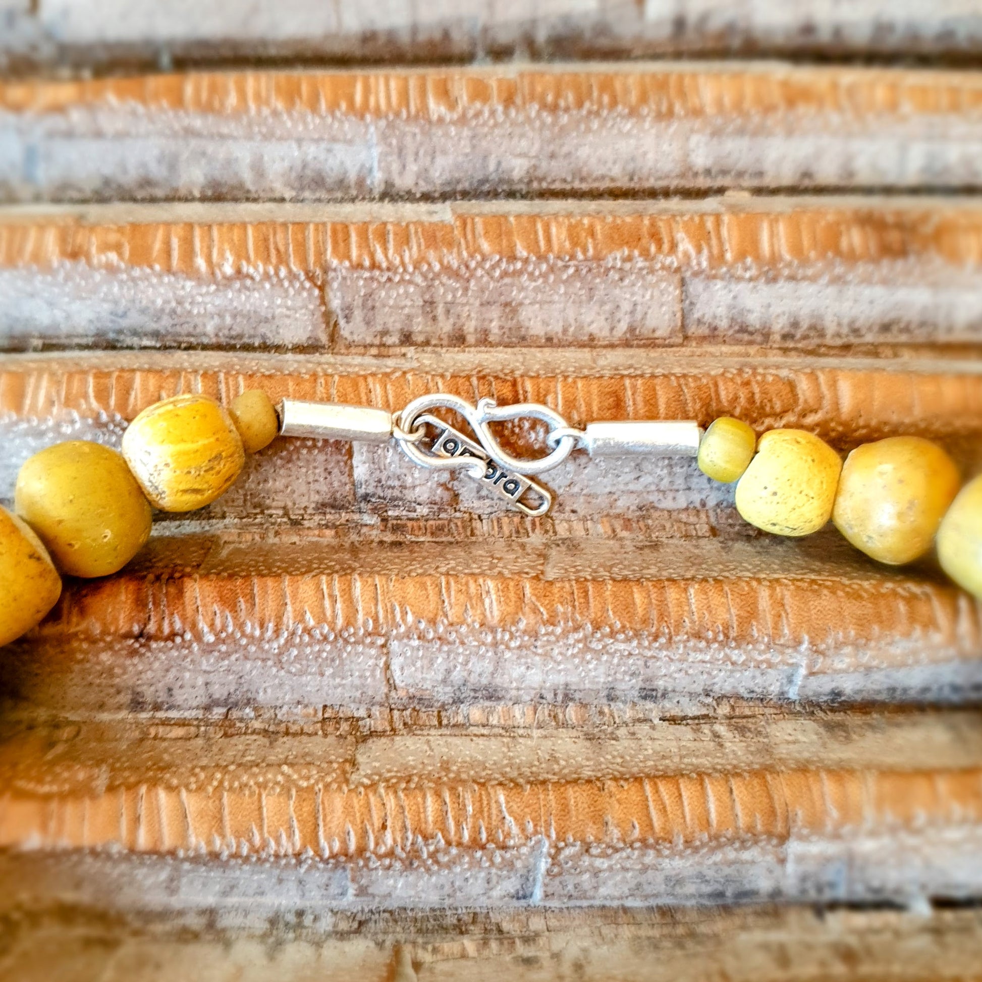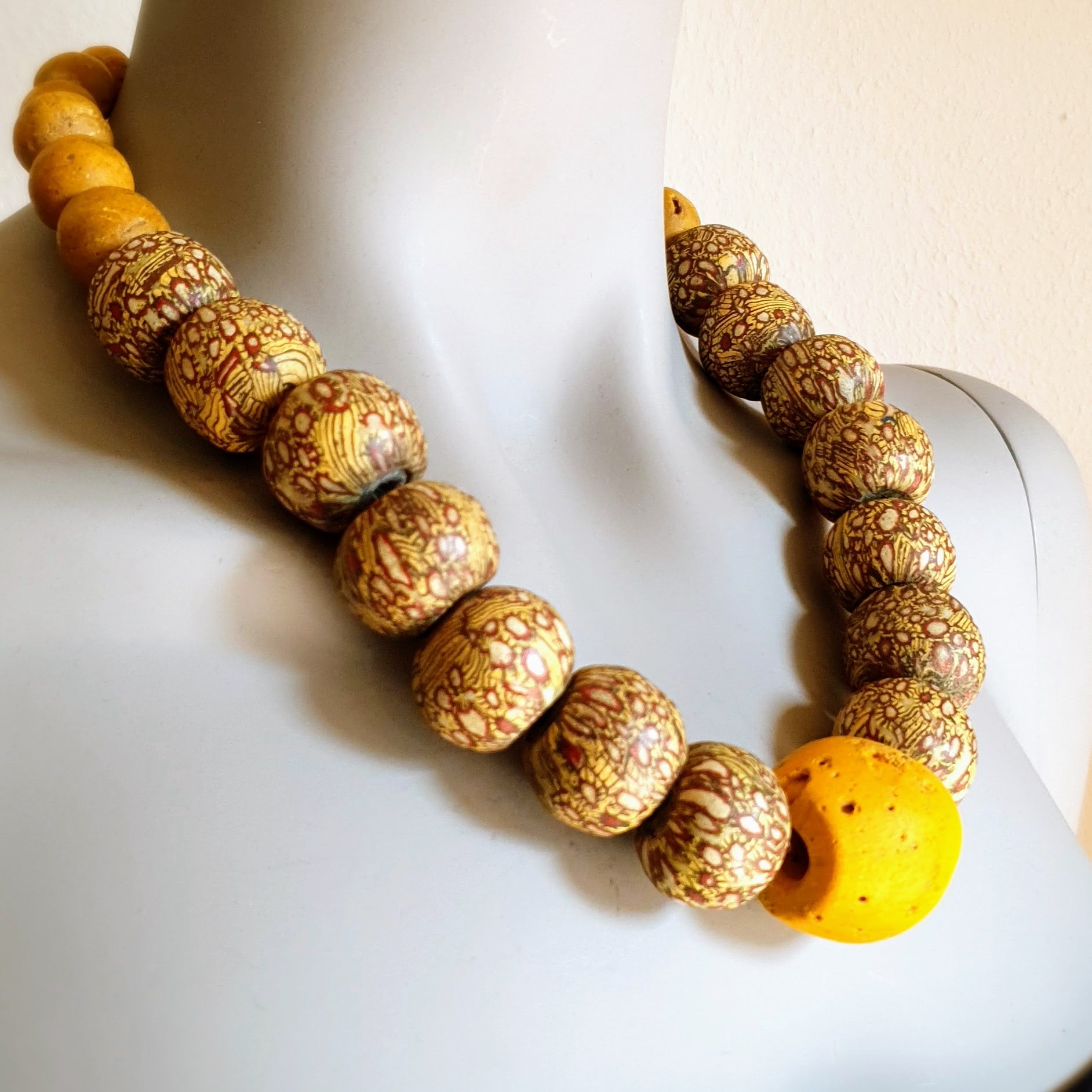 Große handgearbeitete Unikat- Halskette mit gelbbraunen Mosaik-Jatim-Glasperlen der Majapahit-Kultur und gelben Glasperlen von der Insel Java mit Silberverschluss von ambra Schmuck.