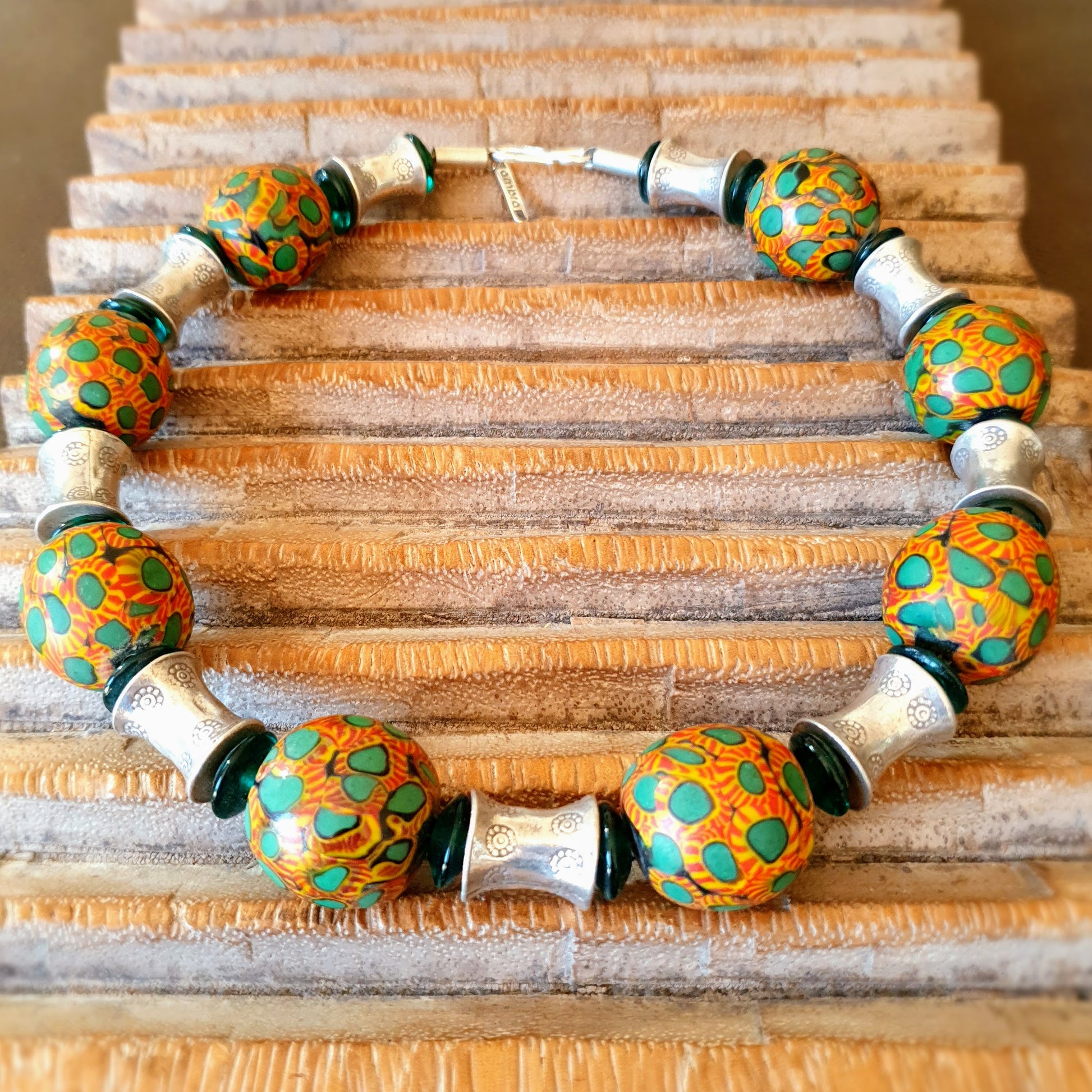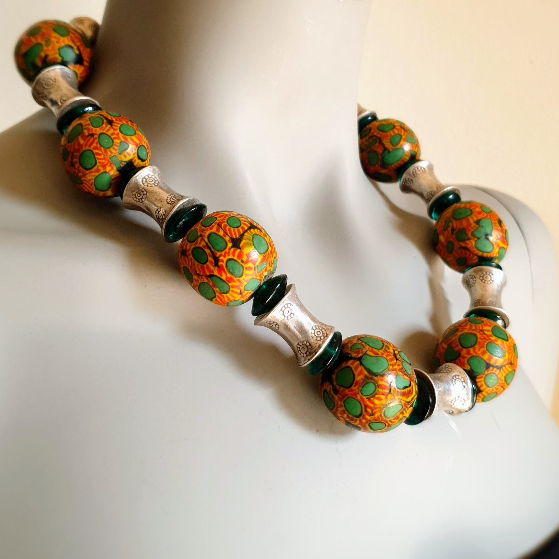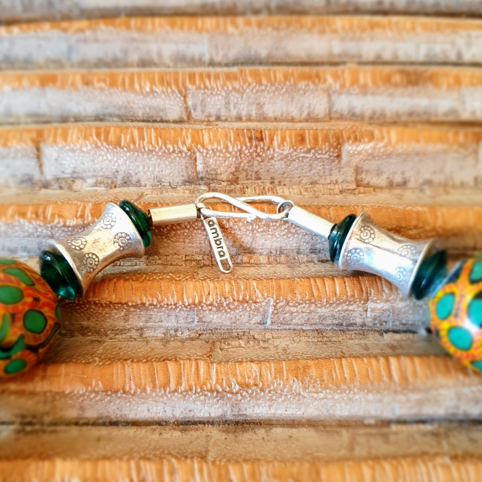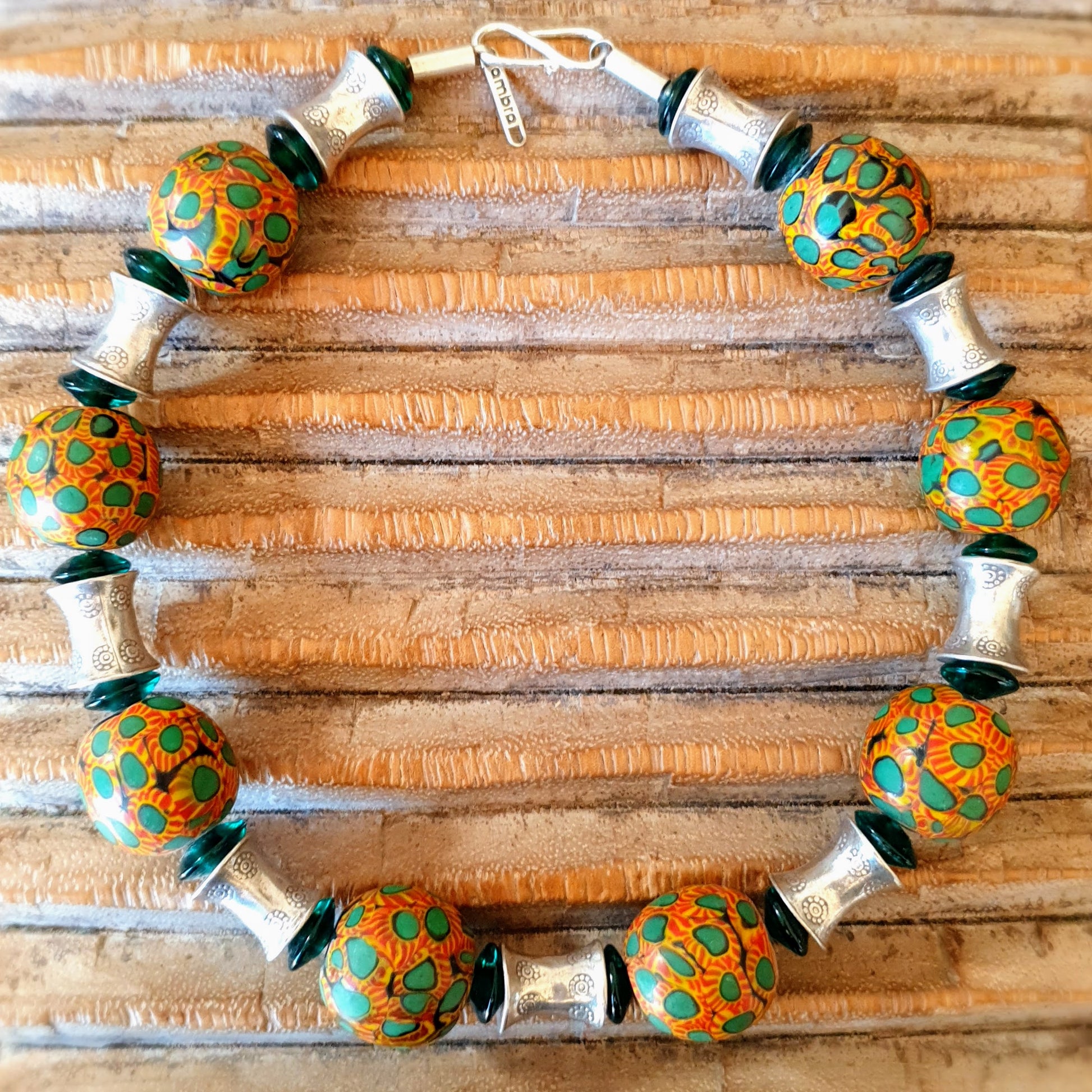 Große handgearbeitete Unikat- Halskette mit gemusterten Mosaik-Jatim-Glasperlen der Majapahit-Kultur von der Insel Java in grün, gelb und rot sowie grünen afrikanischen Glasperlen und gehämmerten burmesischen Silberperlen mit Silberverschluss von ambra Schmuck.