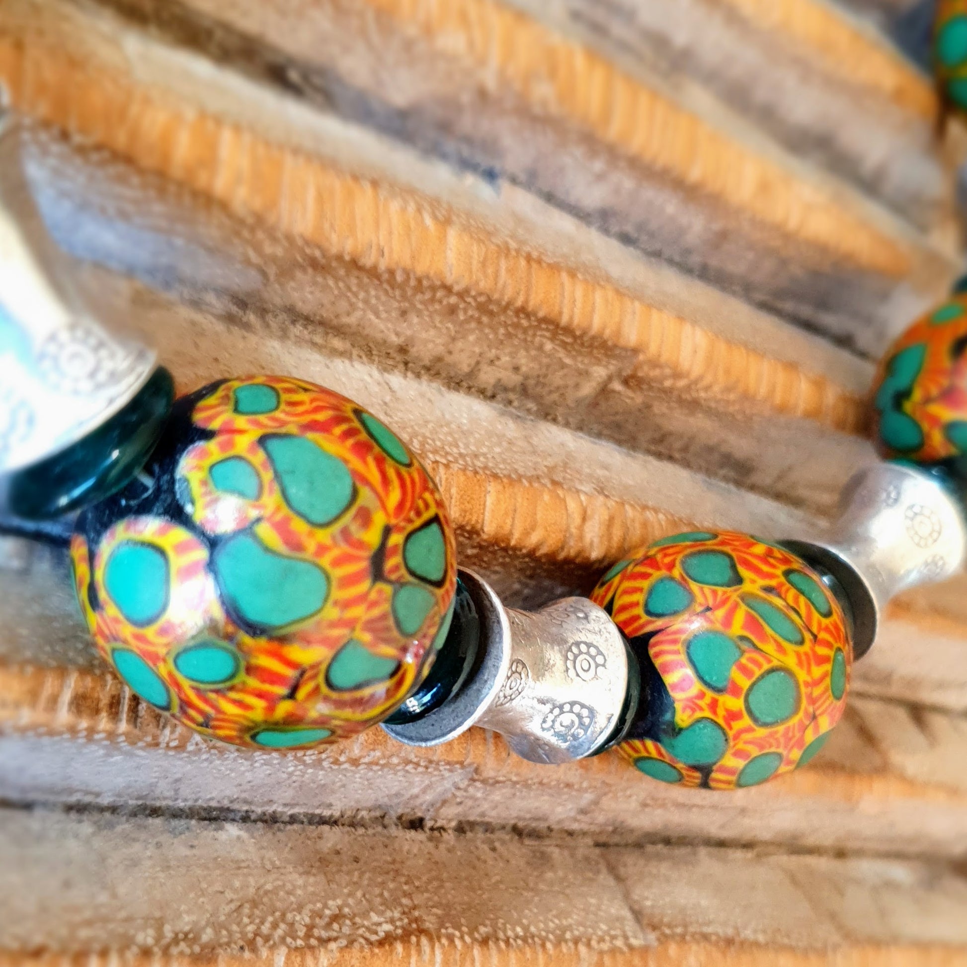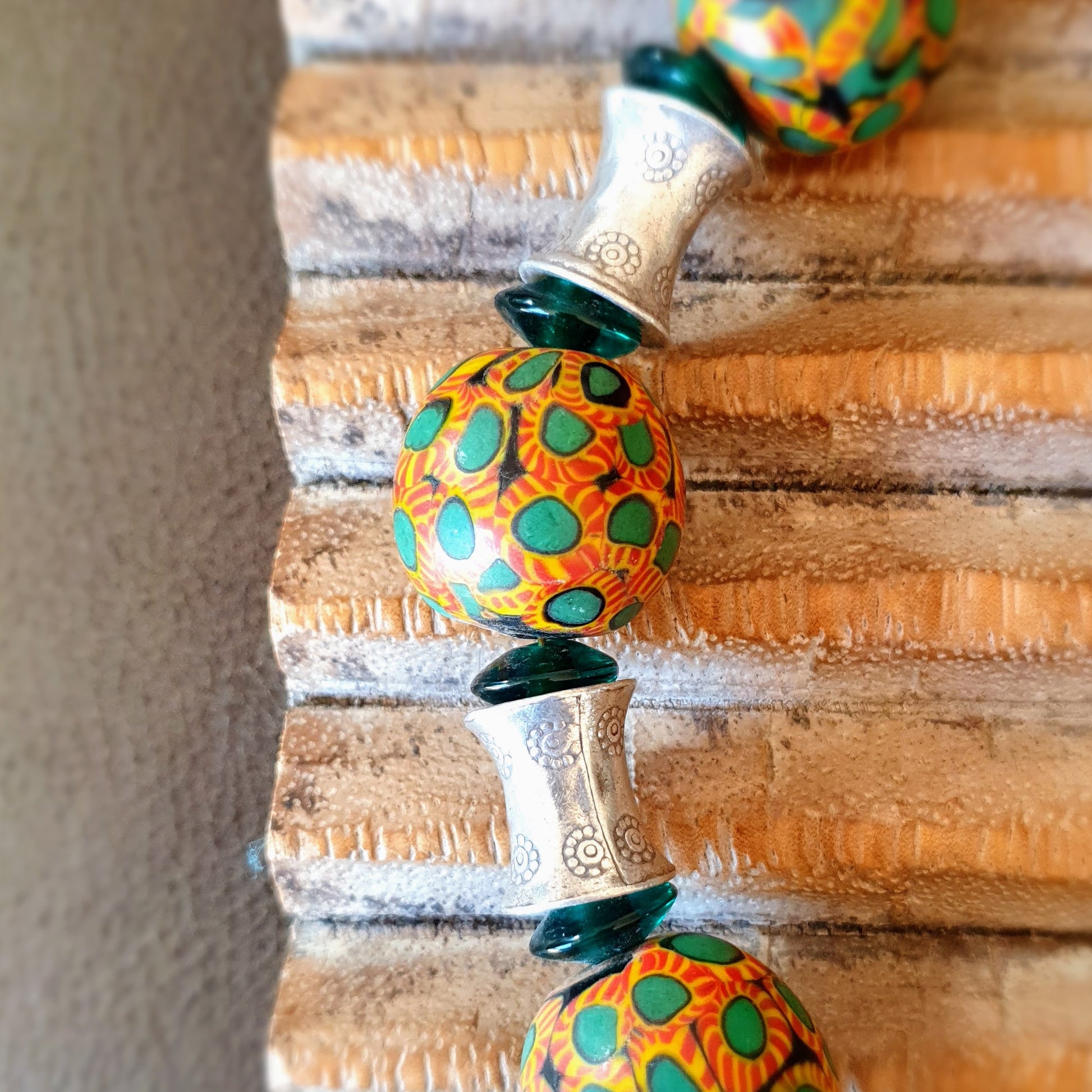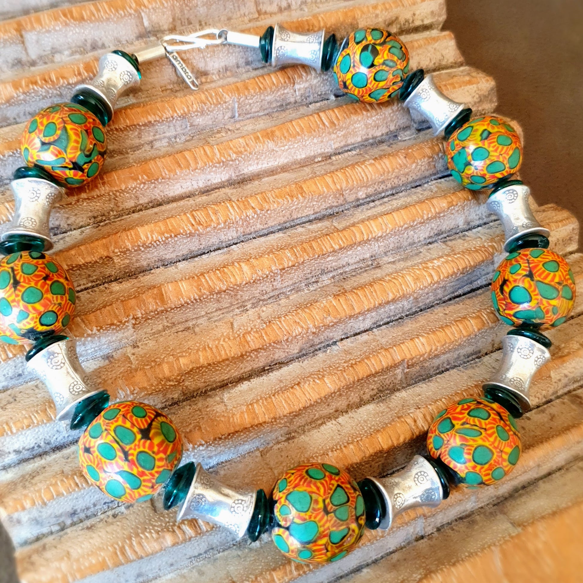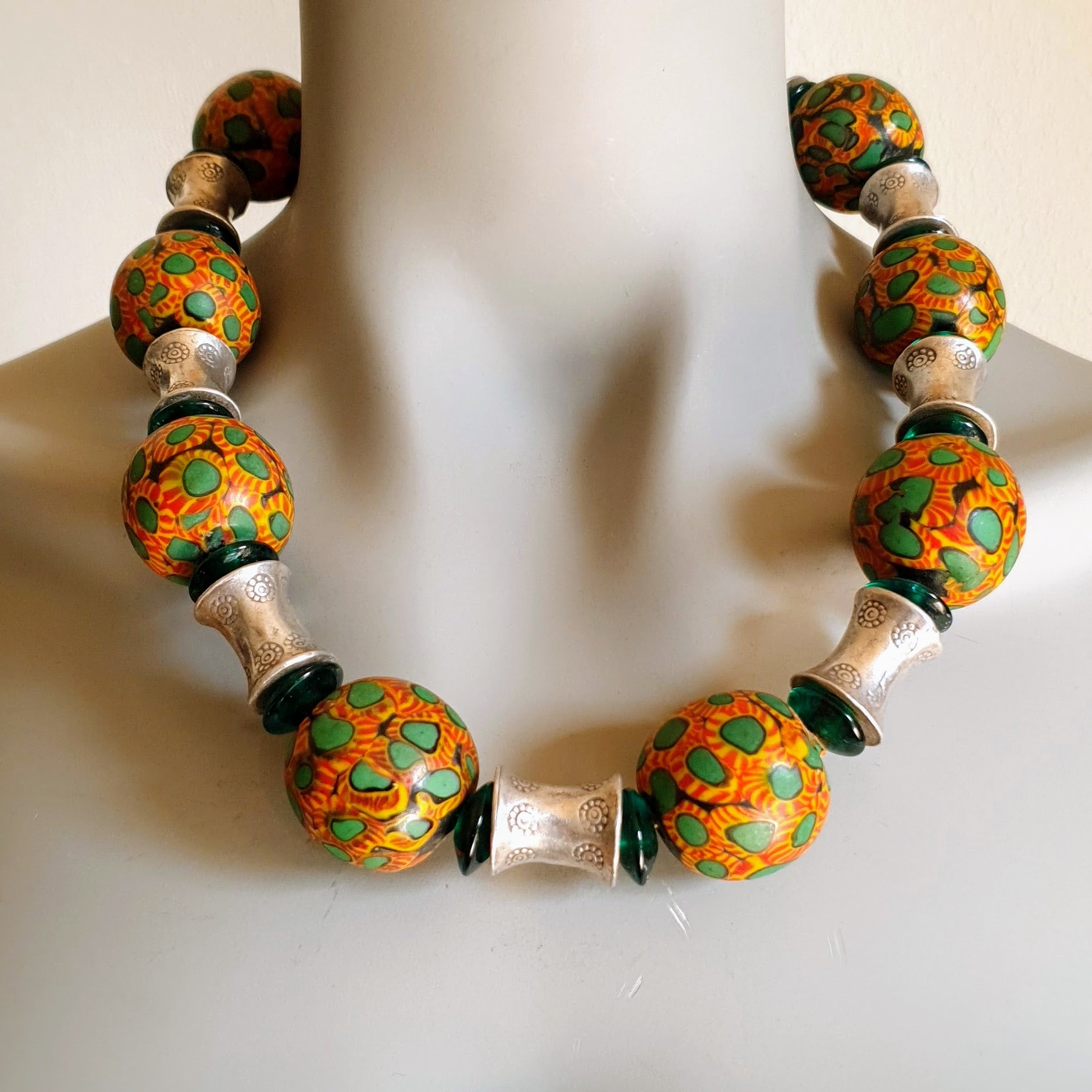Große handgearbeitete Unikat- Halskette mit gemusterten Mosaik-Jatim-Glasperlen der Majapahit-Kultur von der Insel Java in grün, gelb und rot sowie grünen afrikanischen Glasperlen und gehämmerten burmesischen Silberperlen mit Silberverschluss von ambra Schmuck.