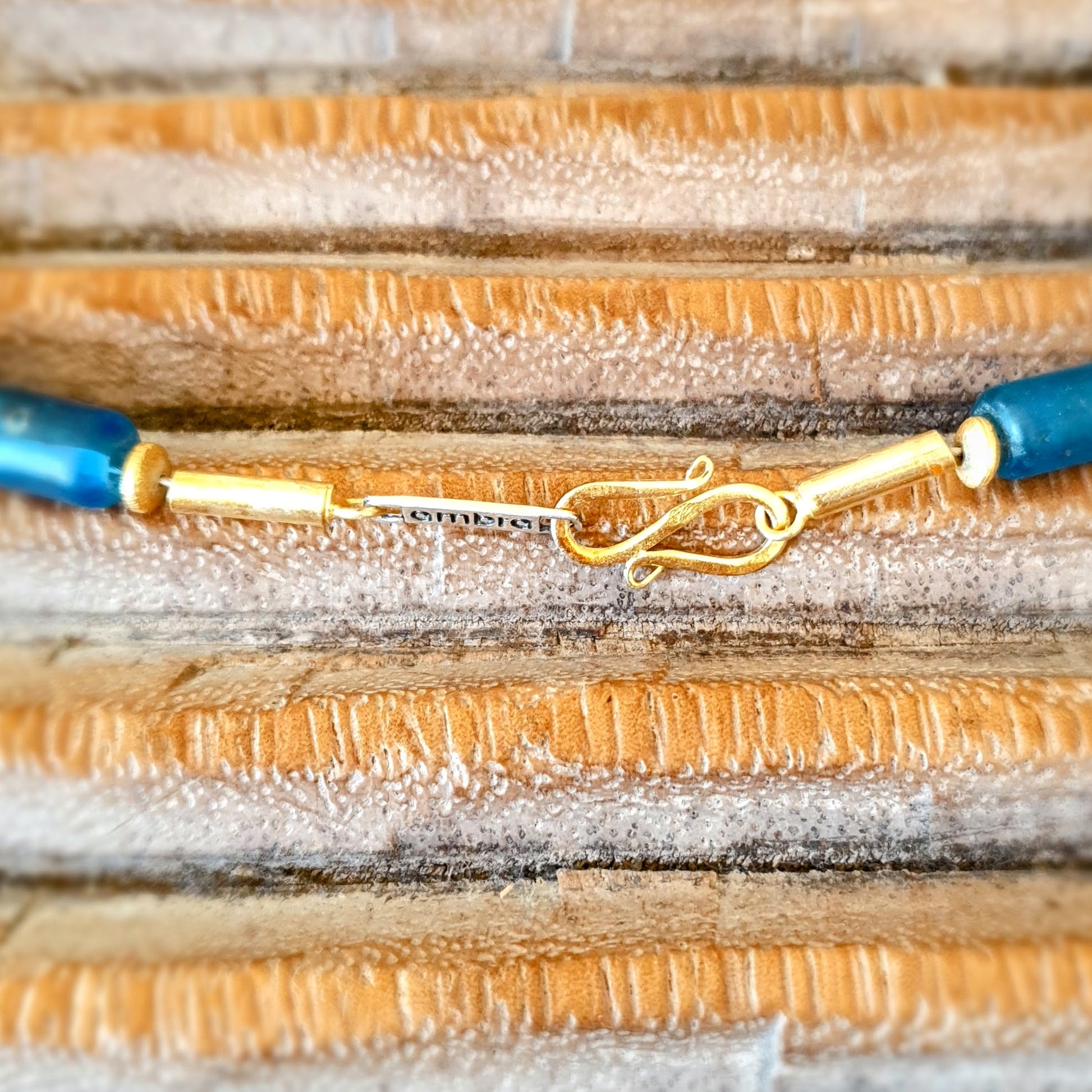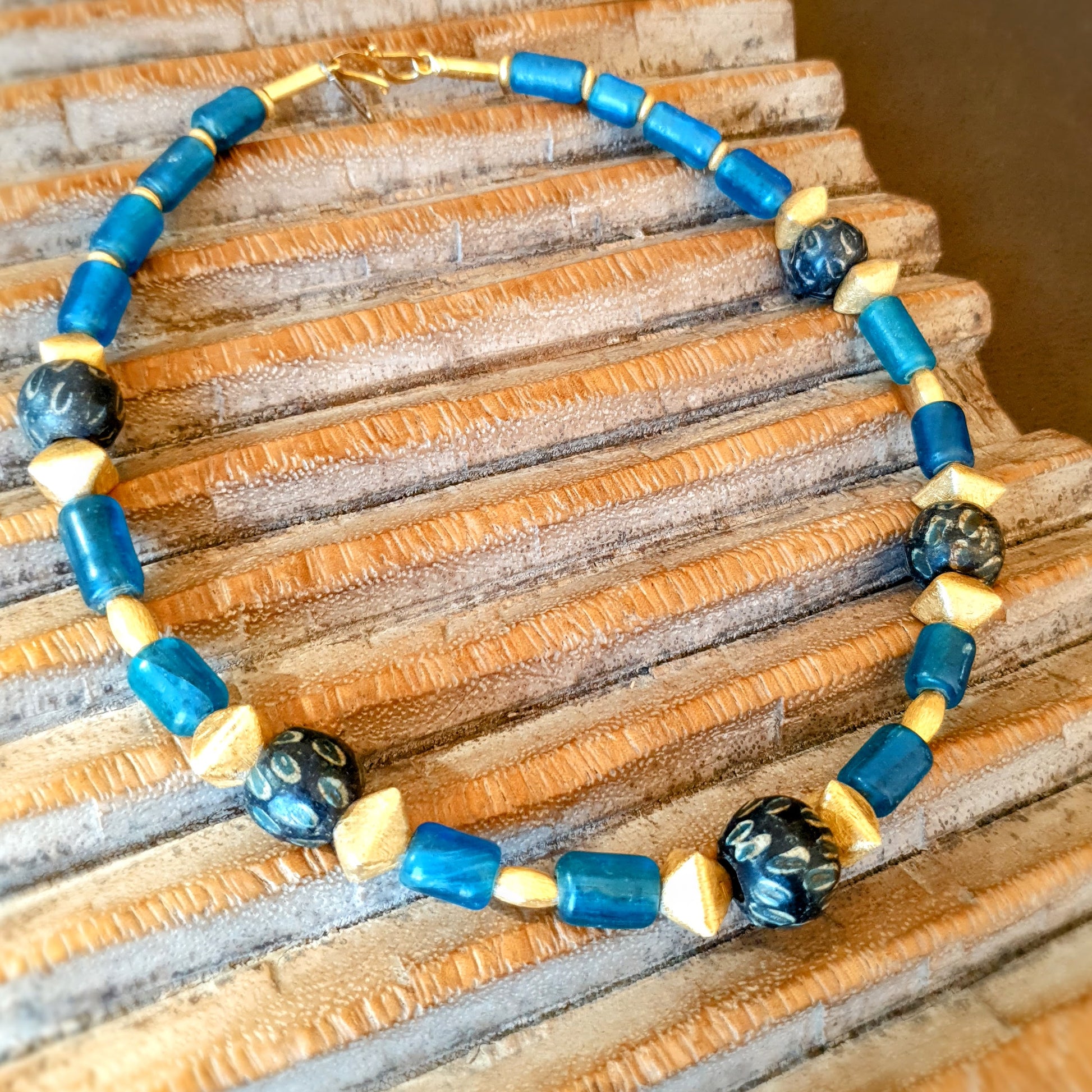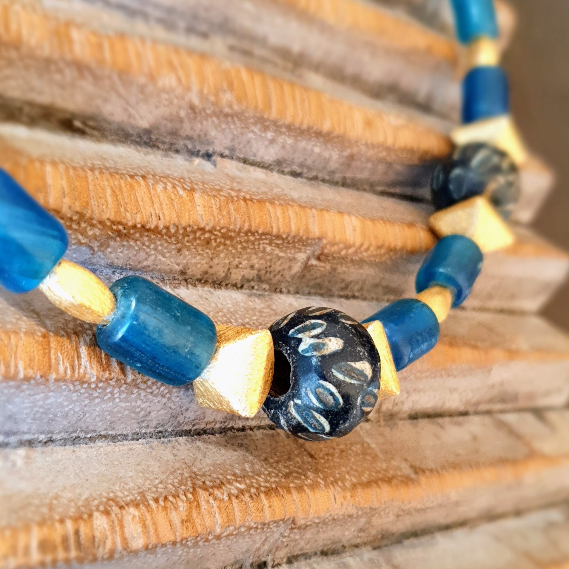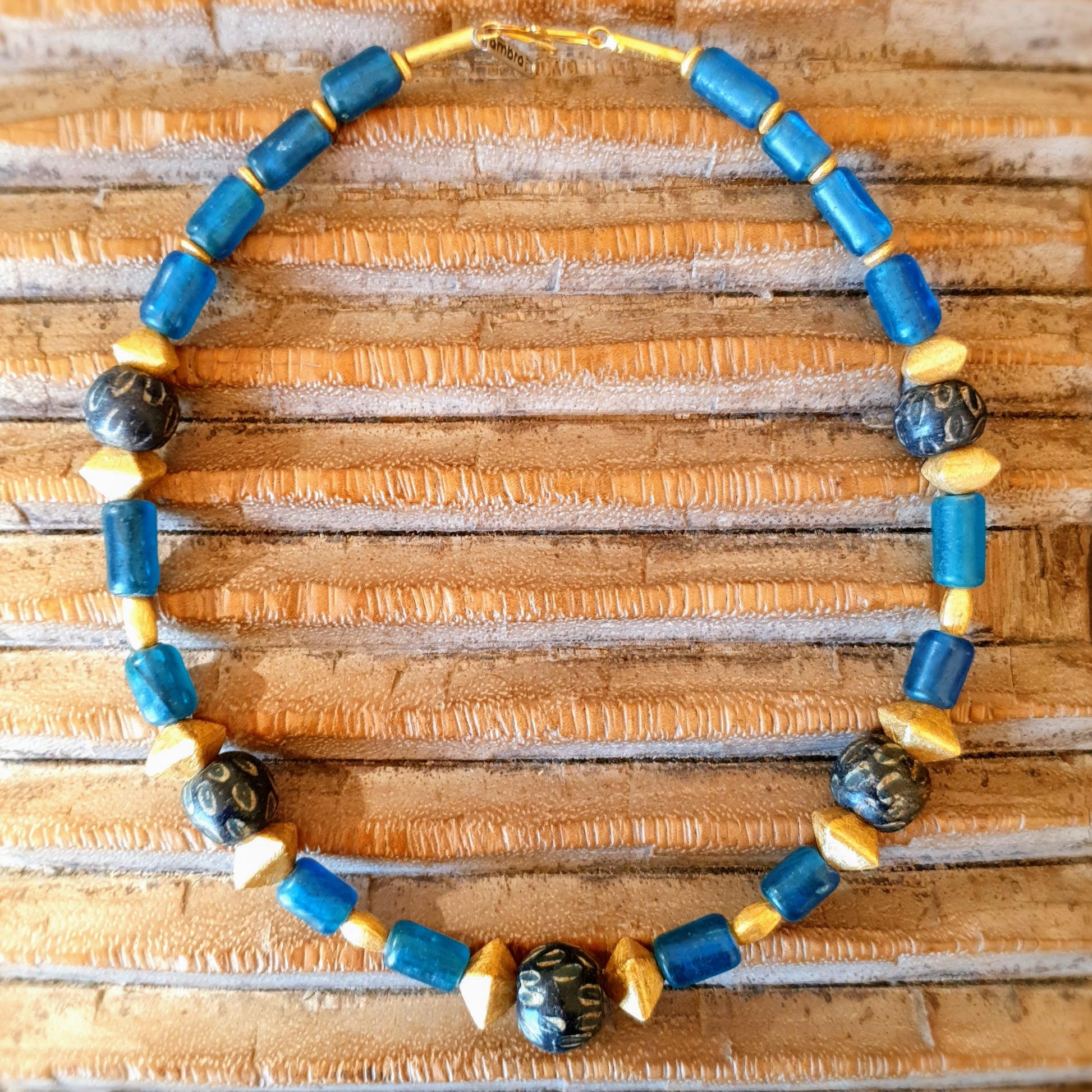 Handgearbeitete Unikat- Halskette mit dunkelblauen gemusterten Mosaik-Jatim-Glasperlen der Majapahit-Kultur von der Insel Java, blauen Javaglasperlen und vergoldeten mattierten Silberperlen mit vergoldetem Silberverschluss von ambra Schmuck.