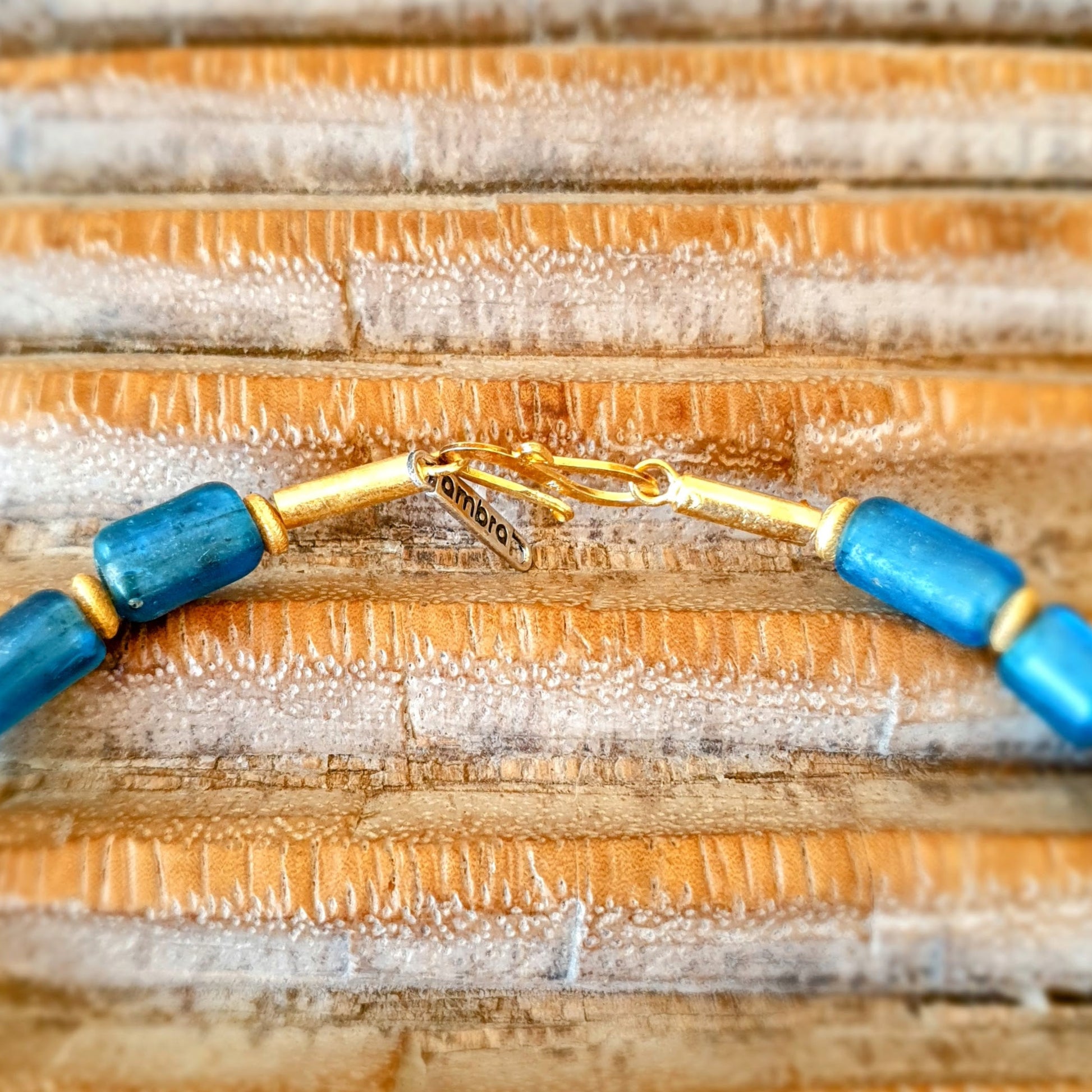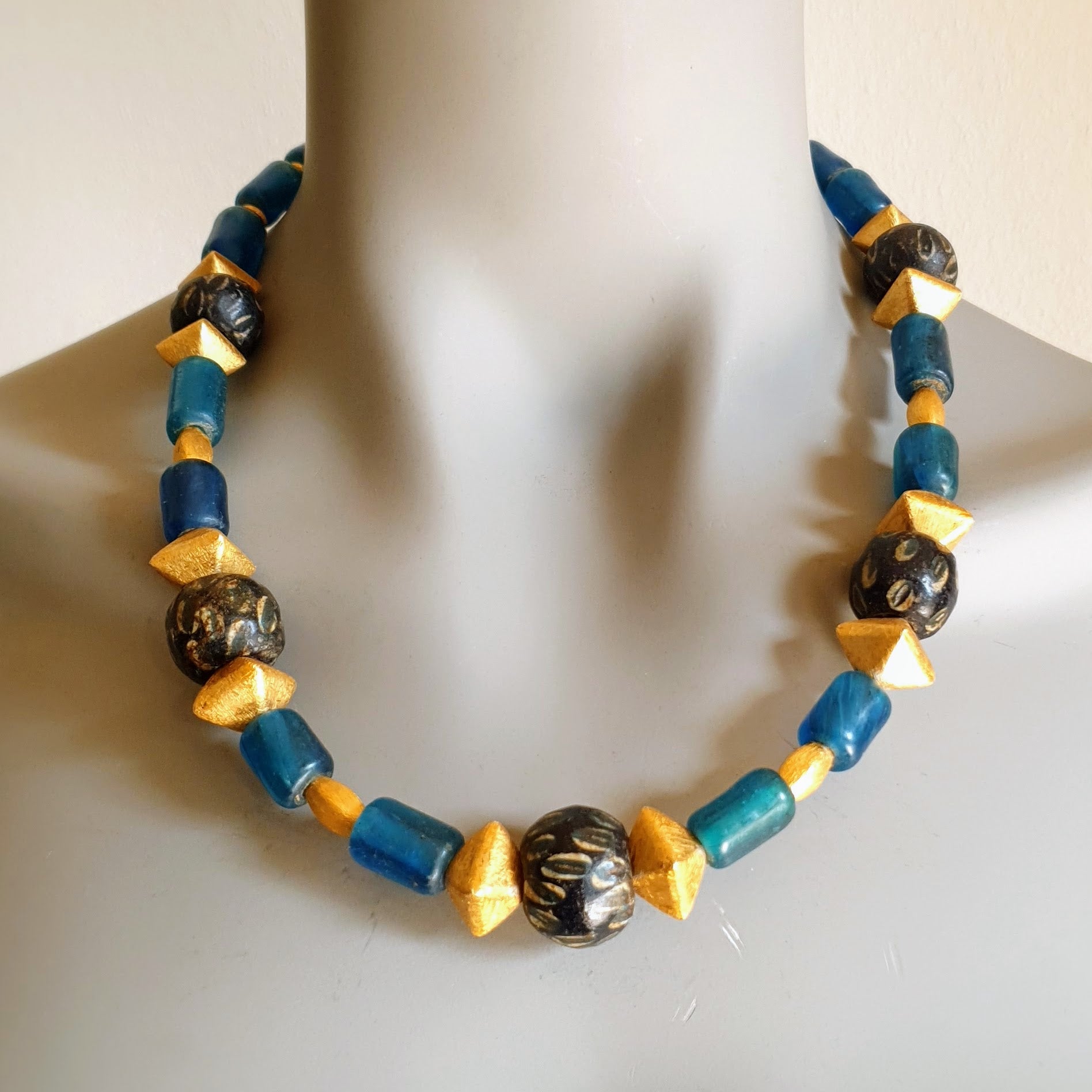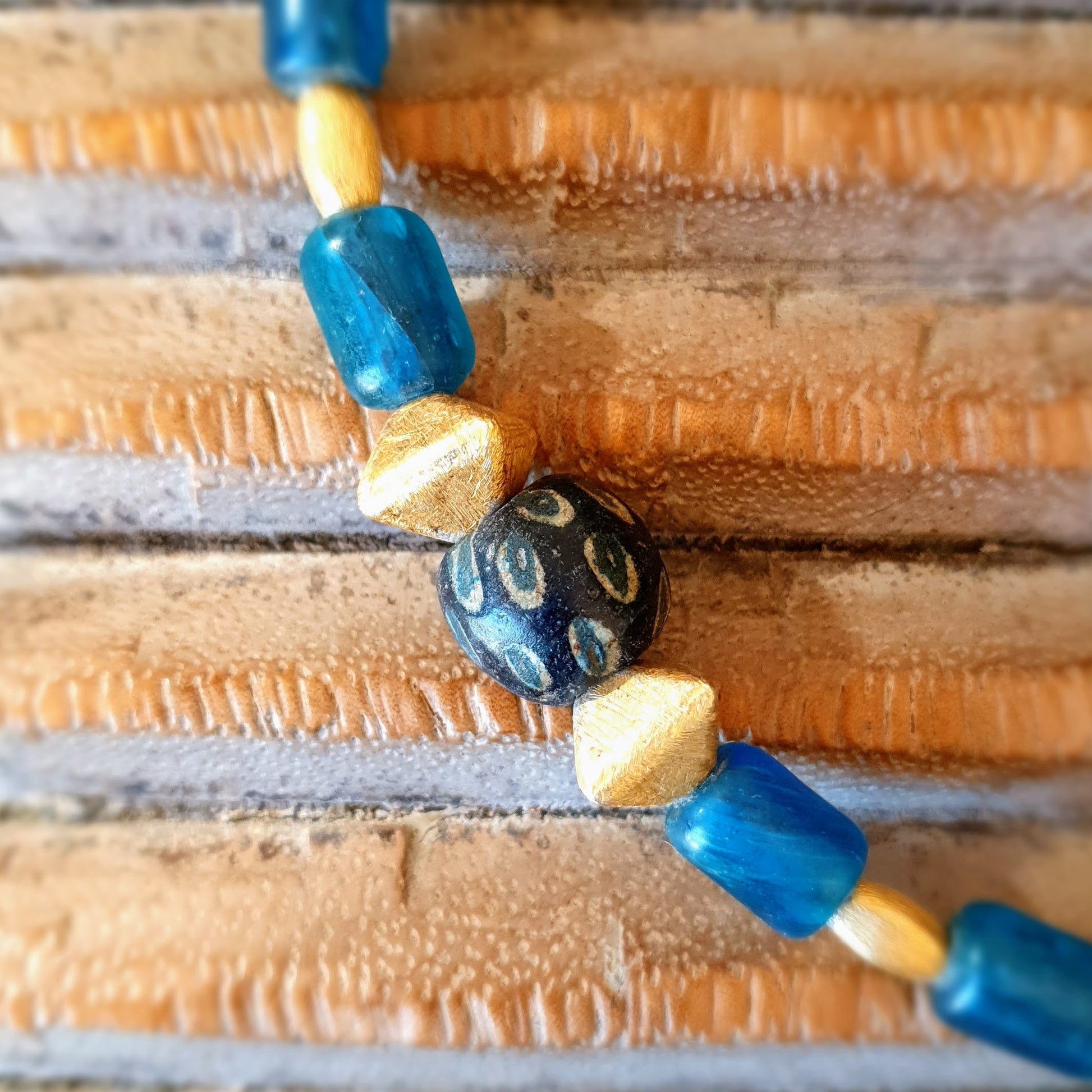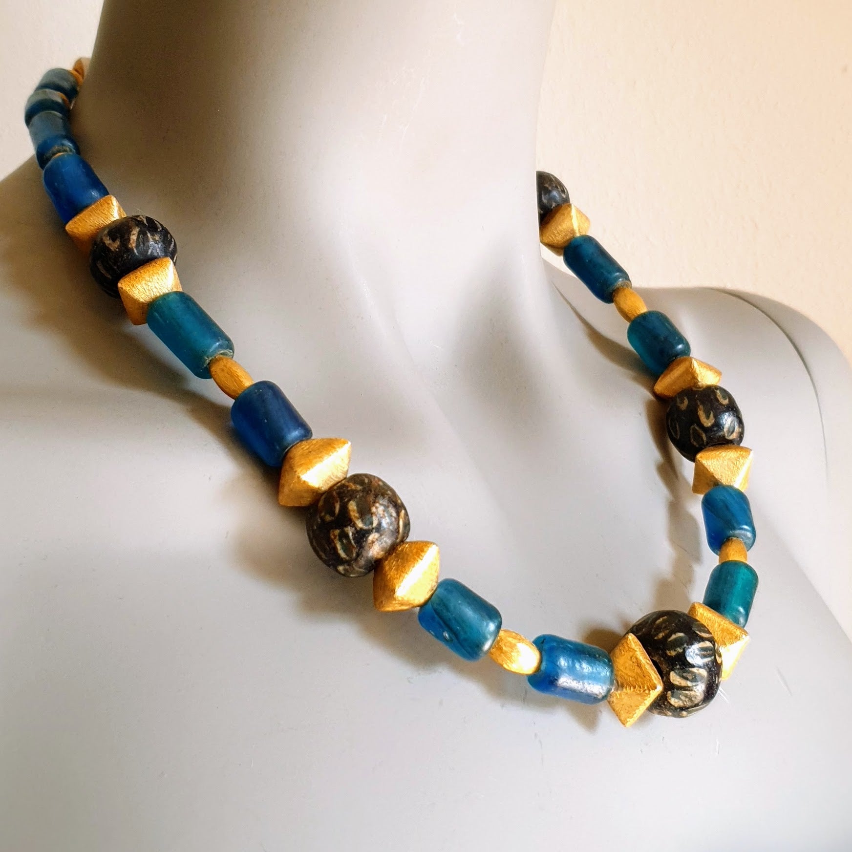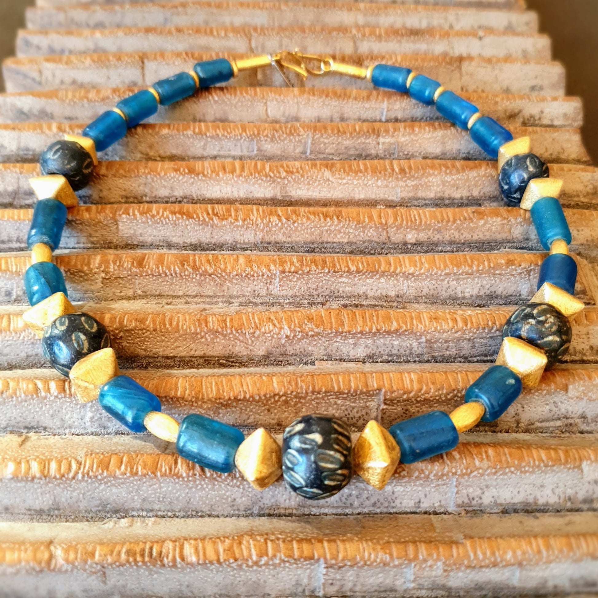Handgearbeitete Unikat- Halskette mit dunkelblauen gemusterten Mosaik-Jatim-Glasperlen der Majapahit-Kultur von der Insel Java, blauen Javaglasperlen und vergoldeten mattierten Silberperlen mit vergoldetem Silberverschluss von ambra Schmuck.