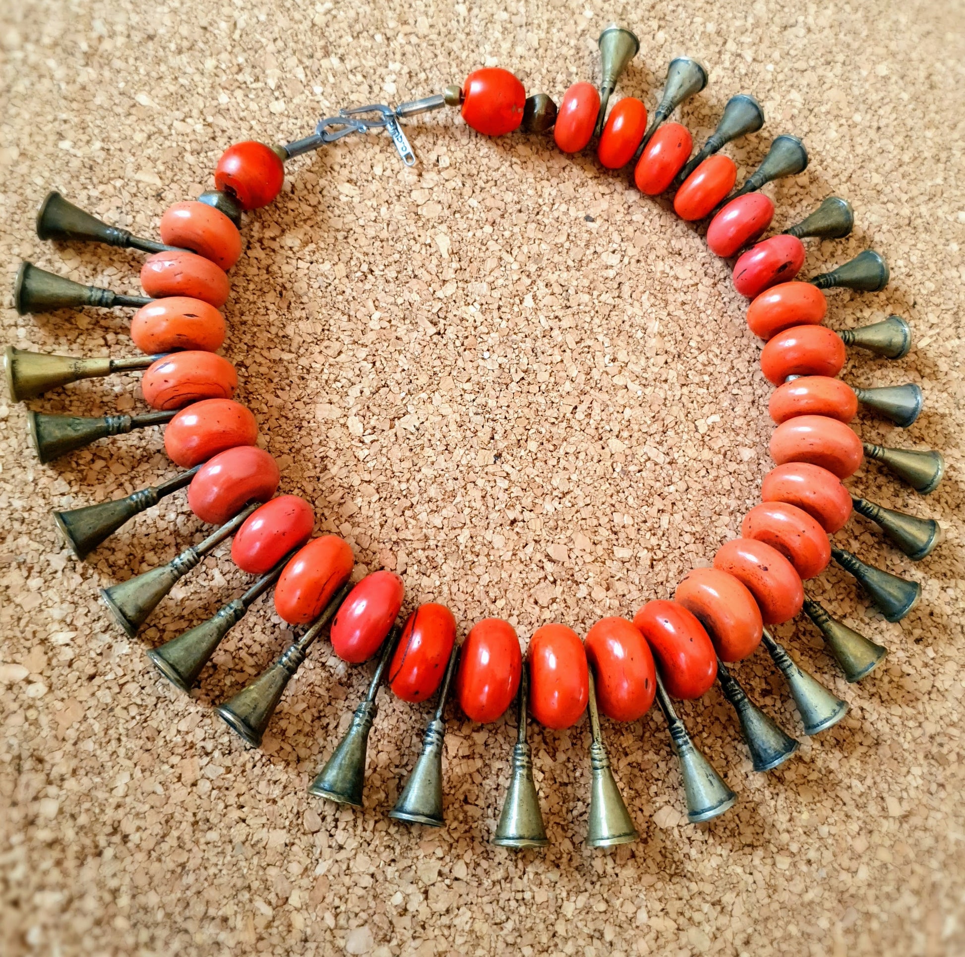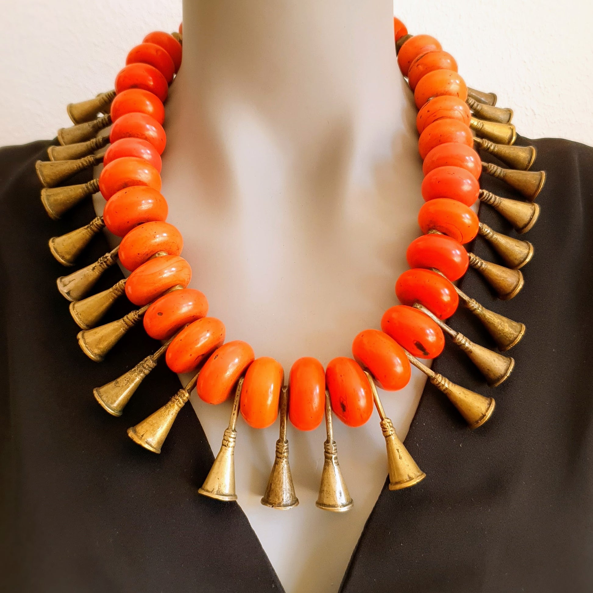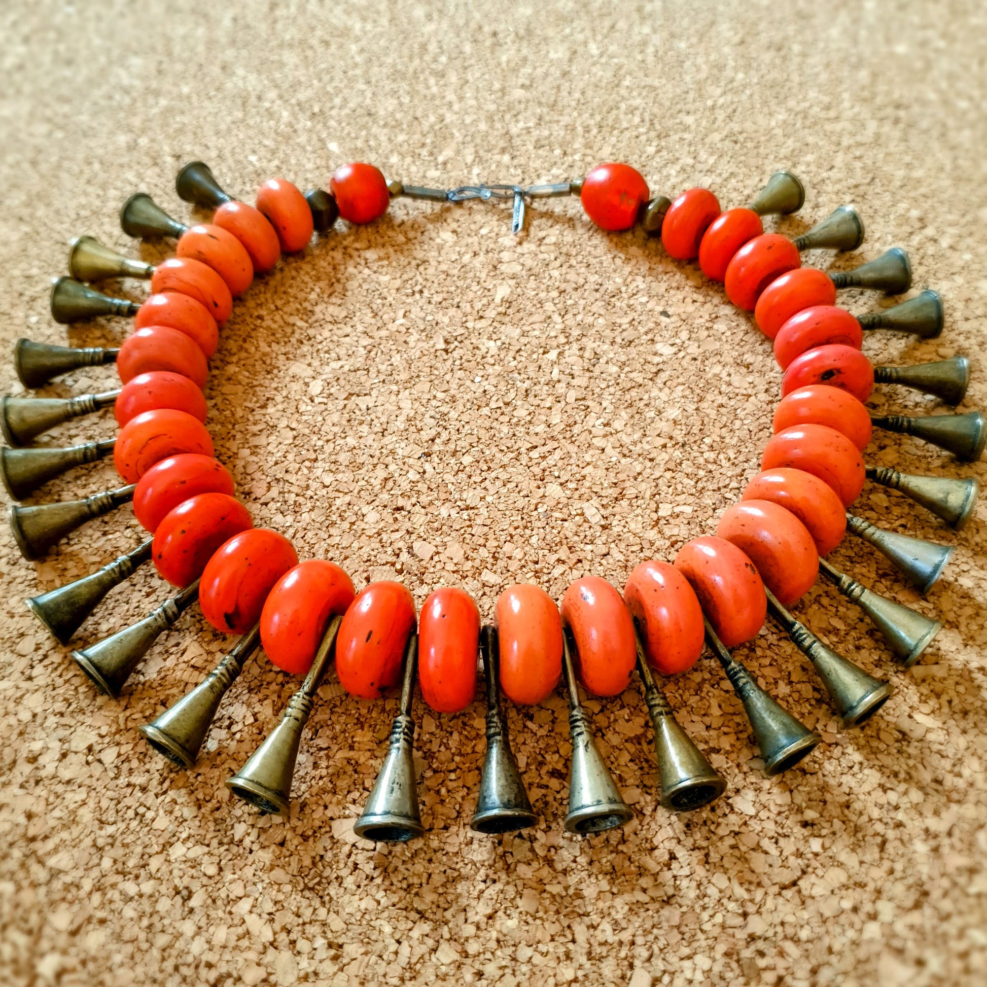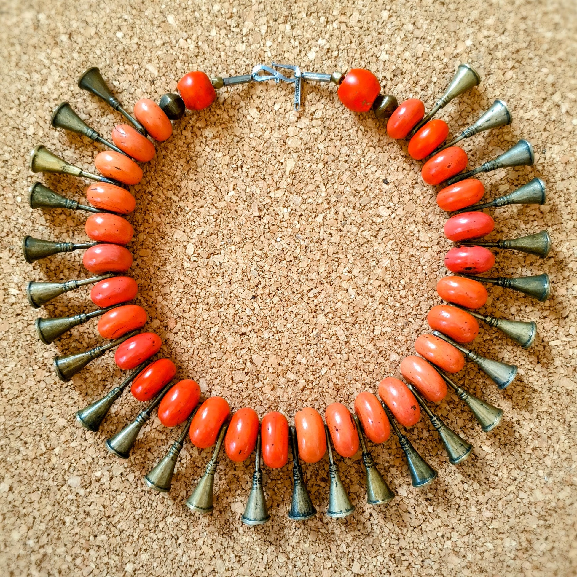 Große handgearbeitete Unikat- Halskette mit antiken lachsfarbenen Glasperlen aus Indien und indischen Bronzeanhängern mit oxidiertem Silberverschluss von ambra Schmuck.