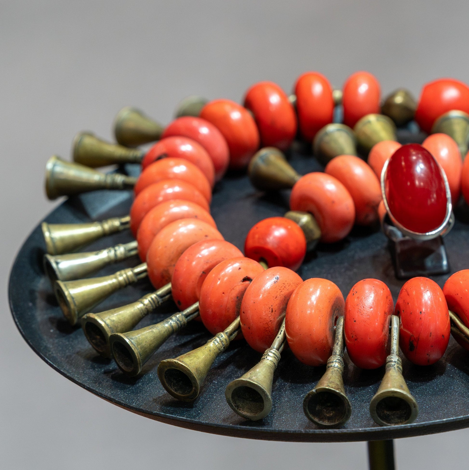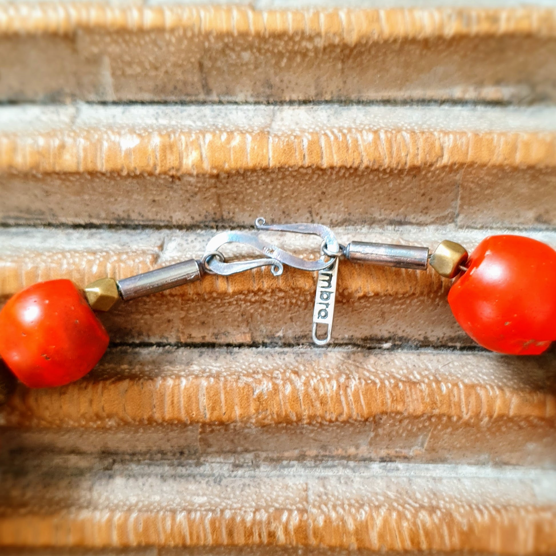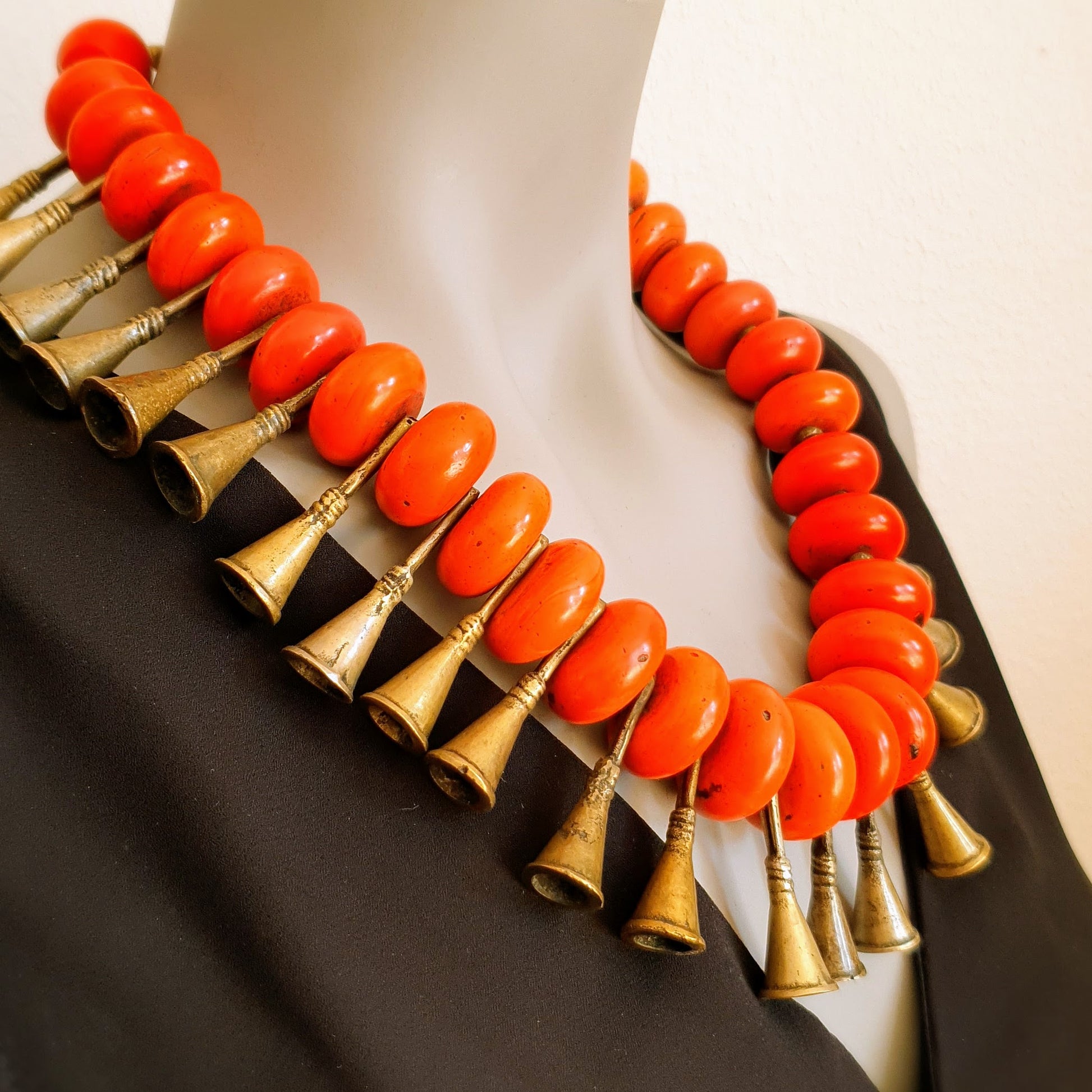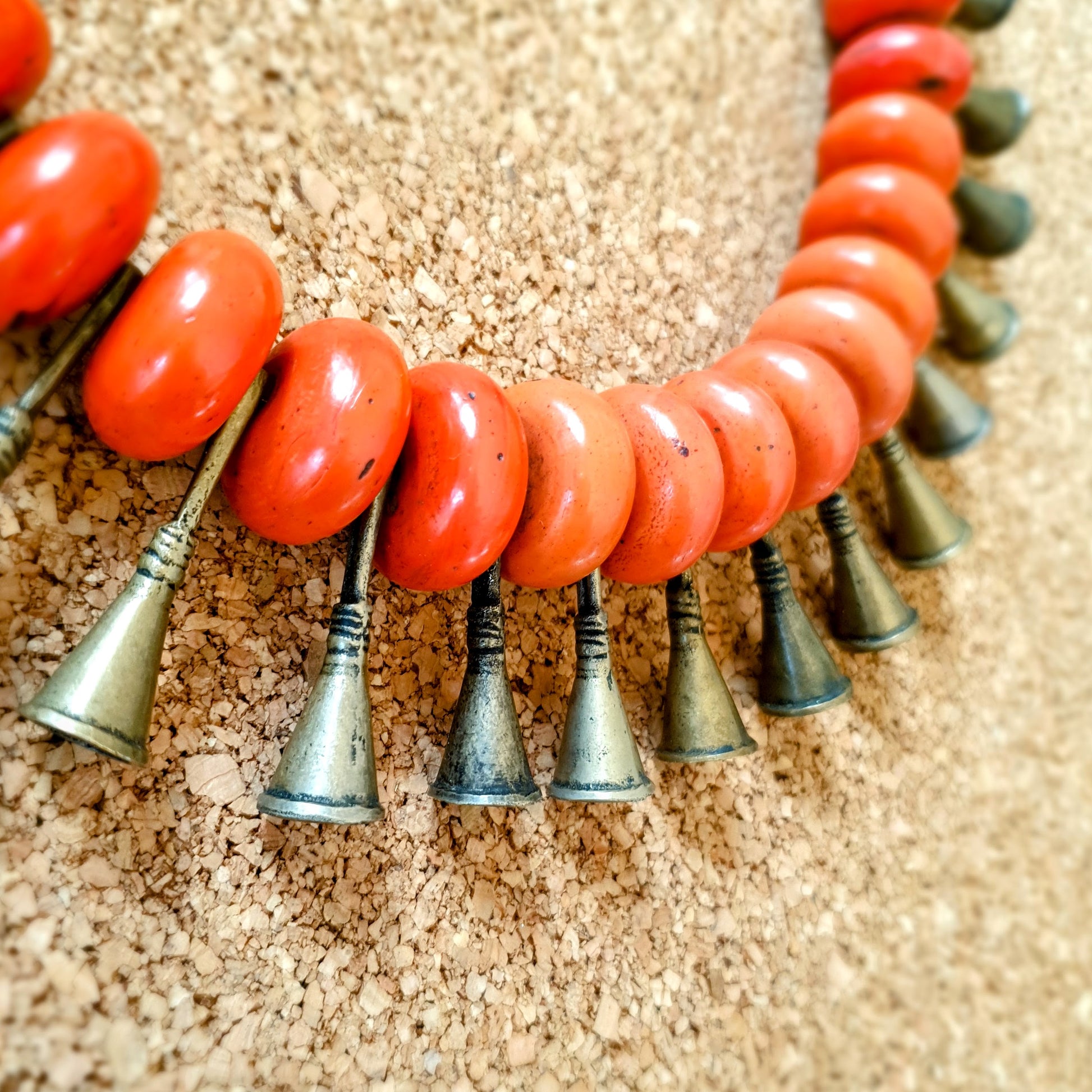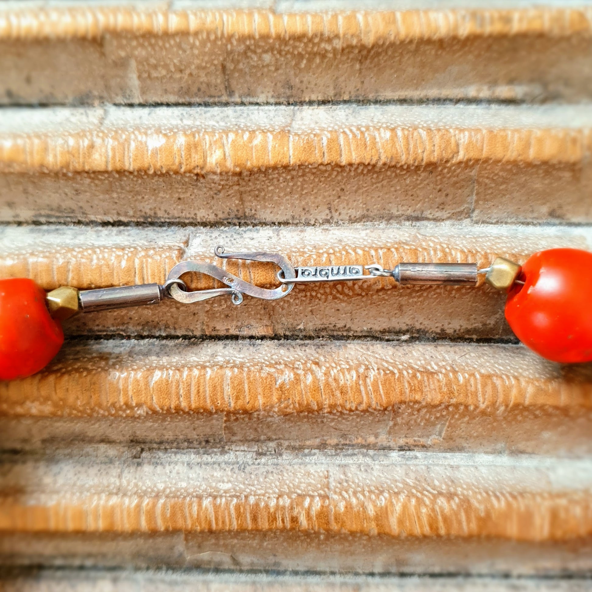 Große handgearbeitete Unikat- Halskette mit antiken lachsfarbenen Glasperlen aus Indien und indischen Bronzeanhängern mit oxidiertem Silberverschluss von ambra Schmuck.