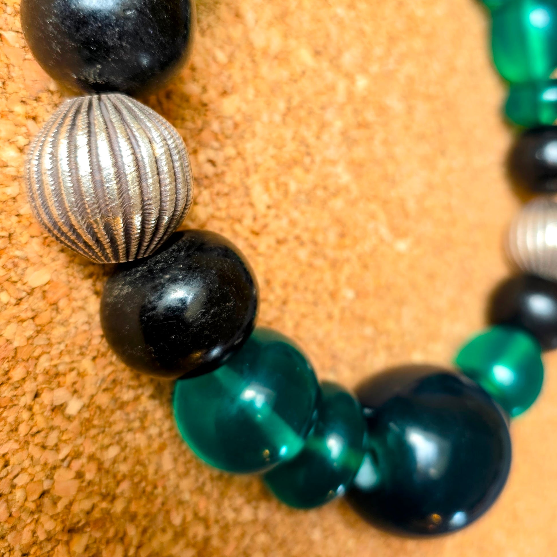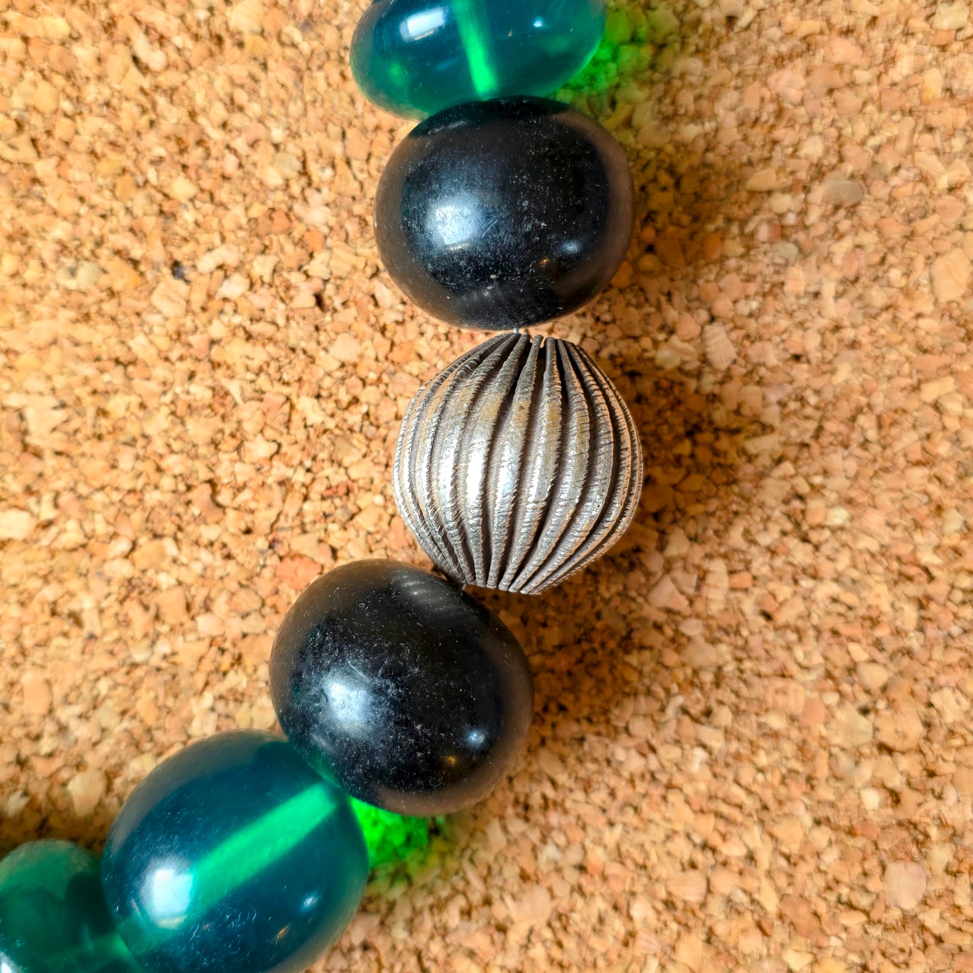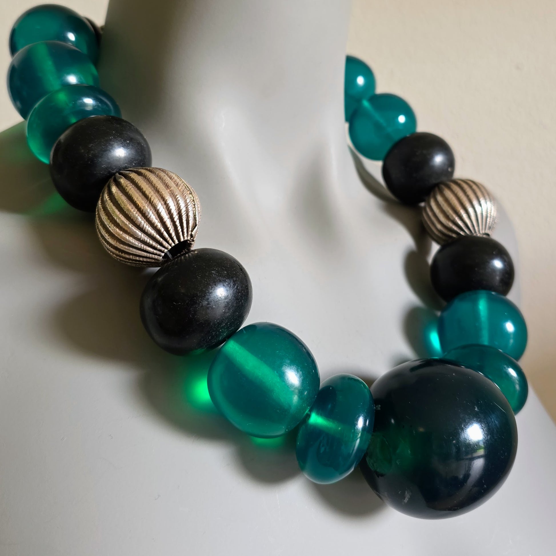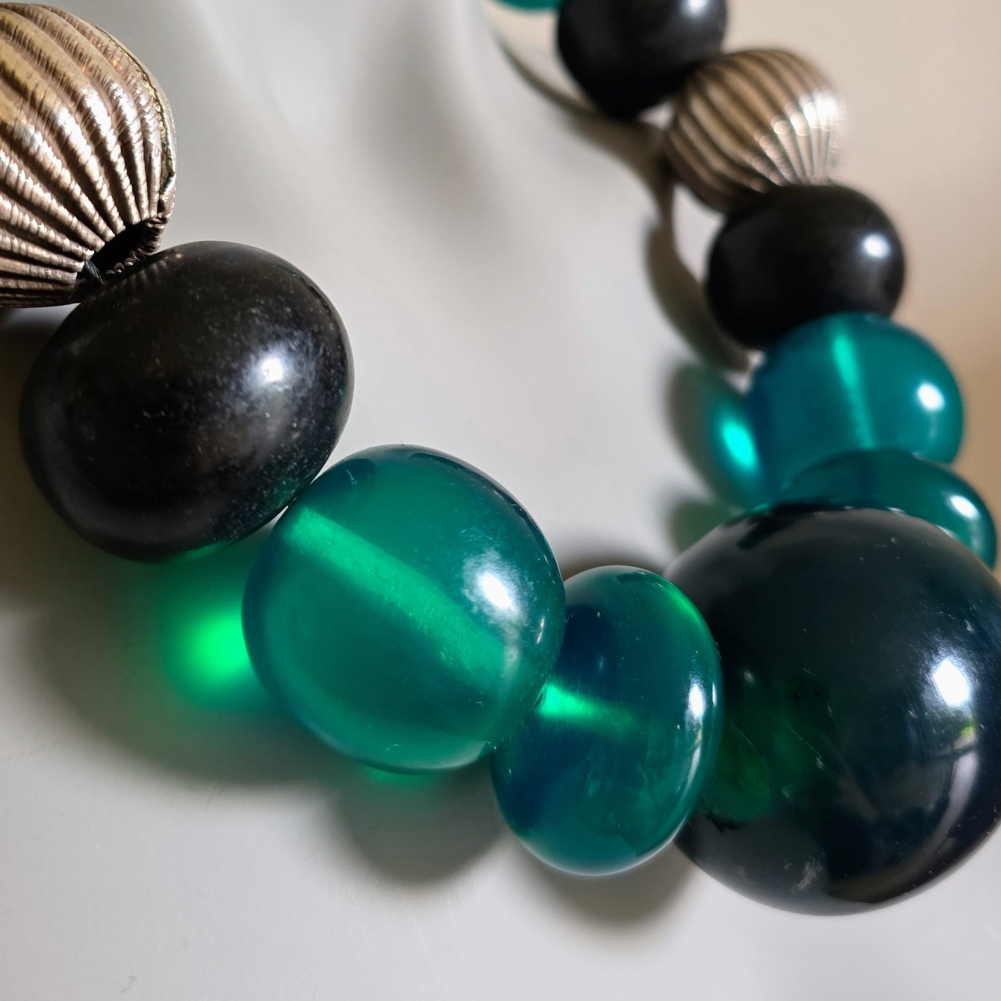 Große handgearbeitete Unikat- Halskette mit grünen und schwarzen Harzperlen aus Indonesien und massiven gestreiften Silberperlen aus Burma mit Silberverschluss von ambra Schmuck.