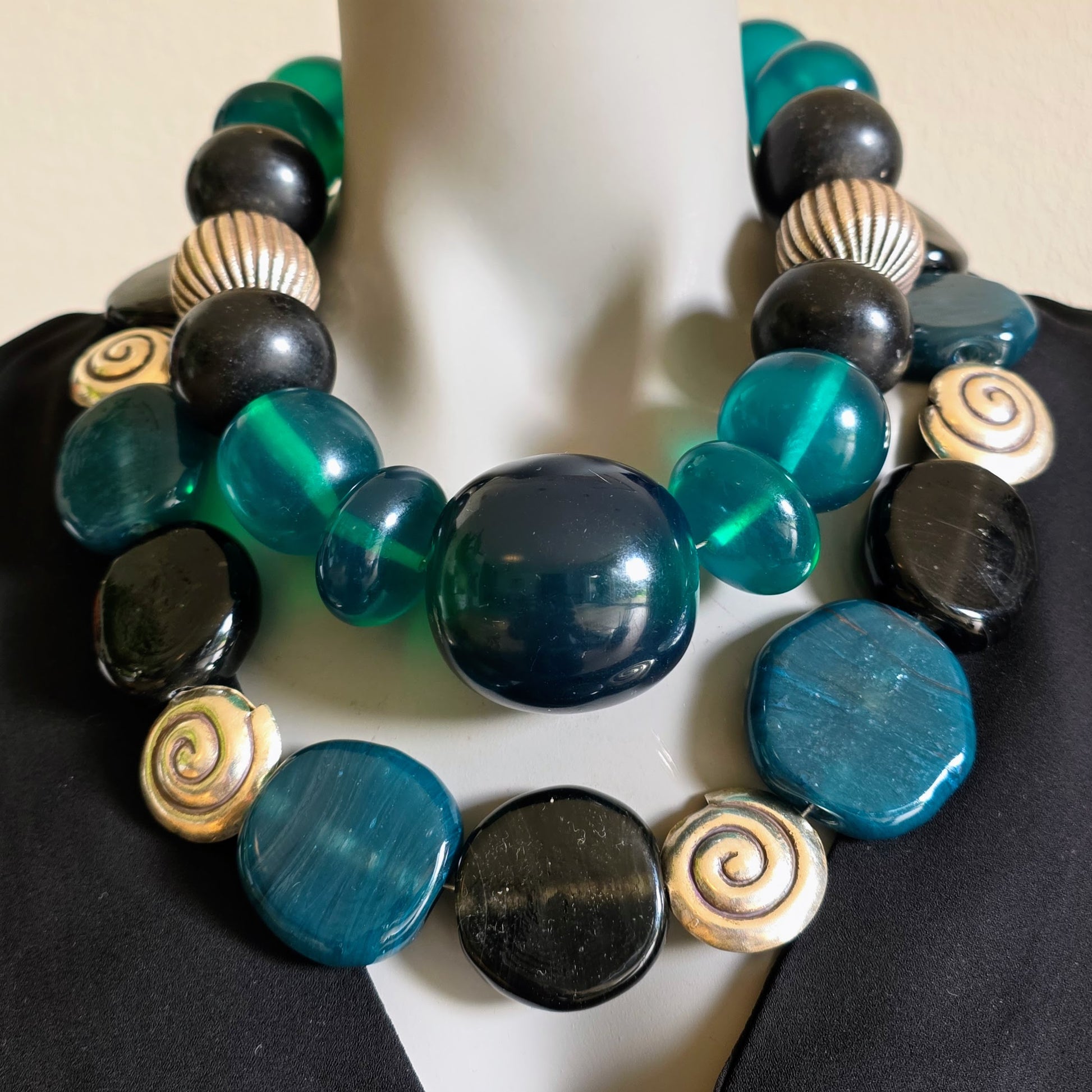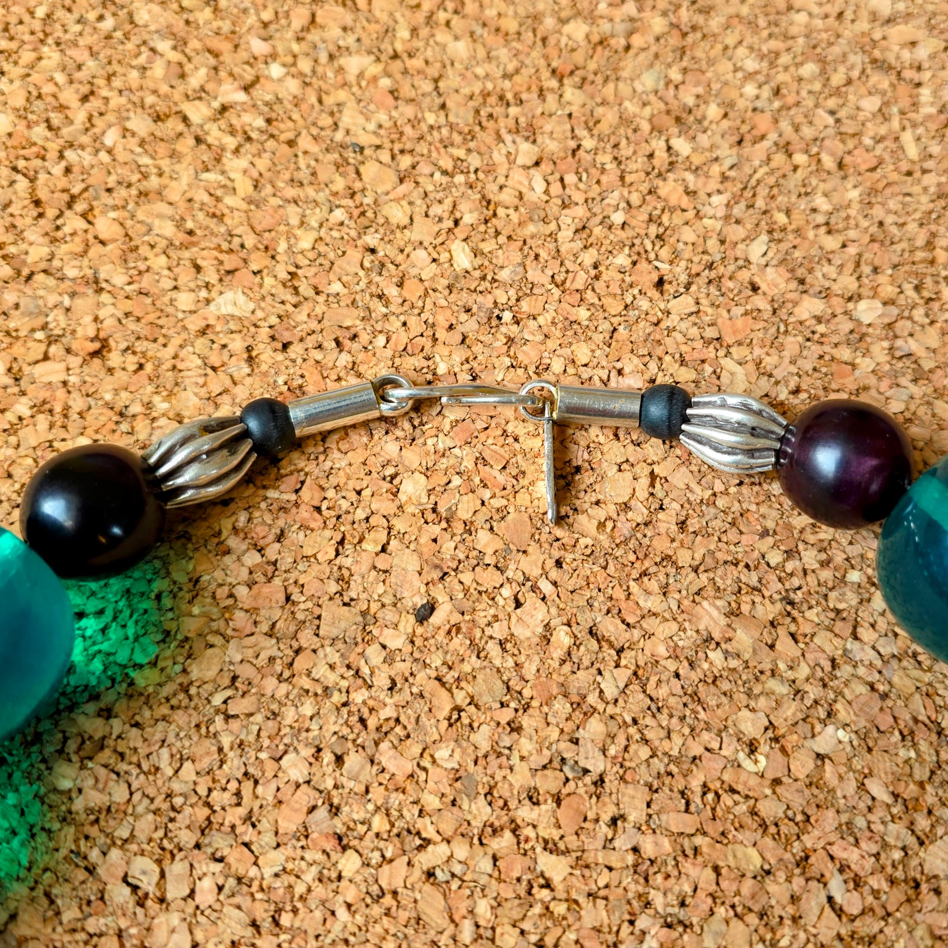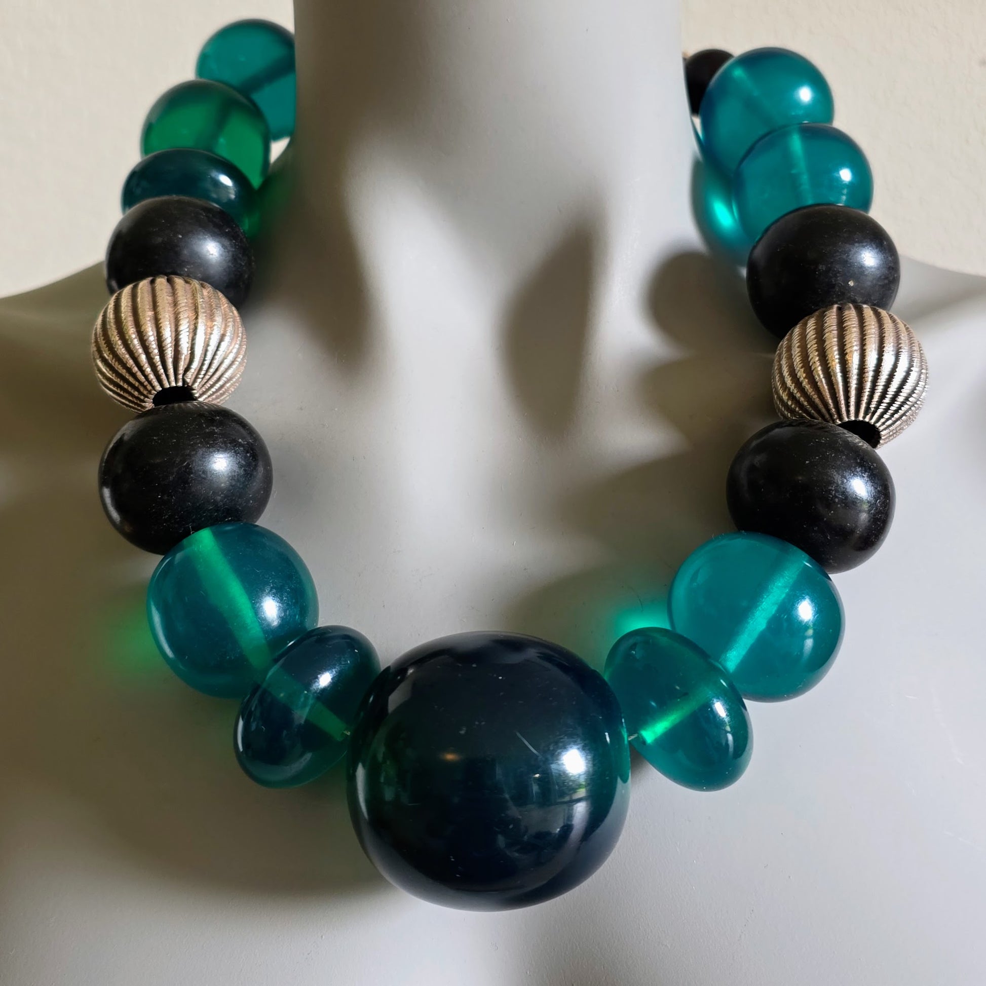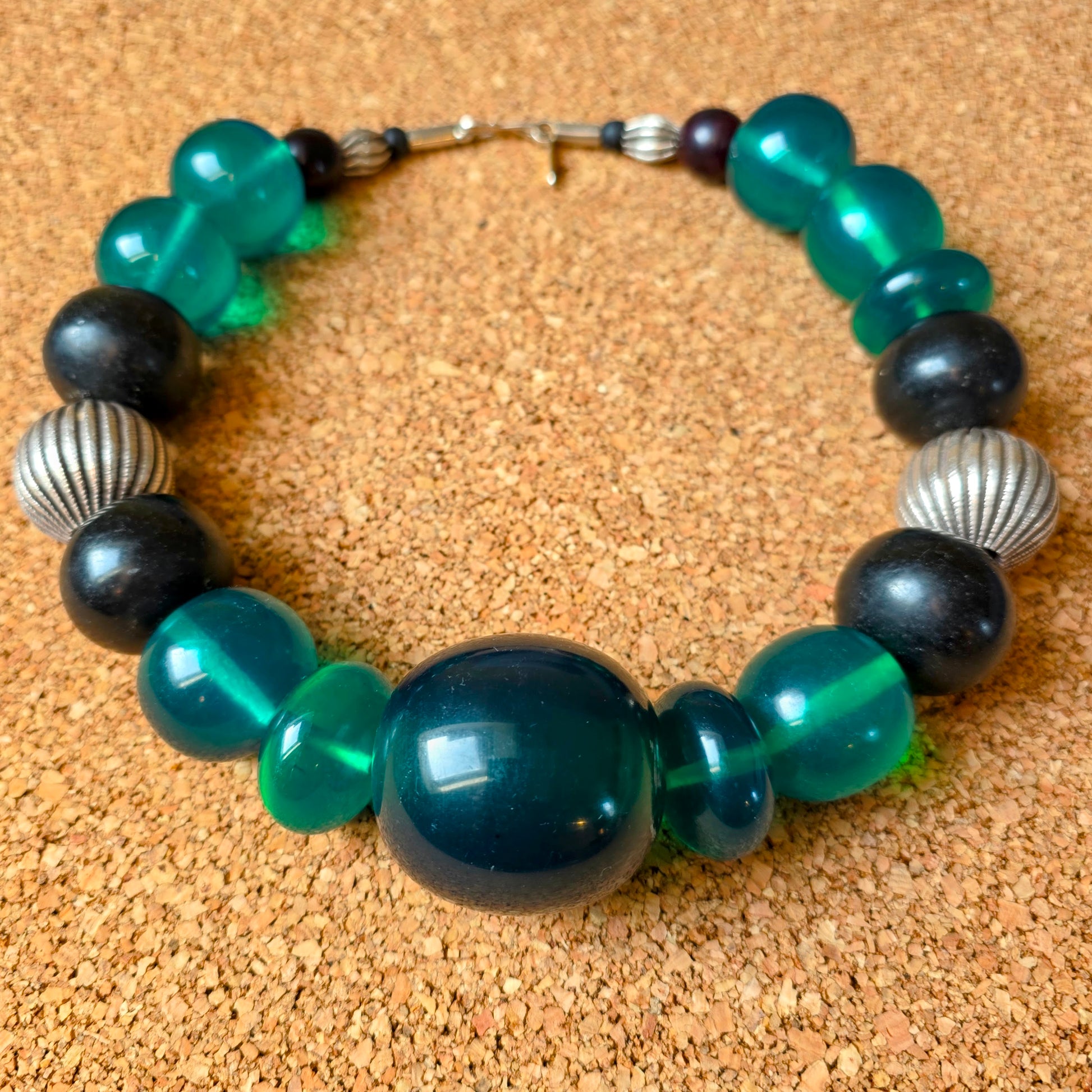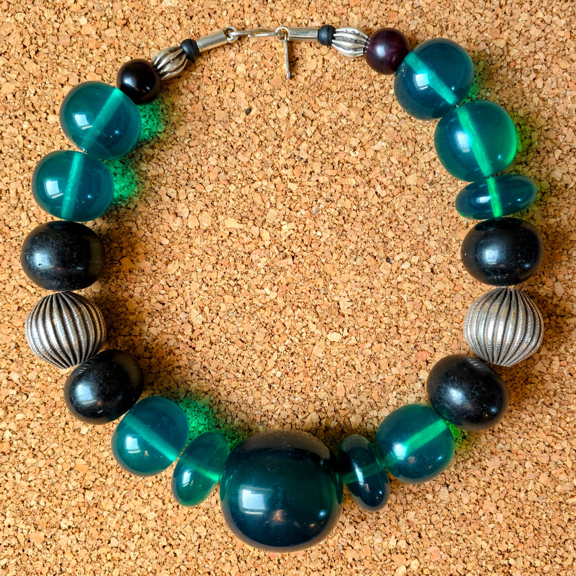 Große handgearbeitete Unikat- Halskette mit grünen und schwarzen Harzperlen aus Indonesien und massiven gestreiften Silberperlen aus Burma mit Silberverschluss von ambra Schmuck.