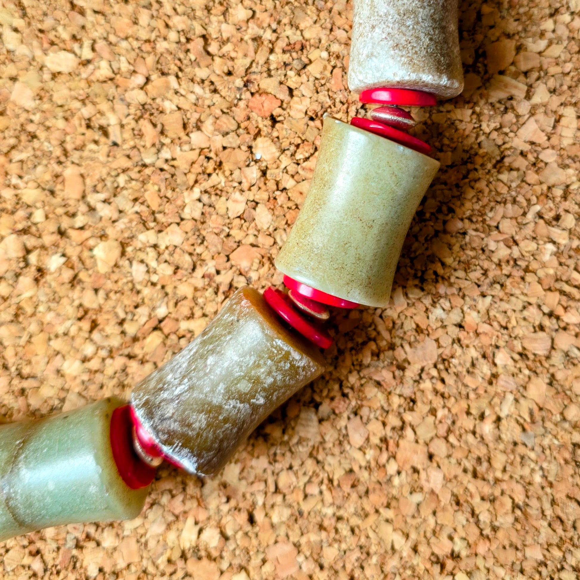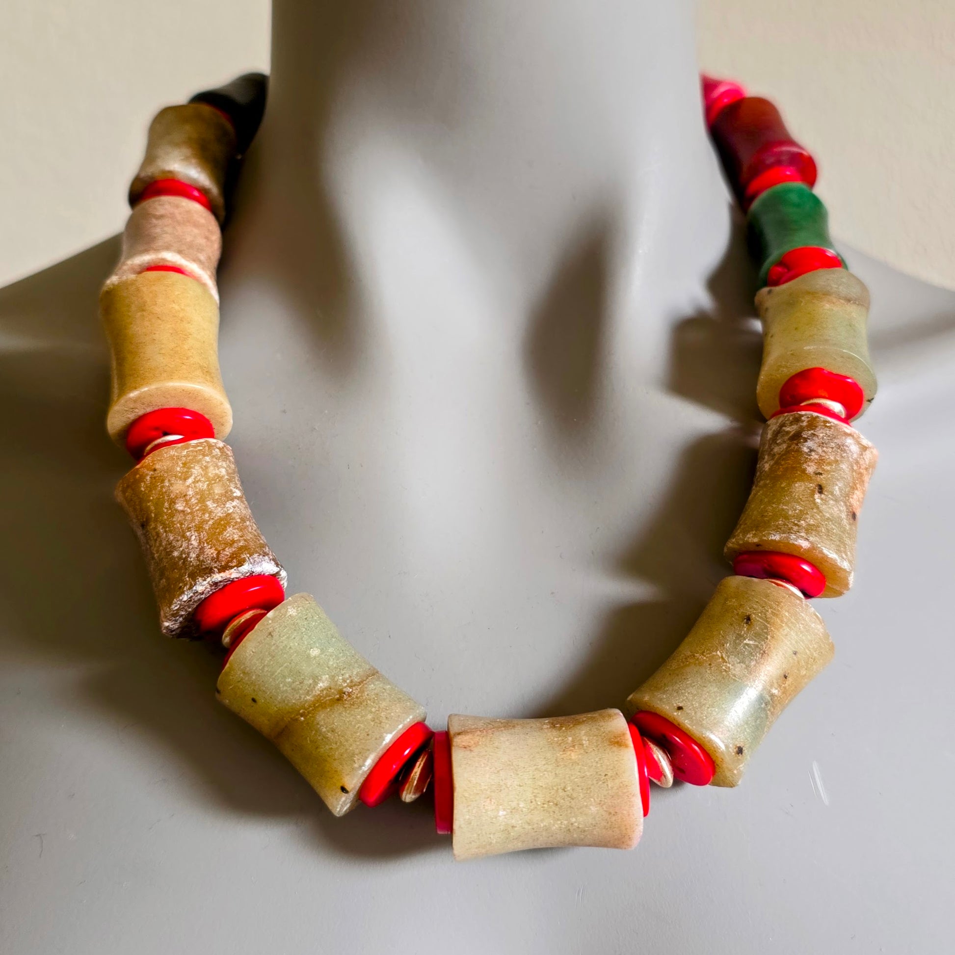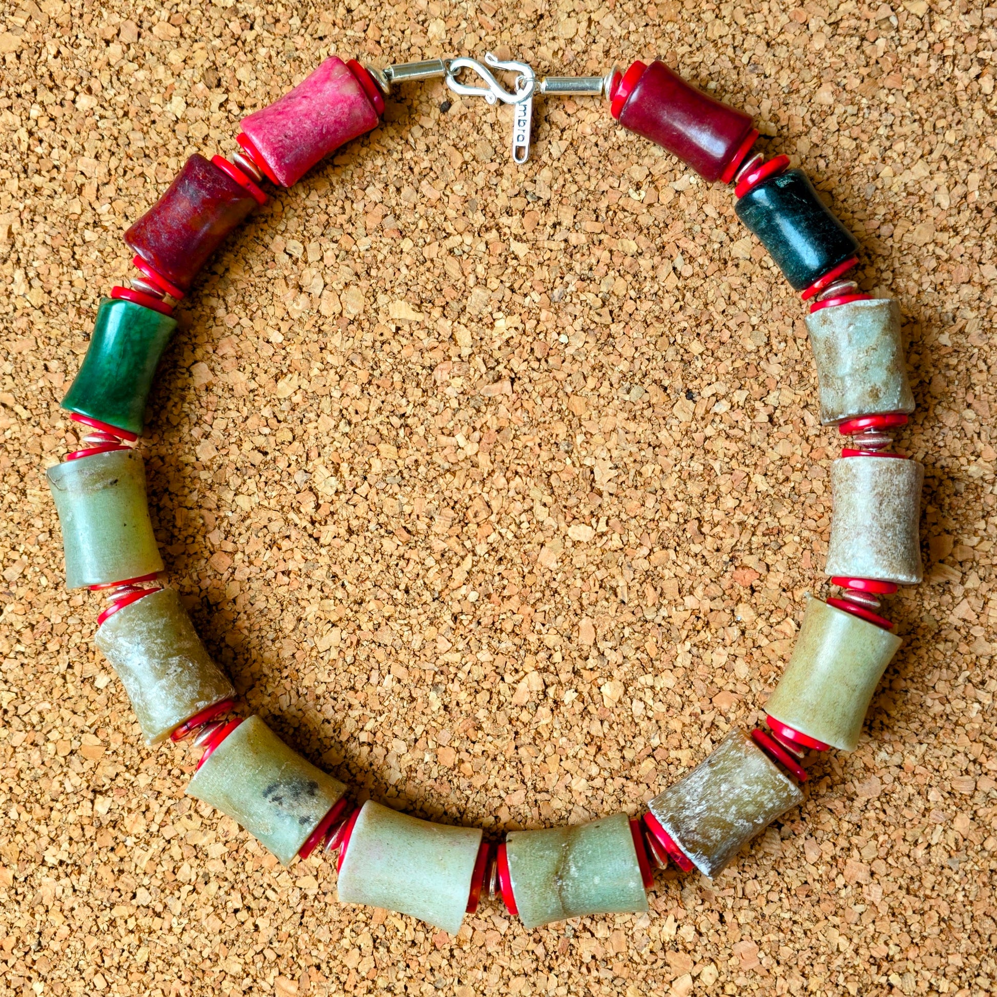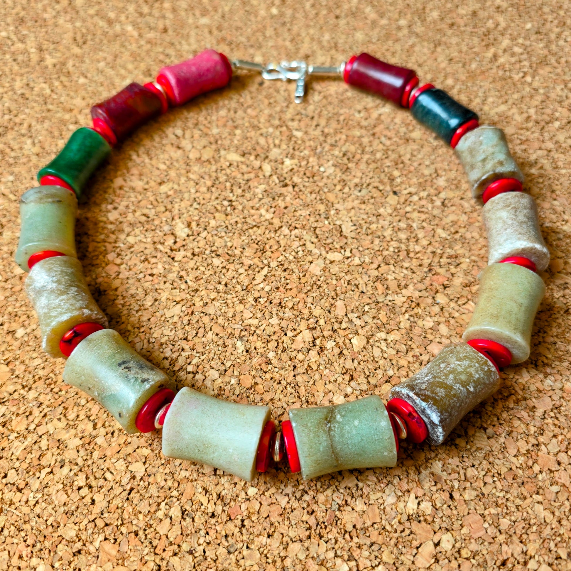 Handgearbeitete Unikat- Halskette mit braungrünen Jadesteinen, roten Korallenscheiben und Silberperlen aus Burma mit Silberverschluss von ambra Schmuck.