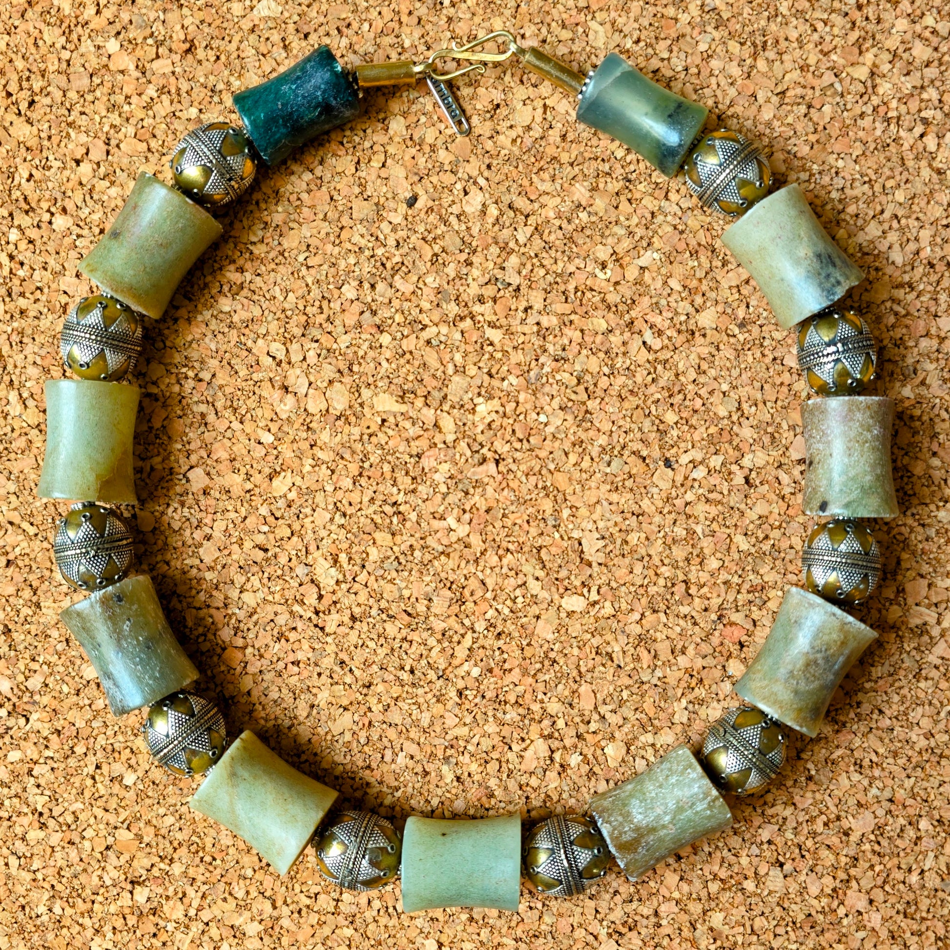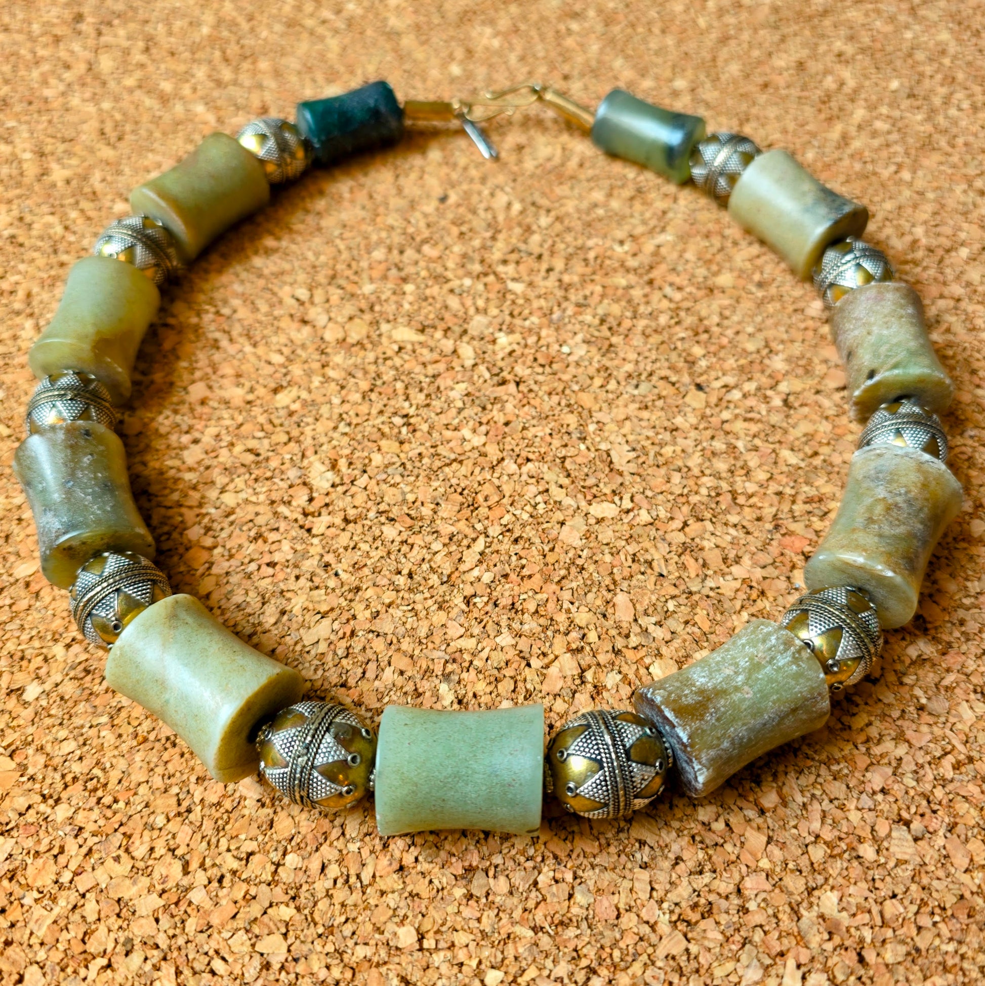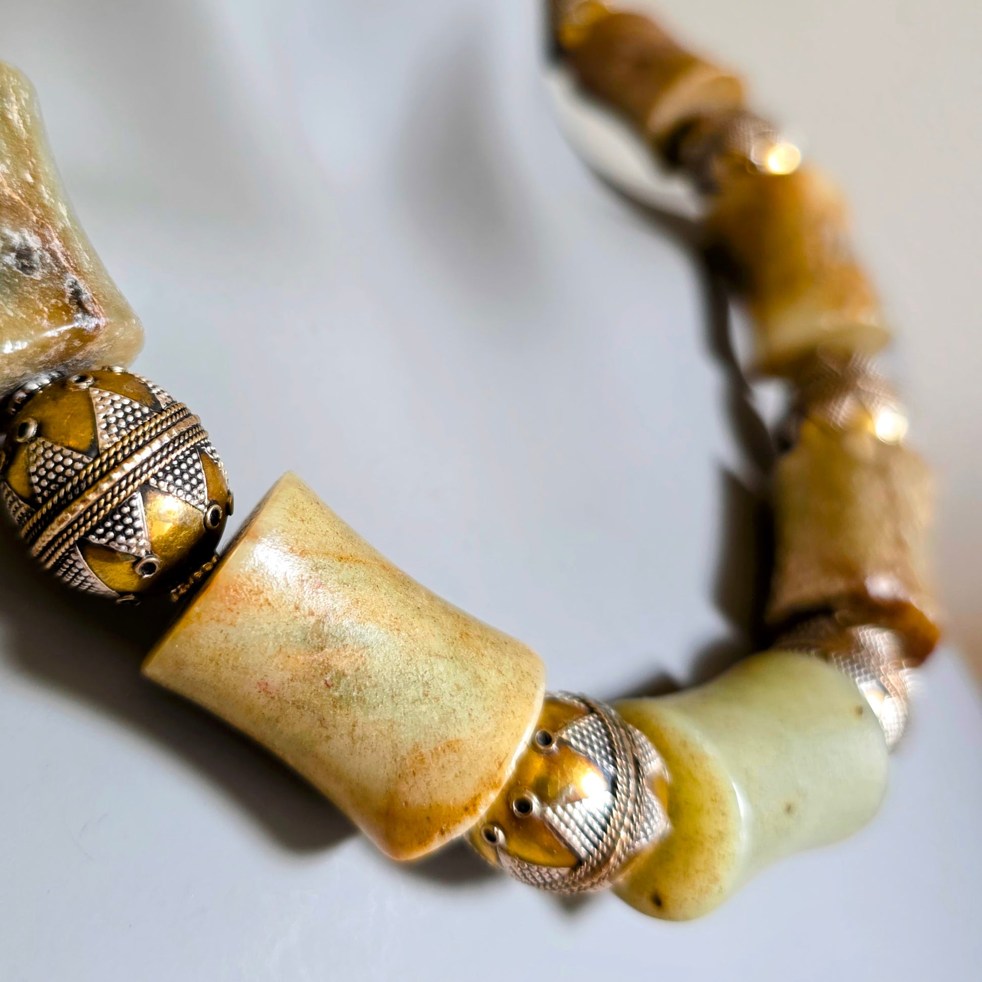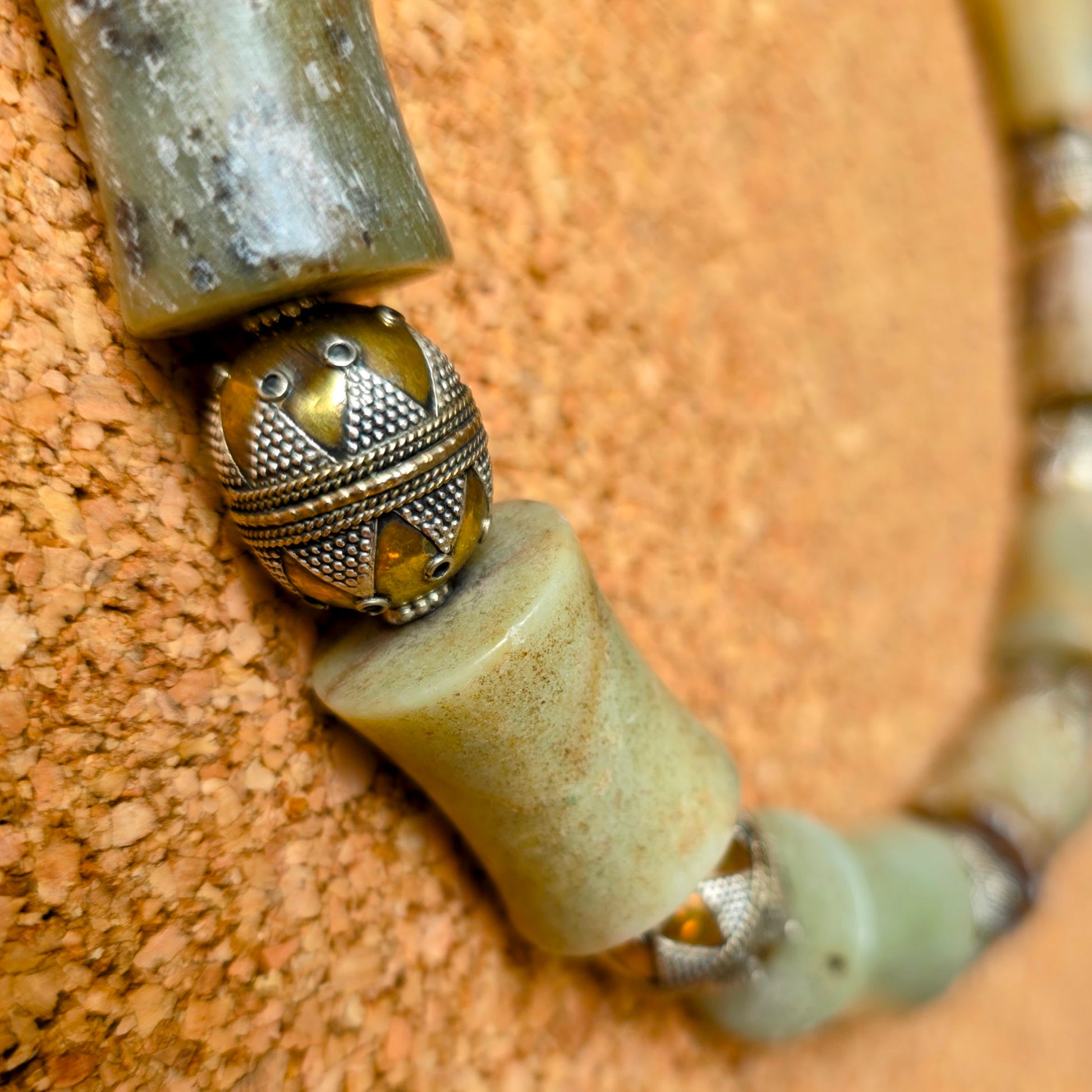 Handgearbeitete Unikat- Halskette mit braungrünen Jadesteinen und vergoldeten Silberperlen aus Afghanistan mit vergoldetem Silberverschluss von ambra Schmuck.