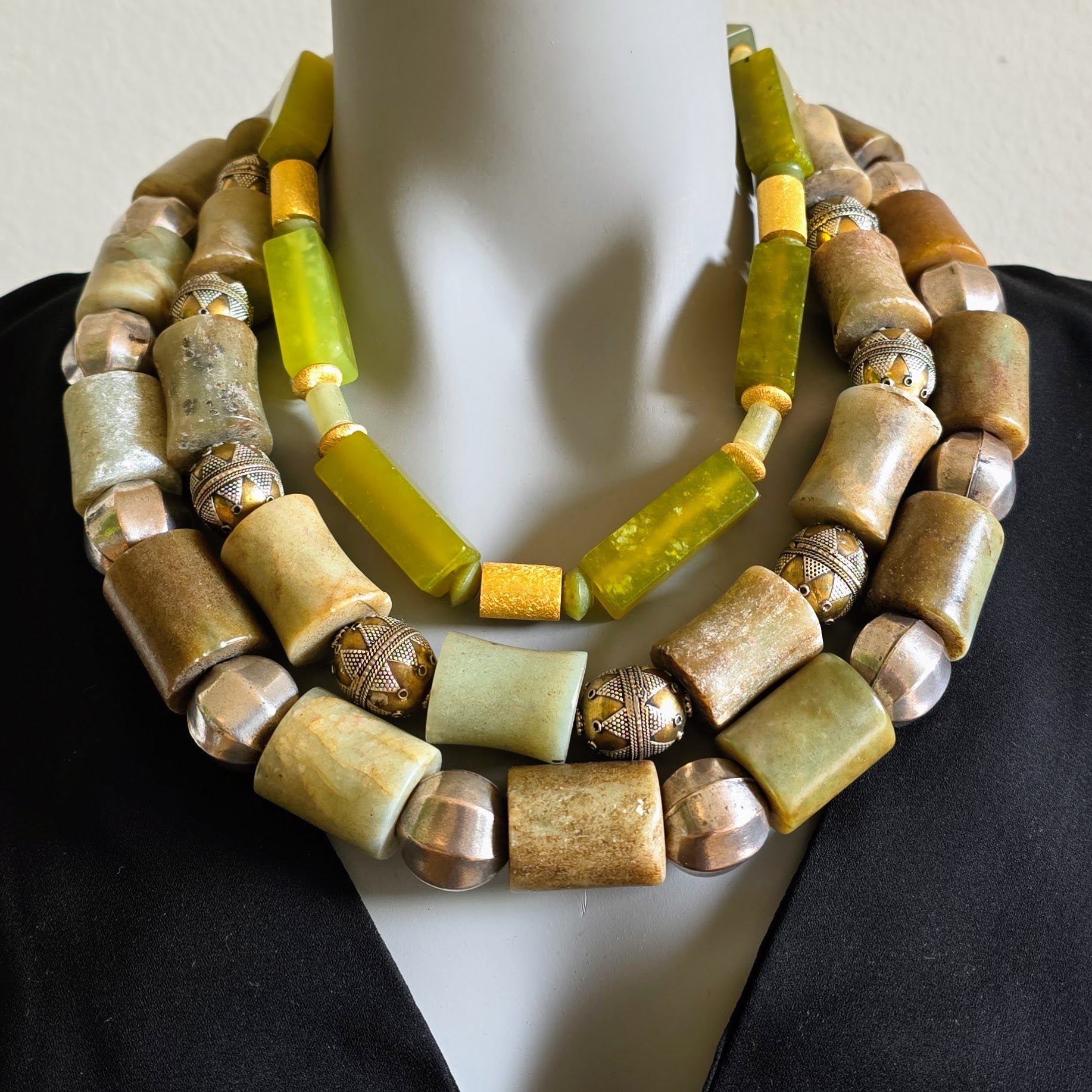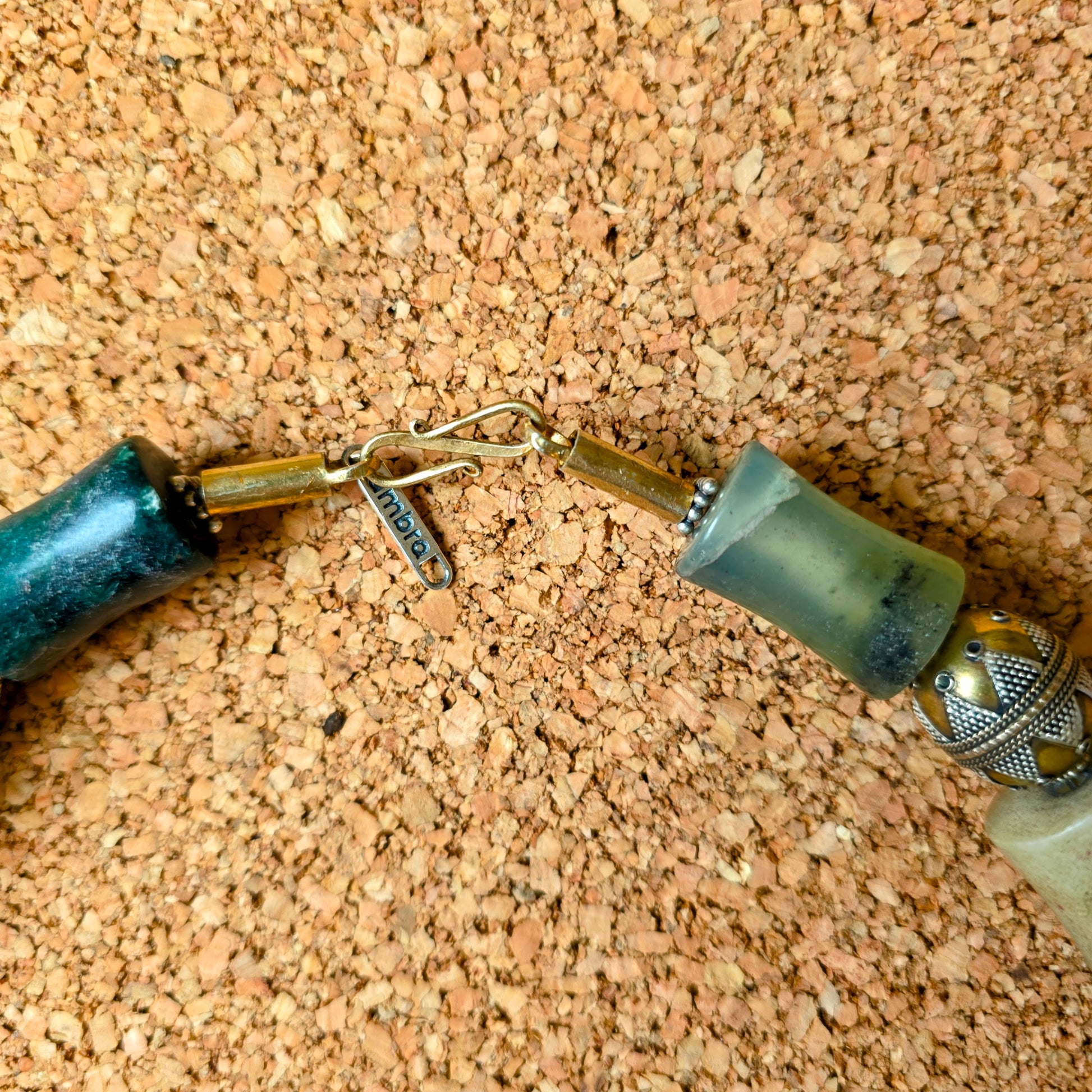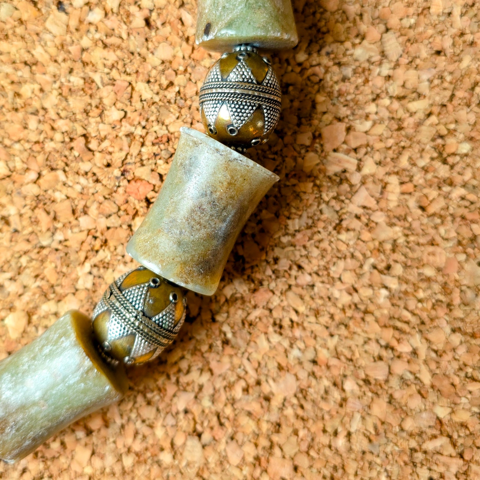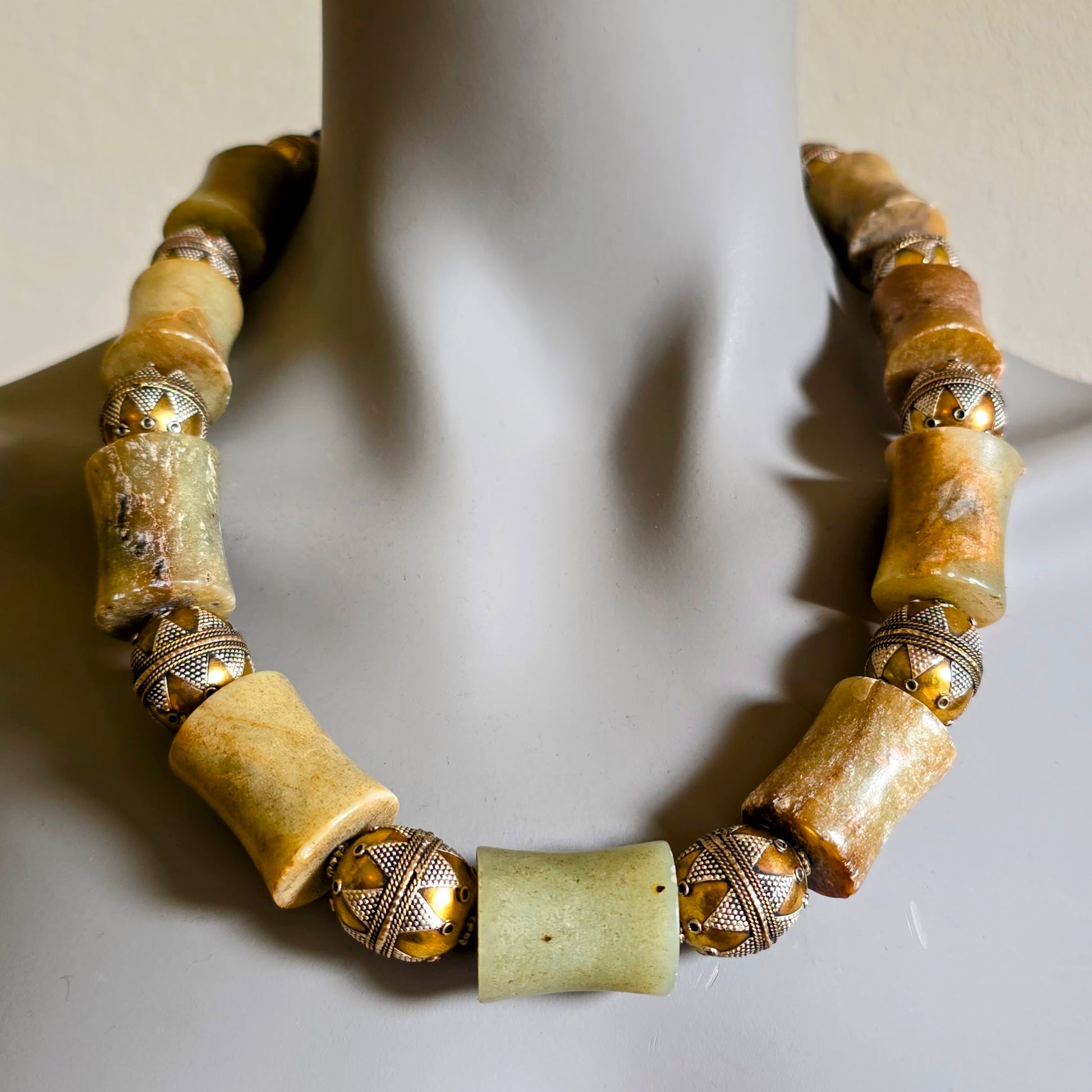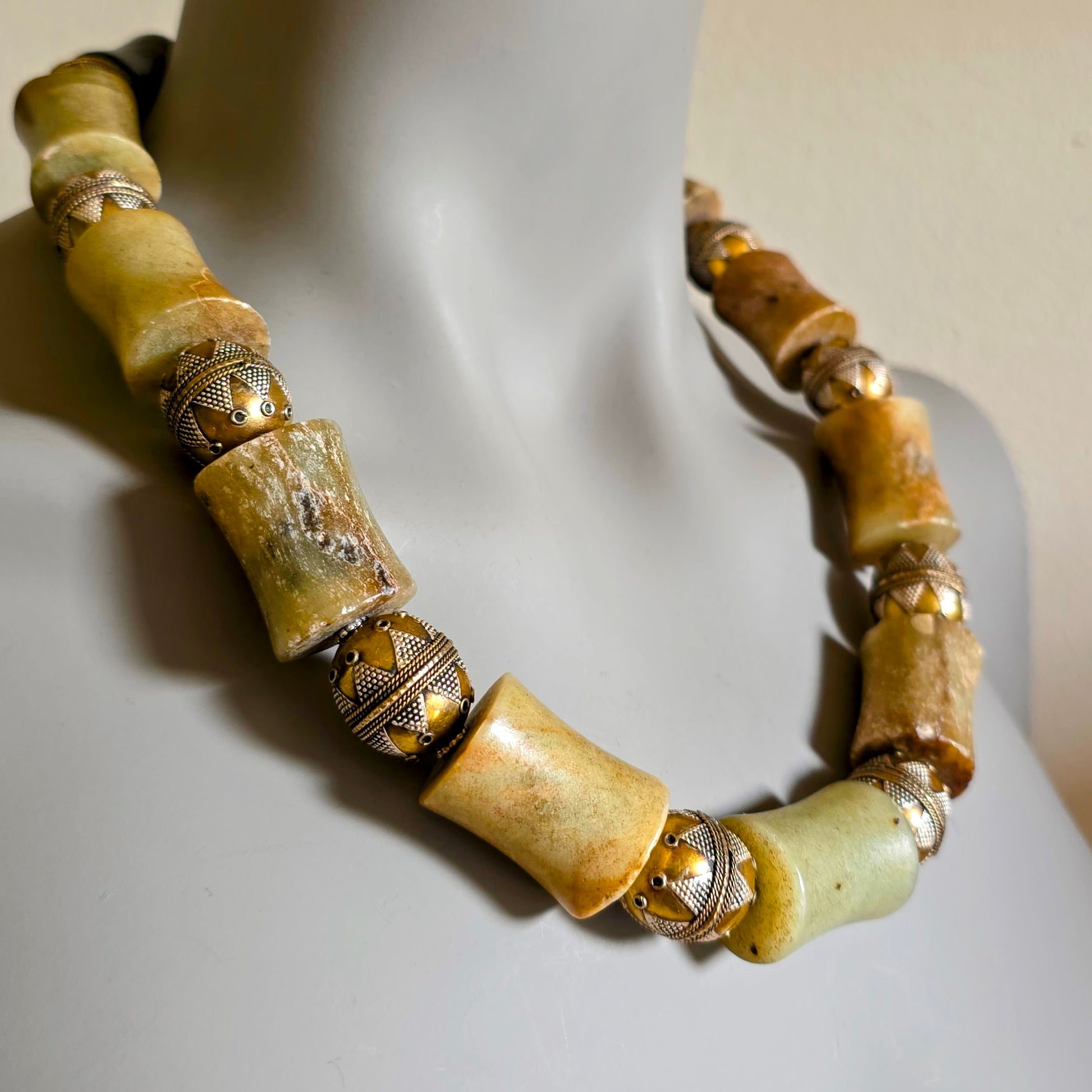 Handgearbeitete Unikat- Halskette mit braungrünen Jadesteinen und vergoldeten Silberperlen aus Afghanistan mit vergoldetem Silberverschluss von ambra Schmuck.