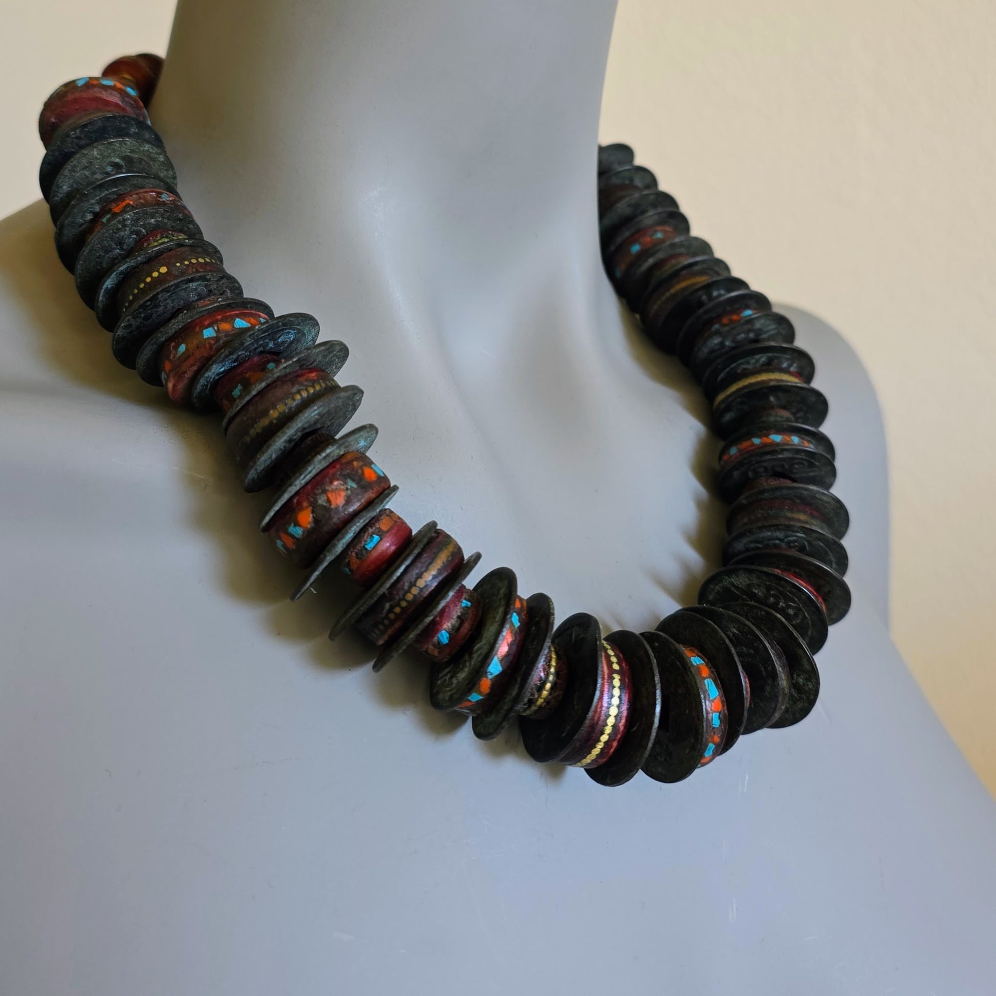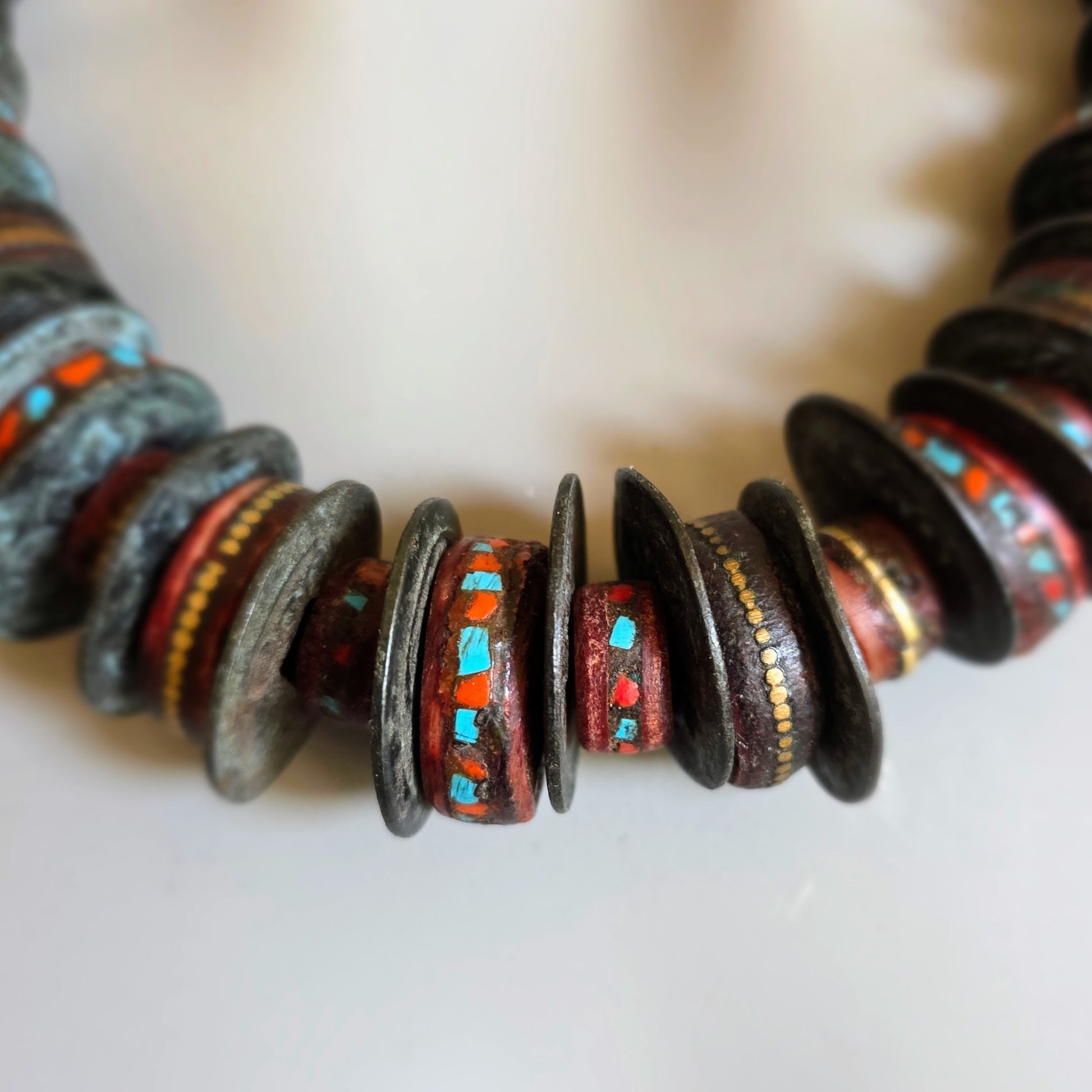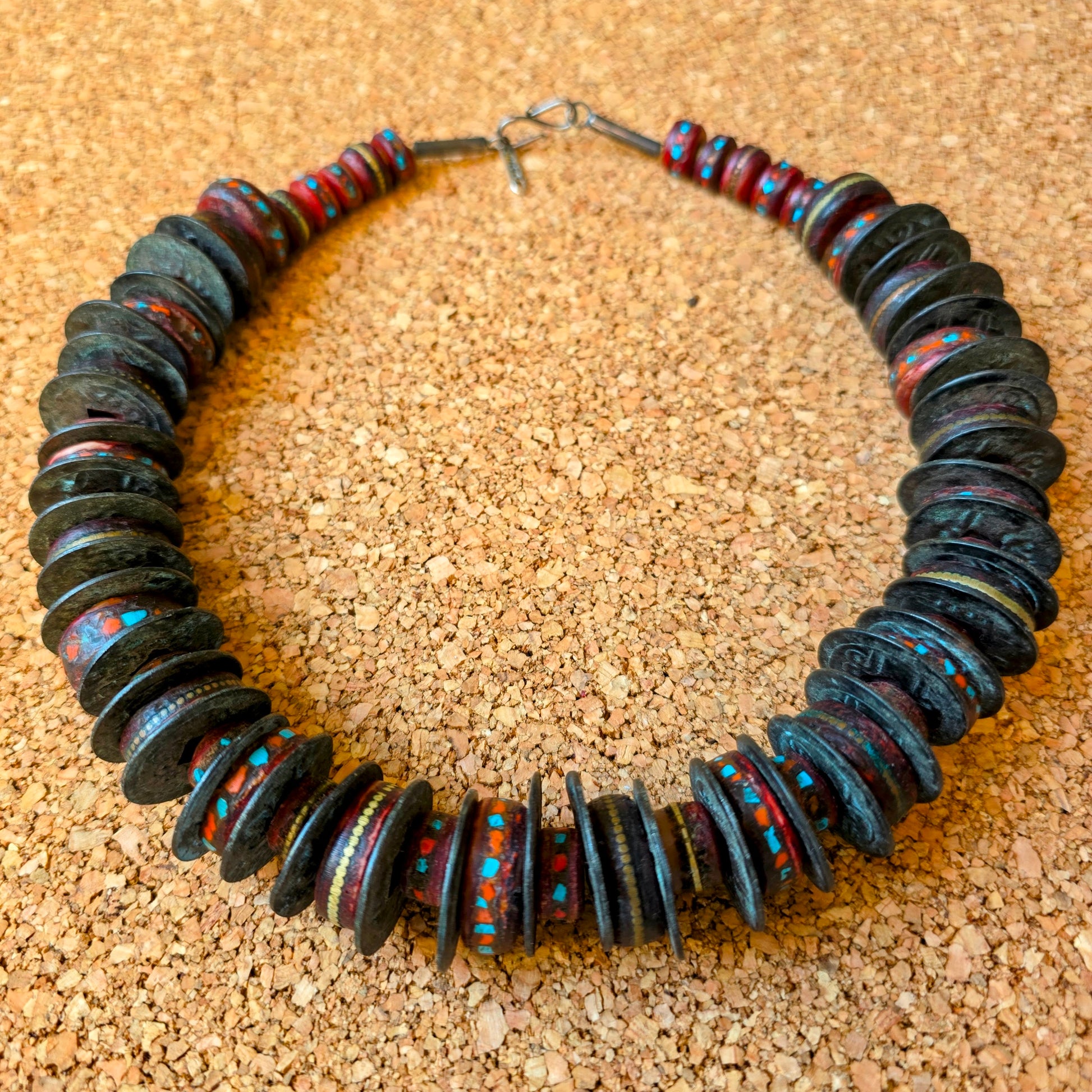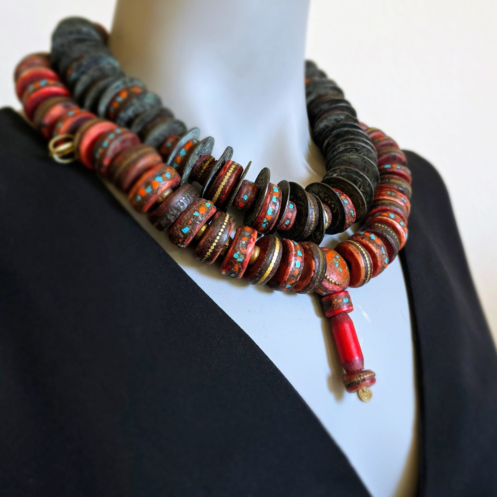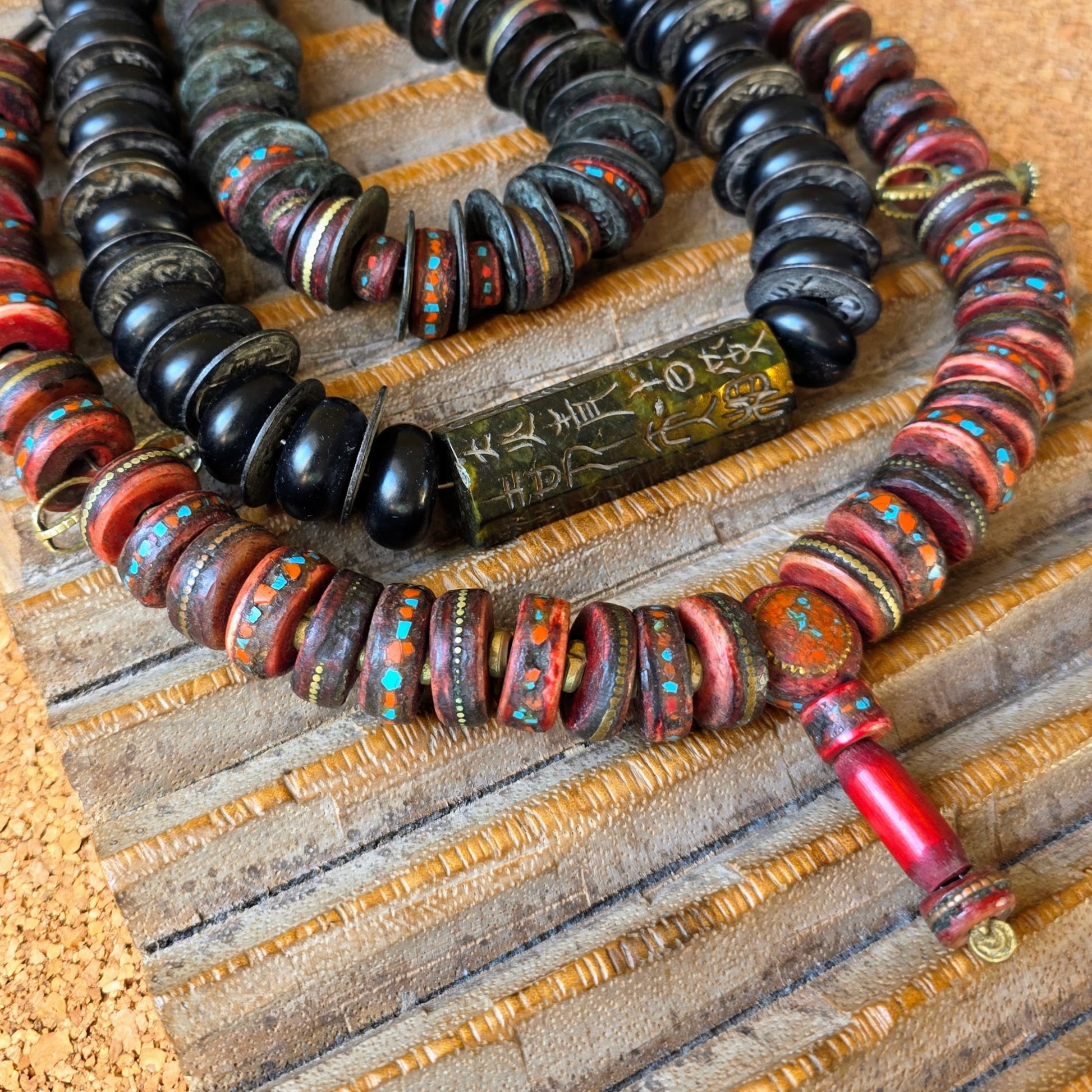 Handgearbeitete Unikat- Halskette mit nepalesischen Beinperlen mit Intarsien aus nepalesischen Gebets-Malas, chinesischen Münzen und Bronzeperlen mit oxidiertem Silberverschluss von ambra Schmuck.