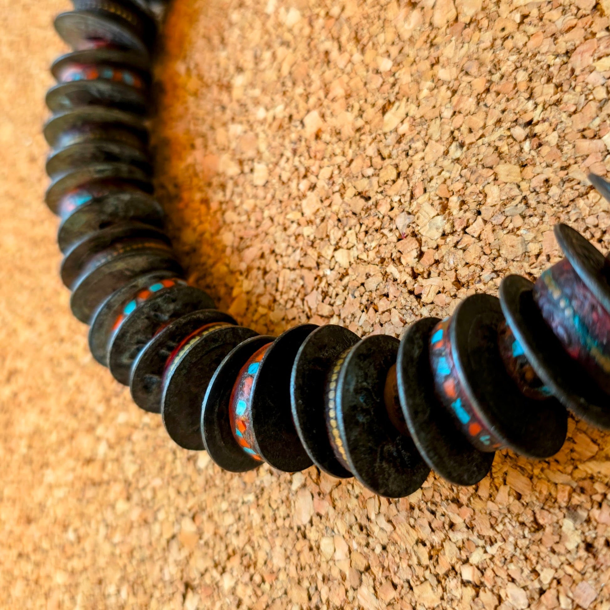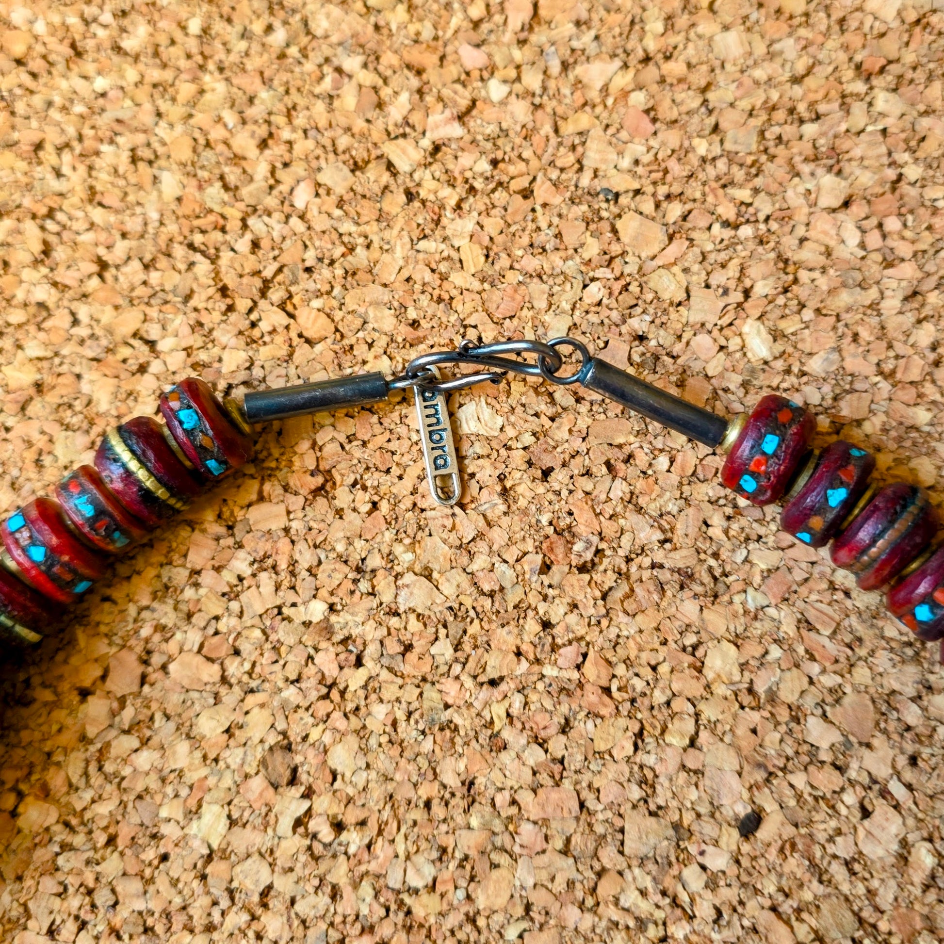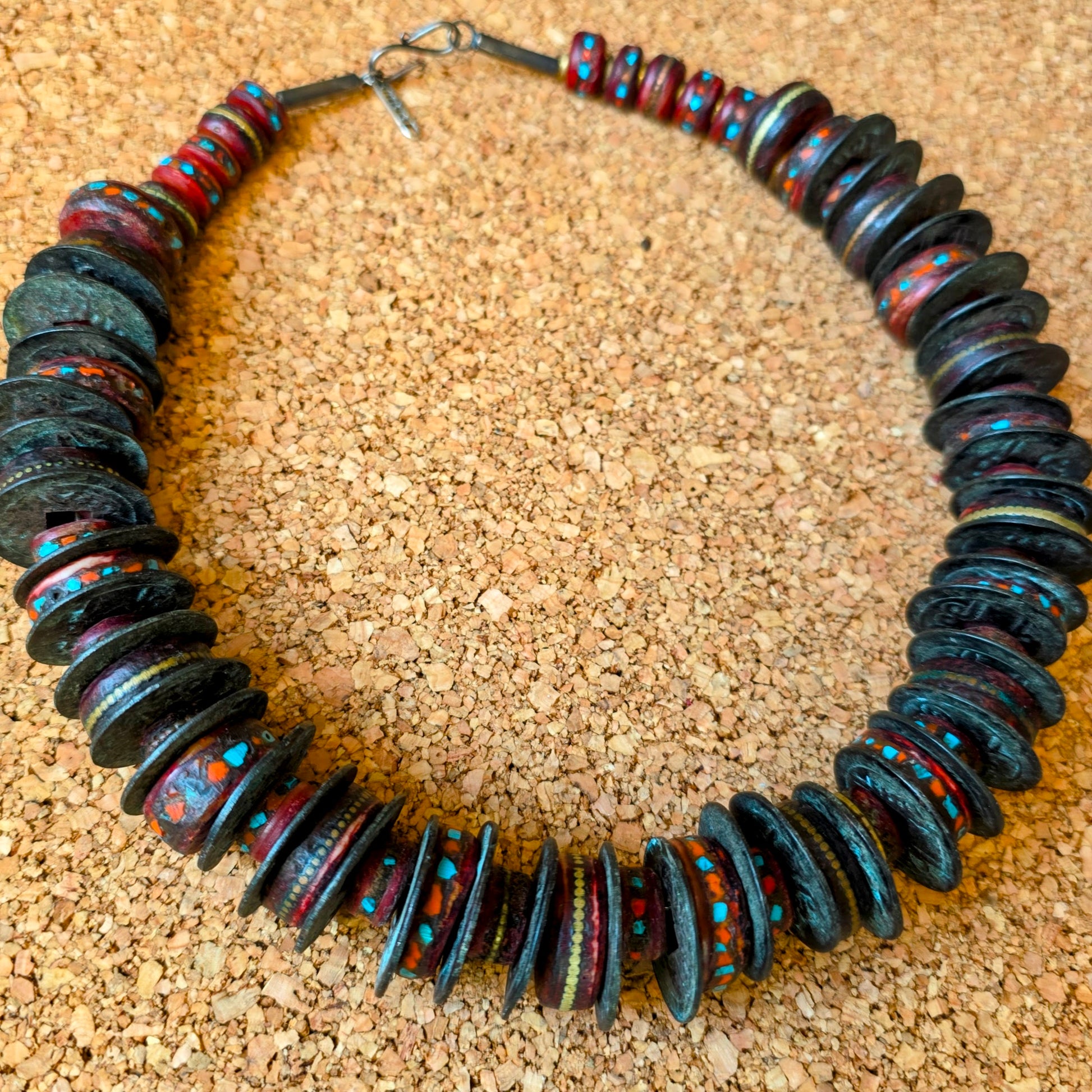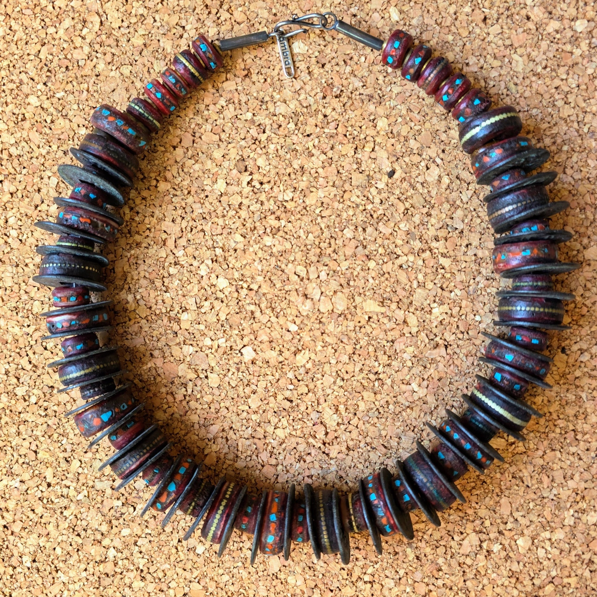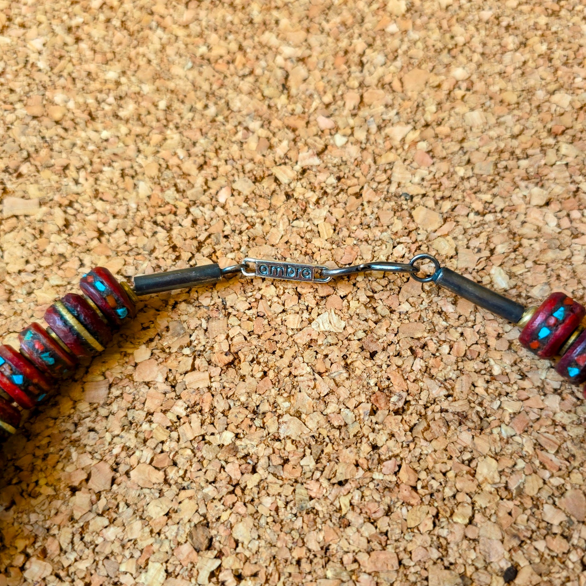 Handgearbeitete Unikat- Halskette mit nepalesischen Beinperlen mit Intarsien aus nepalesischen Gebets-Malas, chinesischen Münzen und Bronzeperlen mit oxidiertem Silberverschluss von ambra Schmuck.