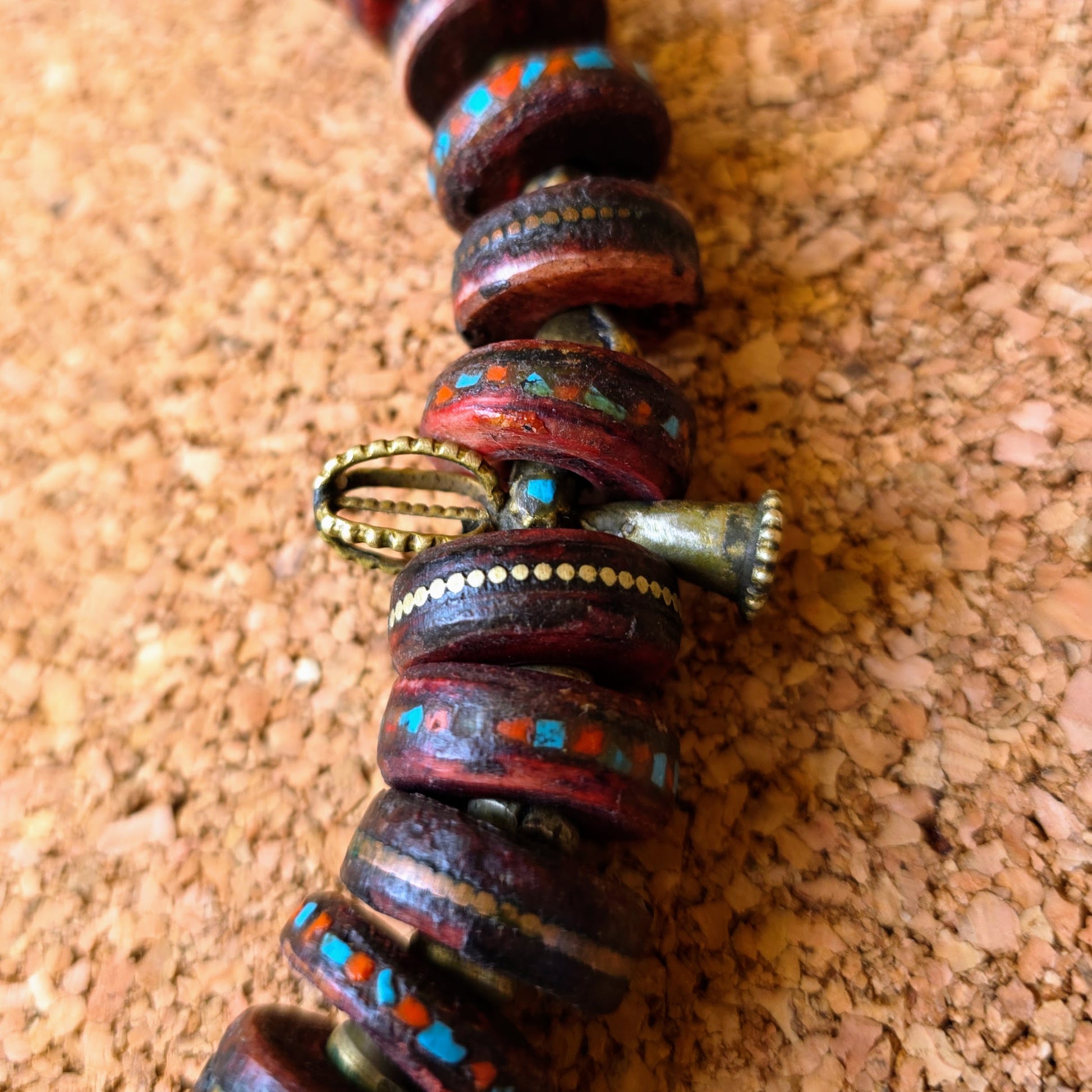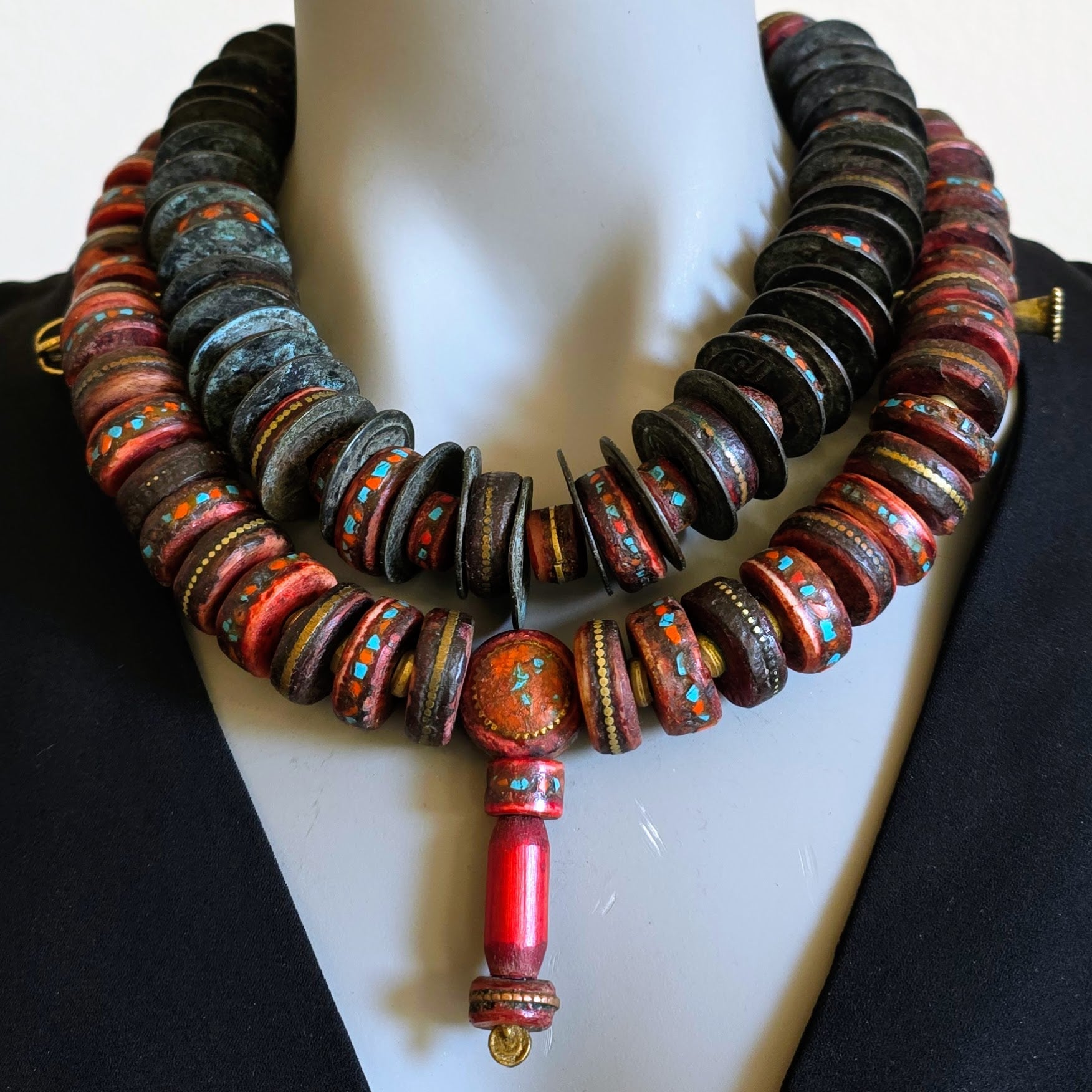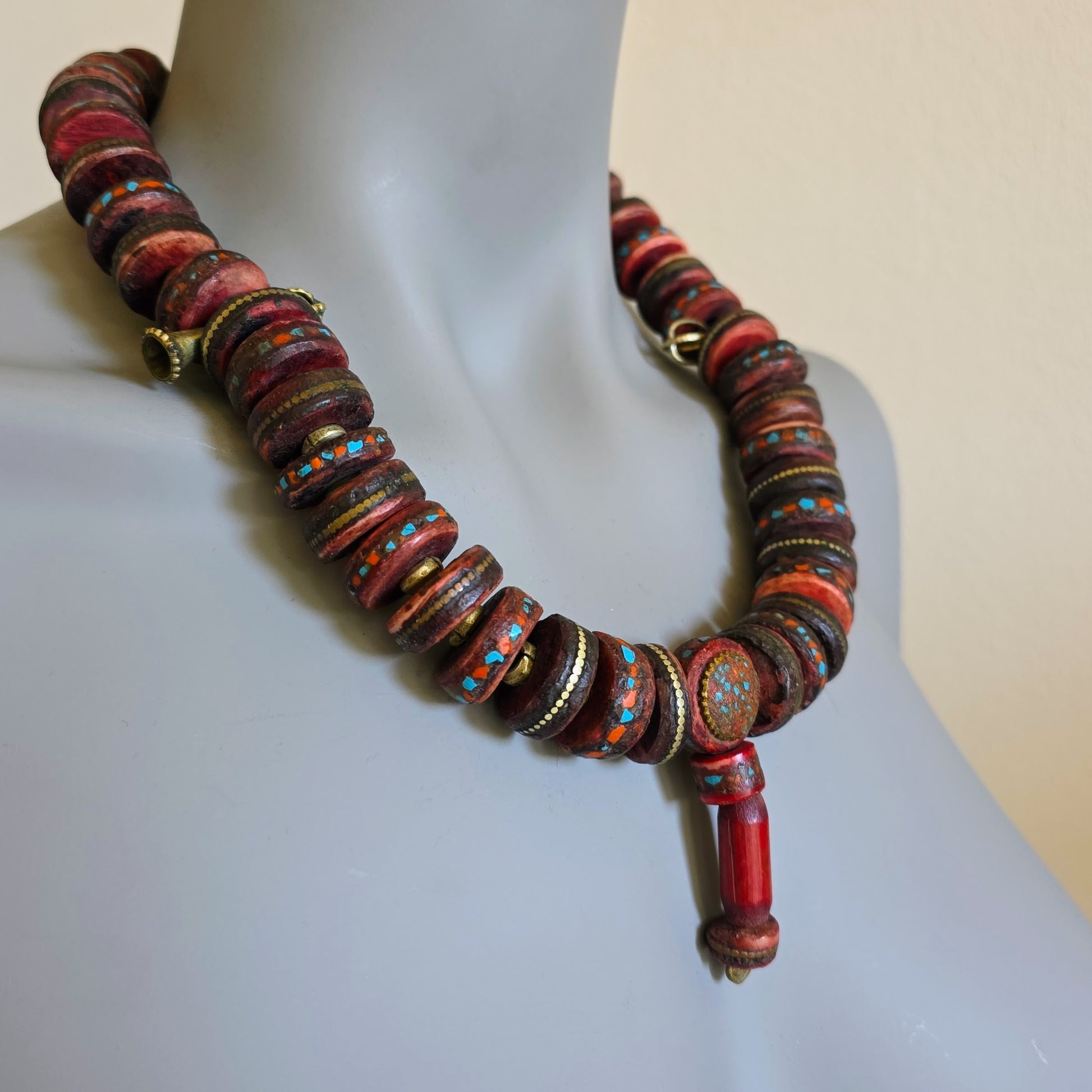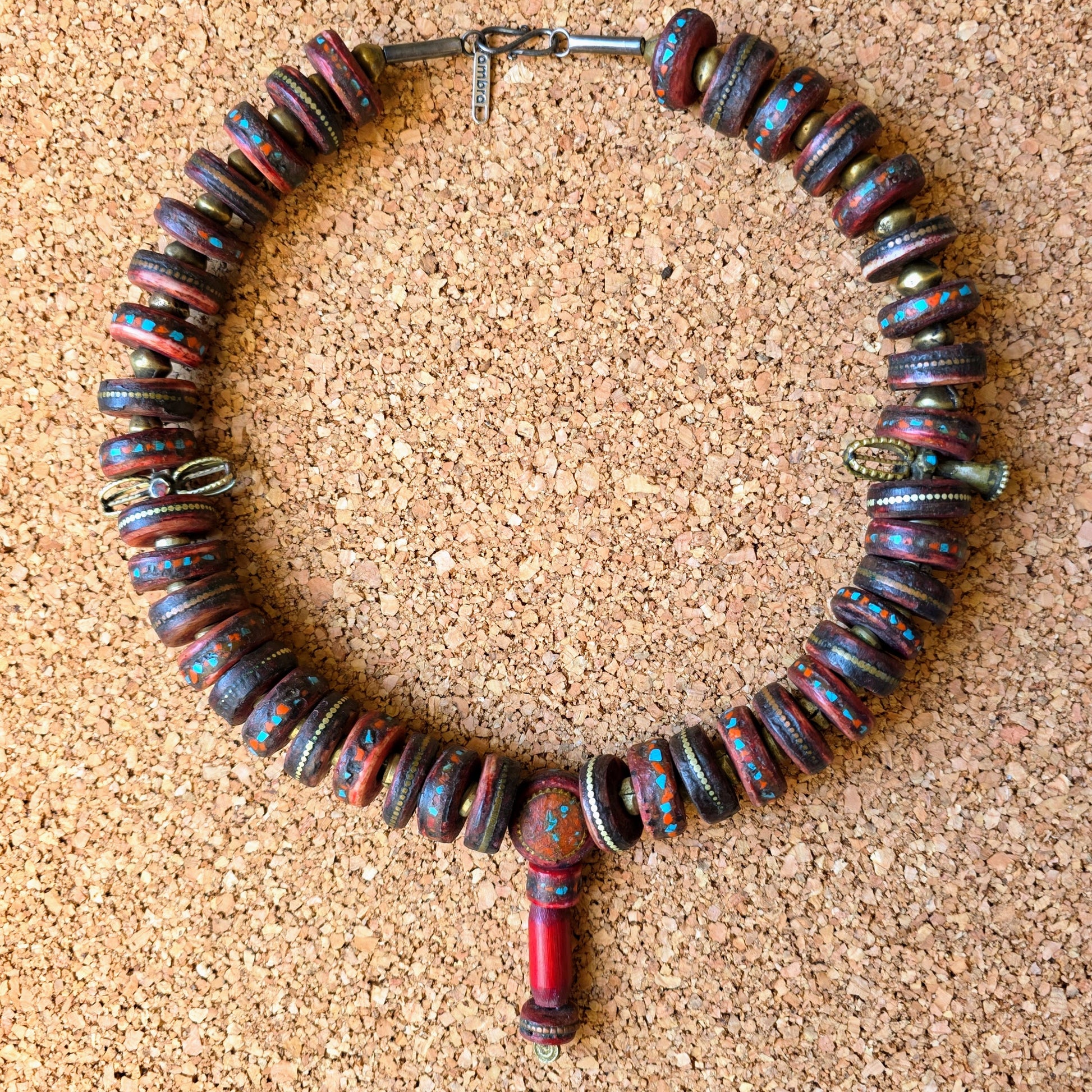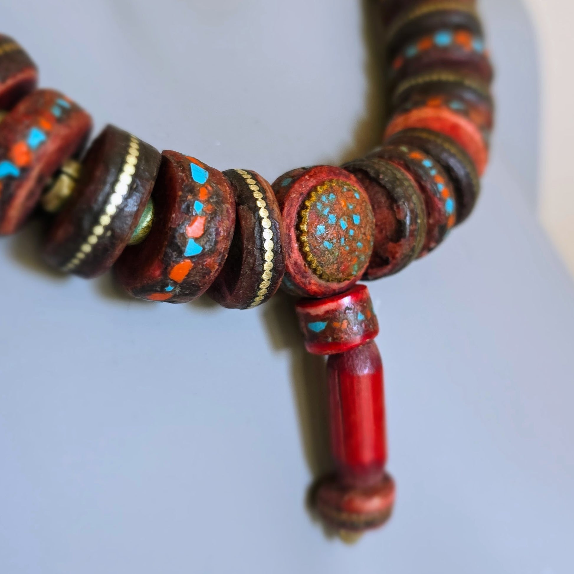 Handgearbeitete Unikat- Halskette mit nepalesischen Beinperlen mit Intarsien aus nepalesischen Gebets-Malas und nepalesischen Bronzeperlen mit oxidiertem Silberverschluss von ambra Schmuck.