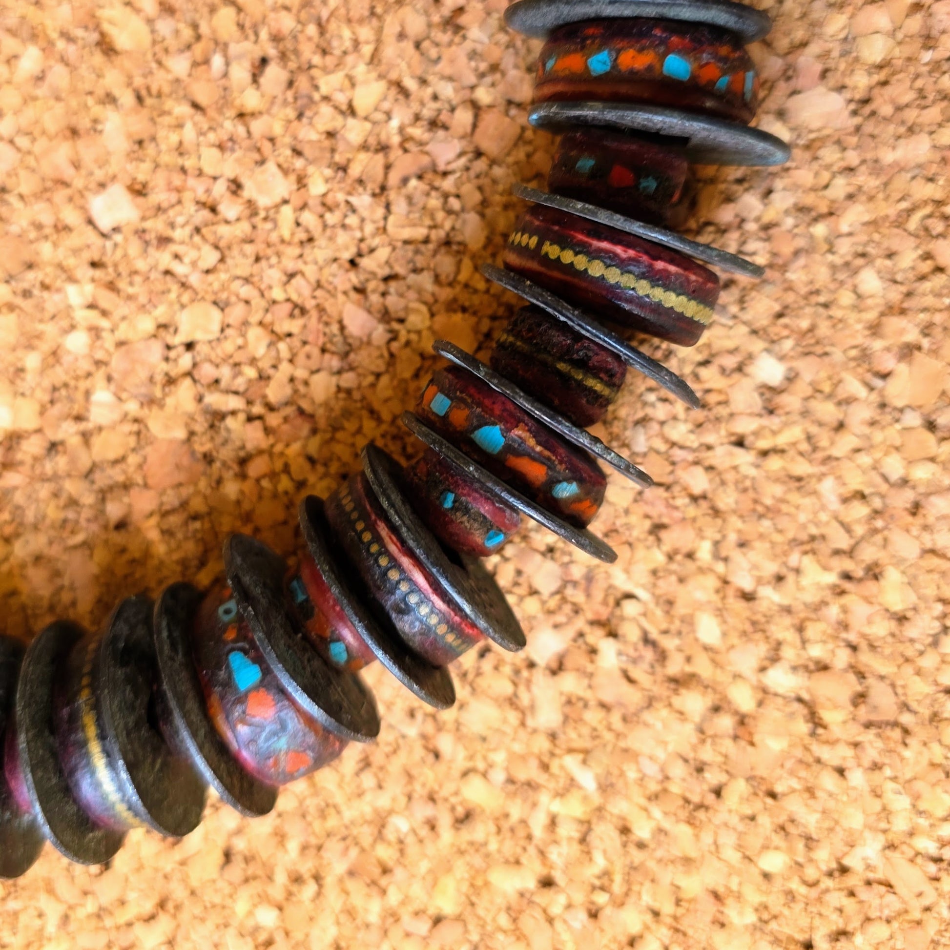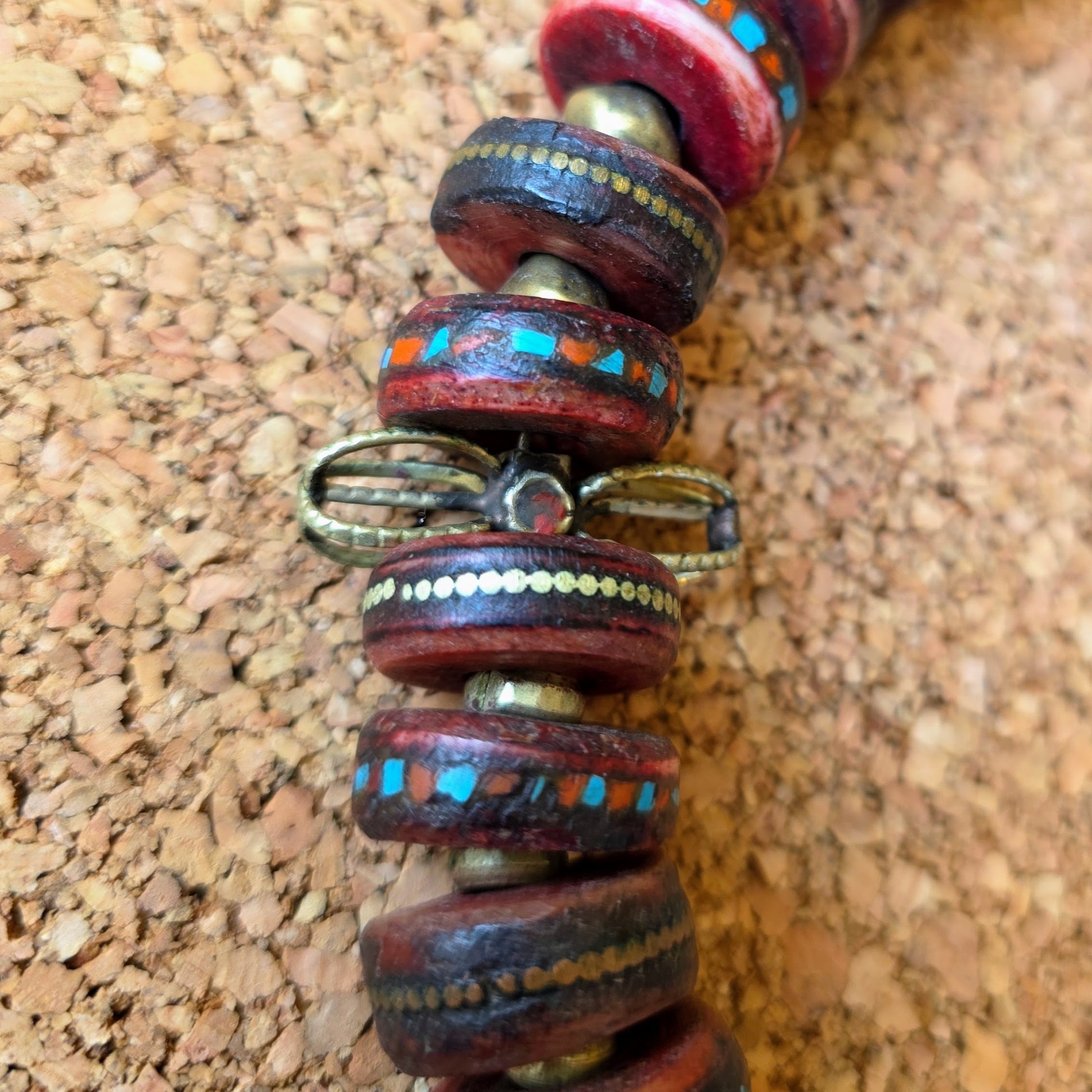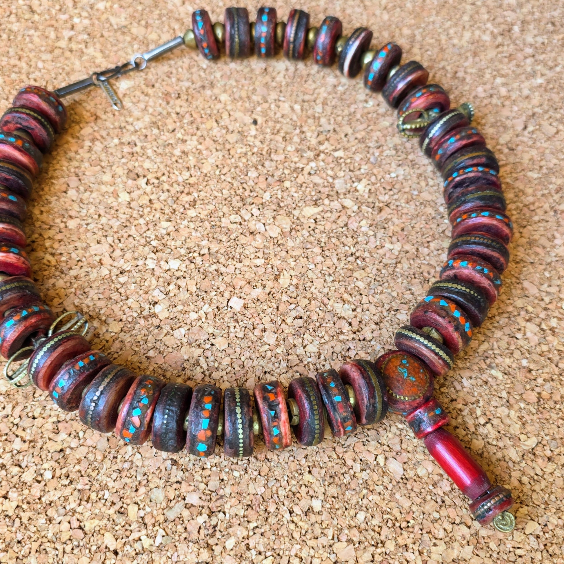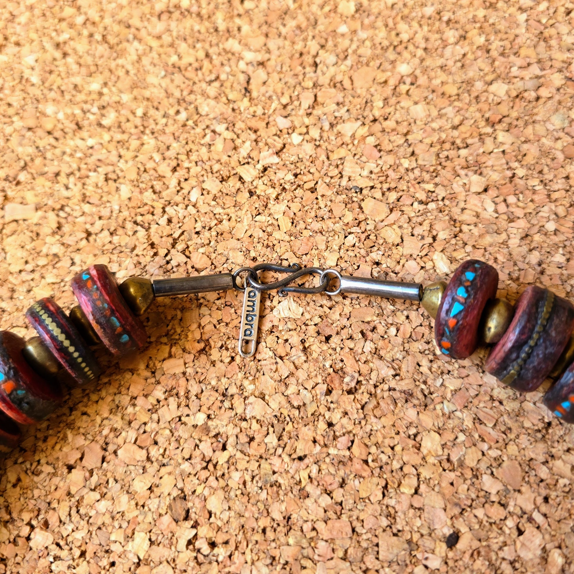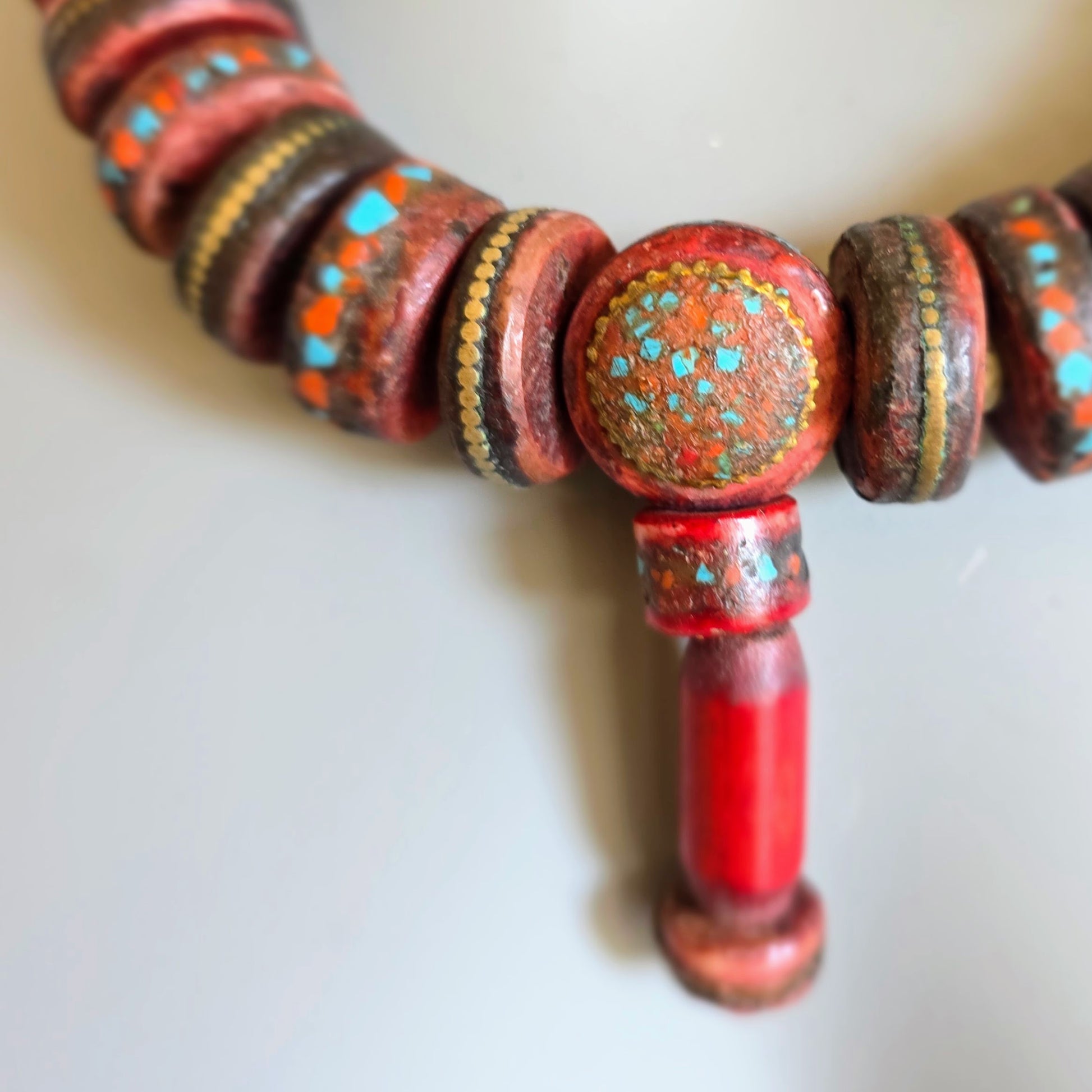 Handgearbeitete Unikat- Halskette mit nepalesischen Beinperlen mit Intarsien aus nepalesischen Gebets-Malas und nepalesischen Bronzeperlen mit oxidiertem Silberverschluss von ambra Schmuck.