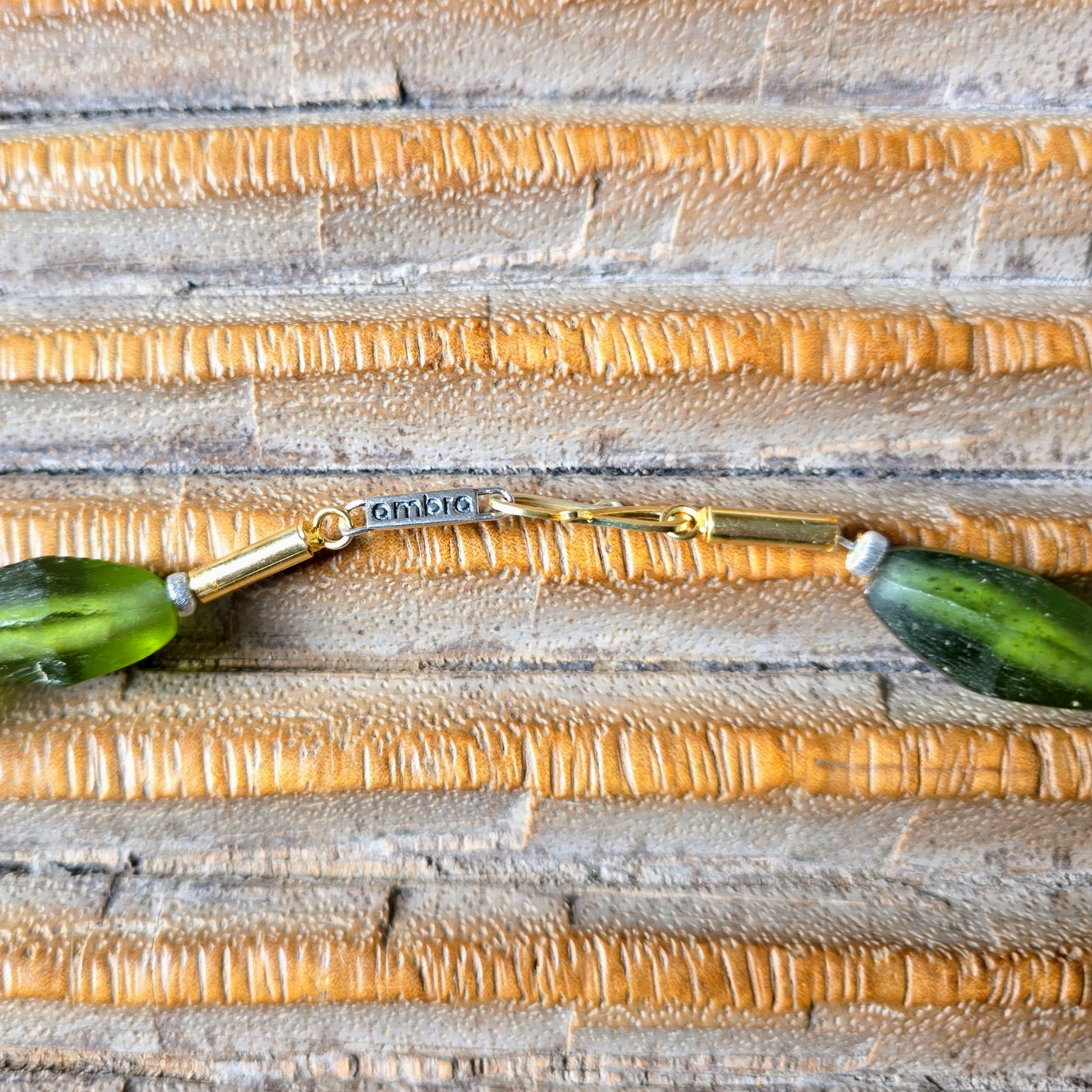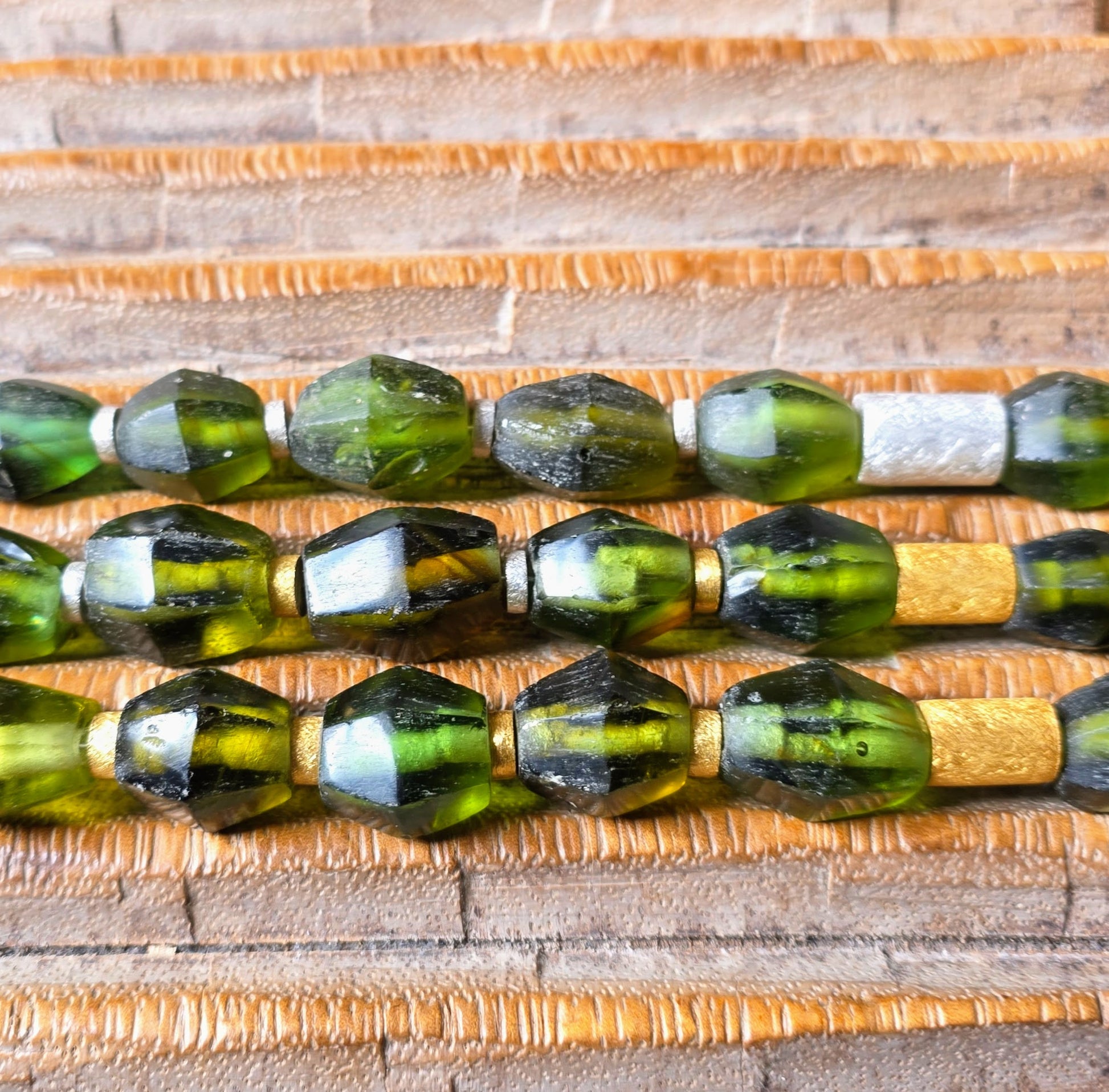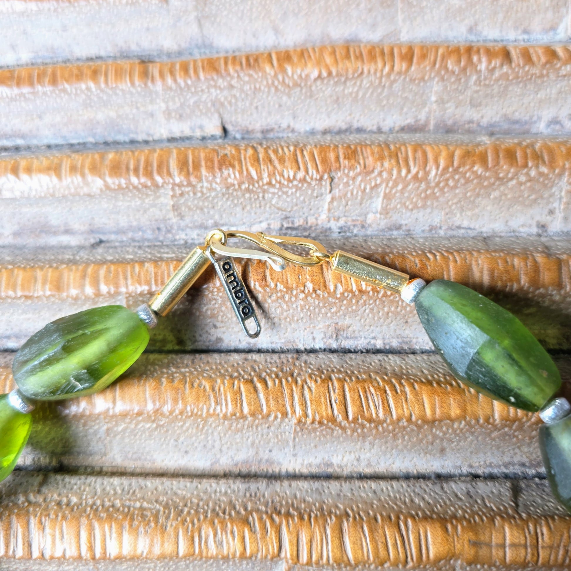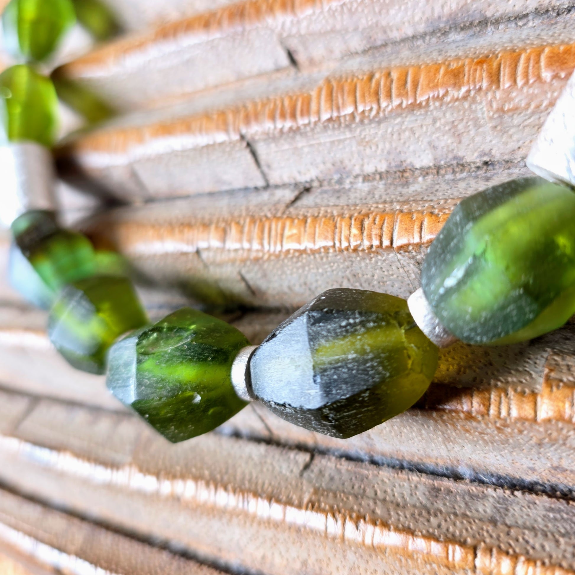- Nachhaltige Materialien: Facettierte Perlen aus indonesischem Recyclingglas (Java) in sattem Grün.