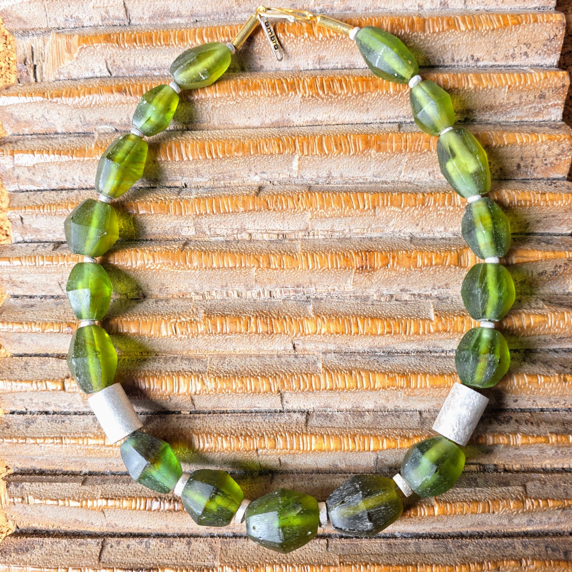 Handgearbeitete Unikat- Halskette mit smaragdgrünen facettierten Recyclingglasperlen aus Java und matten Silberperlen mit vergoldetem Silberverschluss von ambra Schmuck.