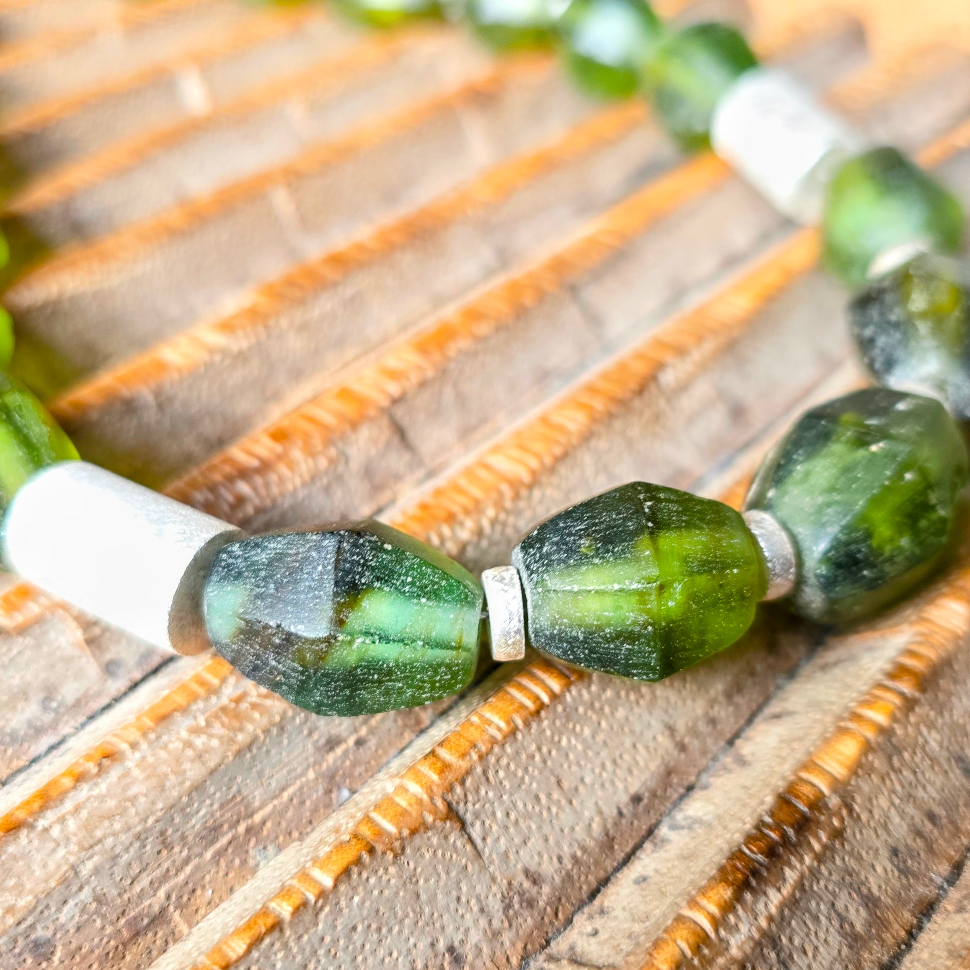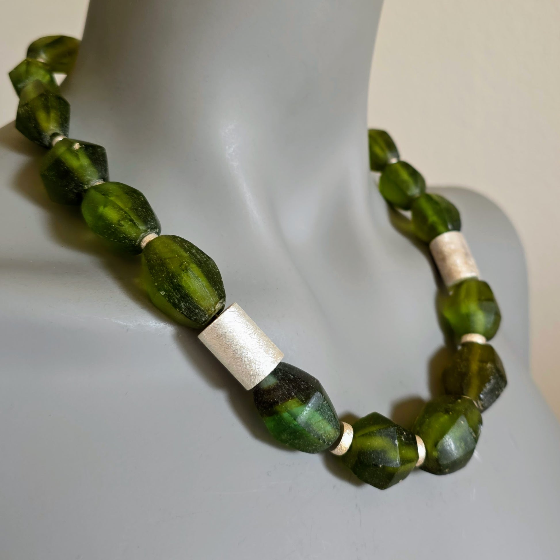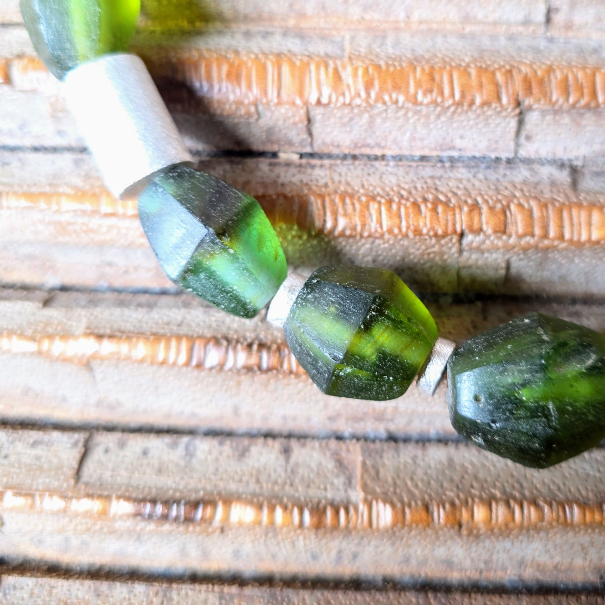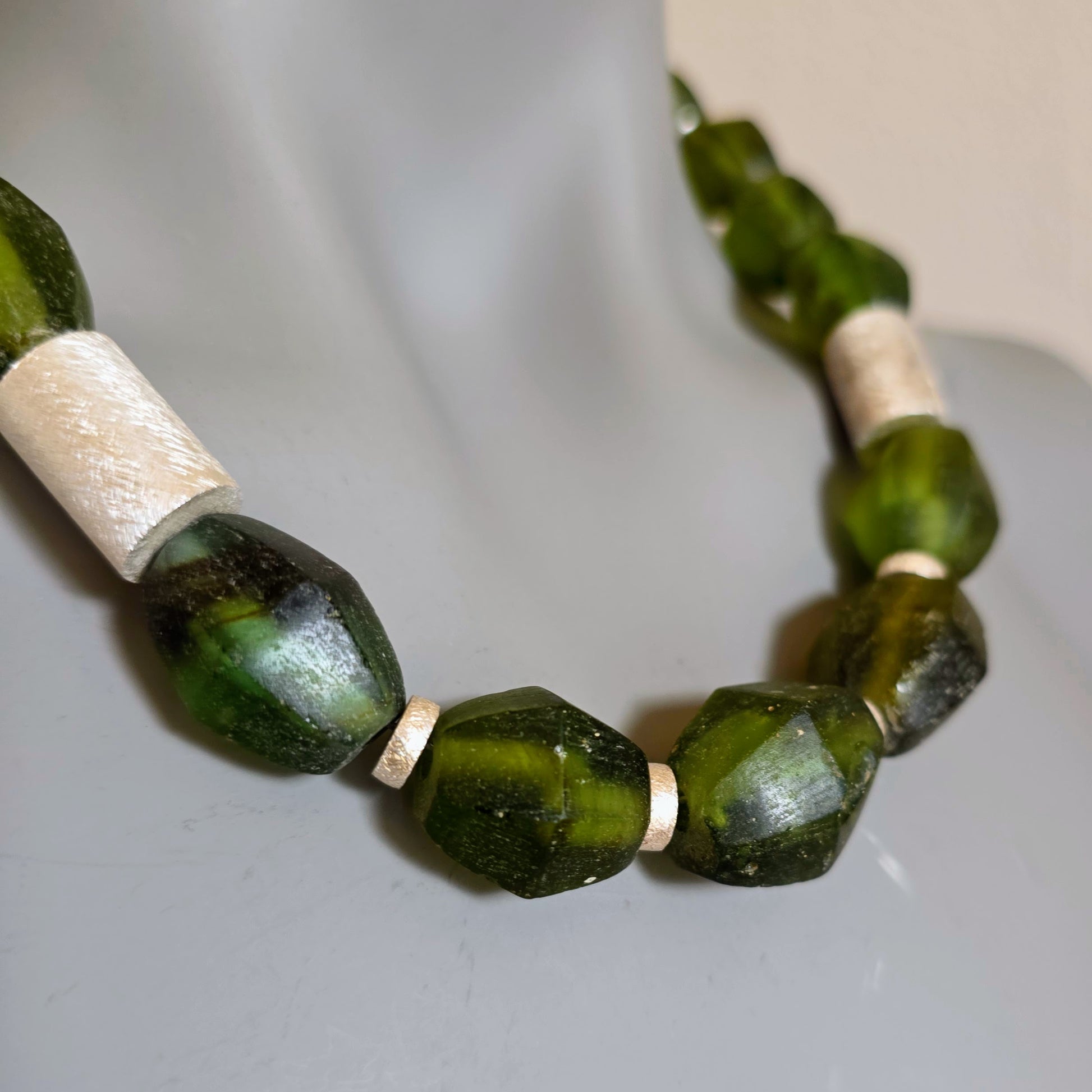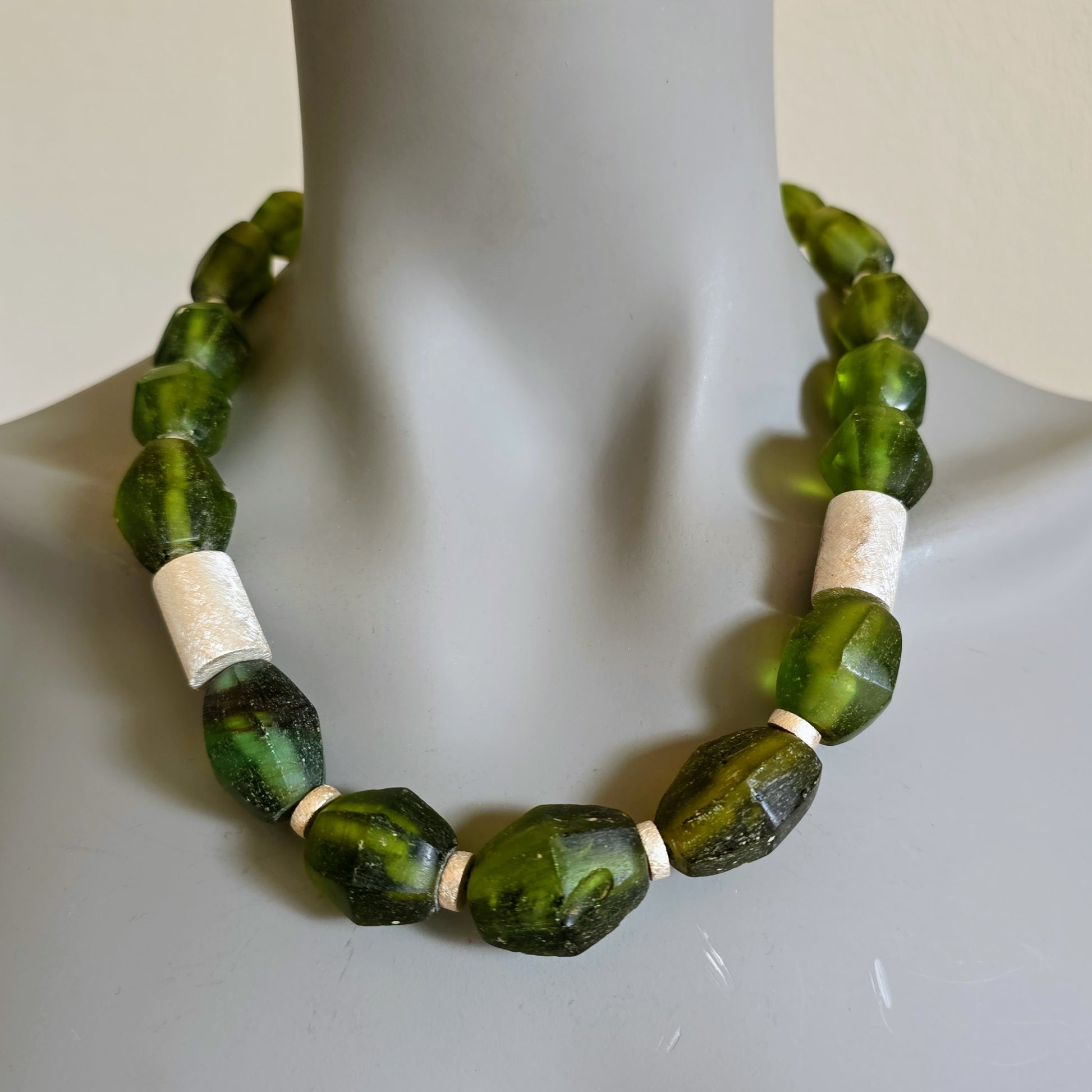 Suchen Sie ein Geschenk mit Bedeutung? Diese Kette verbindet Eco-Friendly Fashion mit hochwertigem Goldschmiedekunst-Charakter. Das matte Finish der Silberperlen bildet einen edlen Kontrast zum organischen Grün des Glases – ein Blickfang für Frauen, die das Besondere suchen.