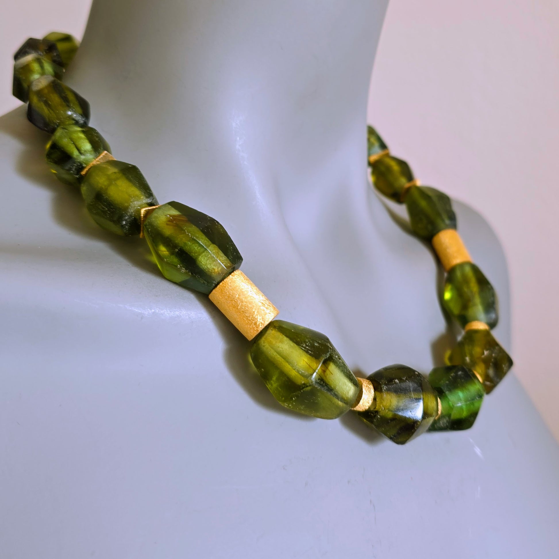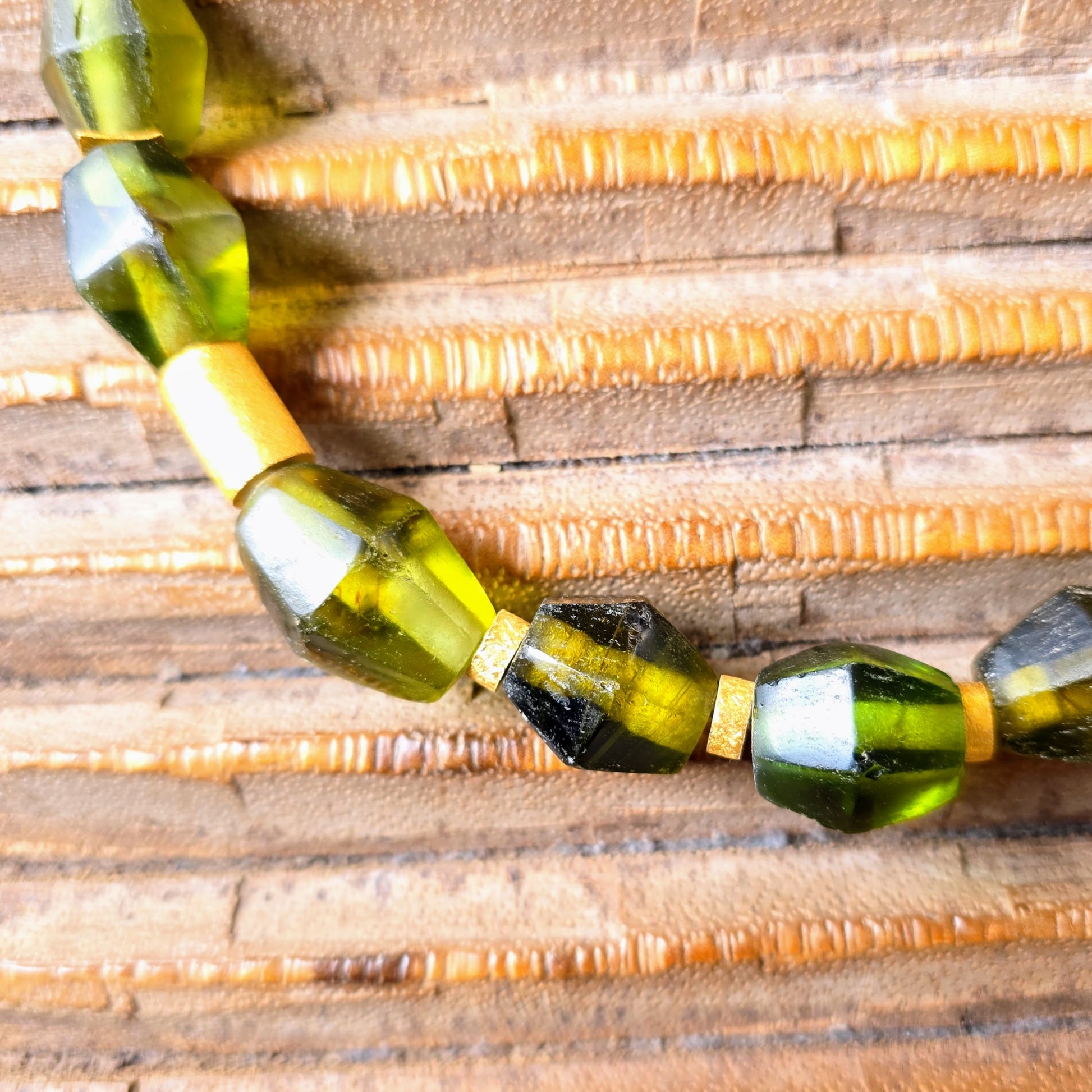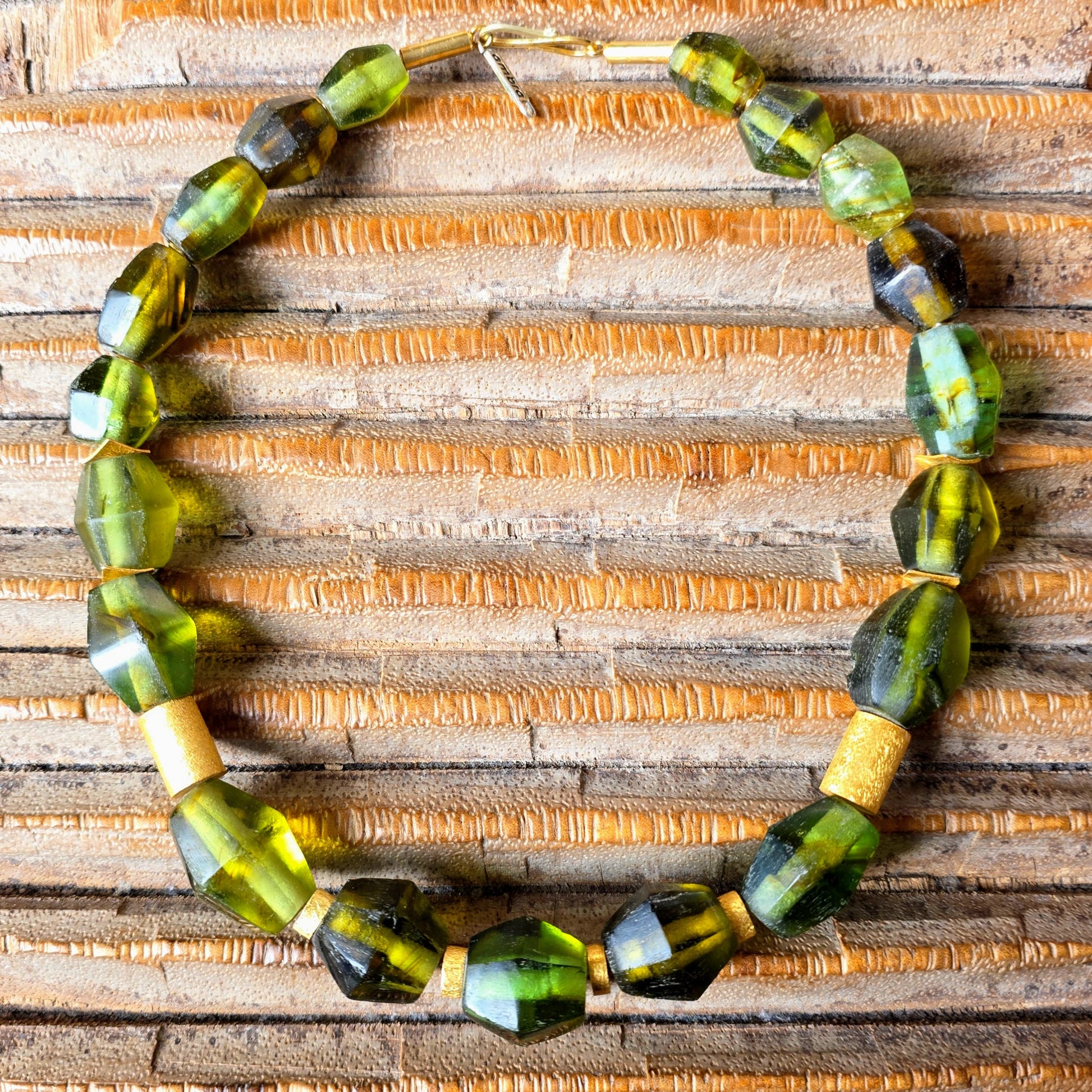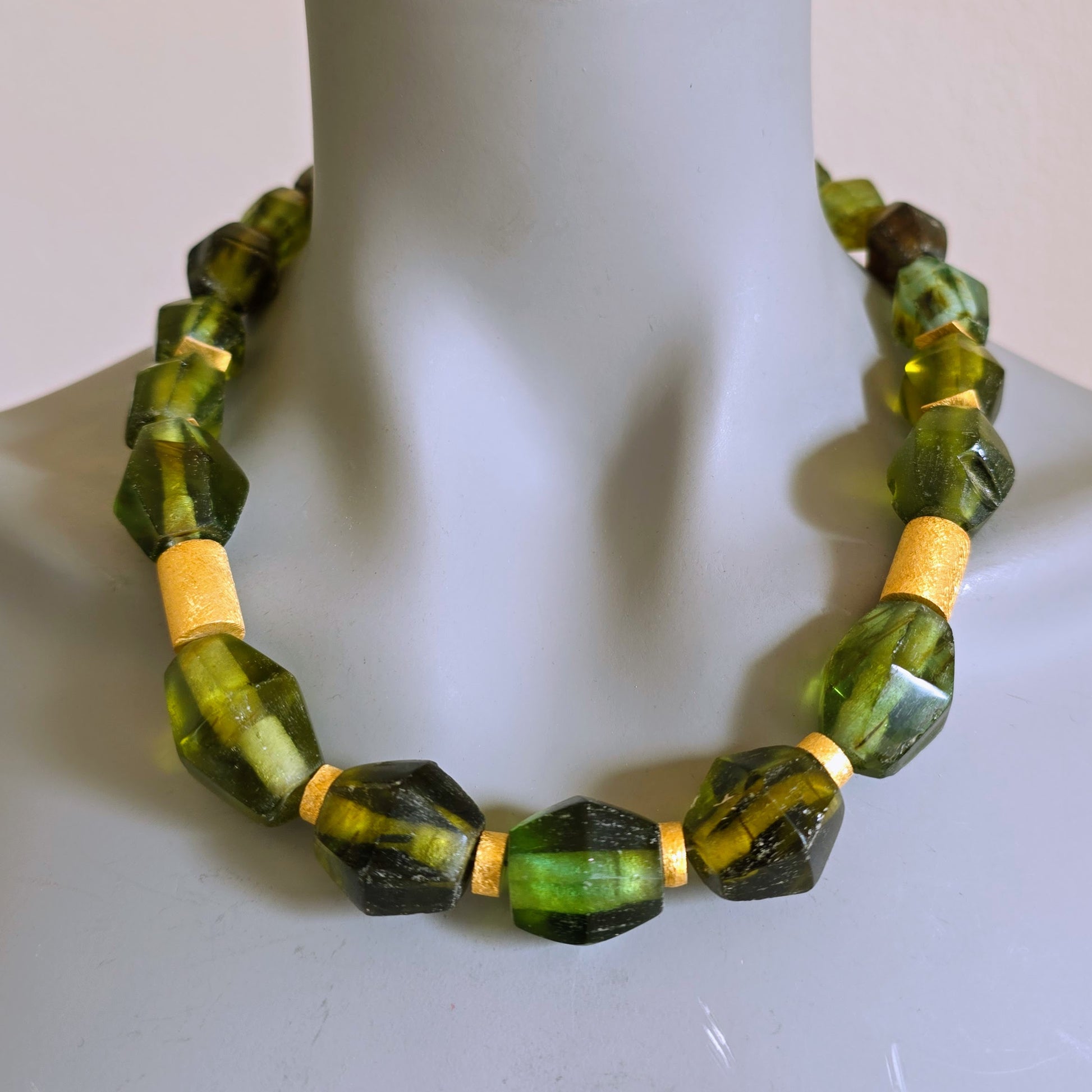 Handgearbeitete Unikat- Halskette mit smaragdgrünen facettierten Recyclingglasperlen aus Java und matten vergoldeten Silberperlen mit vergoldetem Silberverschluss von ambra Schmuck.