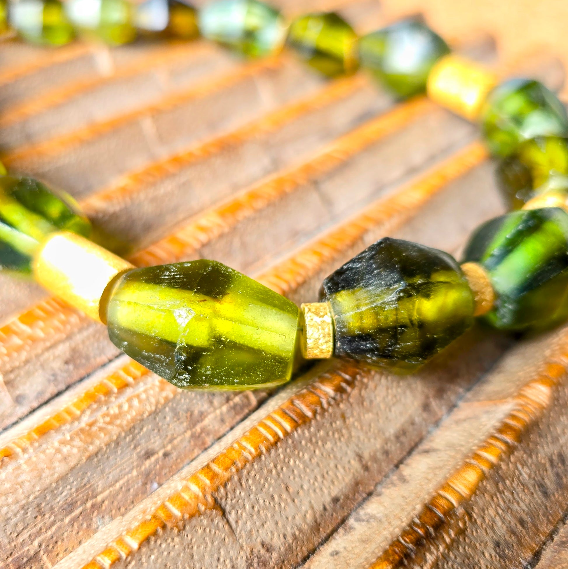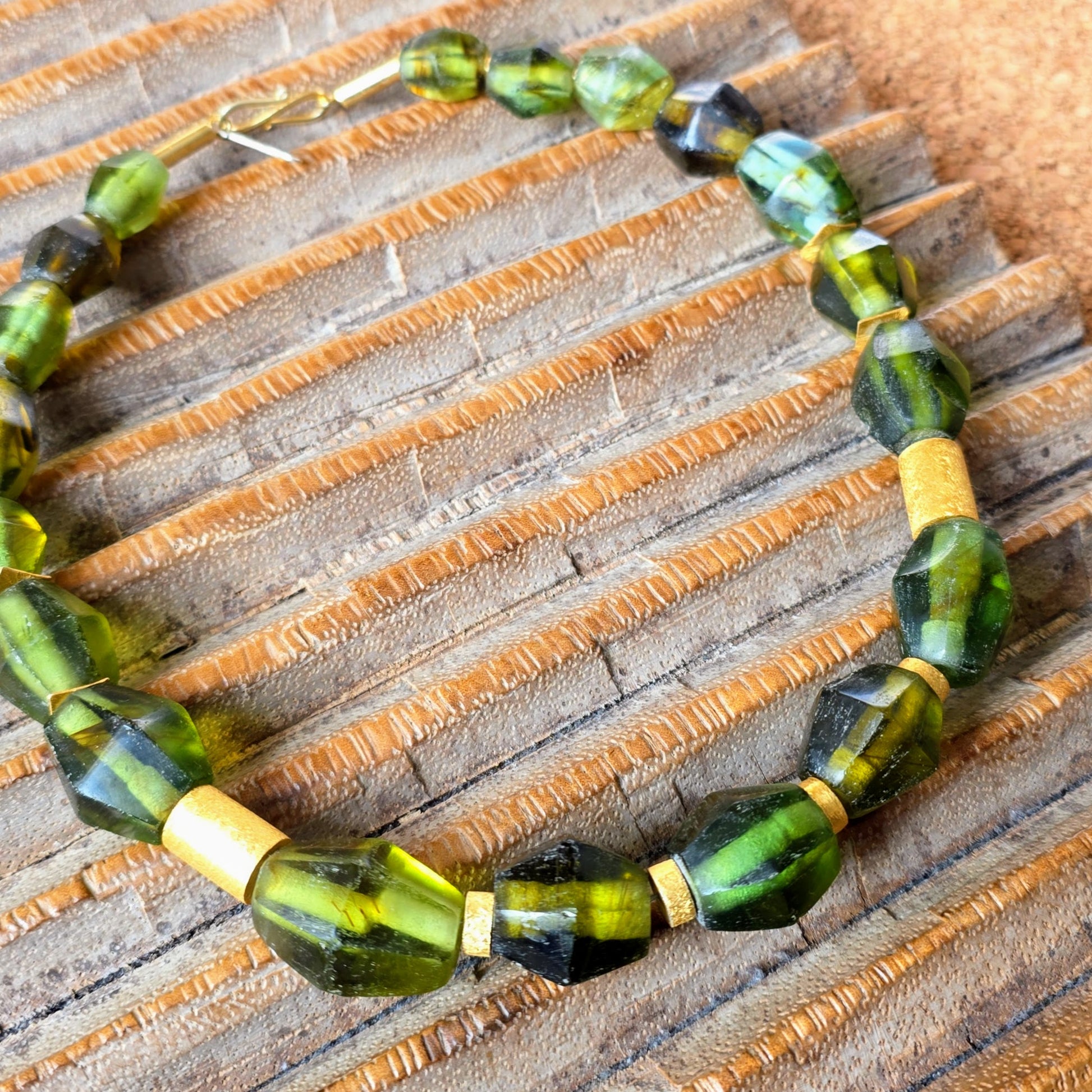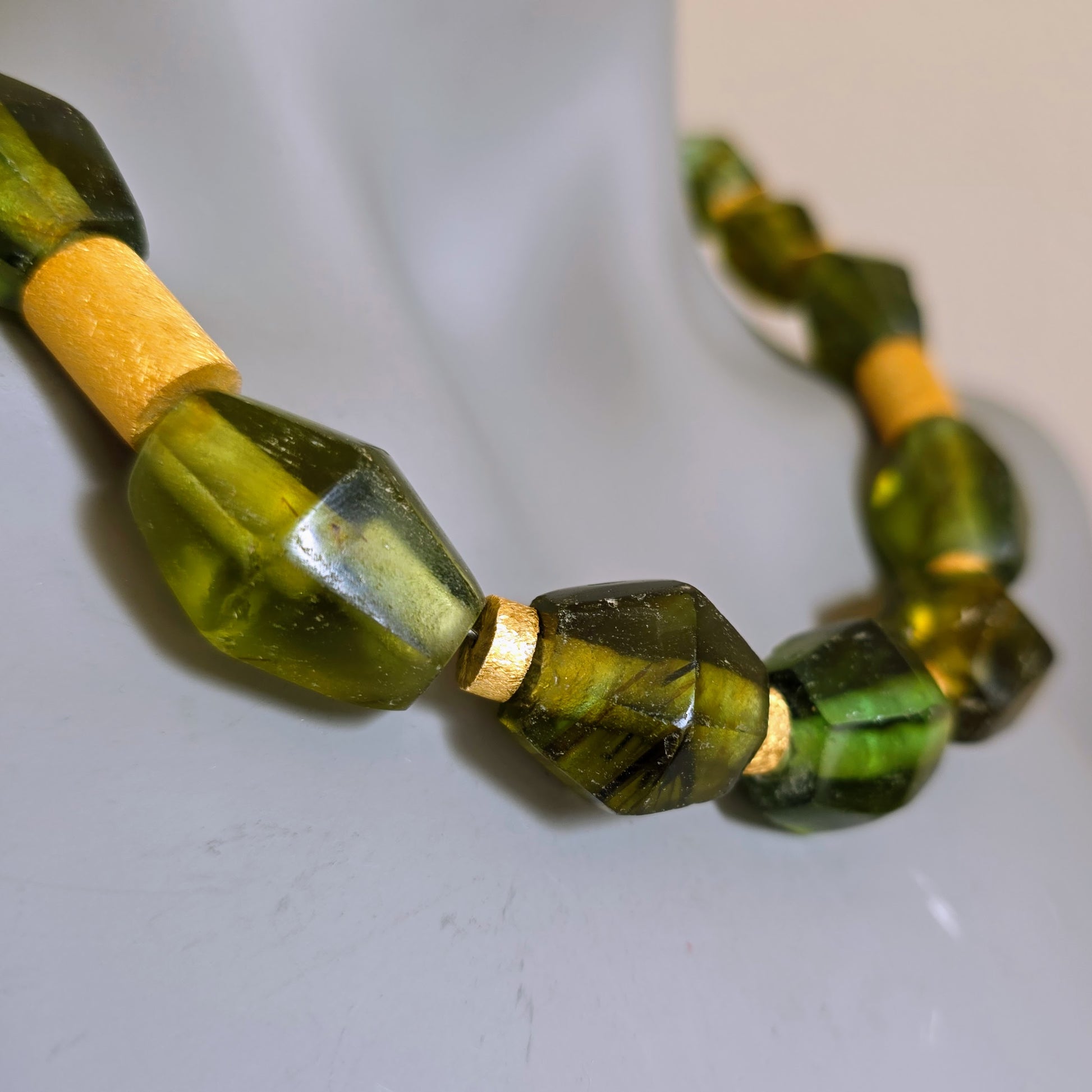 Handgearbeitete Unikat- Halskette mit smaragdgrünen facettierten Recyclingglasperlen aus Java und matten vergoldeten Silberperlen mit vergoldetem Silberverschluss von ambra Schmuck.