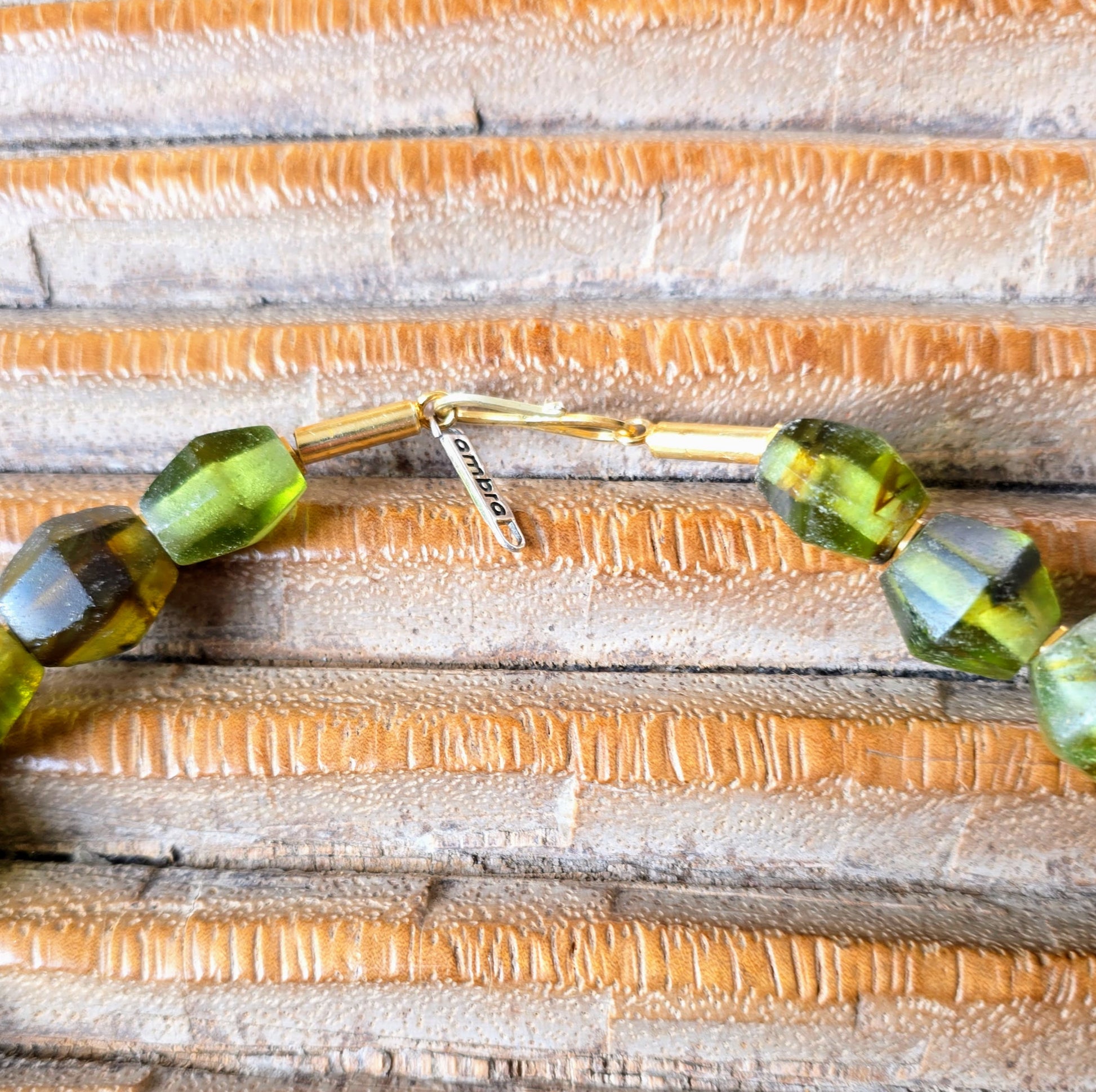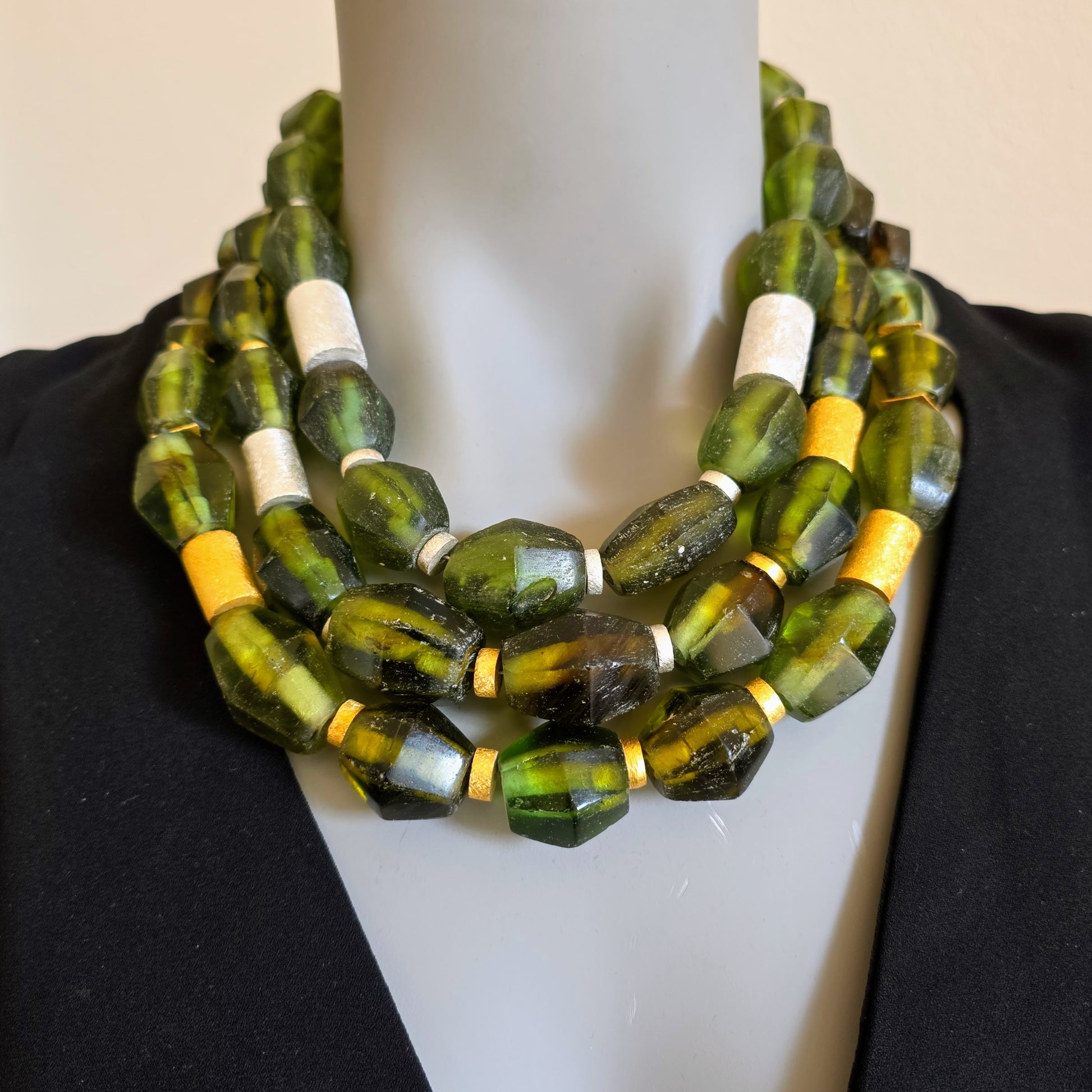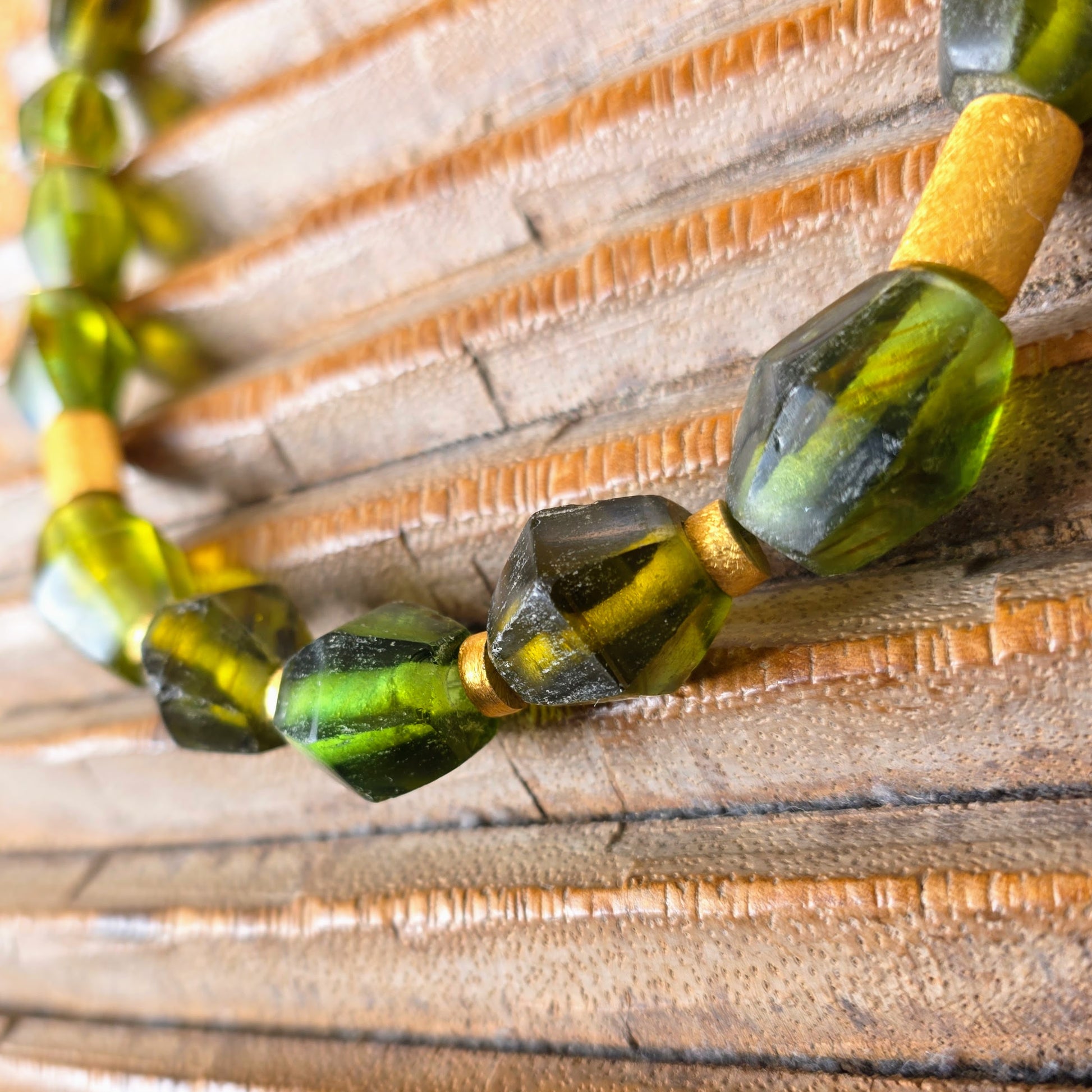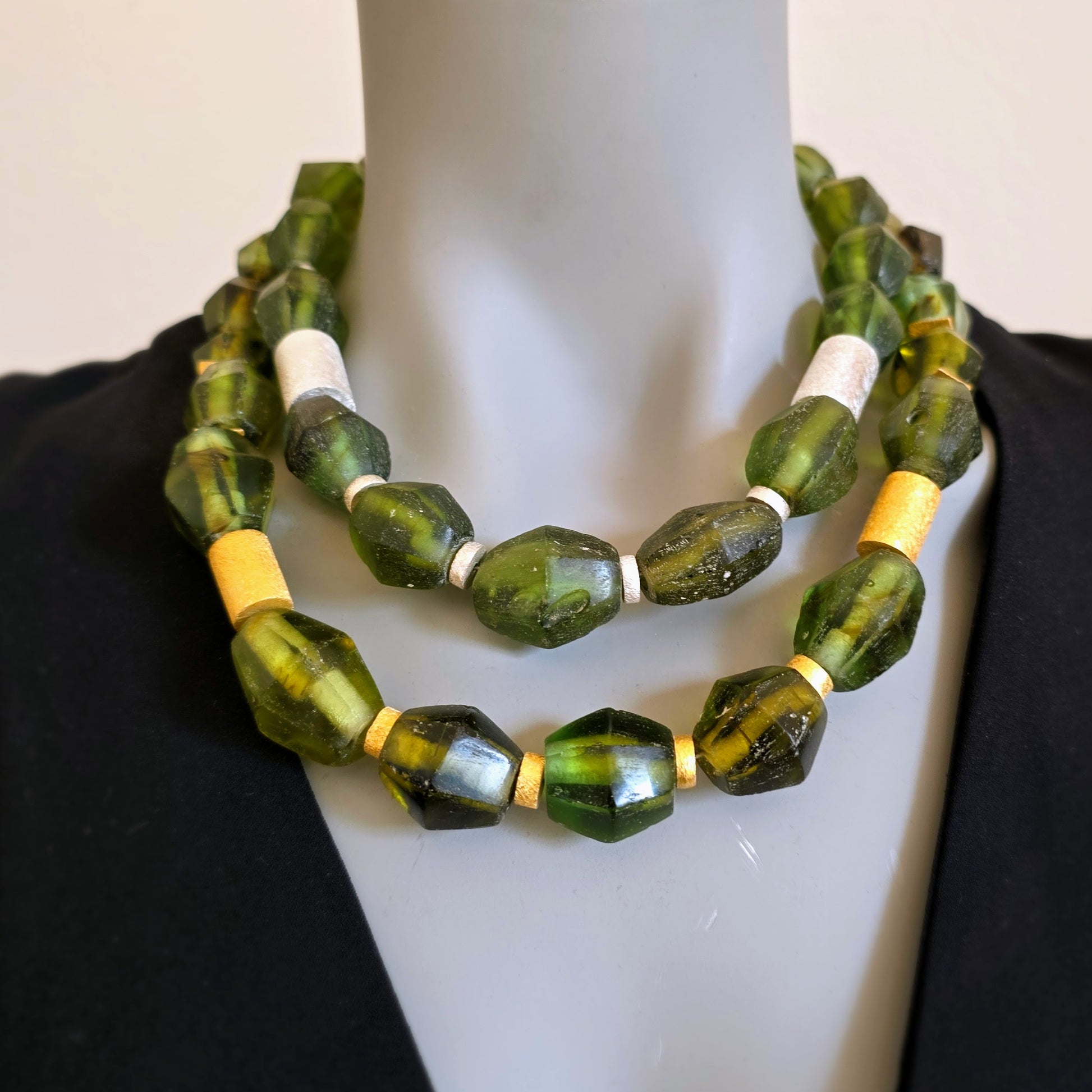 Handgearbeitete Unikat- Halskette mit smaragdgrünen facettierten Recyclingglasperlen aus Java und matten vergoldeten Silberperlen mit vergoldetem Silberverschluss von ambra Schmuck.
