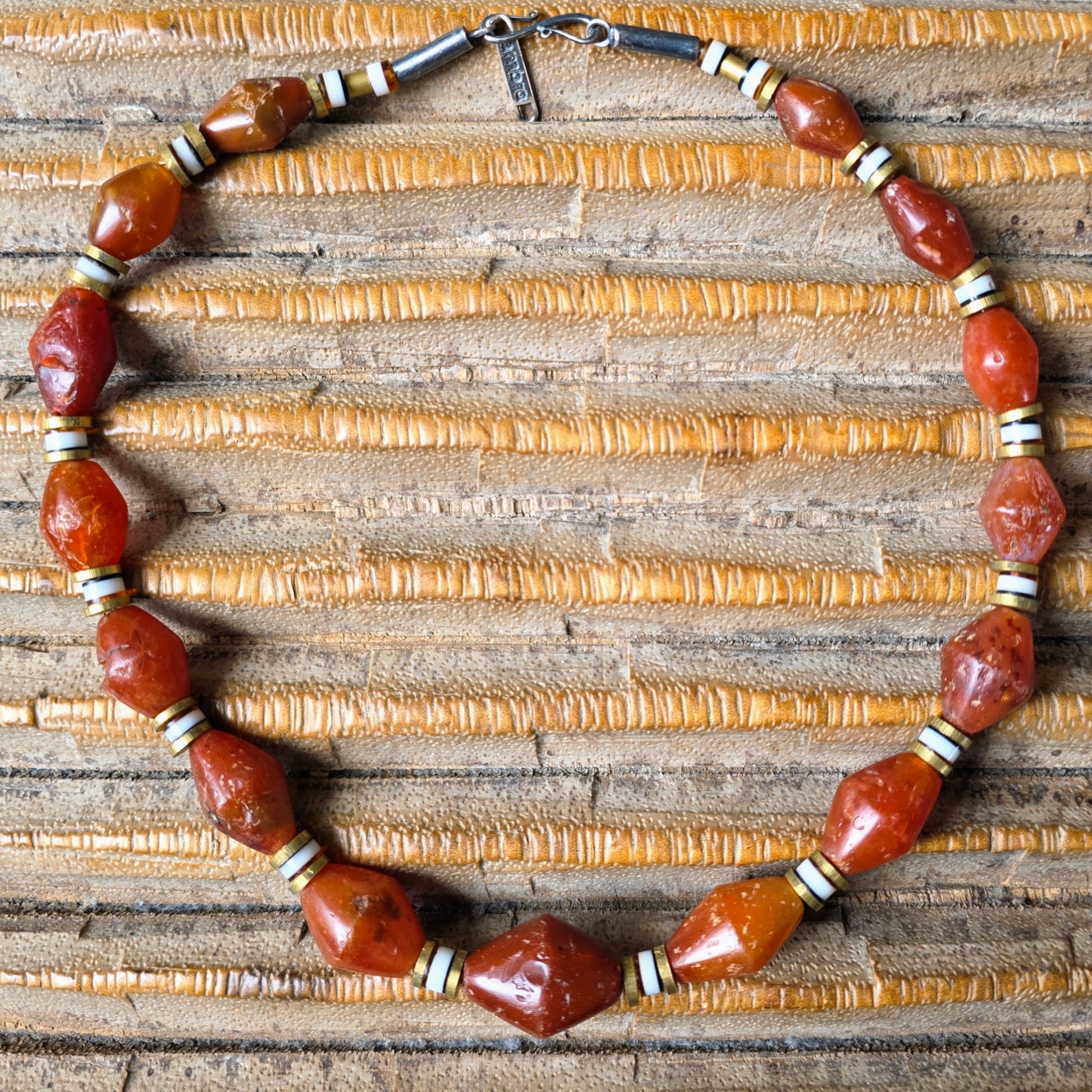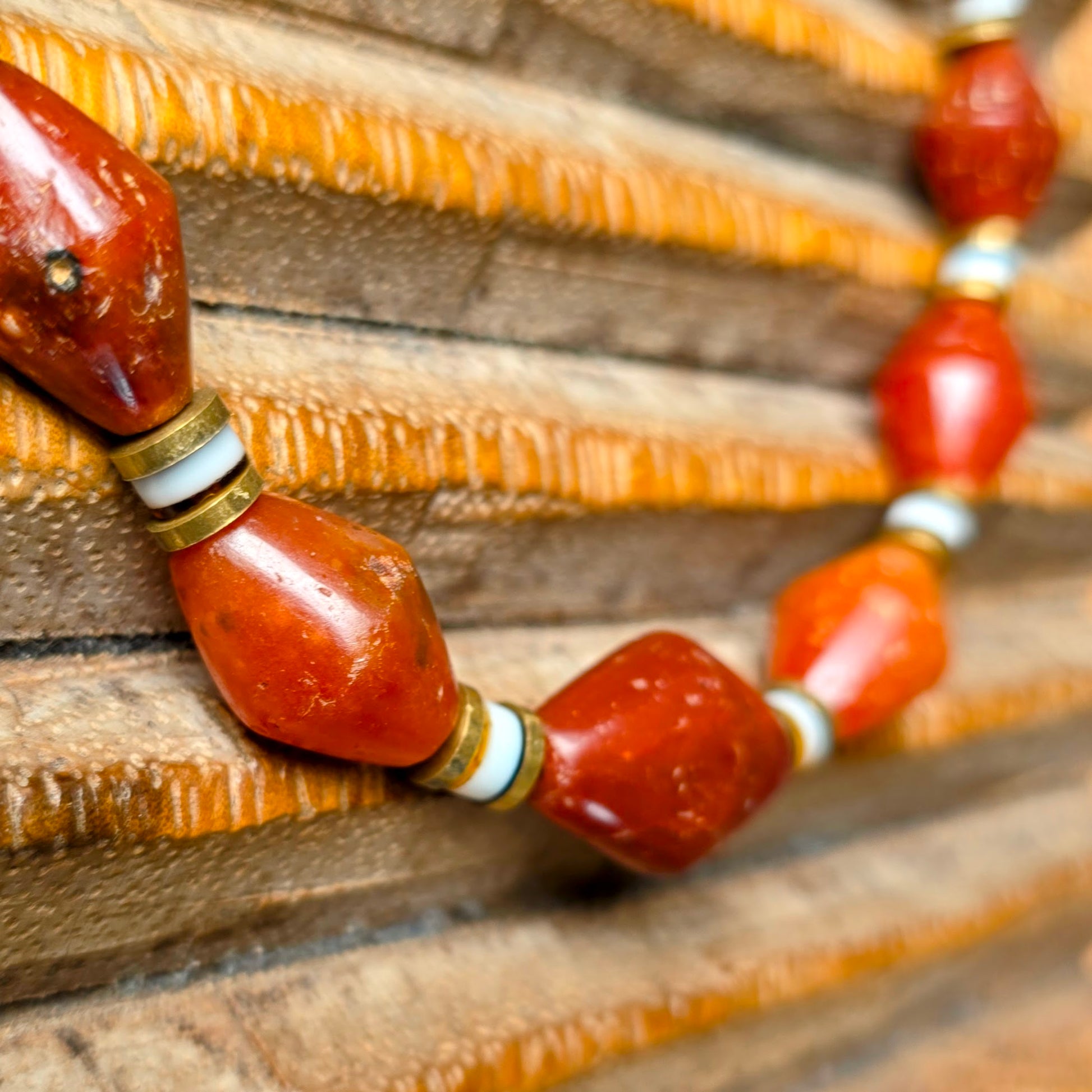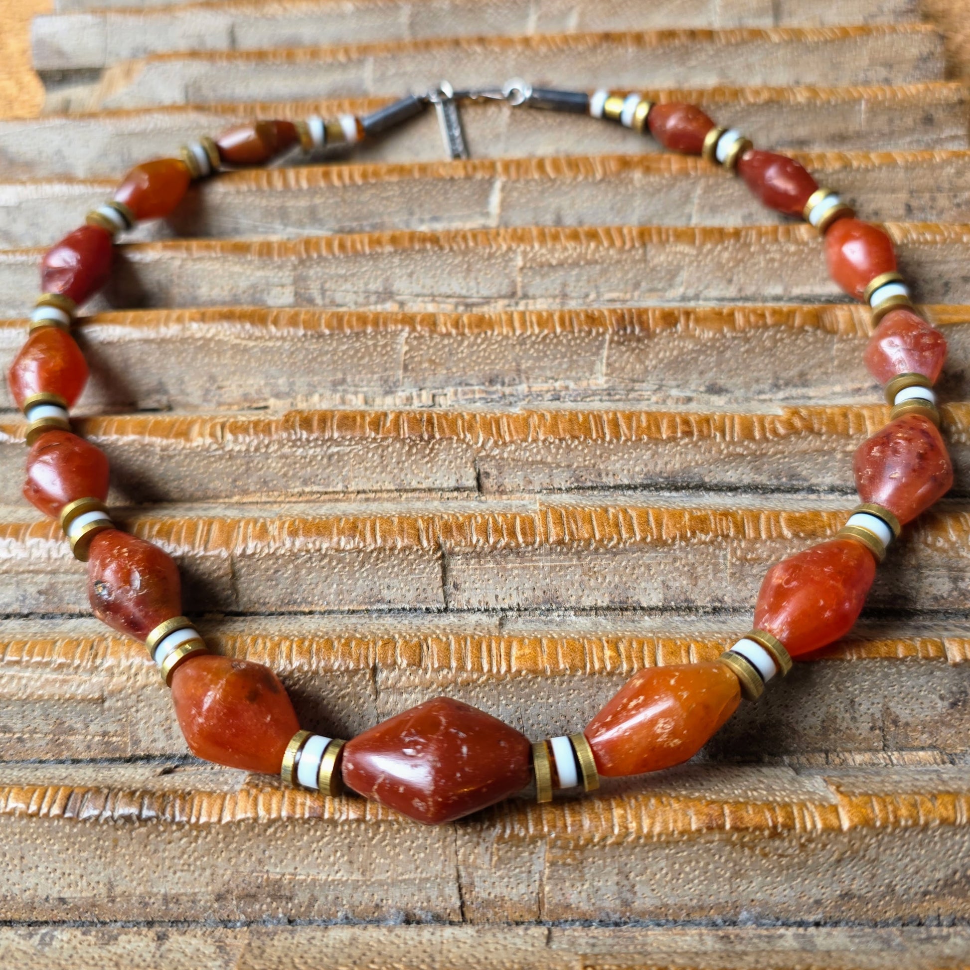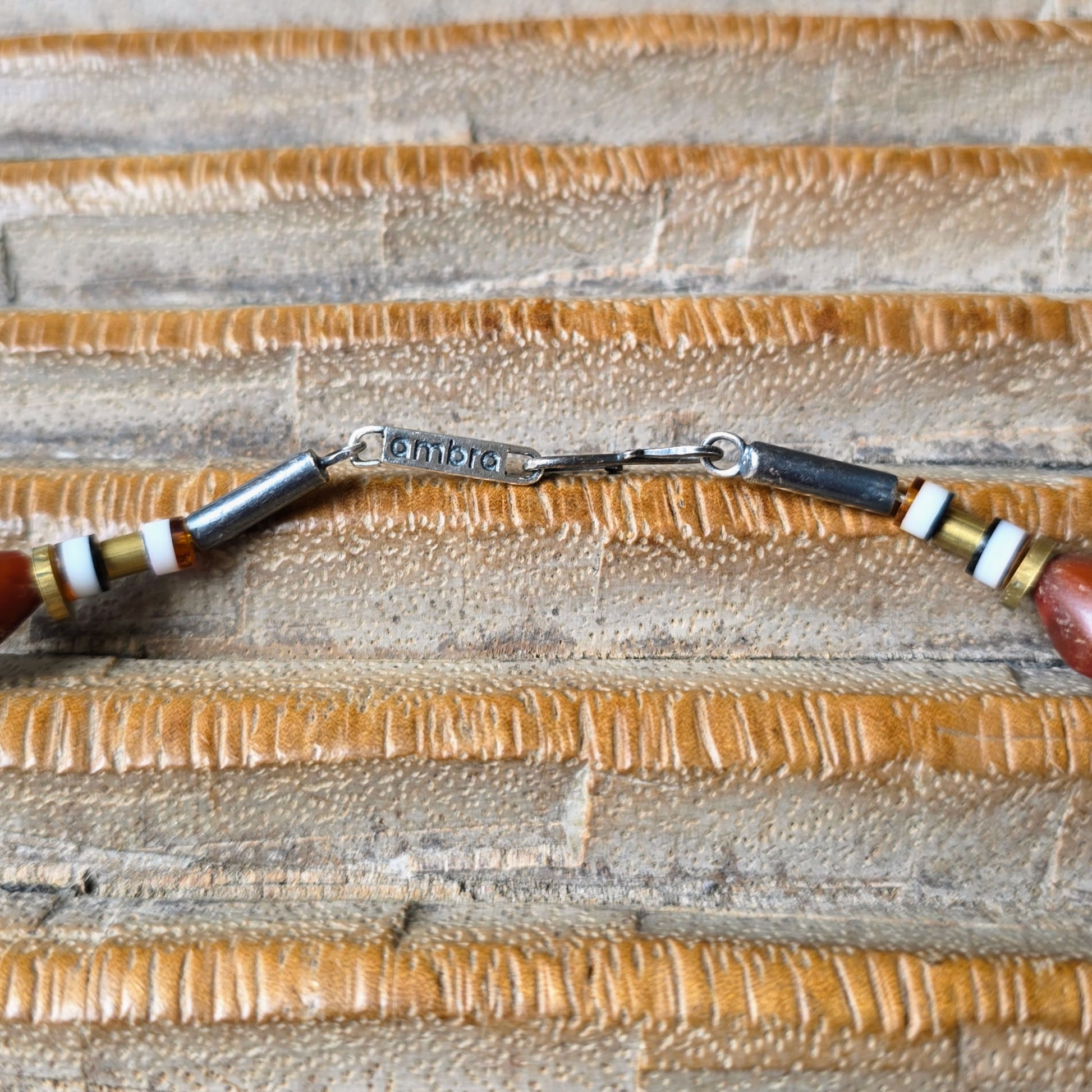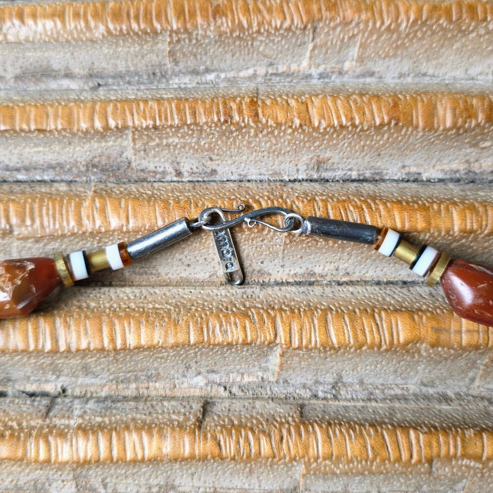 Handgearbeitete Kette mit afrikanischen Karneolsteinen, weißen Achatsteinen und Bronzeperlen mit oxidiertem Silberverschluss von ambra Schmuck.