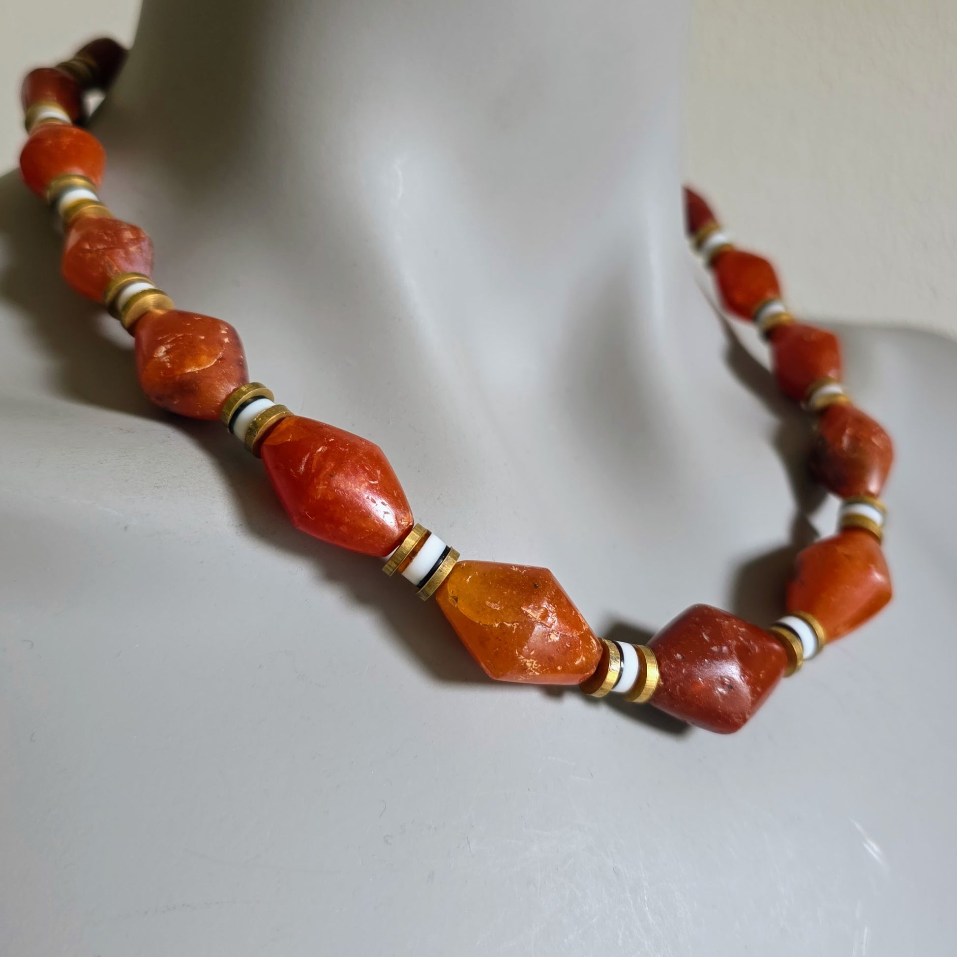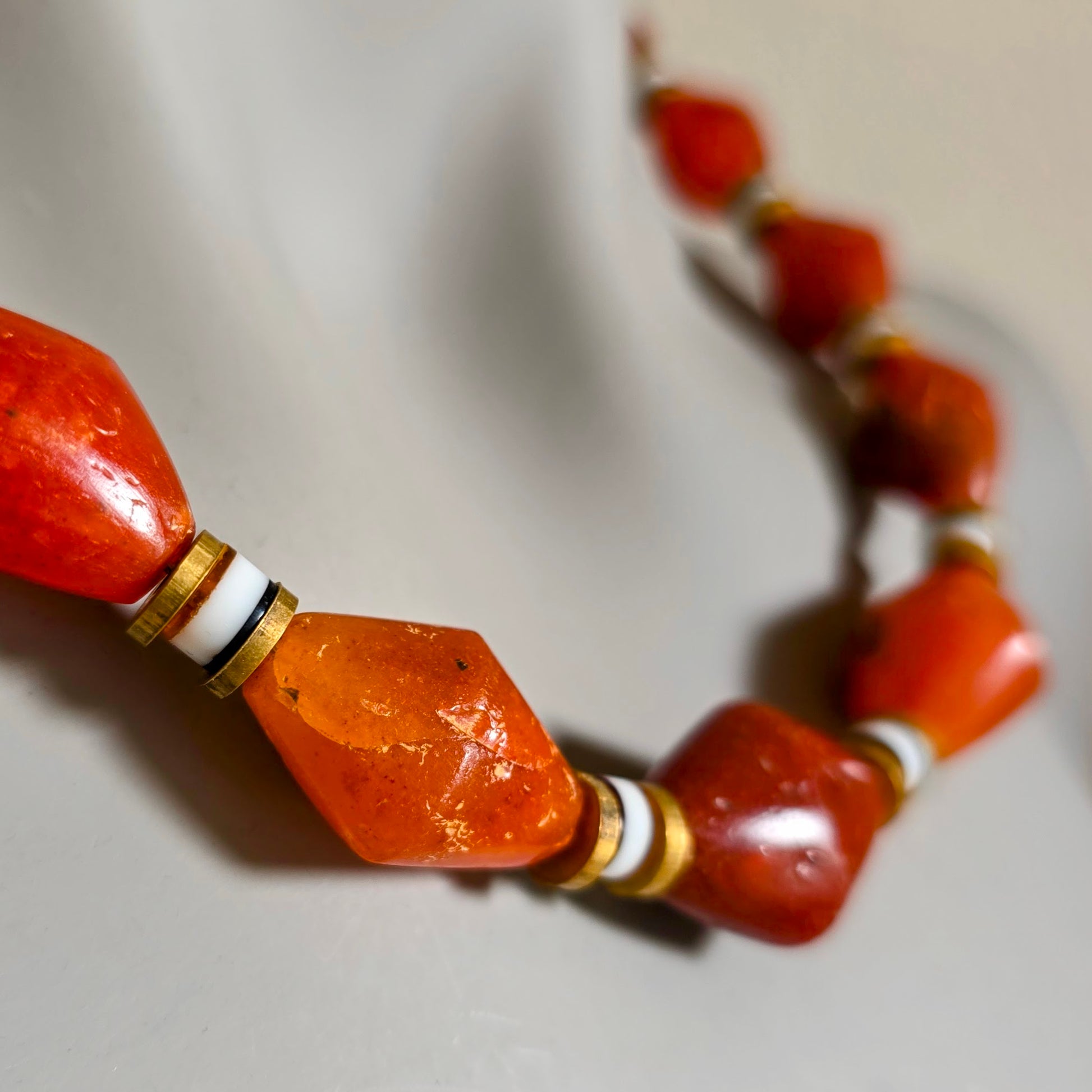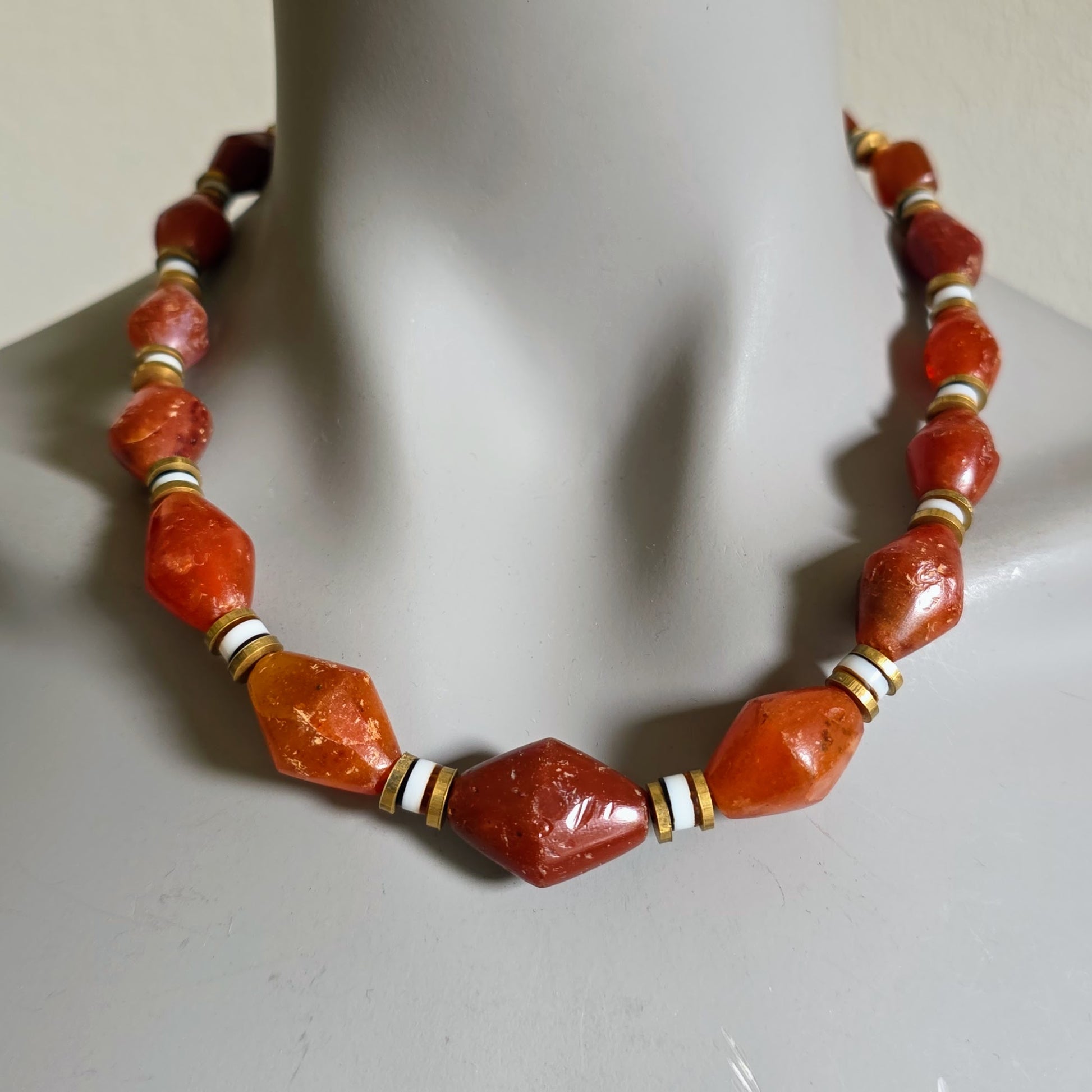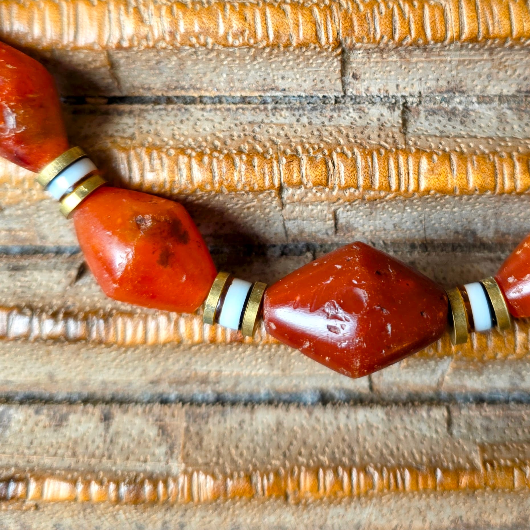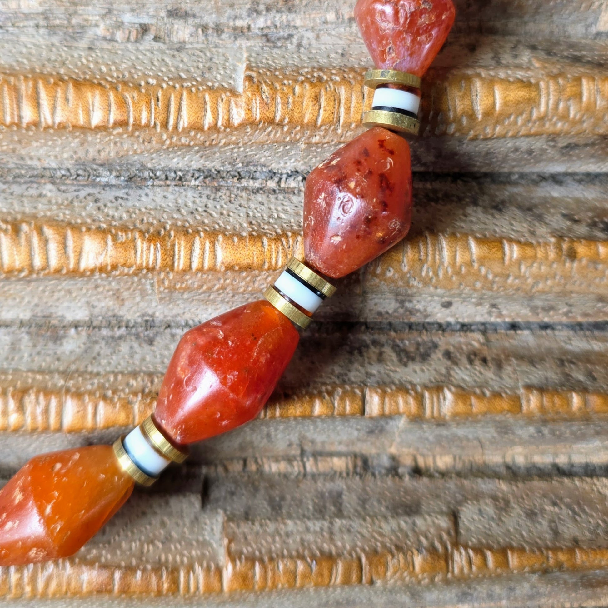 Handgearbeitete Kette mit afrikanischen Karneolsteinen, weißen Achatsteinen und Bronzeperlen mit oxidiertem Silberverschluss von ambra Schmuck.