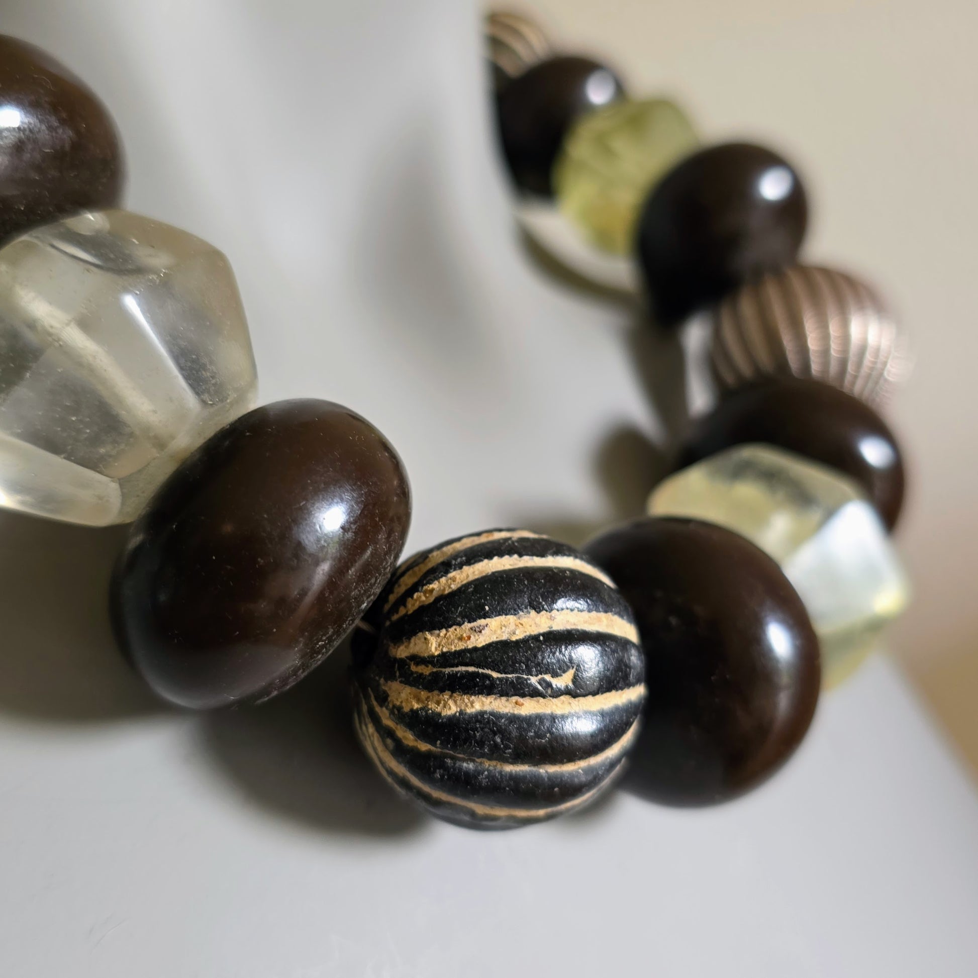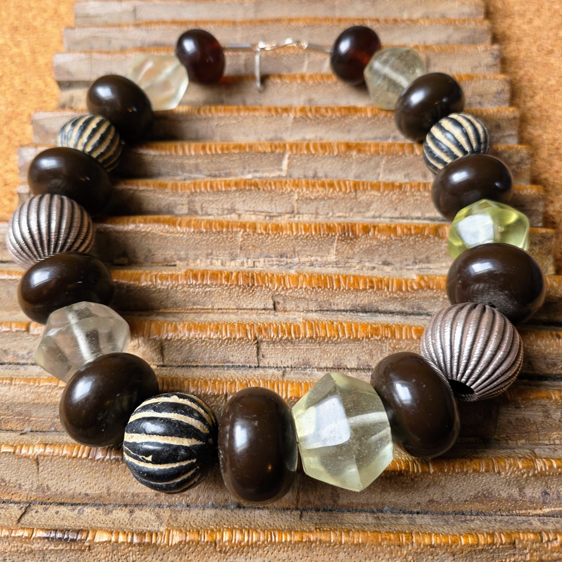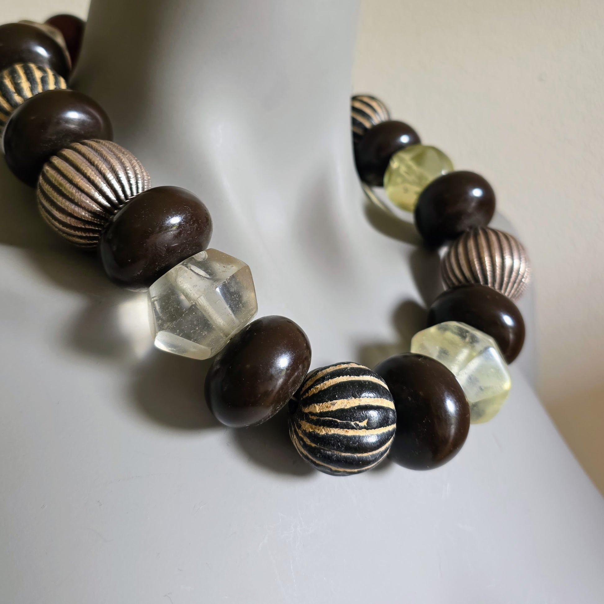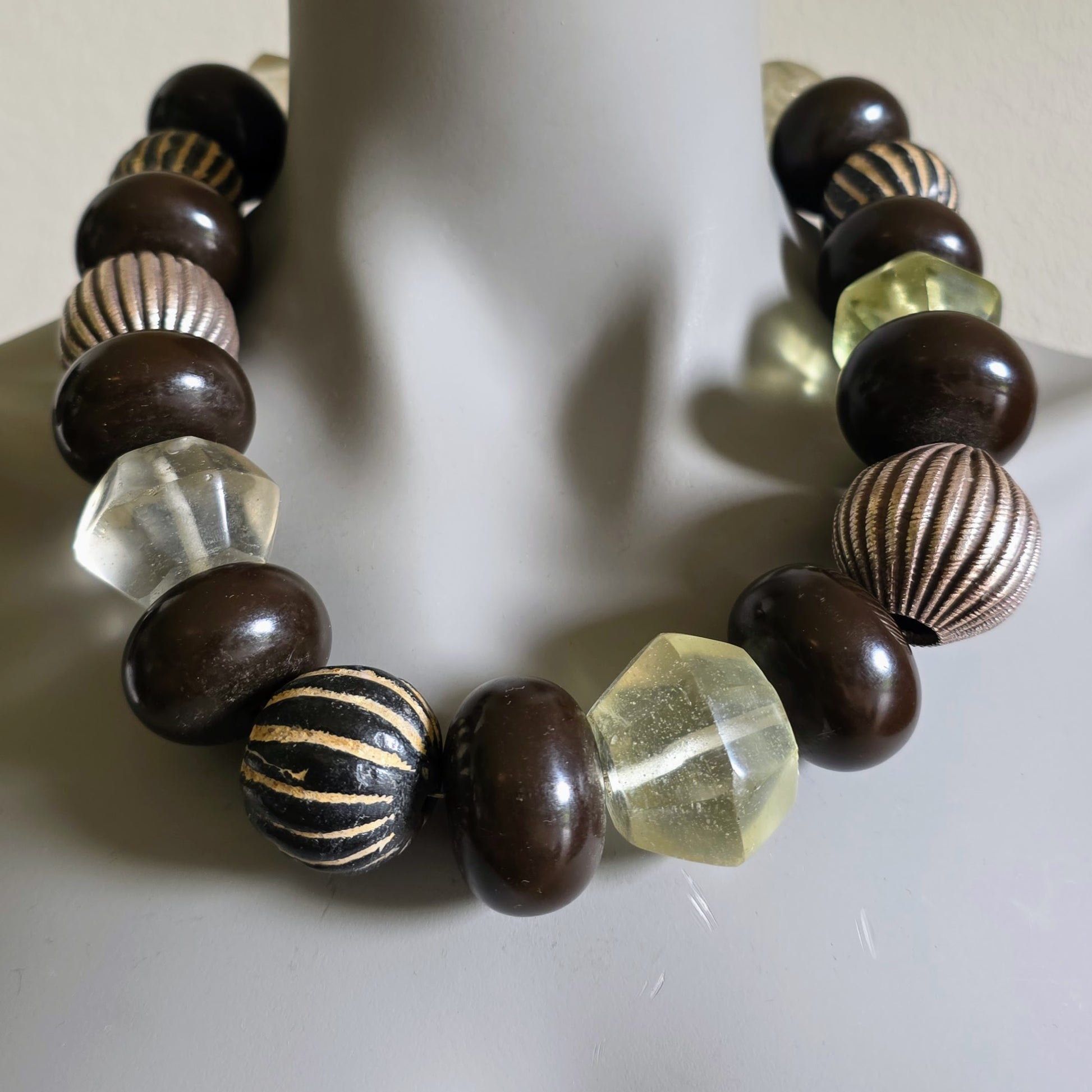 Handgearbeitete Halskette mit Harz- und Glasperlen aus Indonesien, großen burmesischen Silberperlen und Tonperlen aus Afrika mit Silberverschluss von ambra Schmuck.