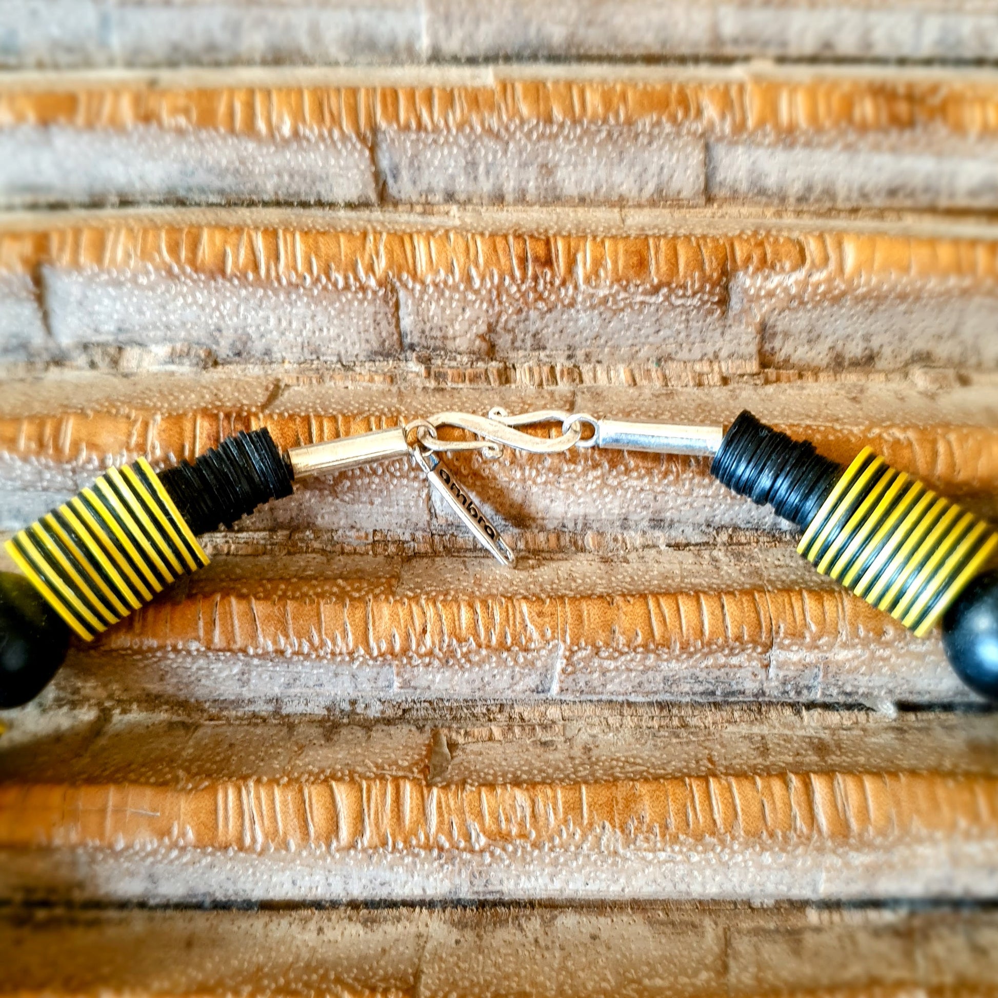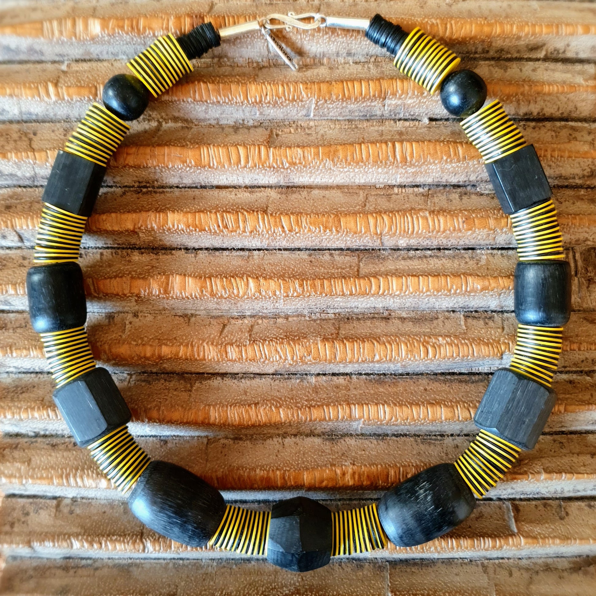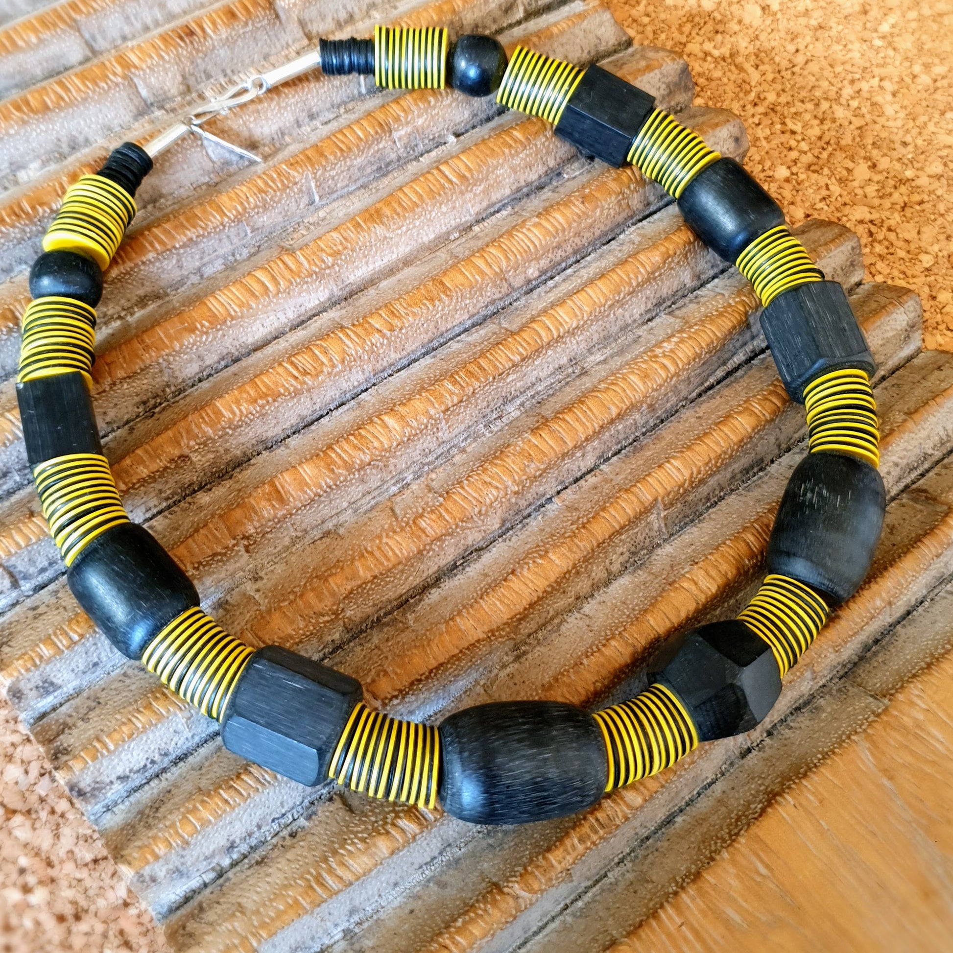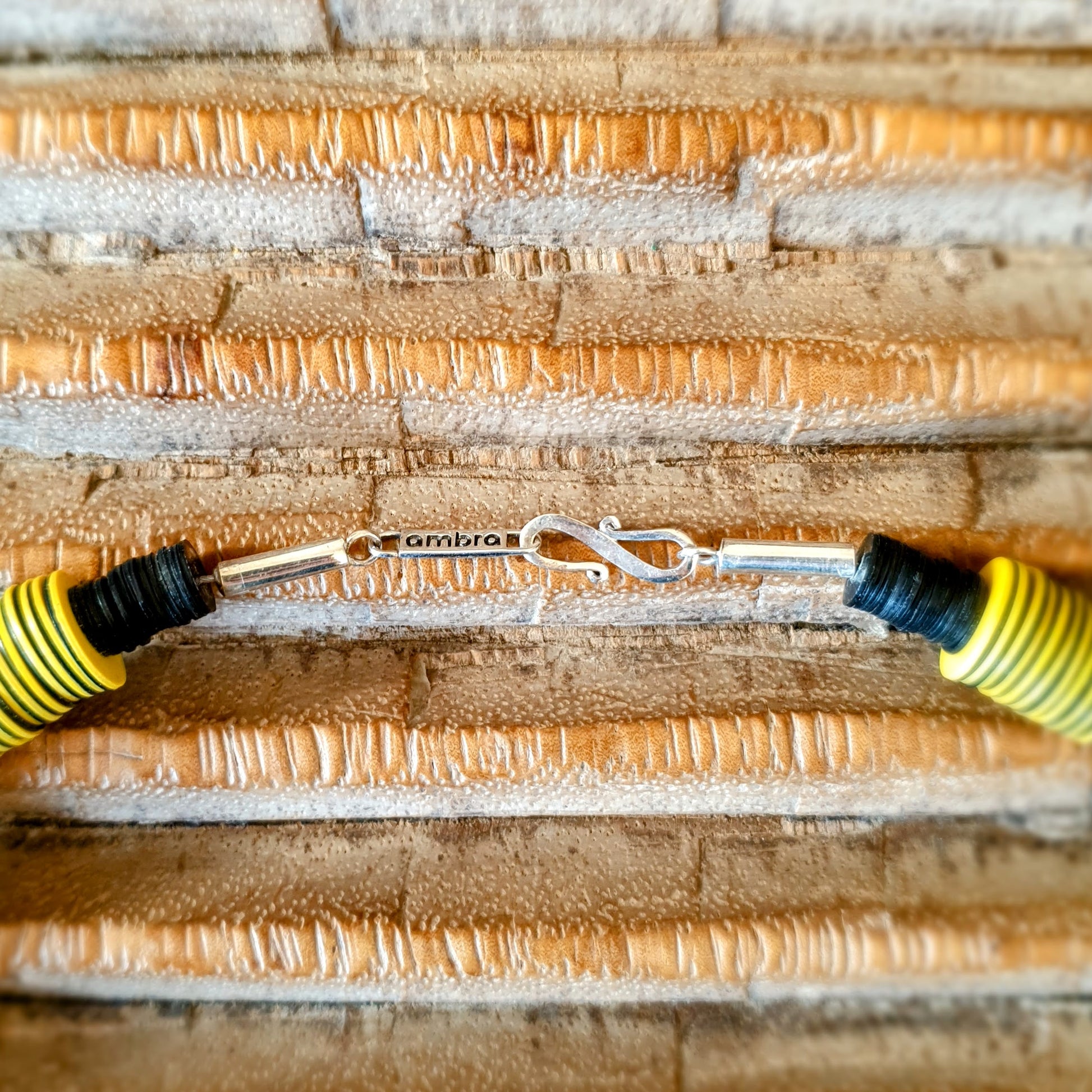 Handgearbeitete Halskette mit schwarzen Harzperlen aus Indonesien und afrikanischen Bakelitscheiben in schwarz und gelb mit Silberverschluss von ambra Schmuck.