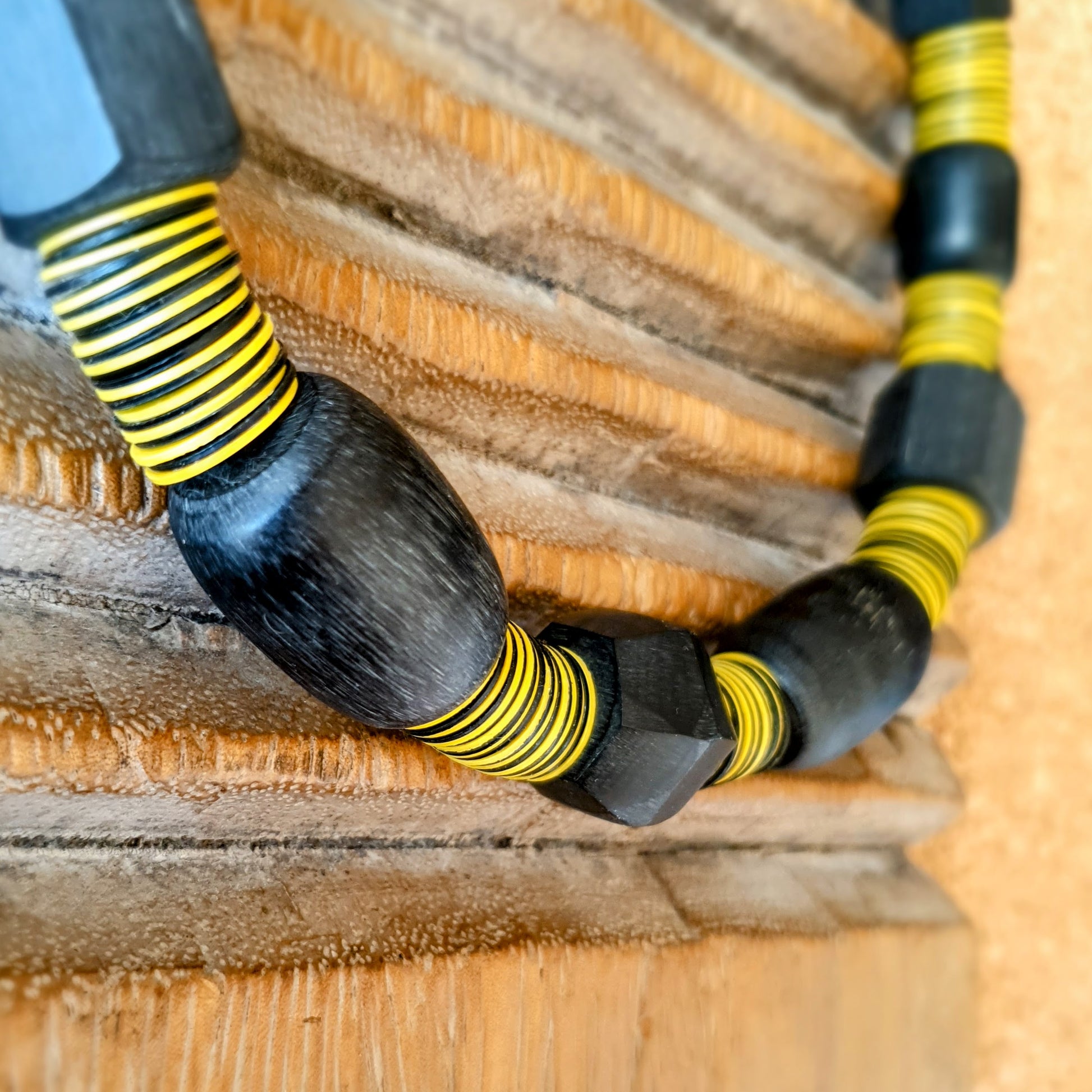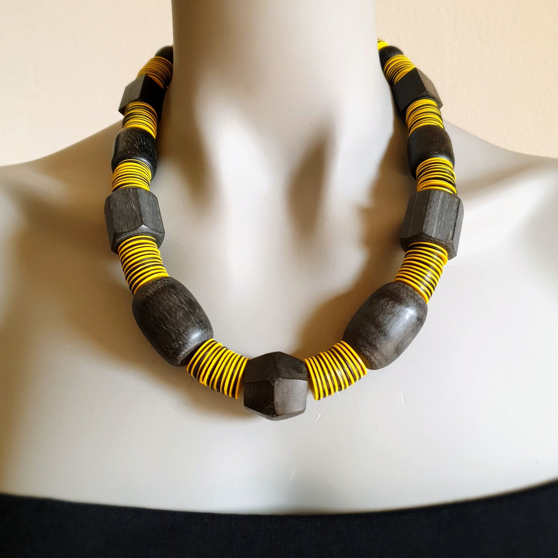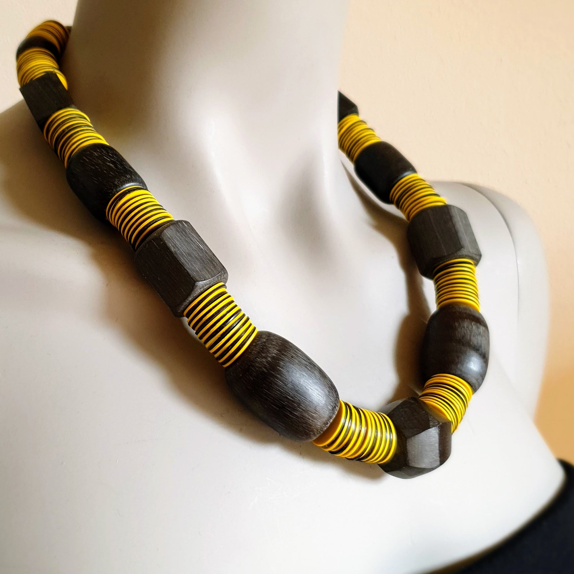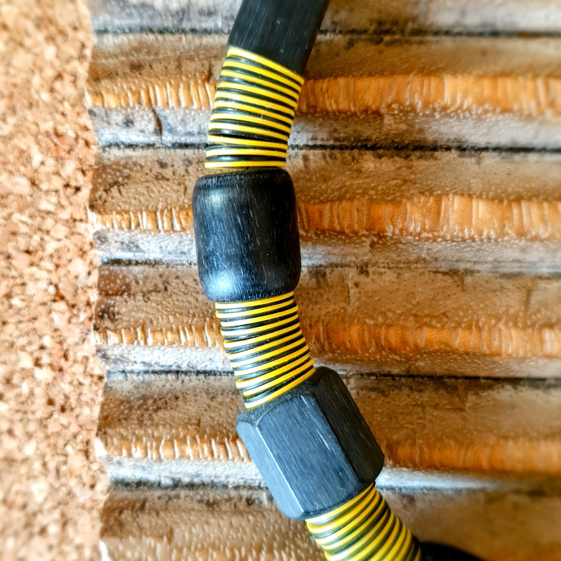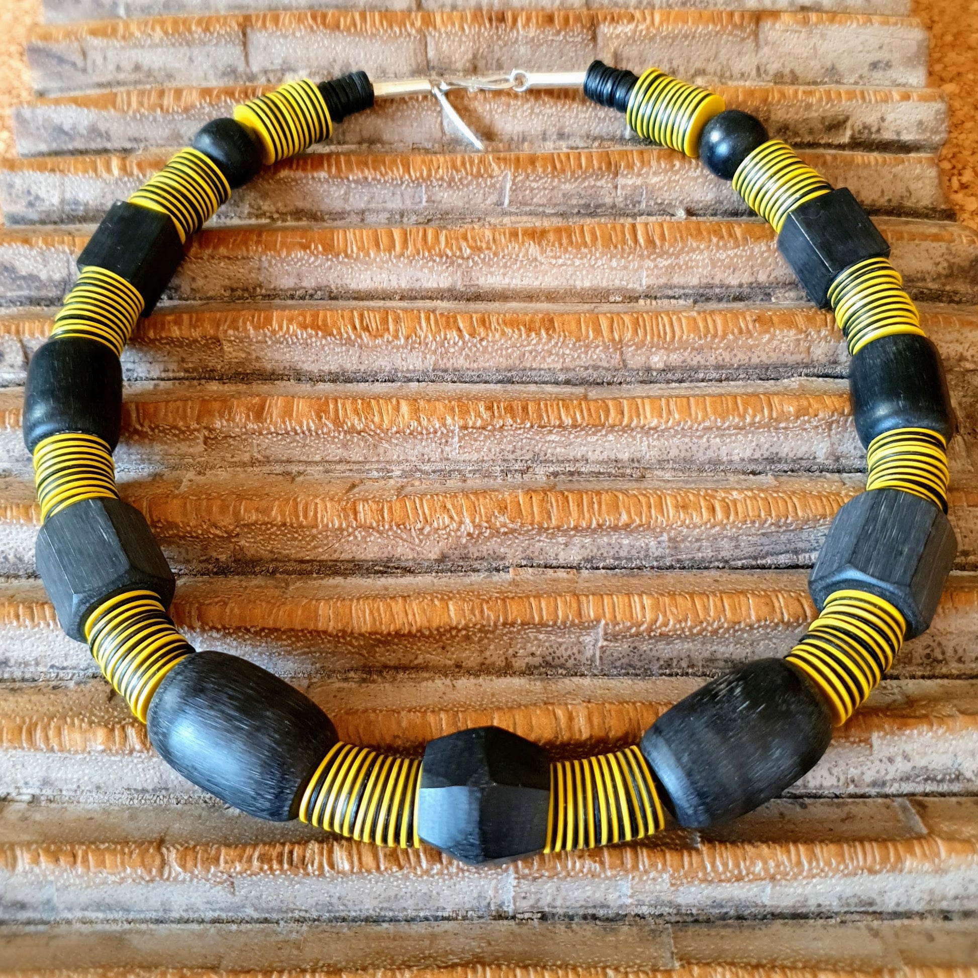 Handgearbeitete Halskette mit schwarzen Harzperlen aus Indonesien und afrikanischen Bakelitscheiben in schwarz und gelb mit Silberverschluss von ambra Schmuck.