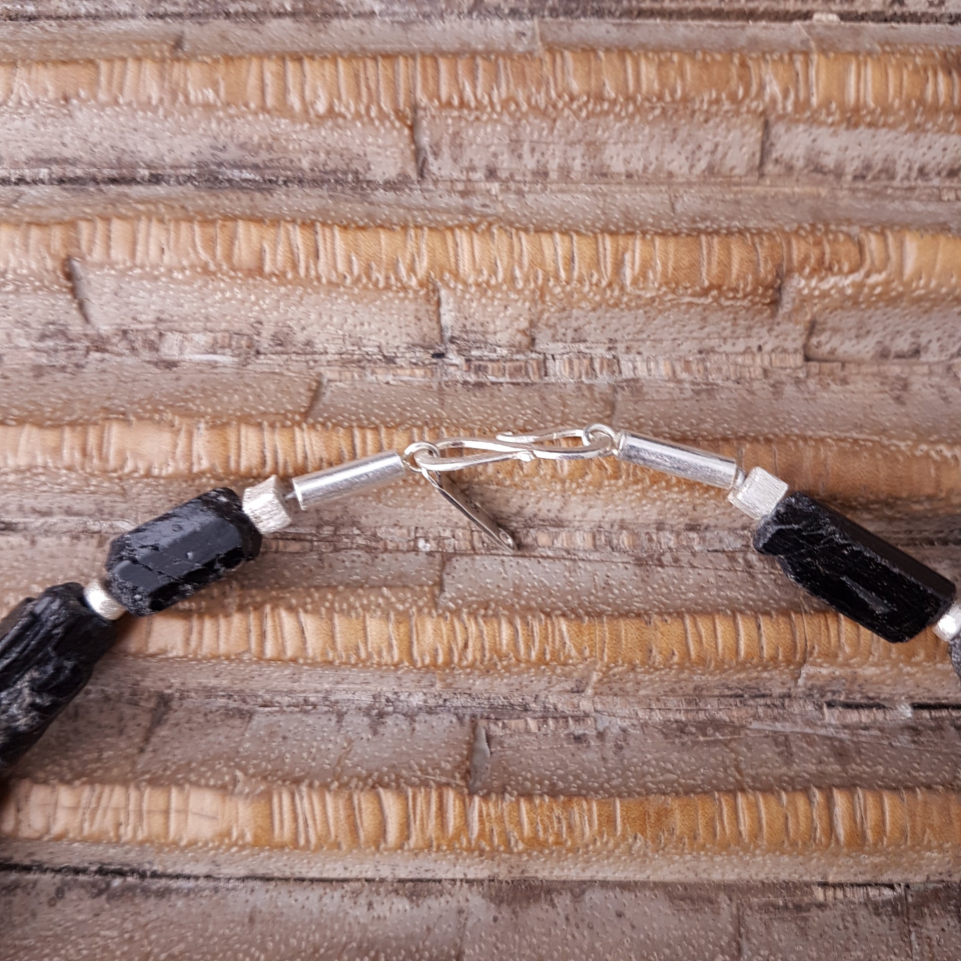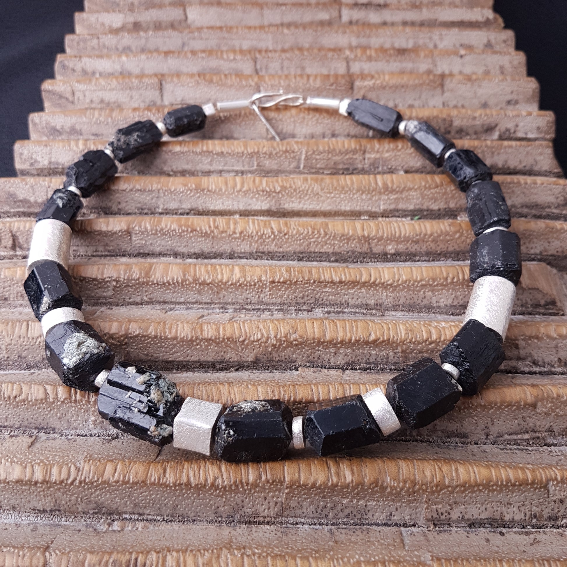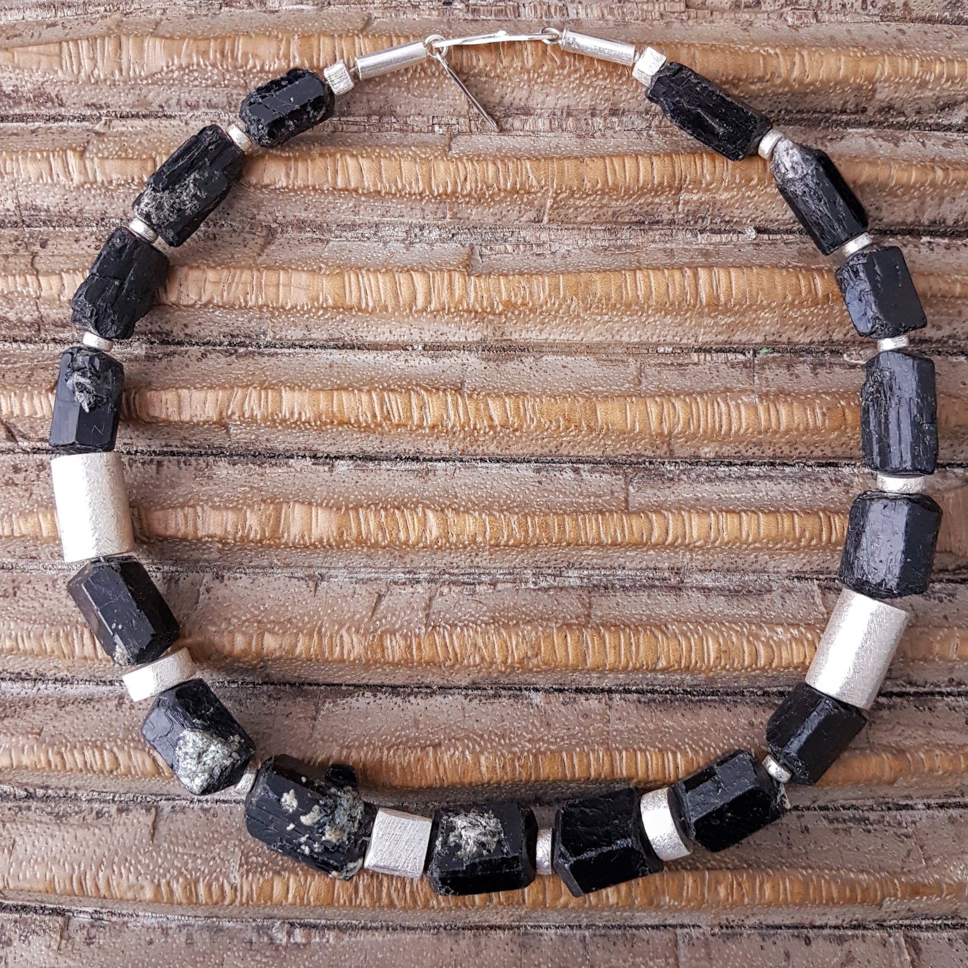 Handgearbeitete Halskette mit rohen ungeschliffenen Turmalinsteinen zwischen geradlinigen mattierten Silberelementen mit Silberverschluss von ambra Schmuck.