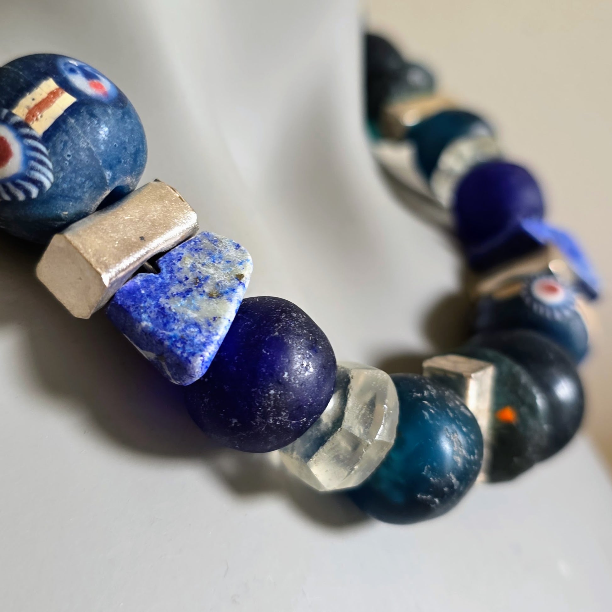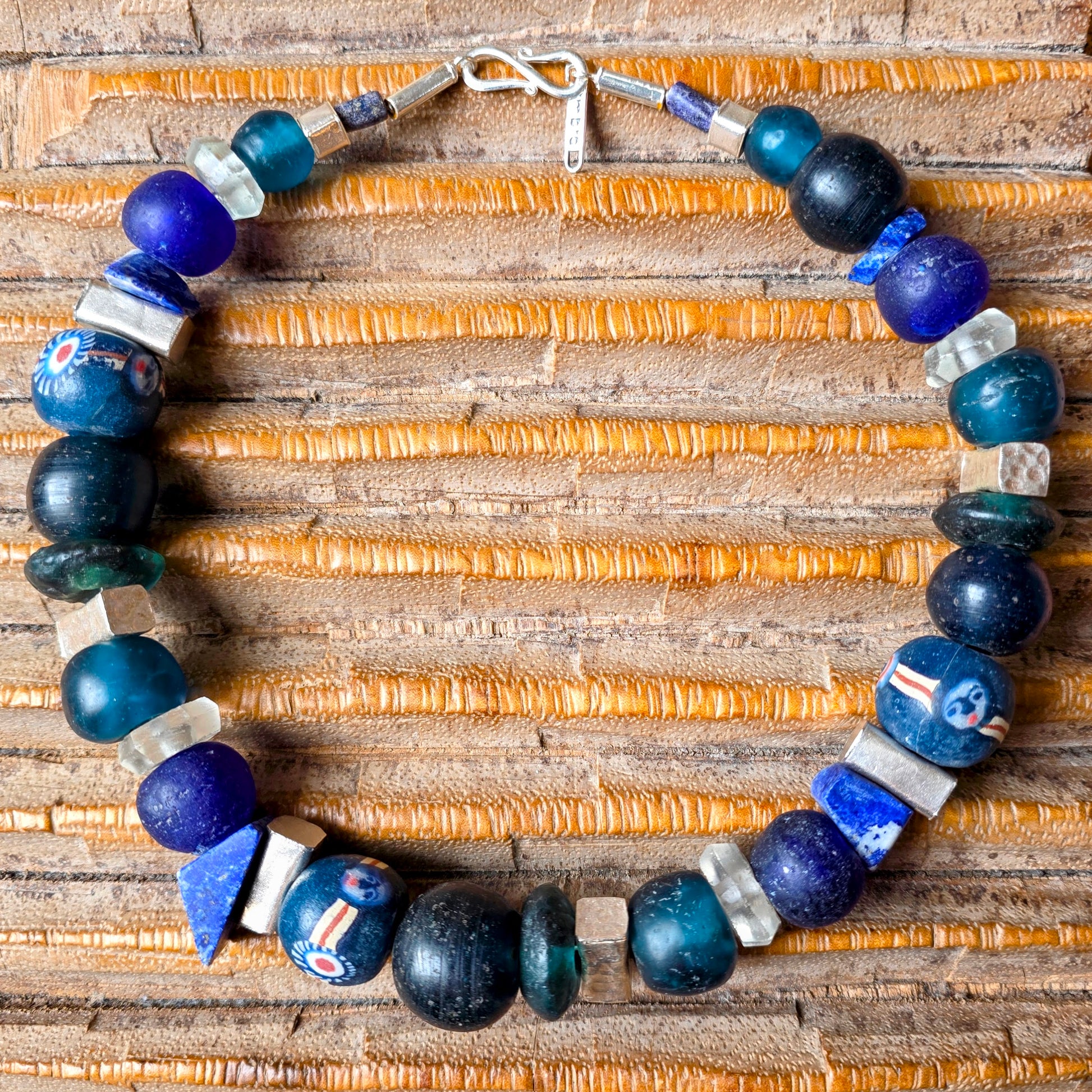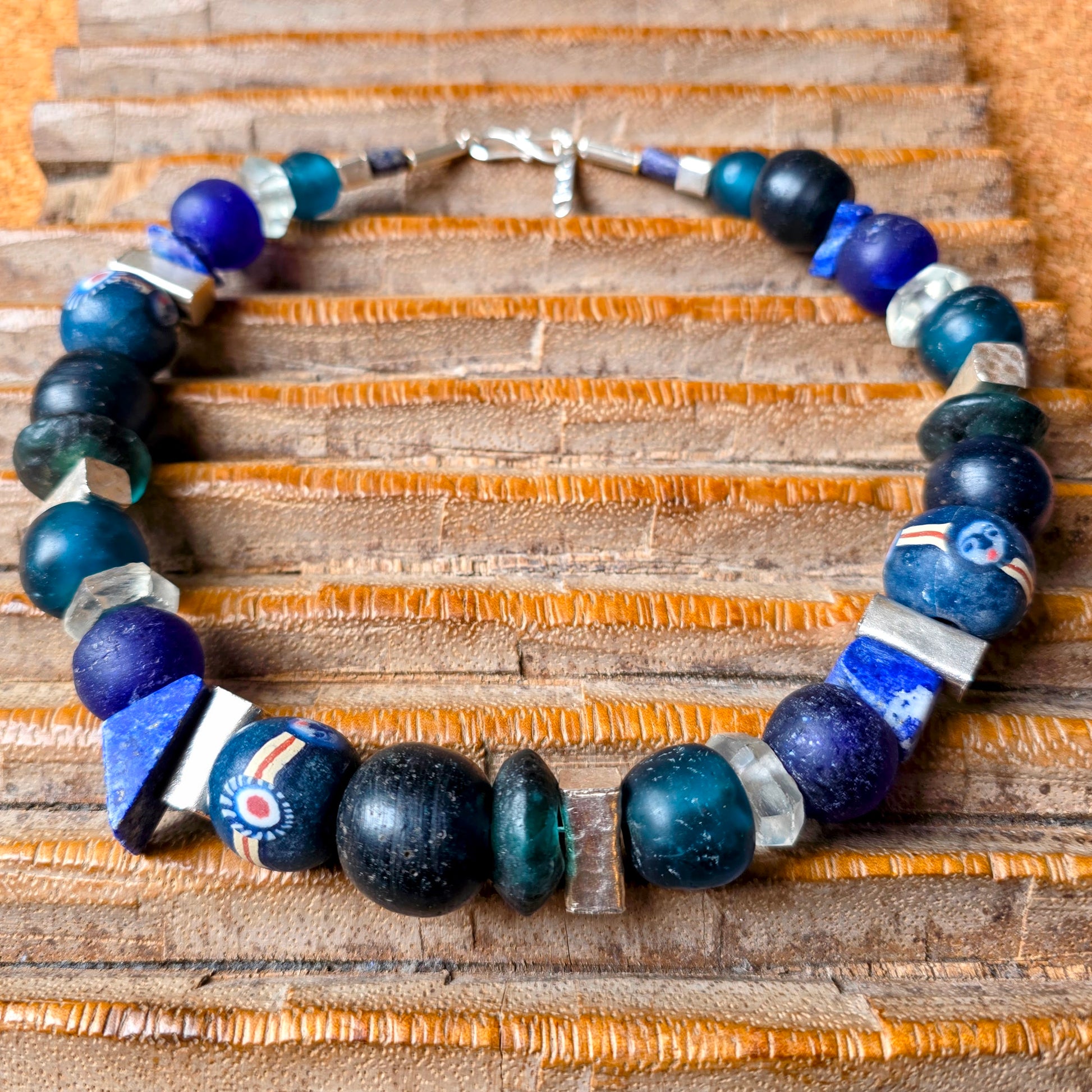 Handgearbeitete Halskette mit verschiedenen Glasperlen von der Insel Java und aus Afrika in Blau- und Türkistönen, blauen Lapislazulisteinen und eckigen gehämmerten Silberperlen aus Burma mit Silberverschluss von ambra Schmuck.