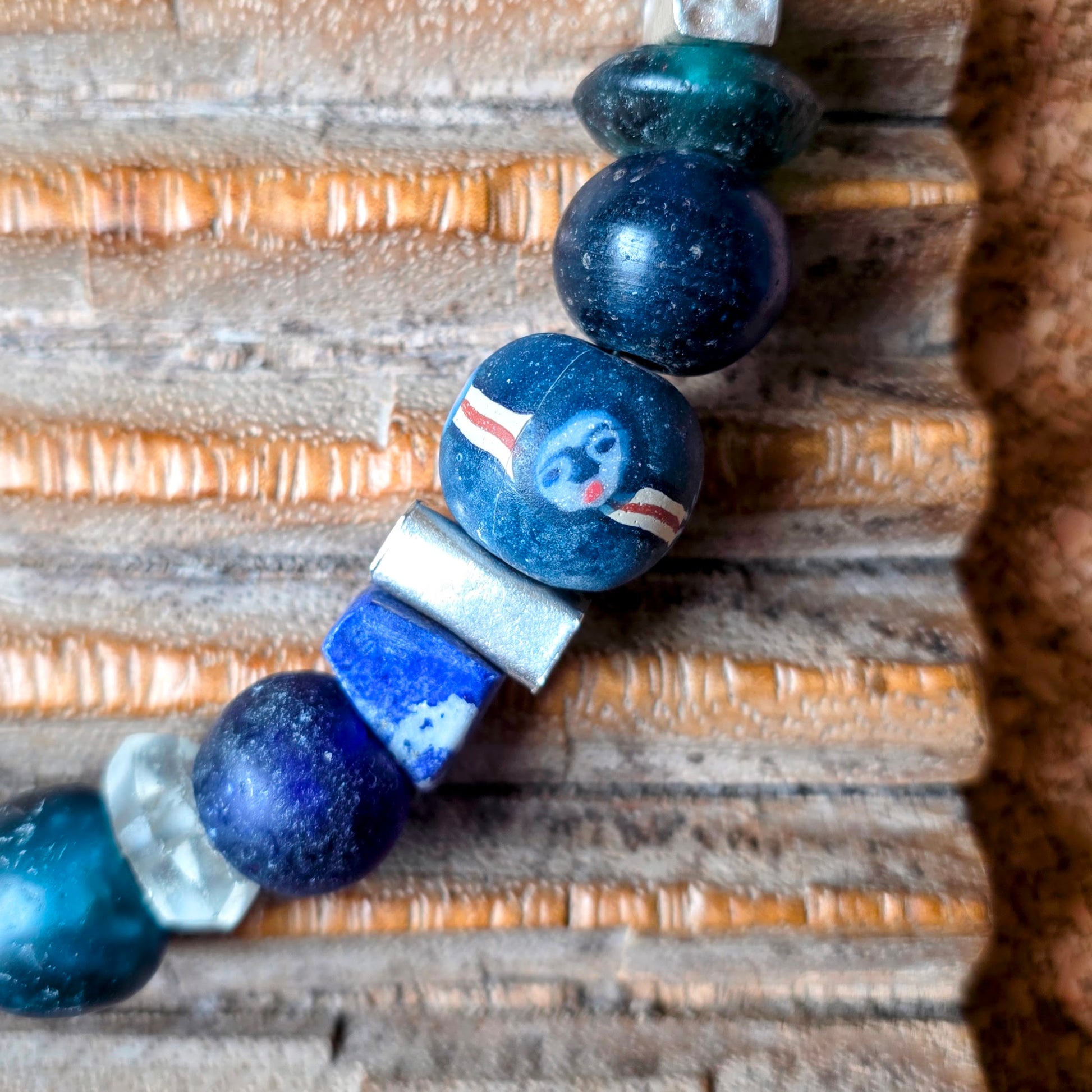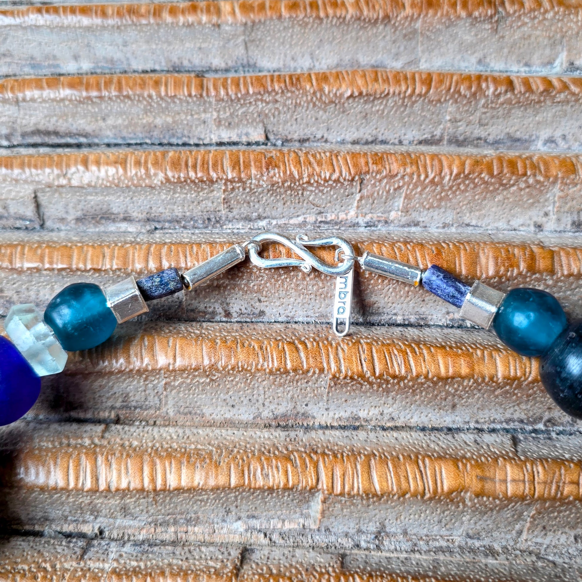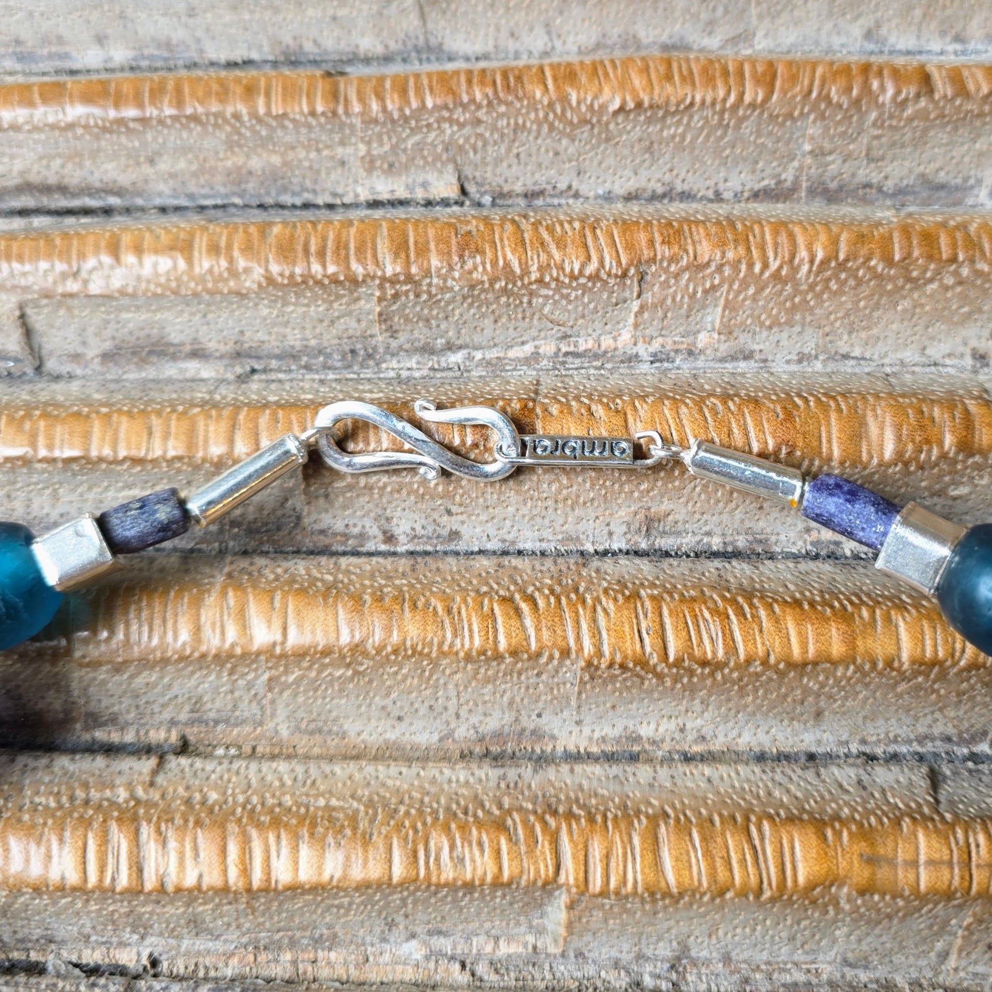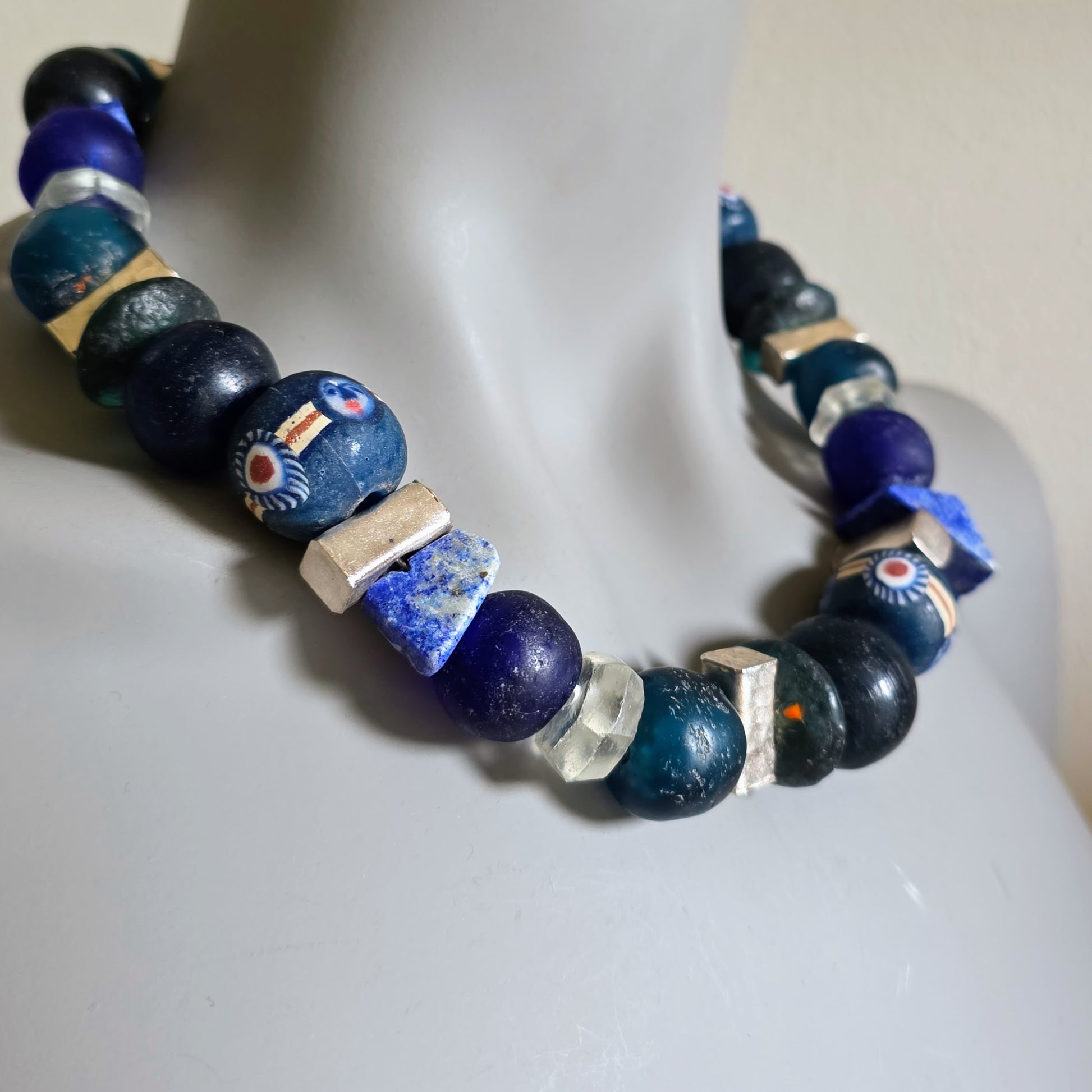 Handgearbeitete Halskette mit verschiedenen Glasperlen von der Insel Java und aus Afrika in Blau- und Türkistönen, blauen Lapislazulisteinen und eckigen gehämmerten Silberperlen aus Burma mit Silberverschluss von ambra Schmuck.